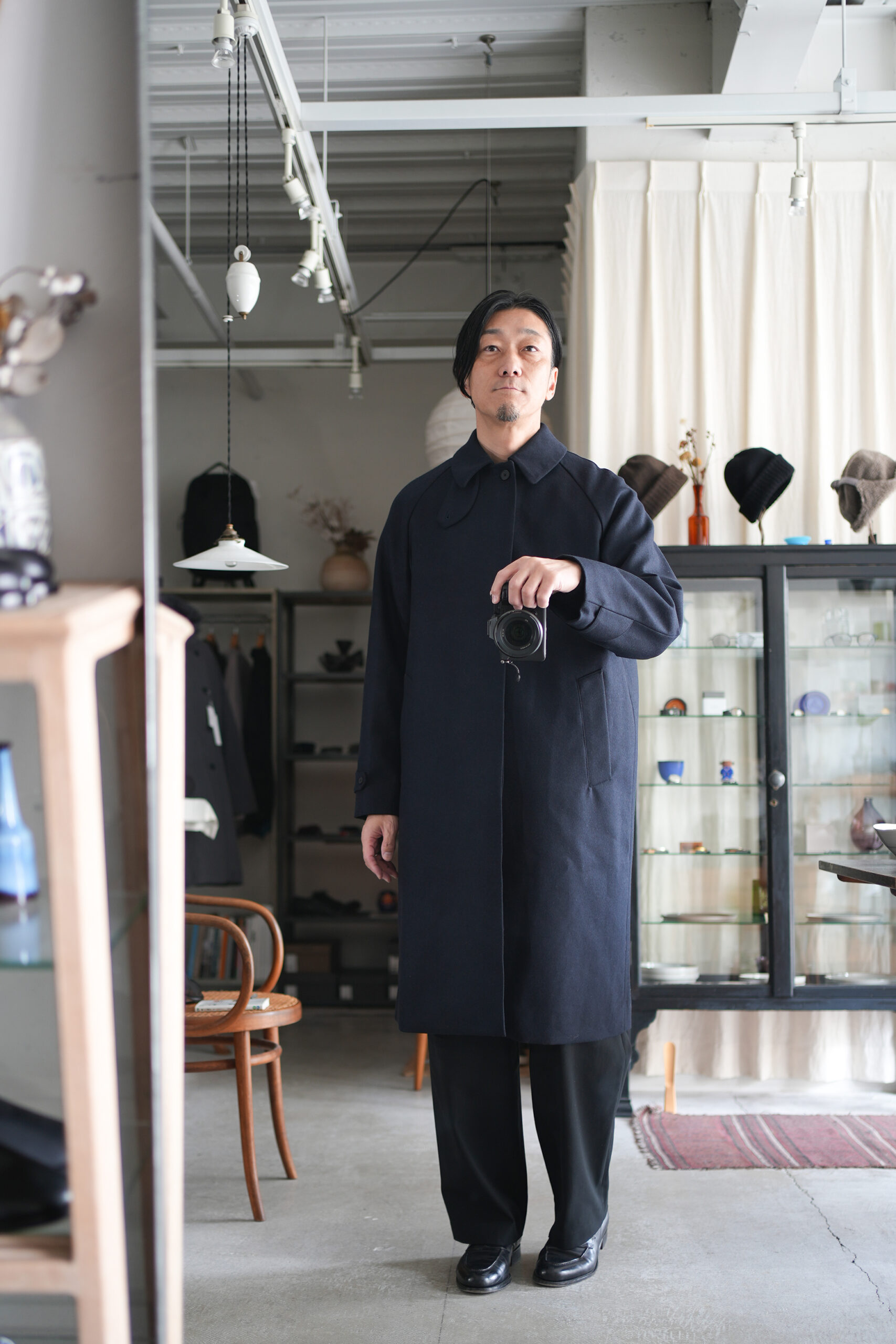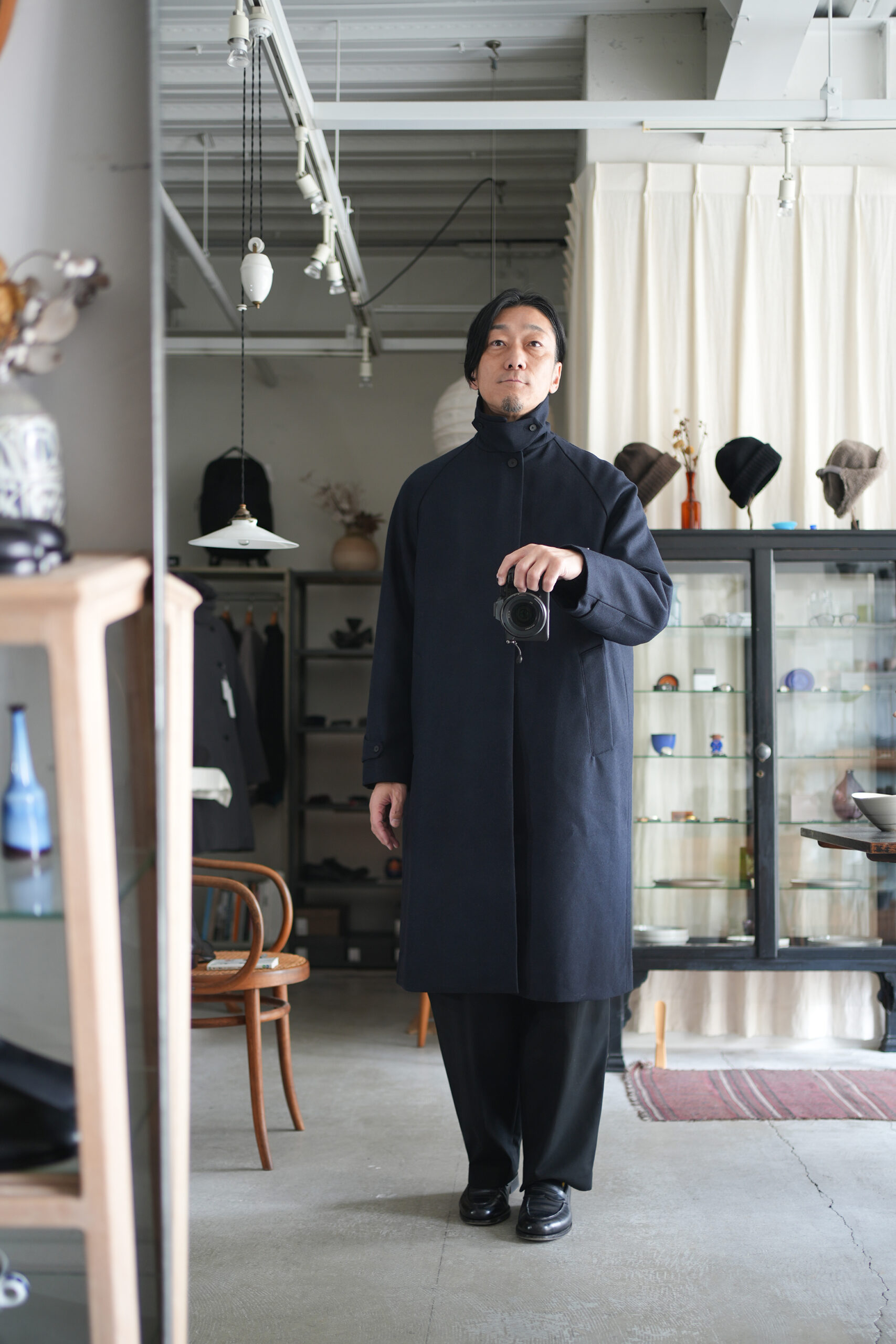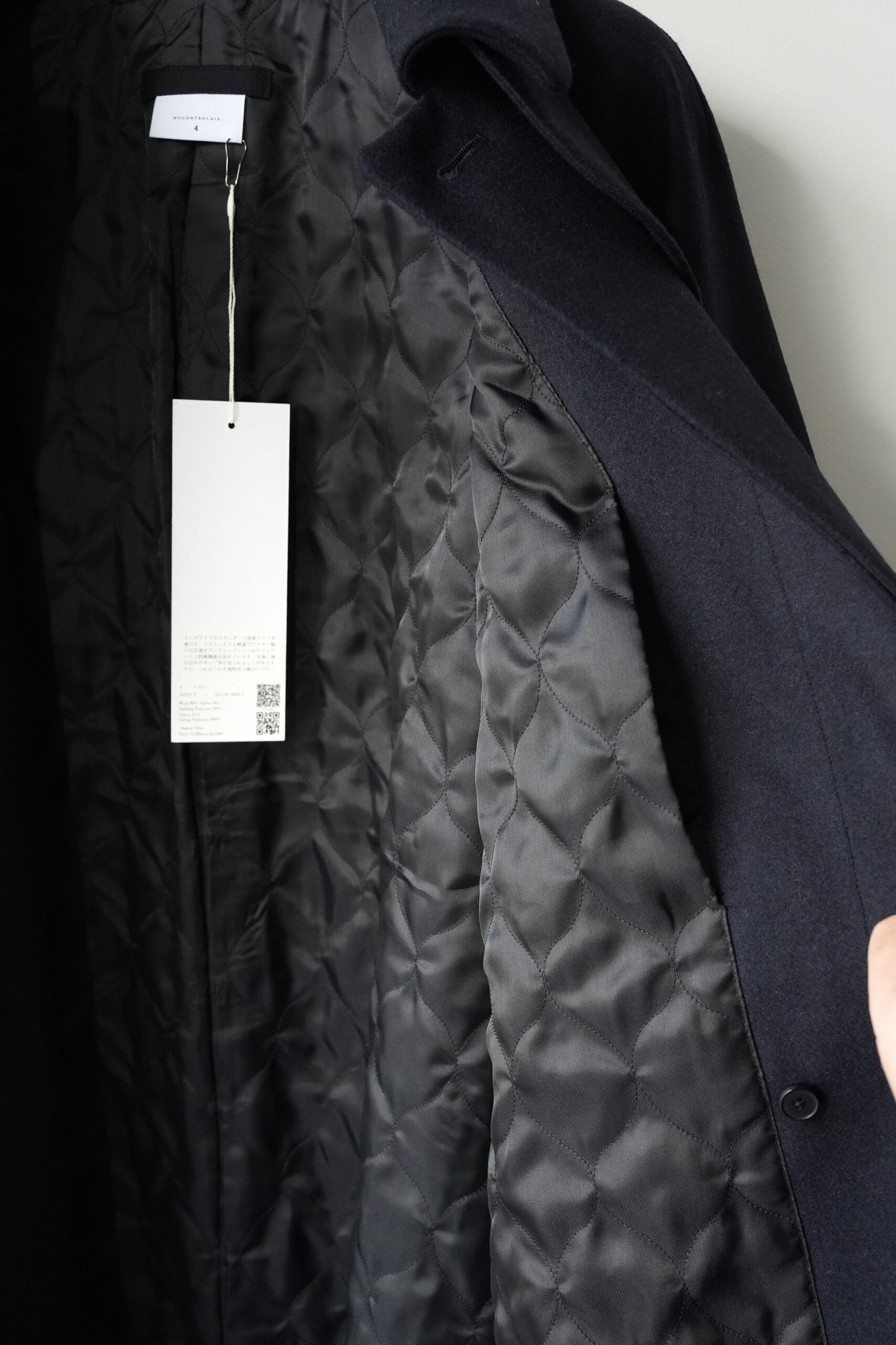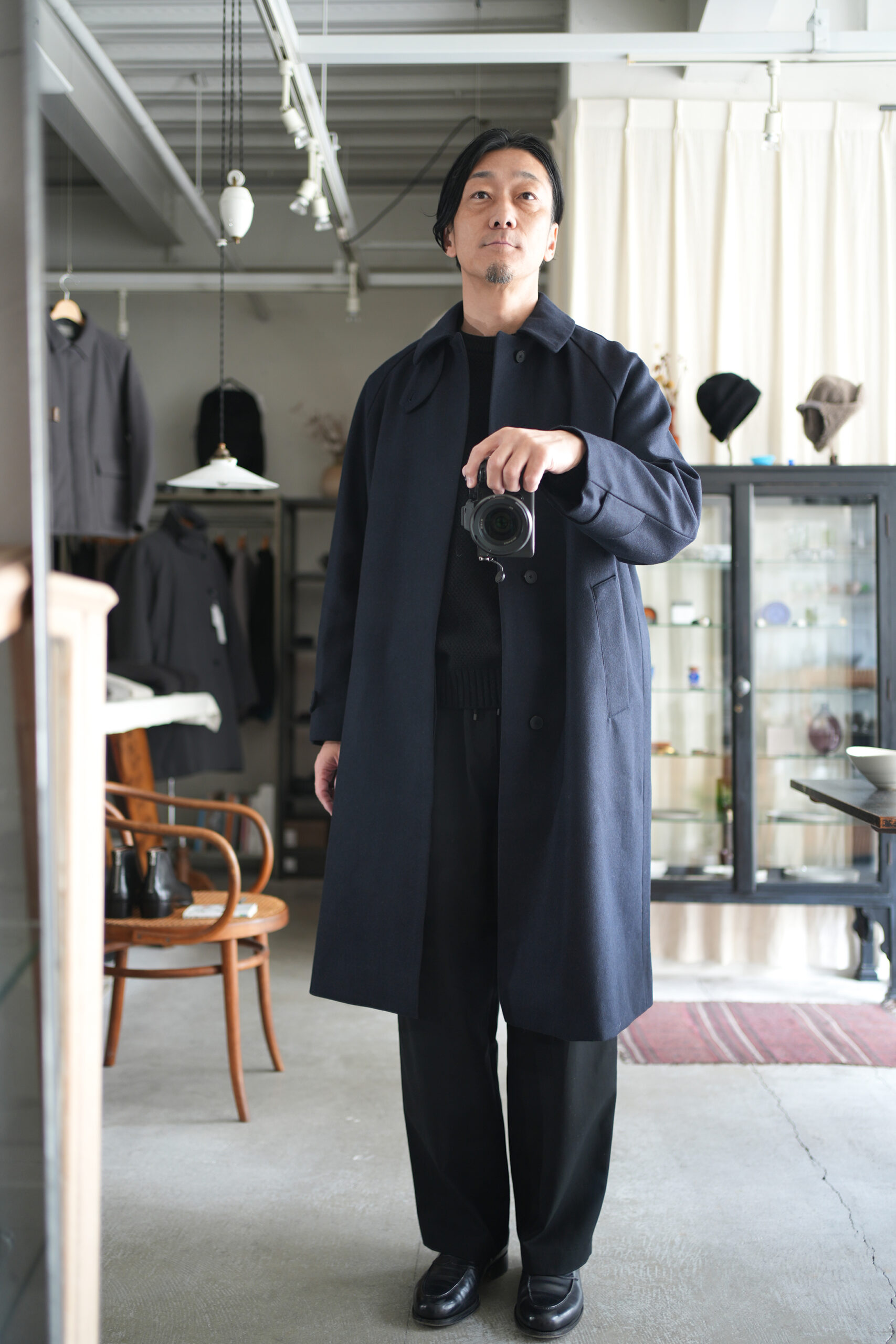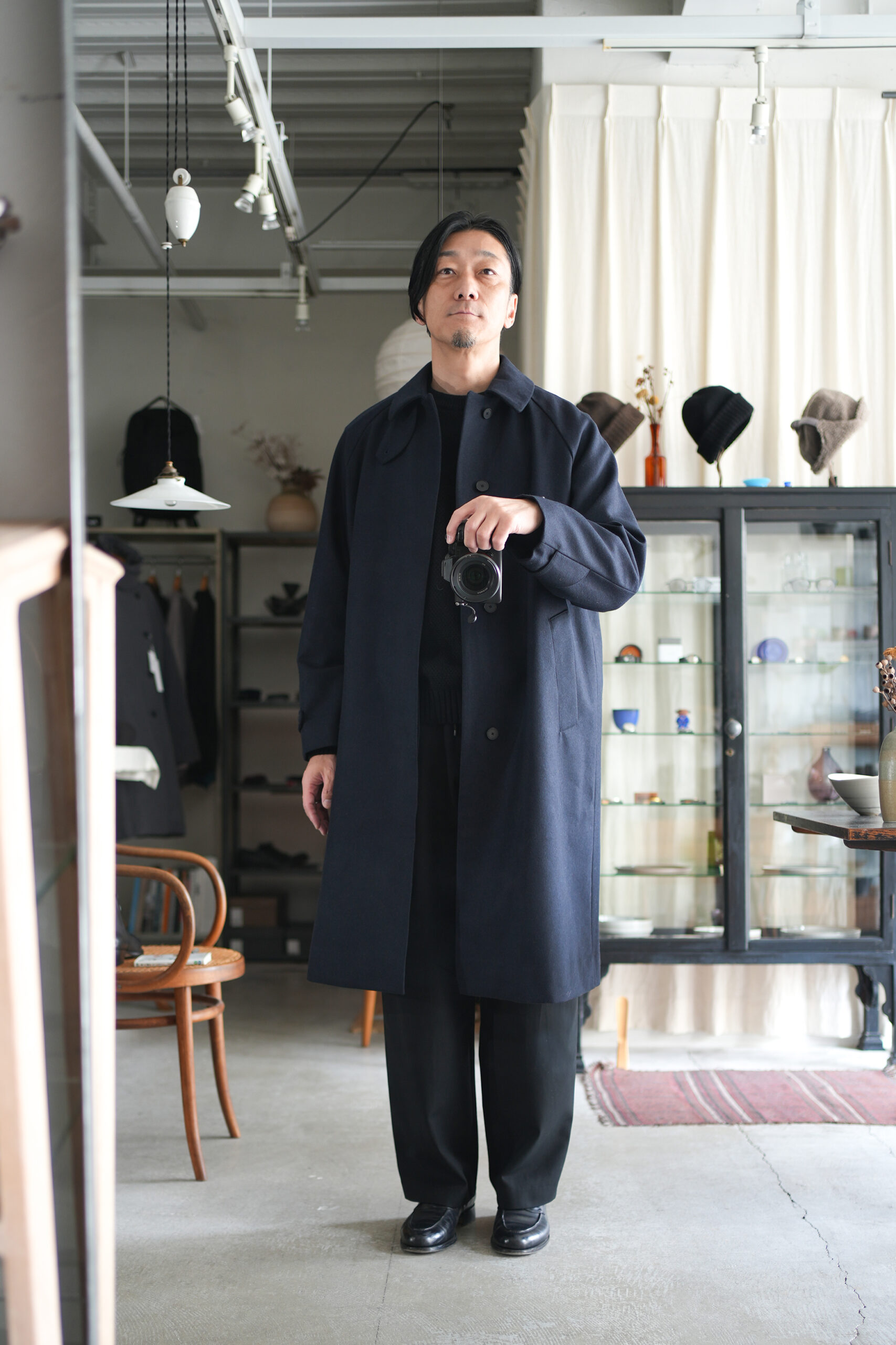 メルトンよりも軽量でアウター類には芯地をボンディングししっかりとしたハリと防風機能を高めた高密フラノ生地で仕立てたステンカラーコート。全面芯ボンディング、総裏仕立て(身頃キルティング裏地)で中綿には高機能生地KOMATHERMO(コマサーモ)を配した軽量で暖かなコートです。