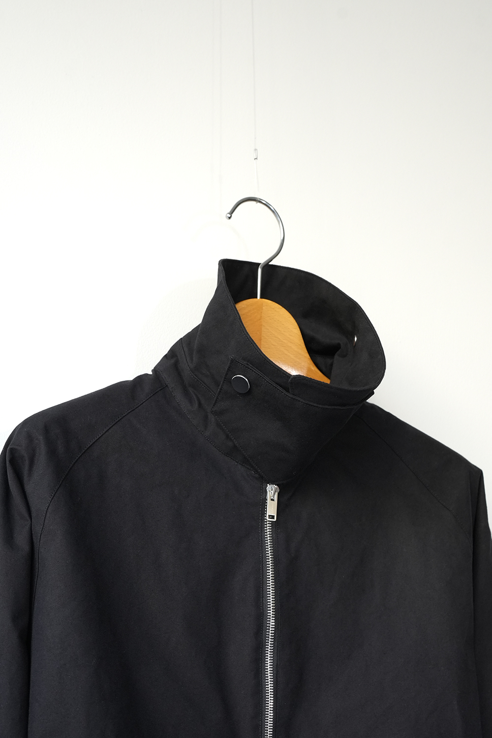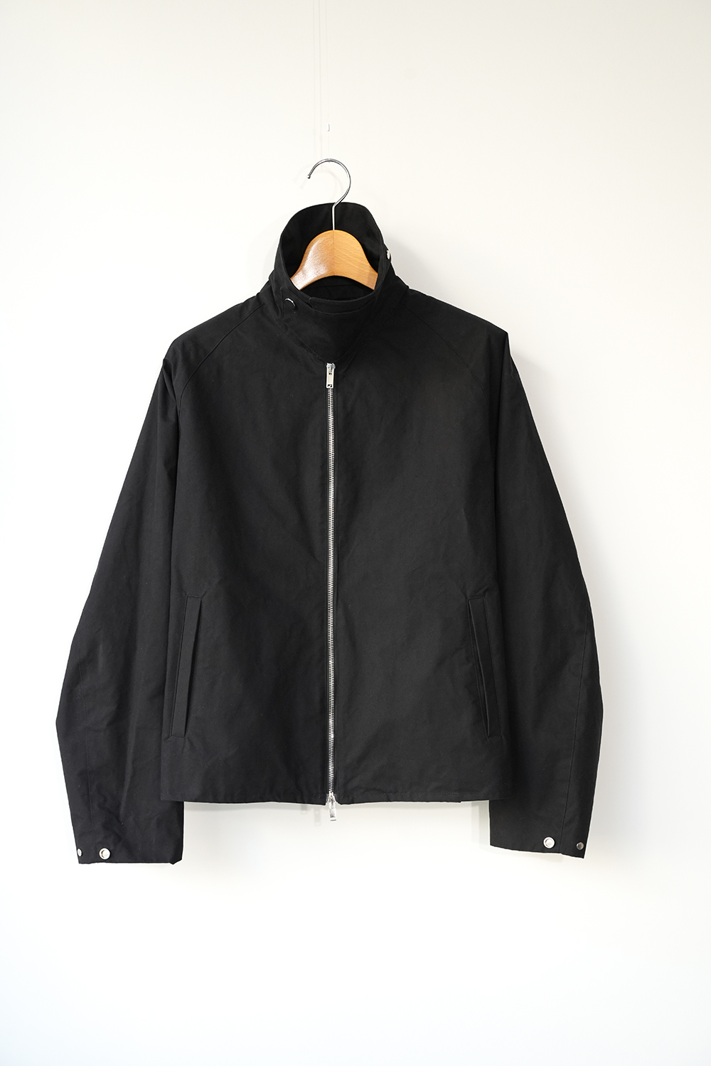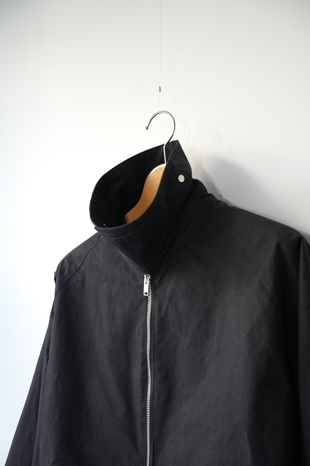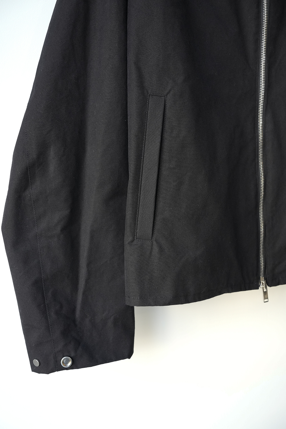 インド産のオーガニック超長綿を使用、80番手の繊細な糸を3本撚り合せた「三子(みっこ)撚り」の糸を生地を織る織機の限界を超えるほど超高密度に織り上げた極めてしっかりとしたコットン生地。光にかざしても明かりが透けないほど超高密で、天然繊維にも関わらず撥水性、耐水性が高いためちょっとした雨であれば浸み込む心配はありません。風を通しにくく、天然素材なのでゴム引きのように劣化もしなければ、オイルドの生地のようにニオイの心配もいりません。蒸れにくく、風も通しにくい生地です。はじめは板のような硬さがありますが、着用を重ねるごとに柔らかく体に馴染んで参ります。秋や春はこれ1枚で、冬はインナーダウンなどと組み合わせることで3シーズン着用が可能。四季折々の移動シーンに配慮したミニマルデザインのジップアップジャケット。