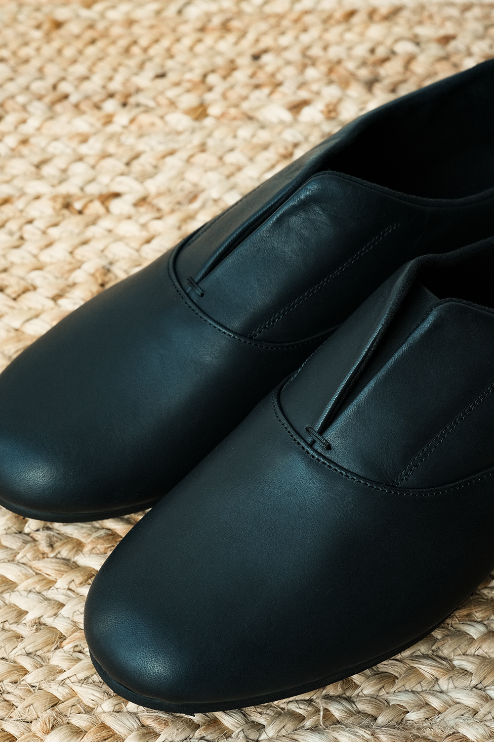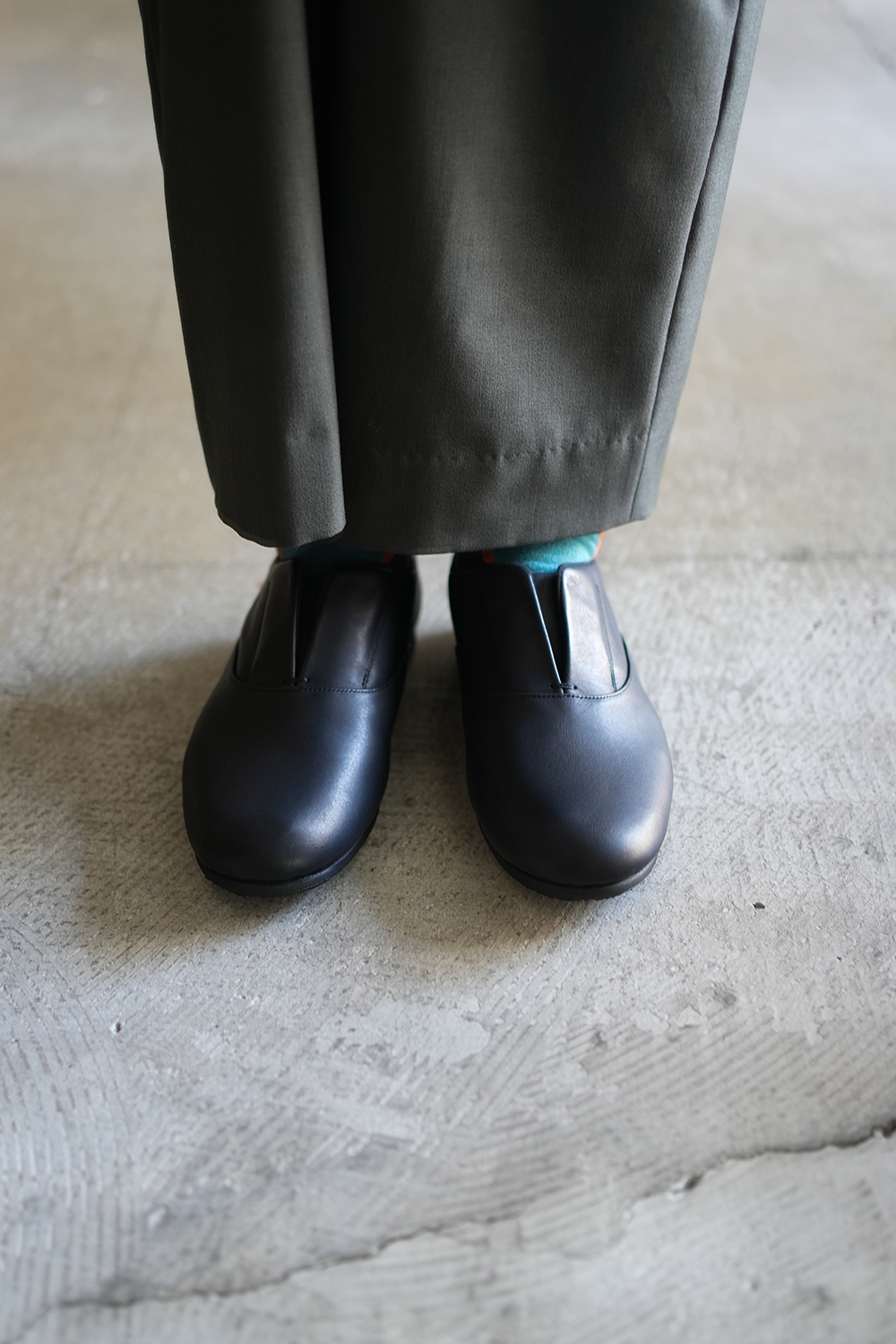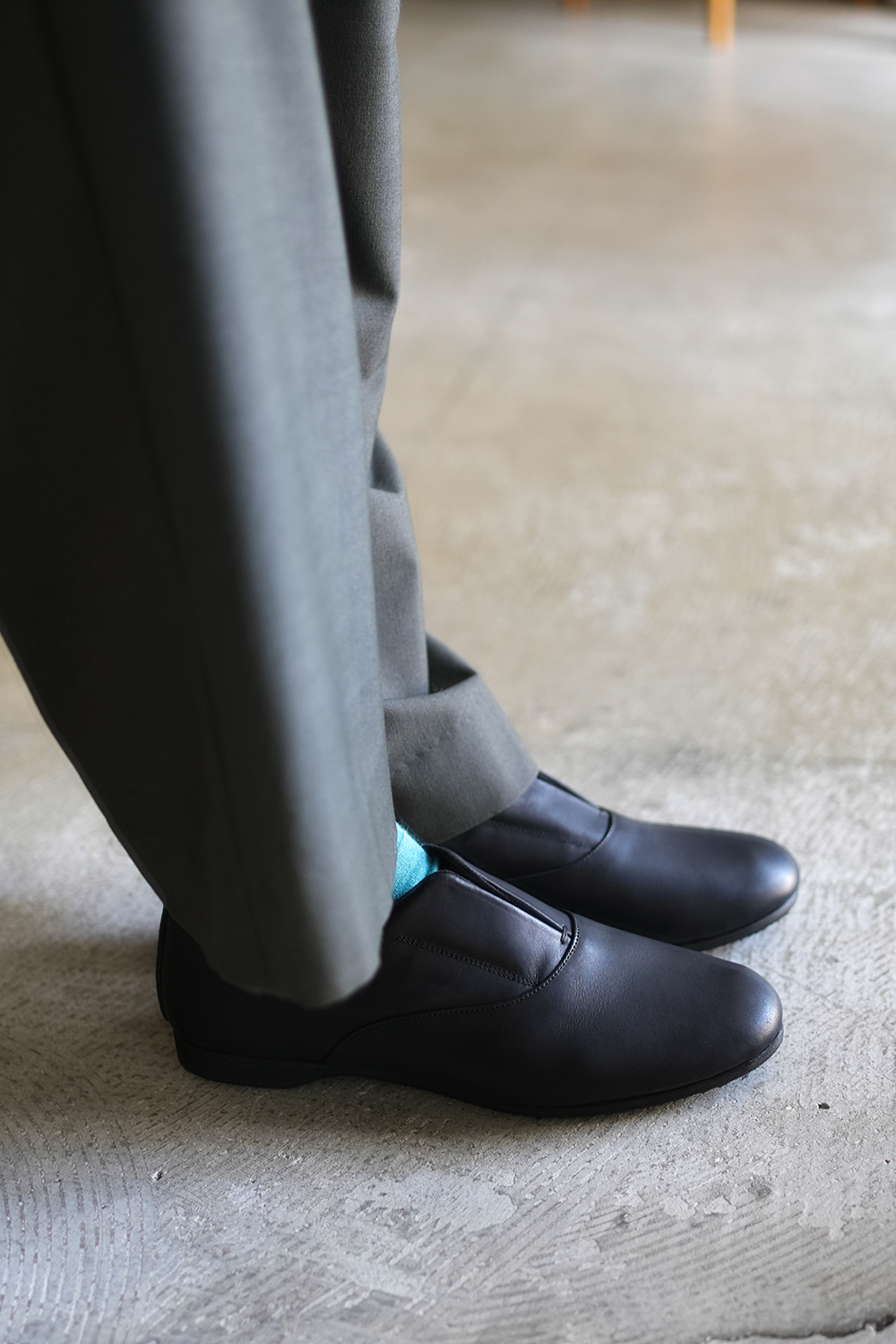浅草の歴史のあるシューメーカーが展開するジュトメンヌとのコラボレーションシューズ。ボロネーゼ製法で制作して頂いたスリッポンタイプのレザーシューズ。ボロネーゼ製法で作製する事により、抜群の柔軟性・軽量性が特徴。何処へでも履いて行ける汎用性の高い機動力のあるデザインです。インソールにクッション材を入れているのでソフトで疲れにくい履き心地。ヴィブラムソールを採用しているので抜群の軽量性、クッション性、耐久性、グリップ力も特徴です。兵庫県の姫路市にあるタンナーがピット鞣しで作製した耐久性、弾力性、柔軟性に優れた防水のグローブレザー。一般的な防水レザーでは出せないしっかりオイルを含んだヌメりのある質感と柔らかさ、品やかさが特徴。使い込まれたヴィンテージの様な経年変化がしっかりと感じられる育て甲斐のあるレザーです。