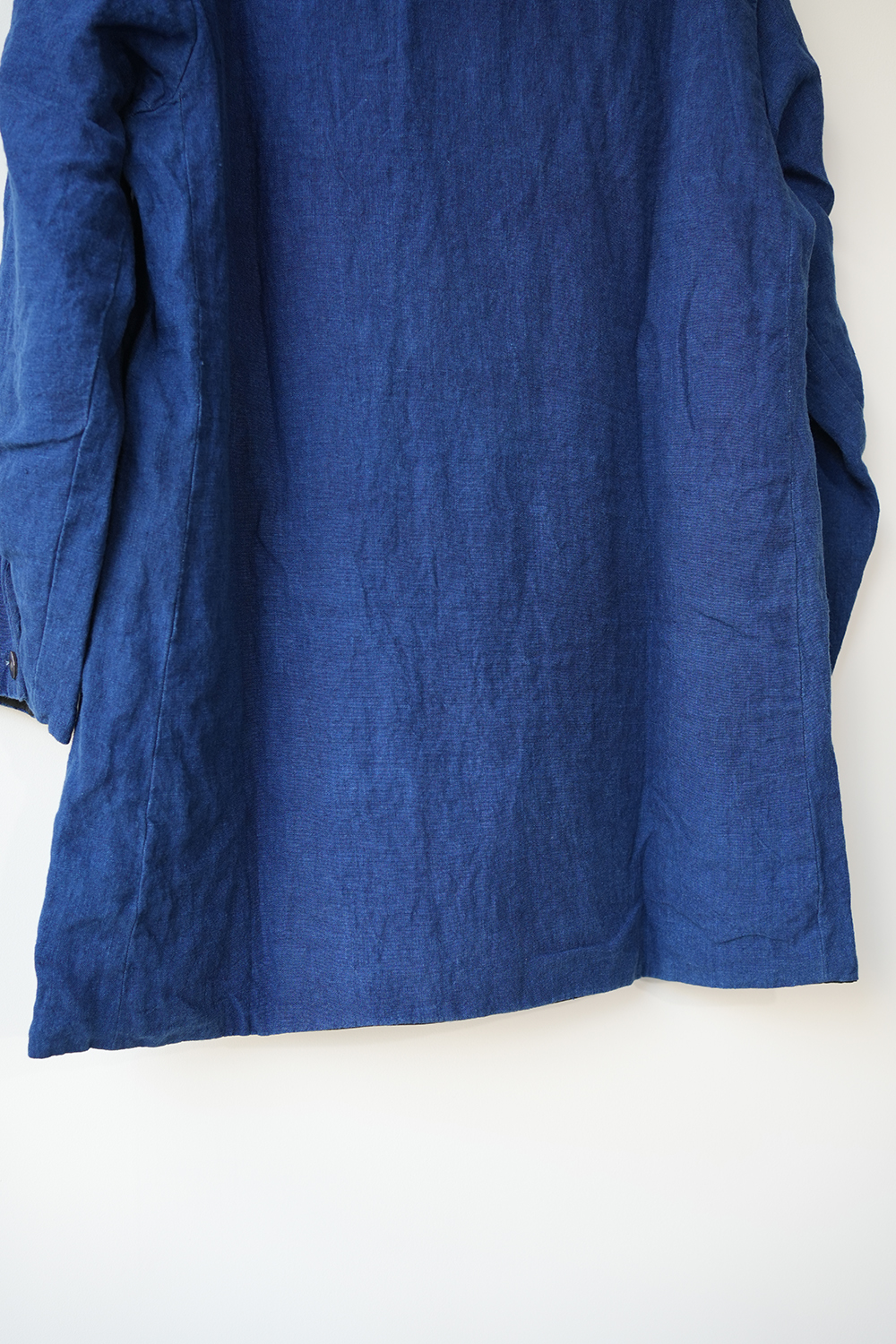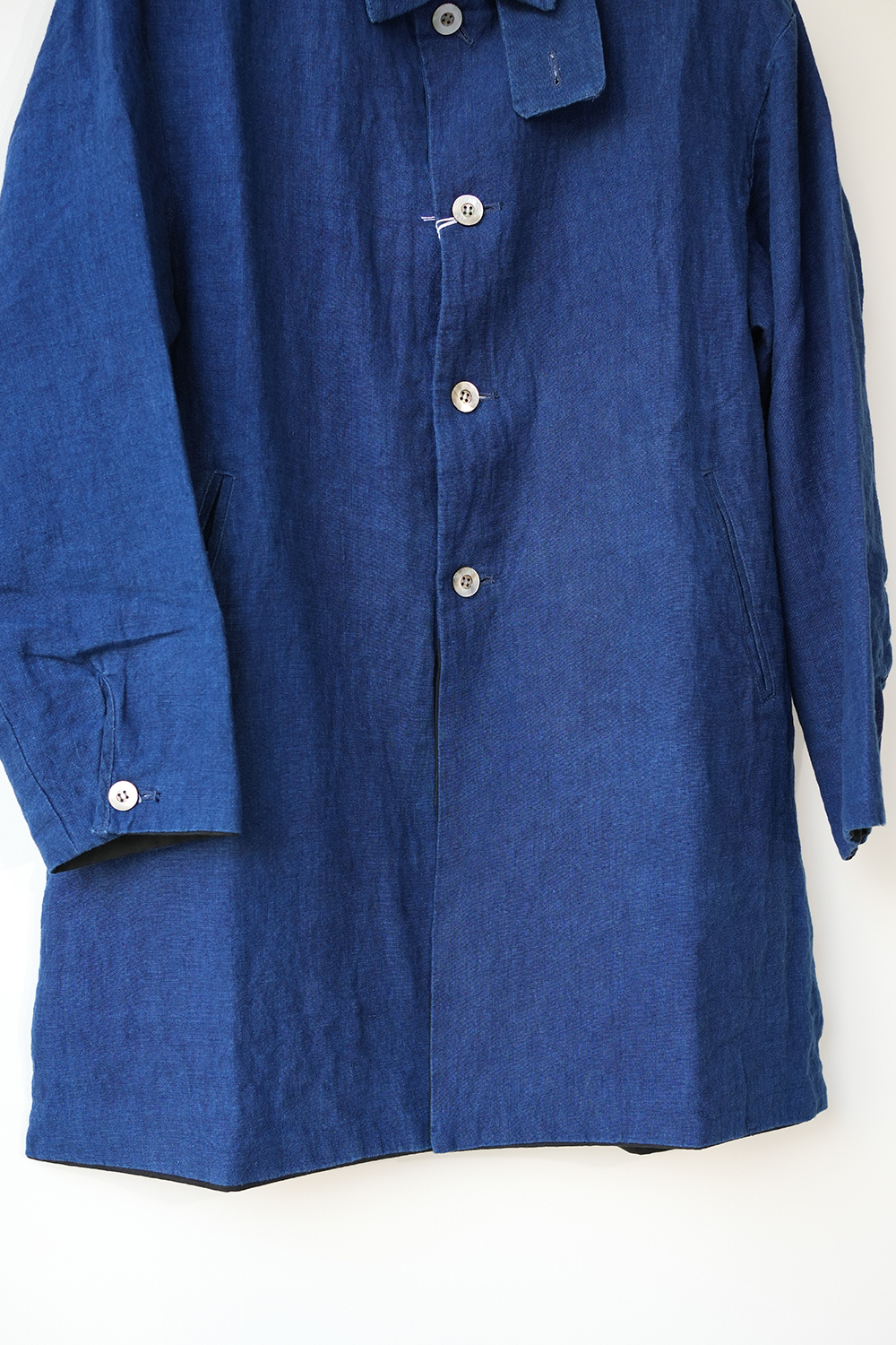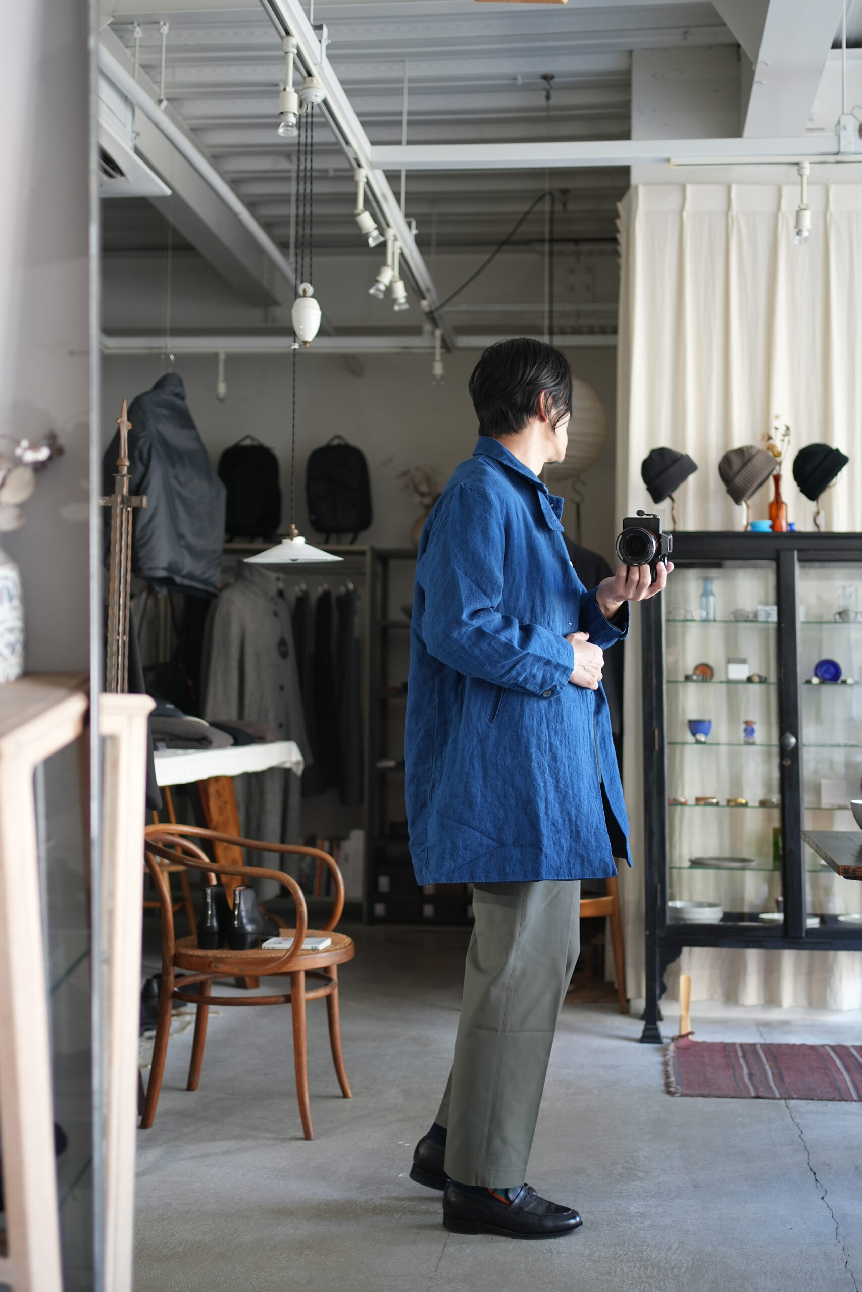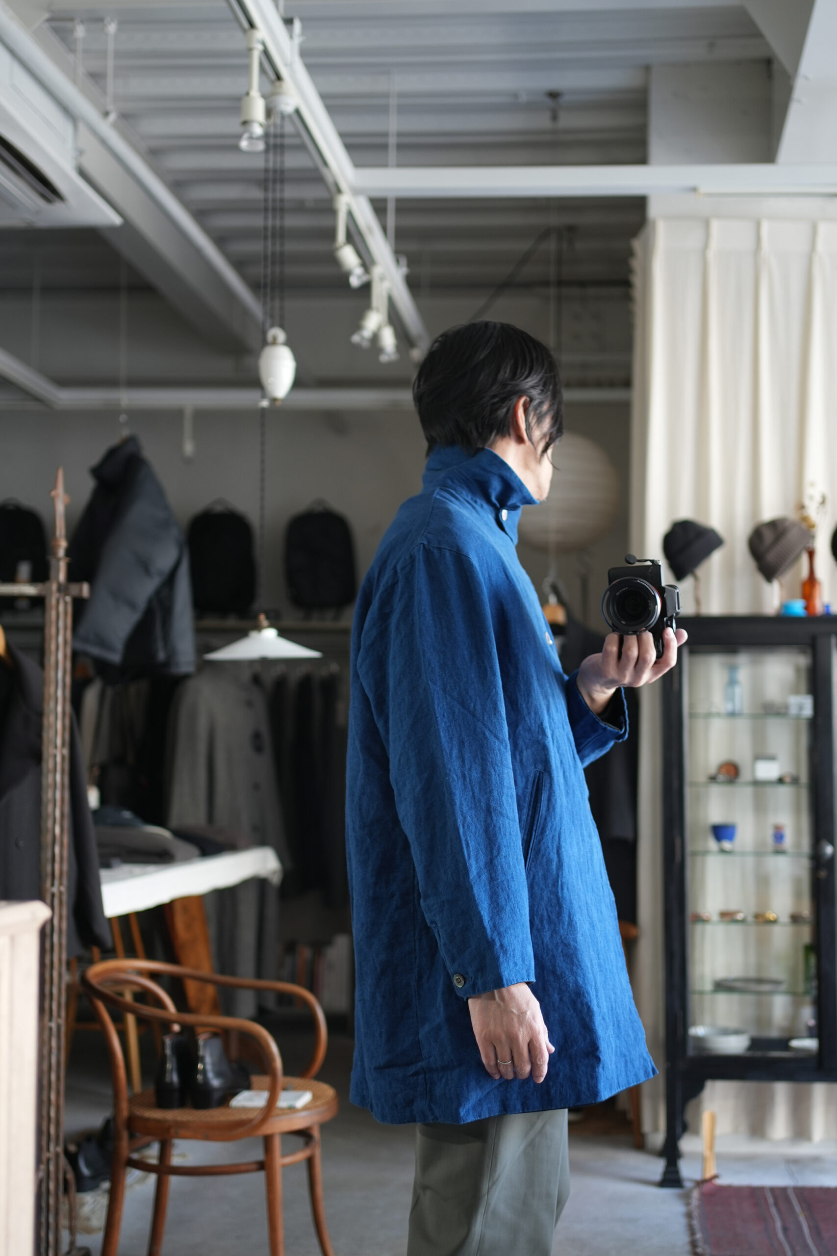 サクラコート藍を込めて。過去に発表していたインディゴ染めの”サクラコート 藍を込めて”をリネン100%に本藍を染めた生地を使用したプロダクト。