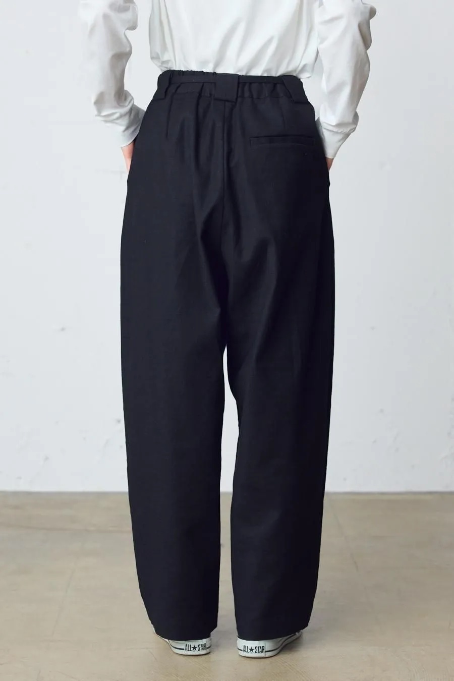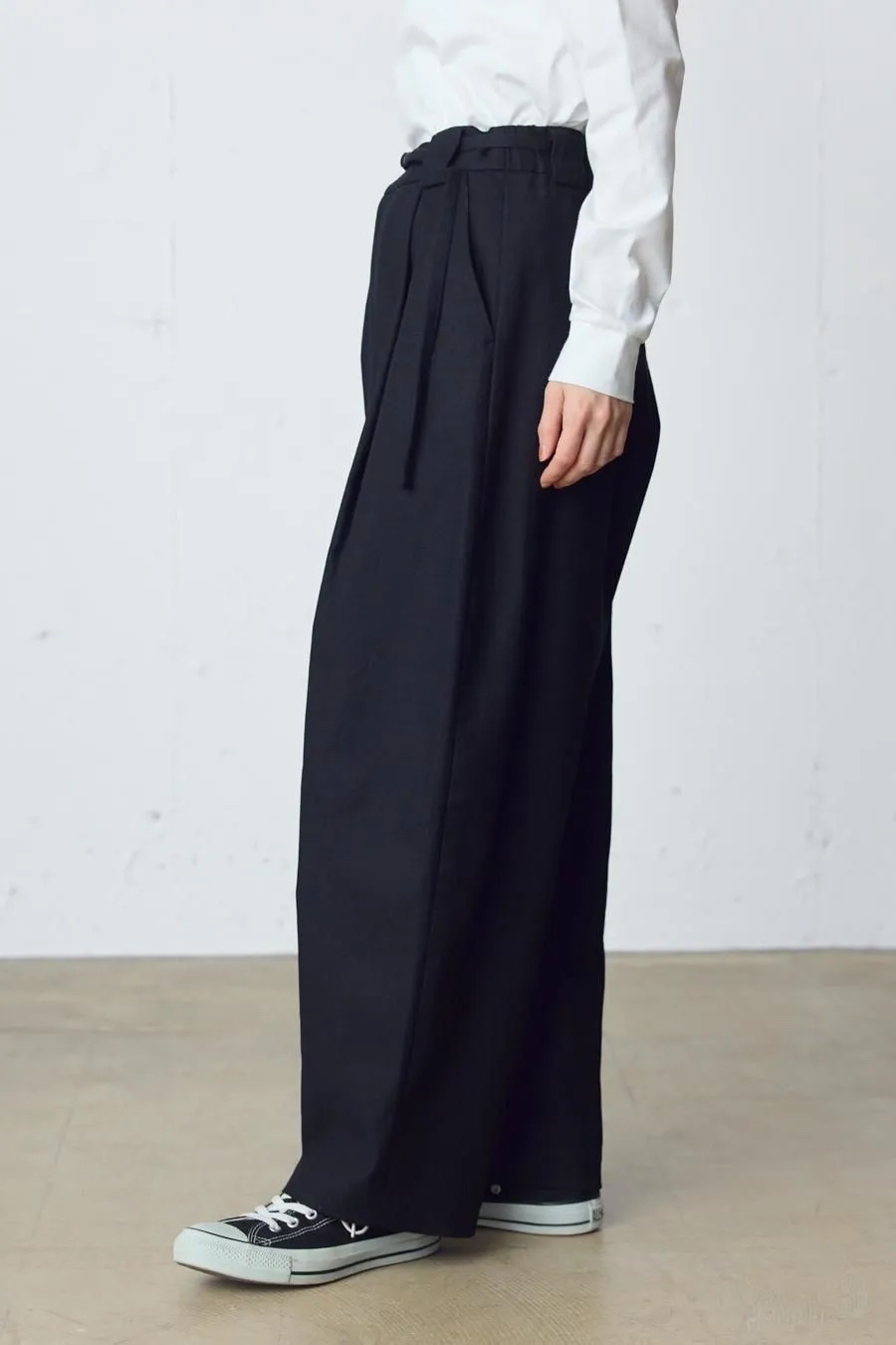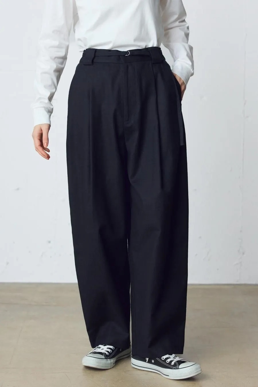 コットンブッチャーシリーズ。麻のような凹凸感がある素材をセミフォーマルな雰囲気に落とし込みました。共布のベルトが付いたワイドシルエットスラックスパンツ。ブッチャー素材とは、欧米の肉屋が使用していた丈夫で厚手の亜麻織物に似せて作られた織物。複数本の糸を引き揃えて織り込むことで生み出した立体感のある縦畝や横畝が表面に不規則に並びます。高級感がありながら麻のようなシャリ感もある爽やかな印象の素材です。