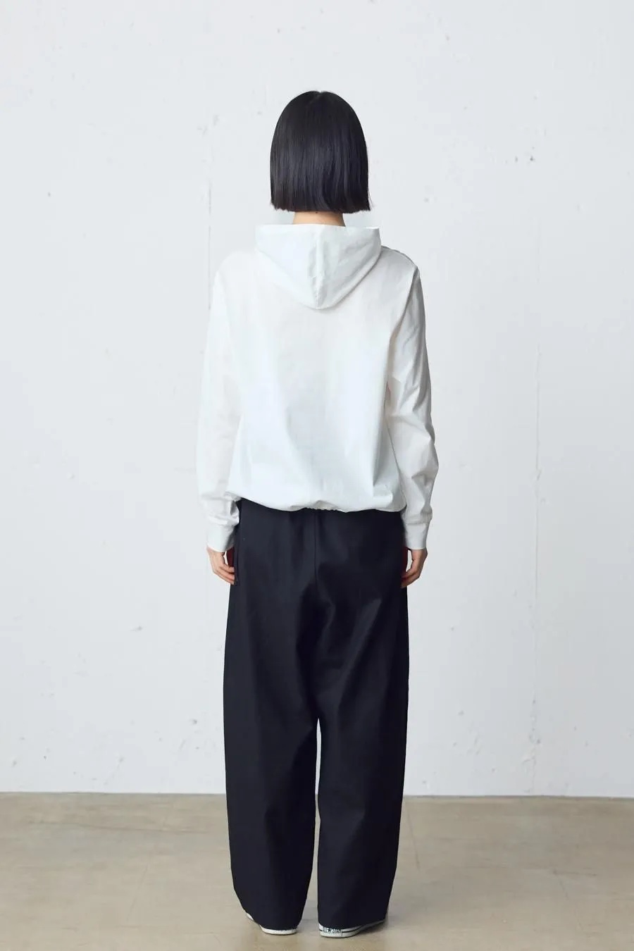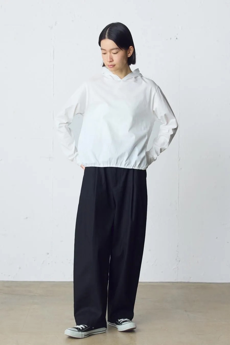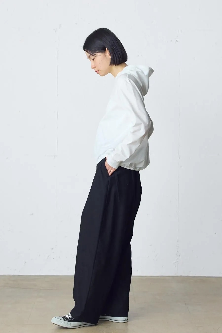 コットンブッチャーシリーズ。麻のような凹凸感がある素材をセミフォーマルな雰囲気に落とし込みました。共布のベルトが付いたワイドシルエットスラックスパンツ。ブッチャー素材とは、欧米の肉屋が使用していた丈夫で厚手の亜麻織物に似せて作られた織物。複数本の糸を引き揃えて織り込むことで生み出した立体感のある縦畝や横畝が表面に不規則に並びます。高級感がありながら麻のようなシャリ感もある爽やかな印象の素材です。