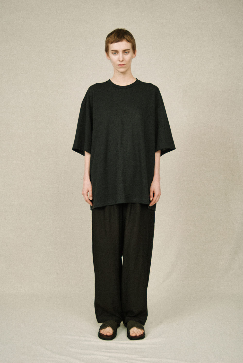 和歌山のニッターさんに編み上げて頂いた36Gス ーパーハイゲージ ニットのオリジナル素材。日本に数台しかな い大変稀少な編み機を使用して36Gと言う極めてハイゲージに編み上げたもはや布帛の様な 天竺素材。キュプラの強撚糸と綿の強撚糸を36ゲージの超ハイゲージで 編み上げ。表面にキュプラ、肌に当たる裏面にコットンが来る様に設計されて おります。一般的な天竺で は味わえ な い上品な光沢感とドレープ感があり、優れた吸湿性と抜群の肌触りが特徴で す。