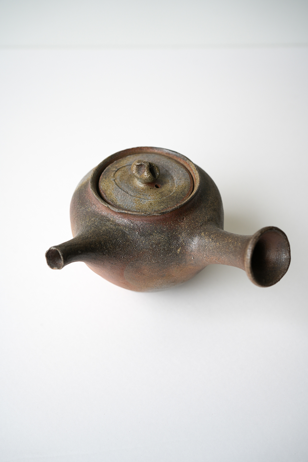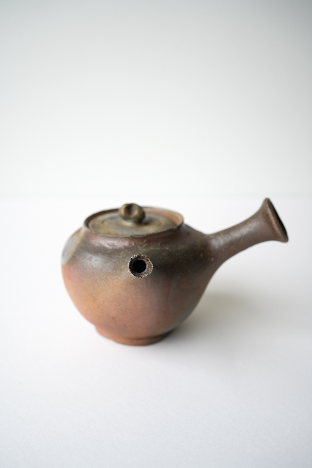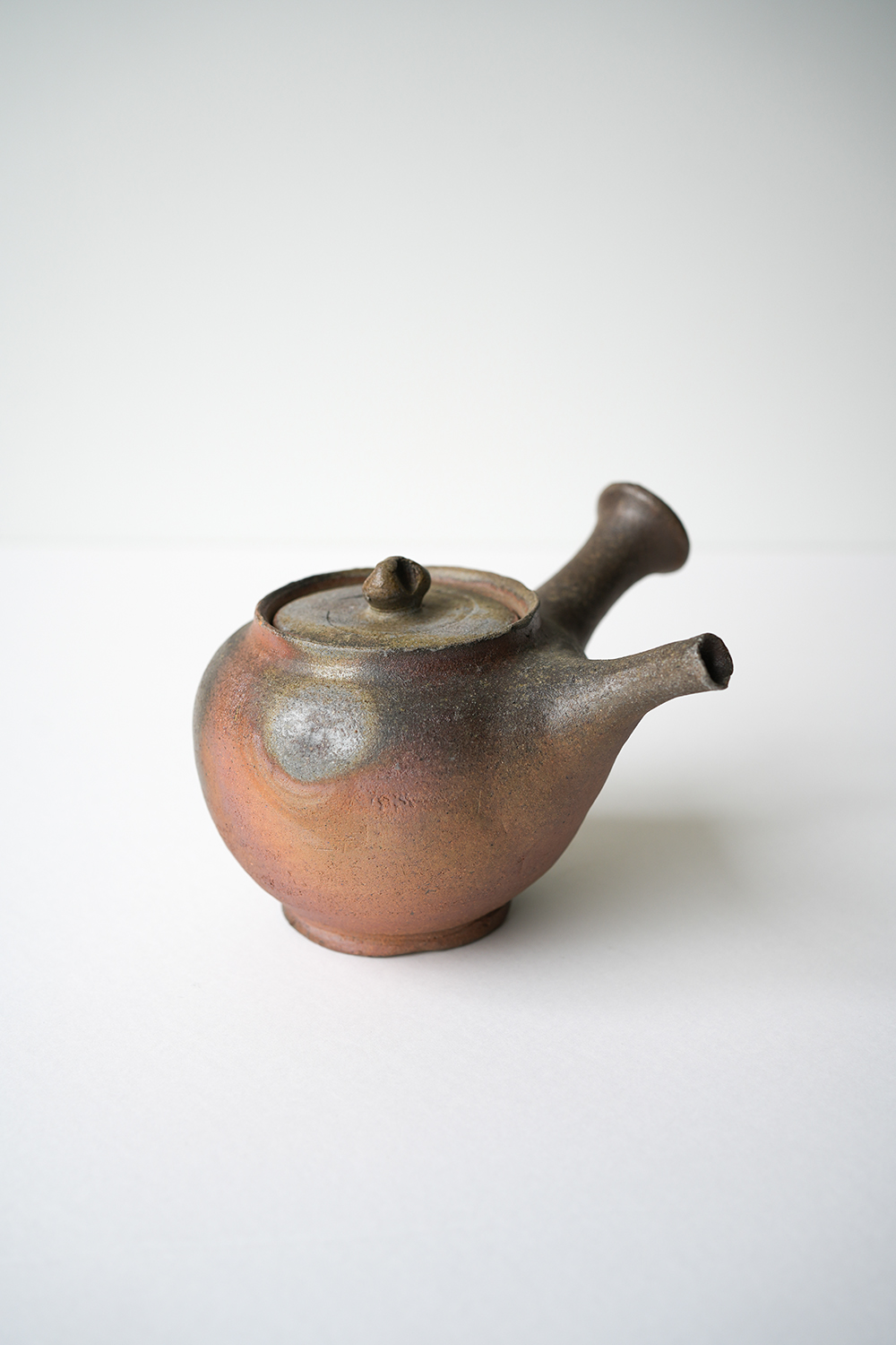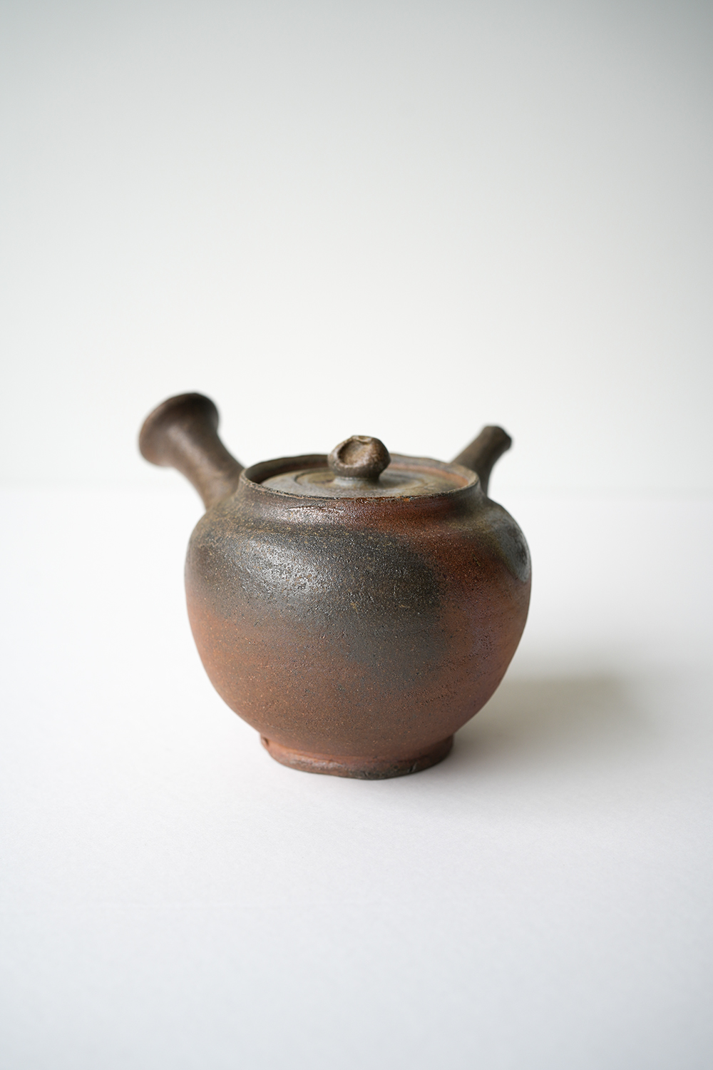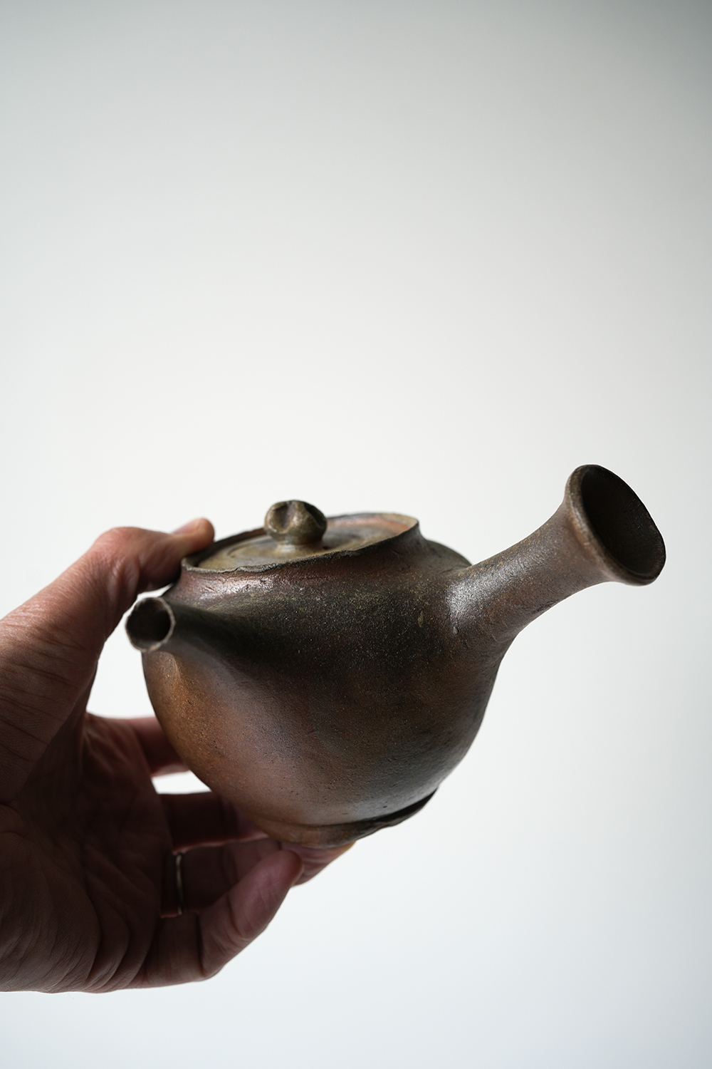「アツムイ窯」は、森岡光男さんと森岡宗彦さんお二人で営む安曇野の窯。森岡光男さんは神奈川県逗子市生まれ、鎌倉の名月窯で修業の後、萩、備前、沖縄など様々な窯をめぐり、ありとあらゆる技法や技術に習熟した。1972年、備前に落ち着き、イサム・ノグチと出会う。ノグチから刺激を受けて渡米。ニューヨークでは、何度もイサム・ノグチを訪問し、シアトルでアメリカ人の陶芸家エリック・ネルソン氏と窯を作る。米国滞在の後ヨーロッパ各地を旅し安曇野に登窯を築き、それ以来焼き締めのうつわ作りに没頭。1944年生まれ、1967年から陶芸を始められた名人 森岡光男さんのシグネチャープロダクトである急須。灰の中で焼き締められた灰色に輝く匠の急須と湯呑みをご覧ください。