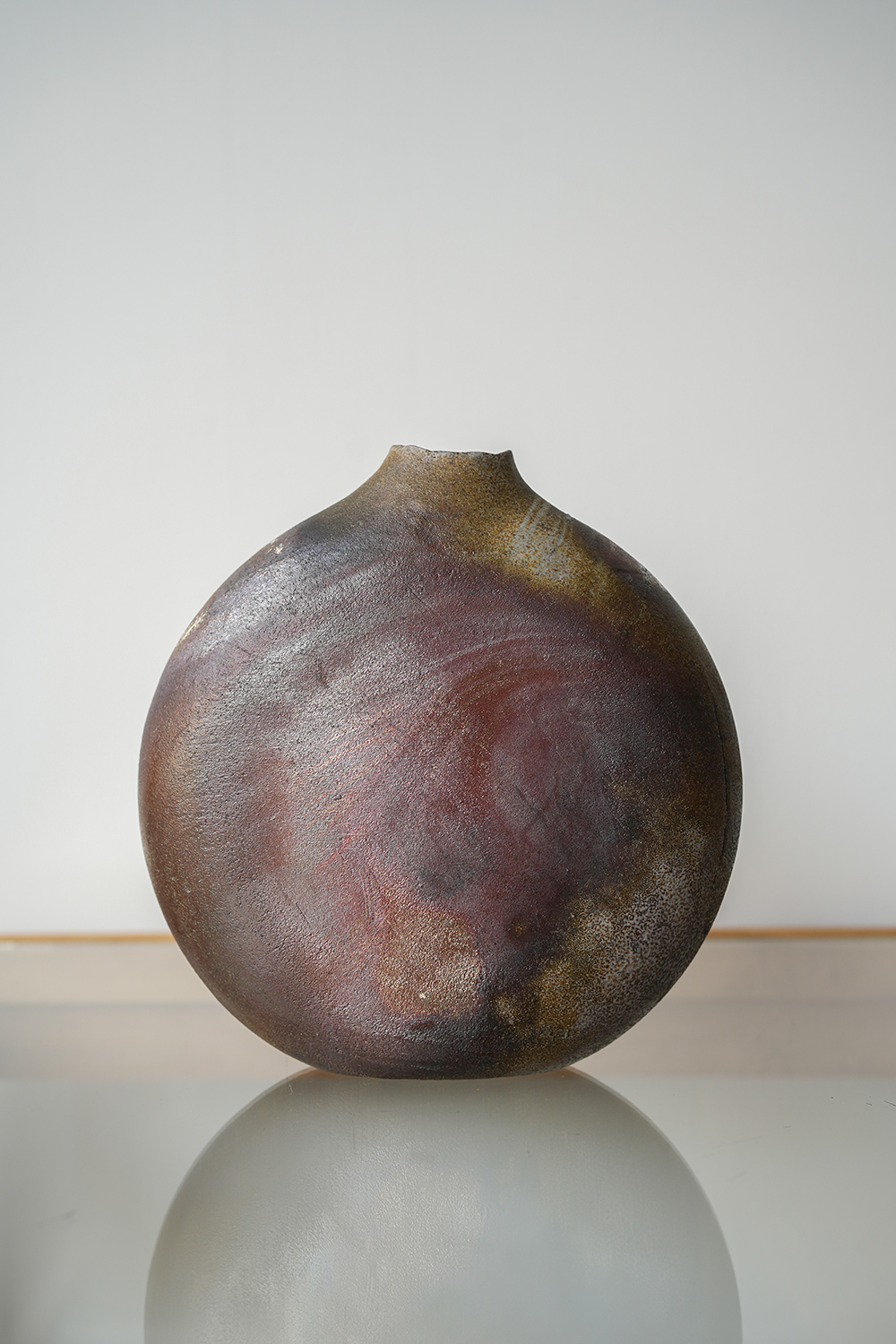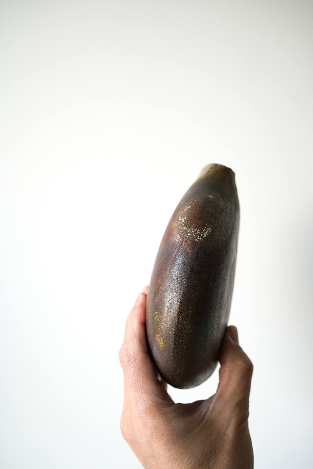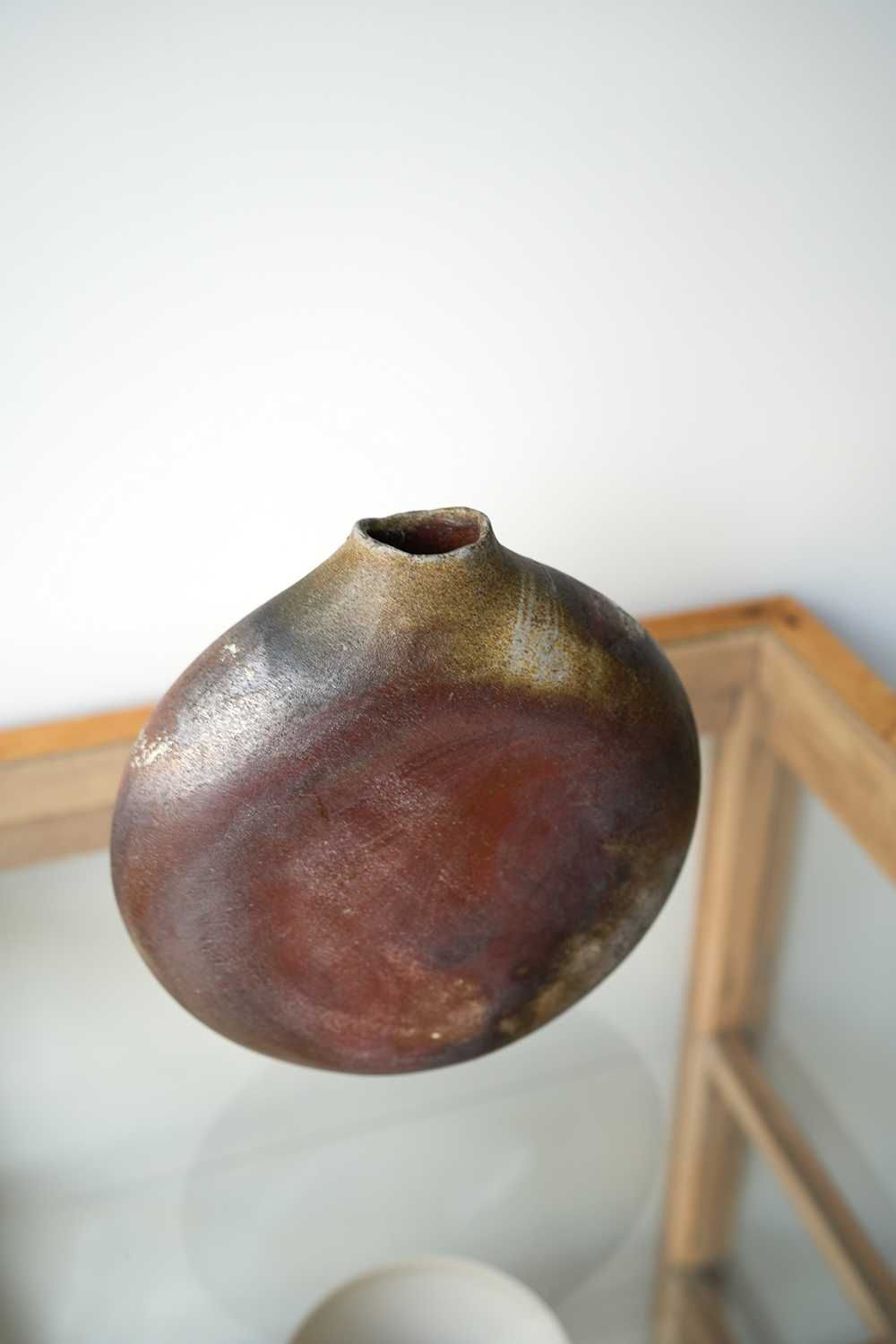 森岡宗彦さんとお父様の森岡光男さんお二人で営む「アツムイ窯」。森岡光男さんは神奈川県逗子市生まれ、鎌倉の名月窯で修業の後、萩、備前、沖縄など様々な窯をめぐり、ありとあらゆる技法や技術に習熟した。1972年、備前に落ち着き、イサム・ノグチと出会う。ノグチから刺激を受けて渡米。ニューヨークでは、何度もイサム・ノグチを訪問し、シアトルでアメリカ人の陶芸家エリック・ネルソン氏と窯を作る。米国滞在の後ヨーロッパ各地を旅し安曇野に登窯を築き、それ以来焼き締めのうつわ作りに没頭。息子である森岡宗彦さんは光男さんと共に幼き頃より陶芸に向き合い今に至る。鉱石などを使わない、薪窯(穴窯・登窯)で燃やされた木の灰が自然の釉薬となって表情を作る焼き締め技法。