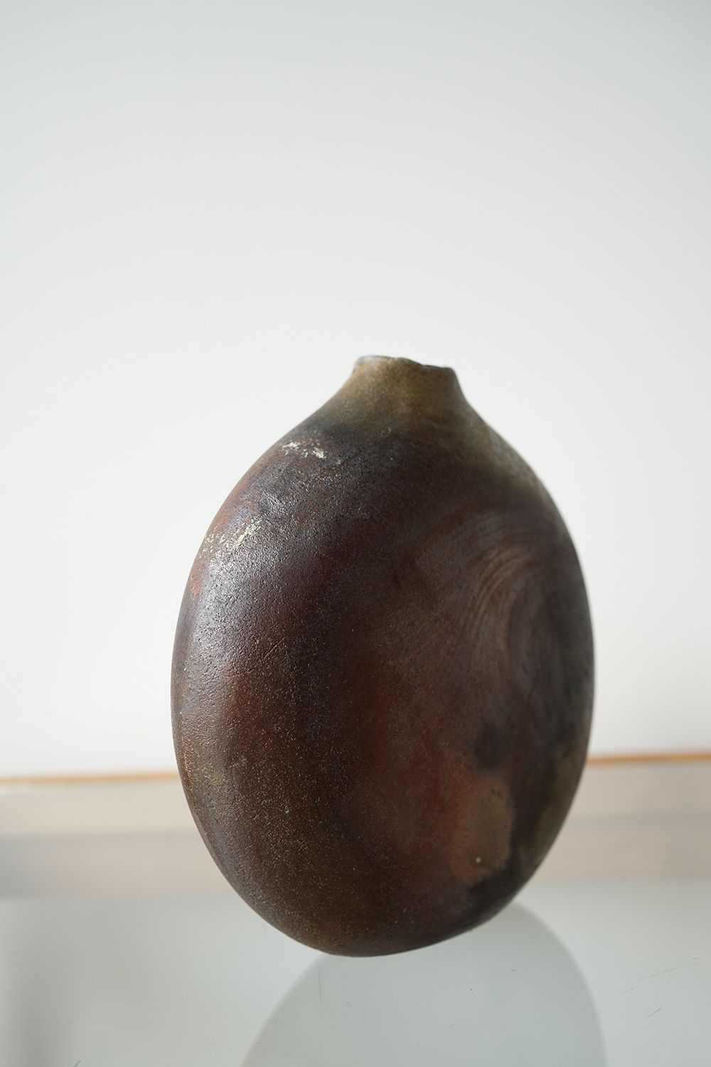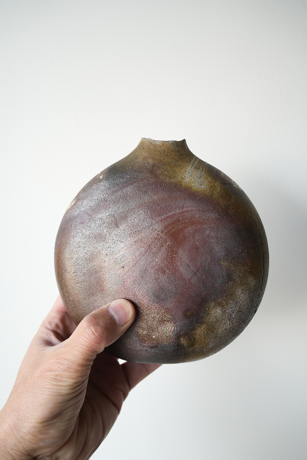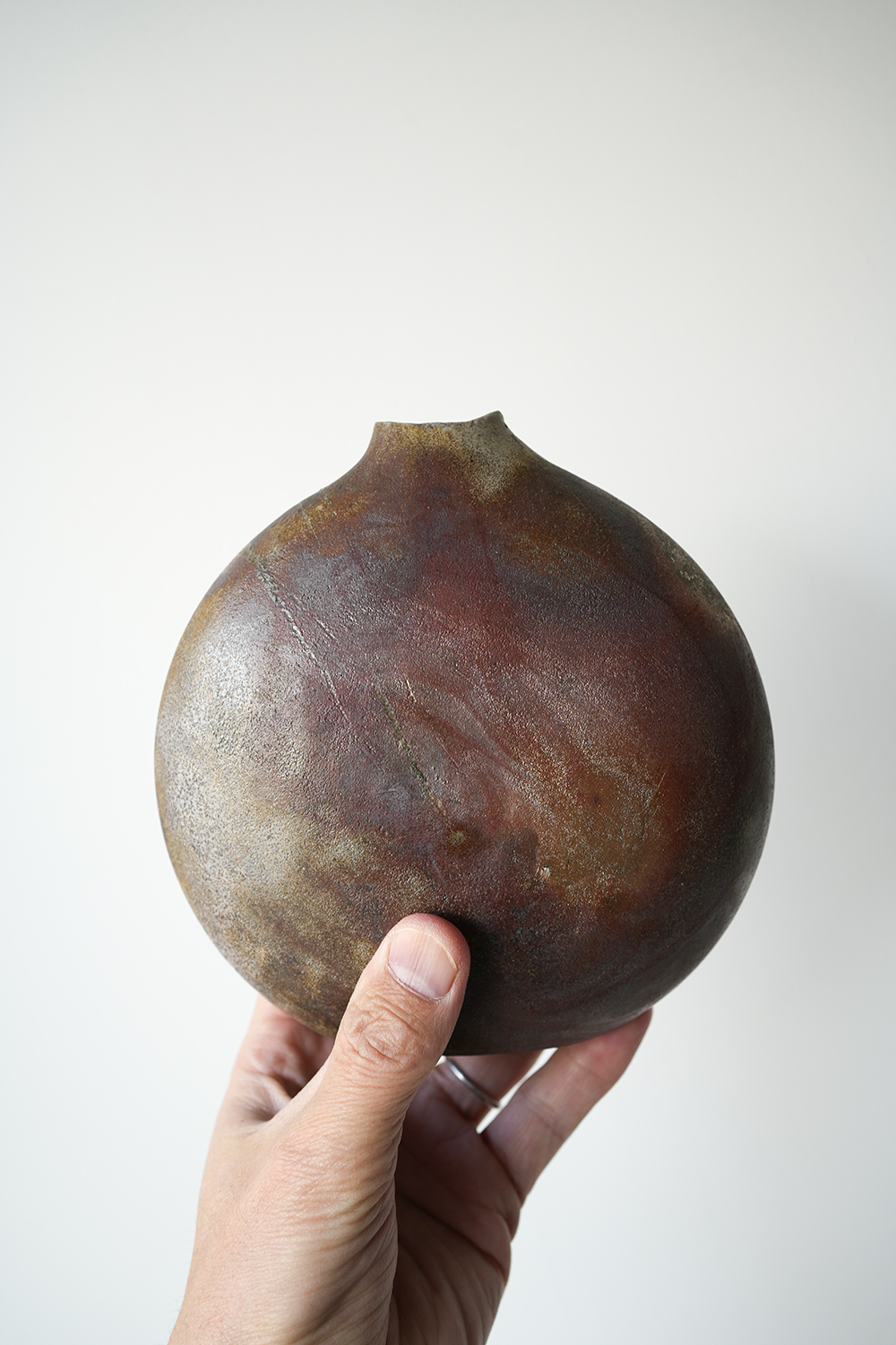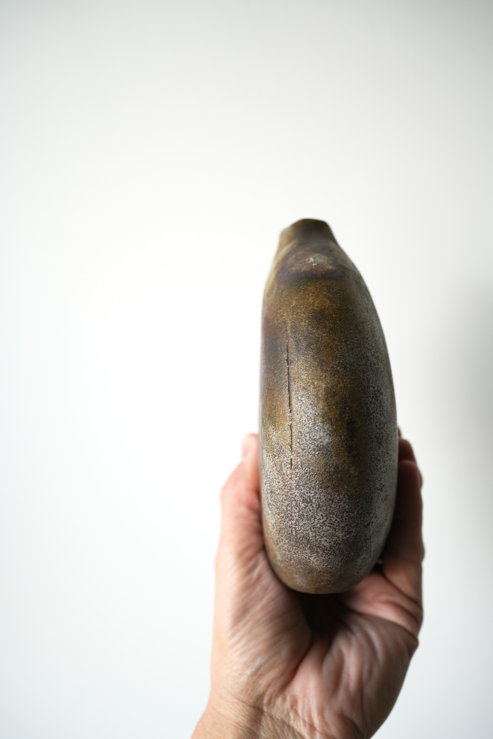 偏壺(へんこ)とは、胴が平たい(扁平な)壺のことで、酒器や水差しとして古くから世界各地で見られる器形です。壺の胴を横から押しつぶしたような、安定感のある形状が特徴で、陶器や金属器、漆器など様々な素材で作られ、花瓶としても使われます。特に、中国、朝鮮、日本(須恵器など)の古い作例が多く、実用的ながら鑑賞価値も高いものがあります。