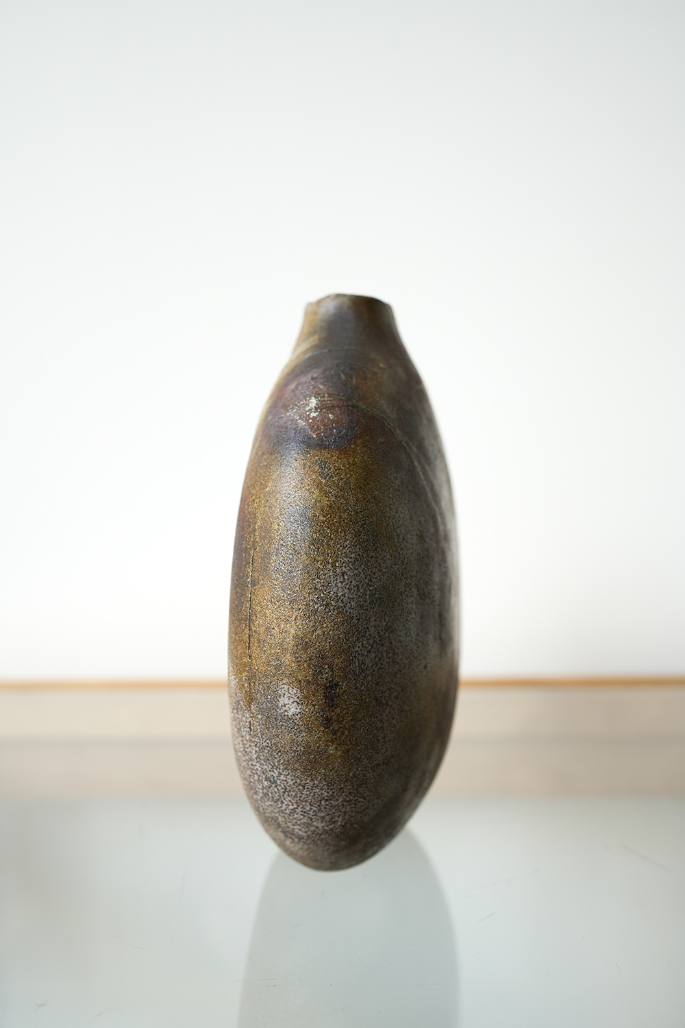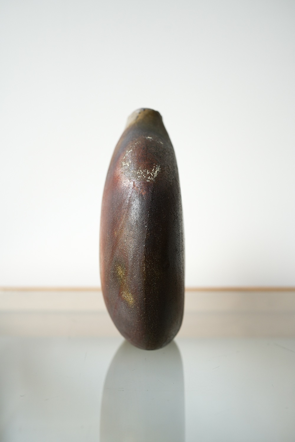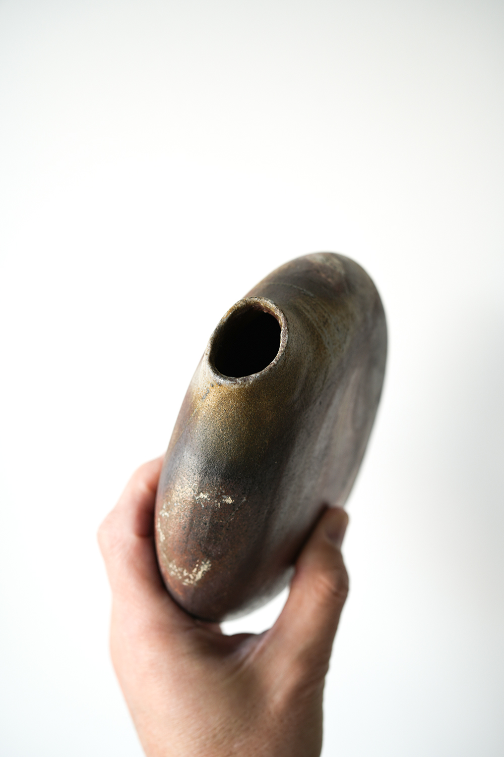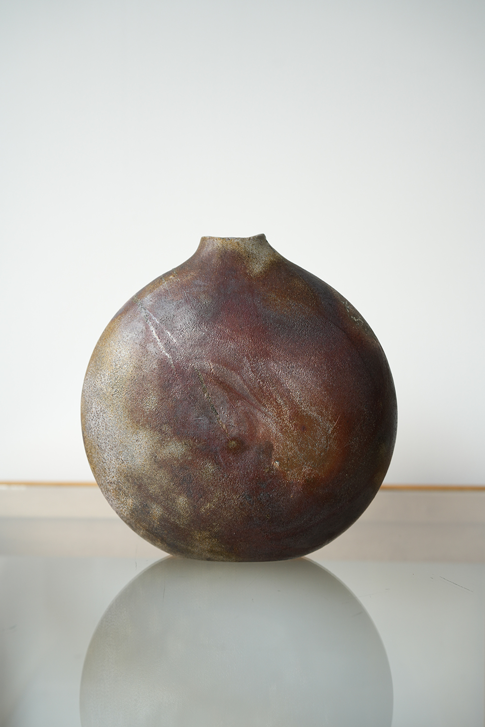 偏壺(へんこ)とは、胴が平たい(扁平な)壺のことで、酒器や水差しとして古くから世界各地で見られる器形です。壺の胴を横から押しつぶしたような、安定感のある形状が特徴で、陶器や金属器、漆器など様々な素材で作られ、花瓶としても使われます。特に、中国、朝鮮、日本(須恵器など)の古い作例が多く、実用的ながら鑑賞価値も高いものがあります。