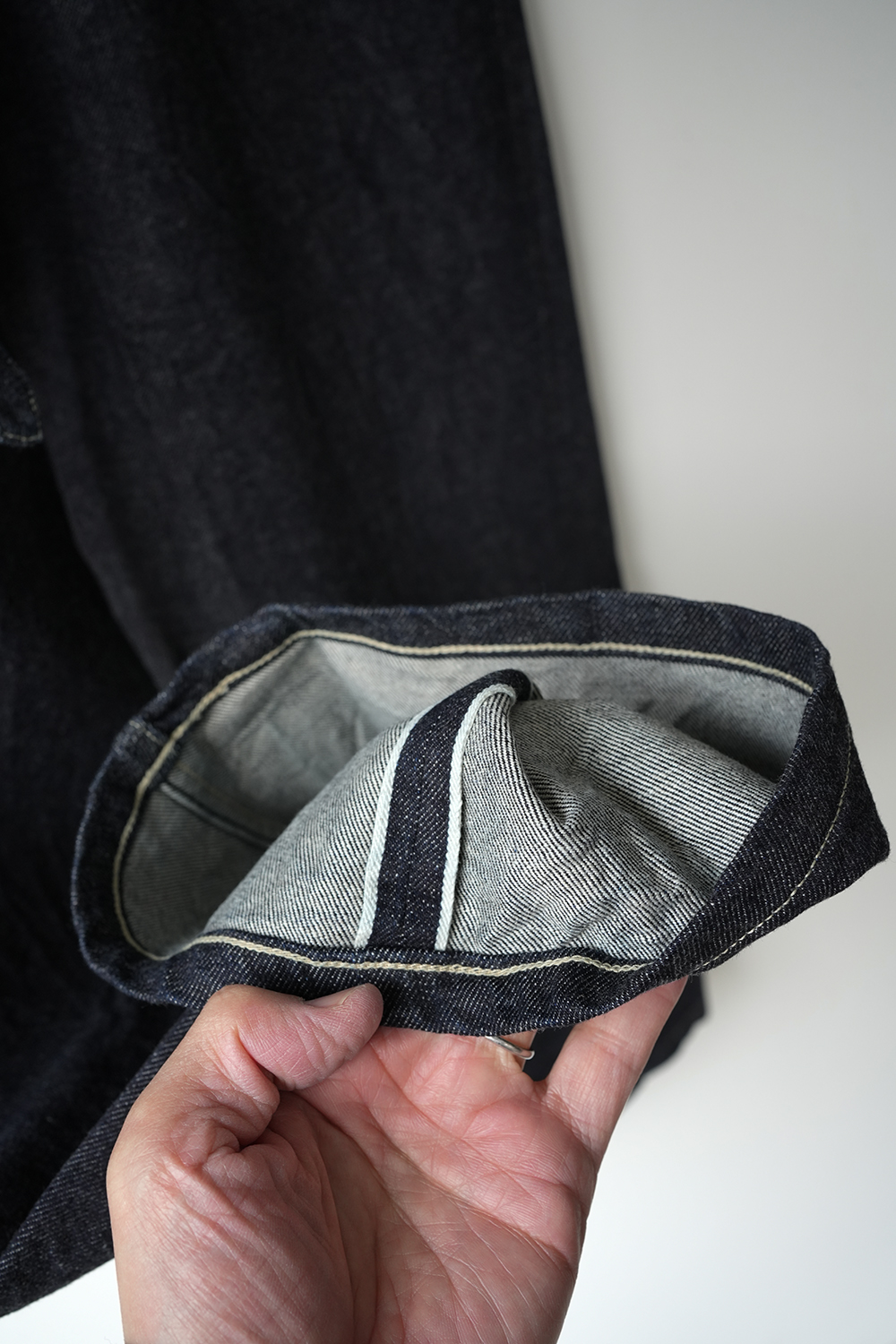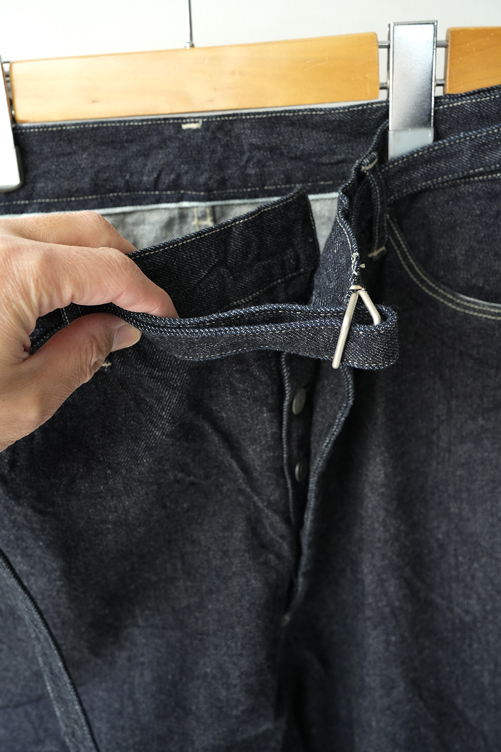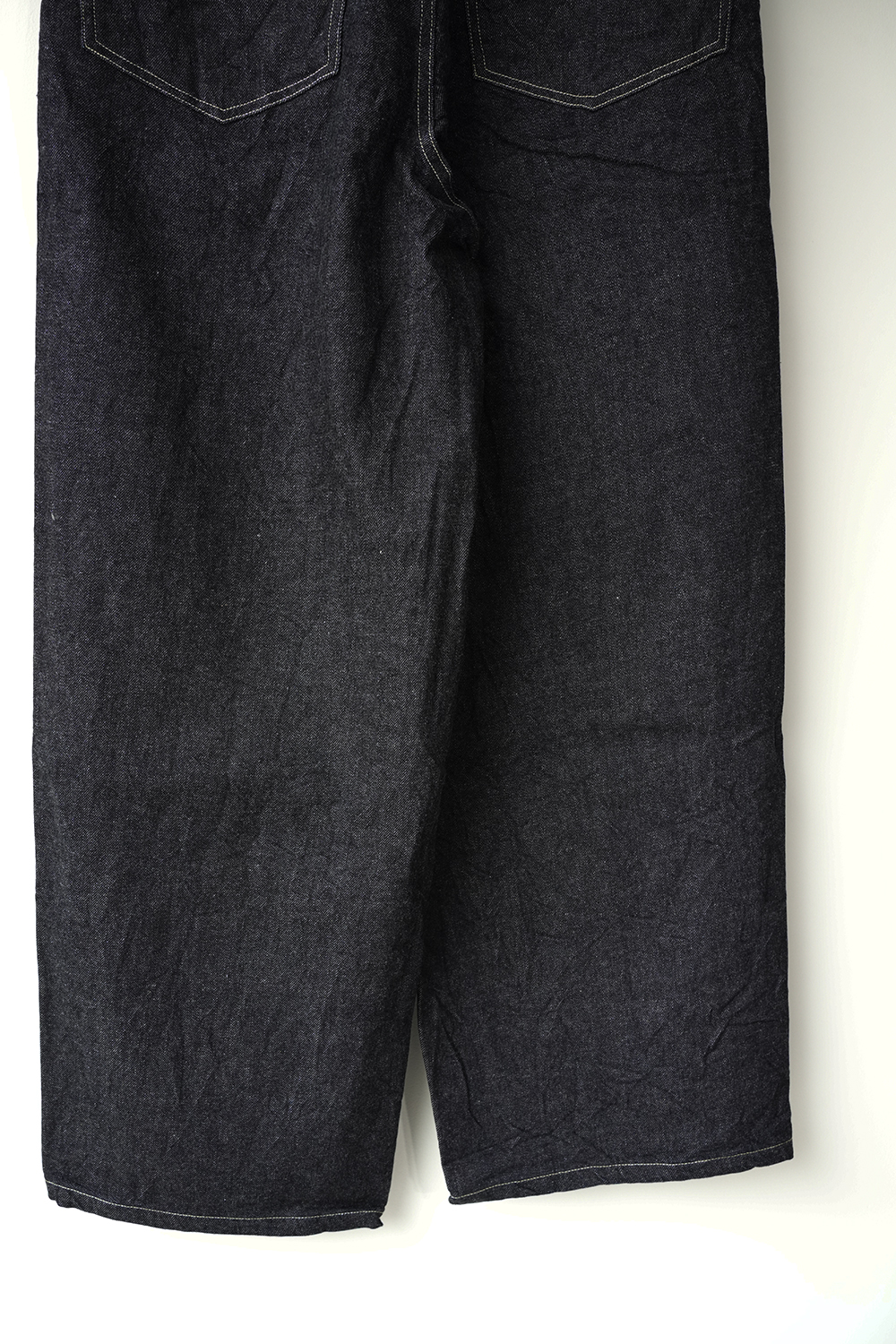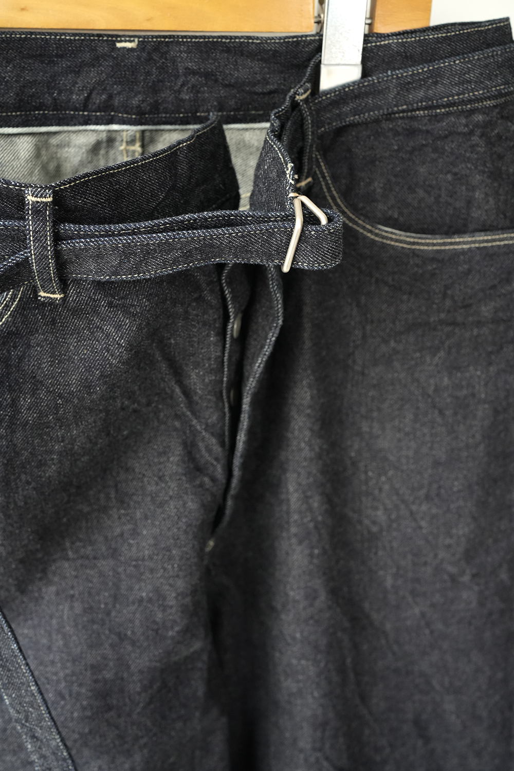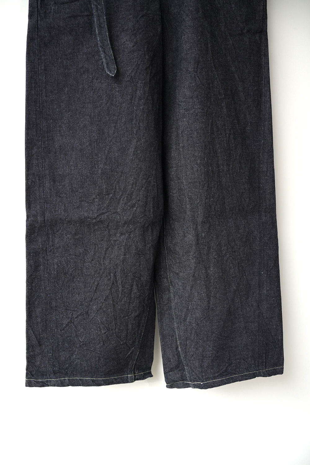 膝下の後ろから前に斜めにねじりながら立体的に仕上げています。ベルトは本体を一体化しているので締めやすくなっています。少しムラのある糸と落ち綿を使用し、表面に強めの毛羽立ちや独特の柔らかさが特徴のオリジナルデニム生地を使用しています。※ワンウォッシュされた商品の為、色やサイズに個体差がでます。