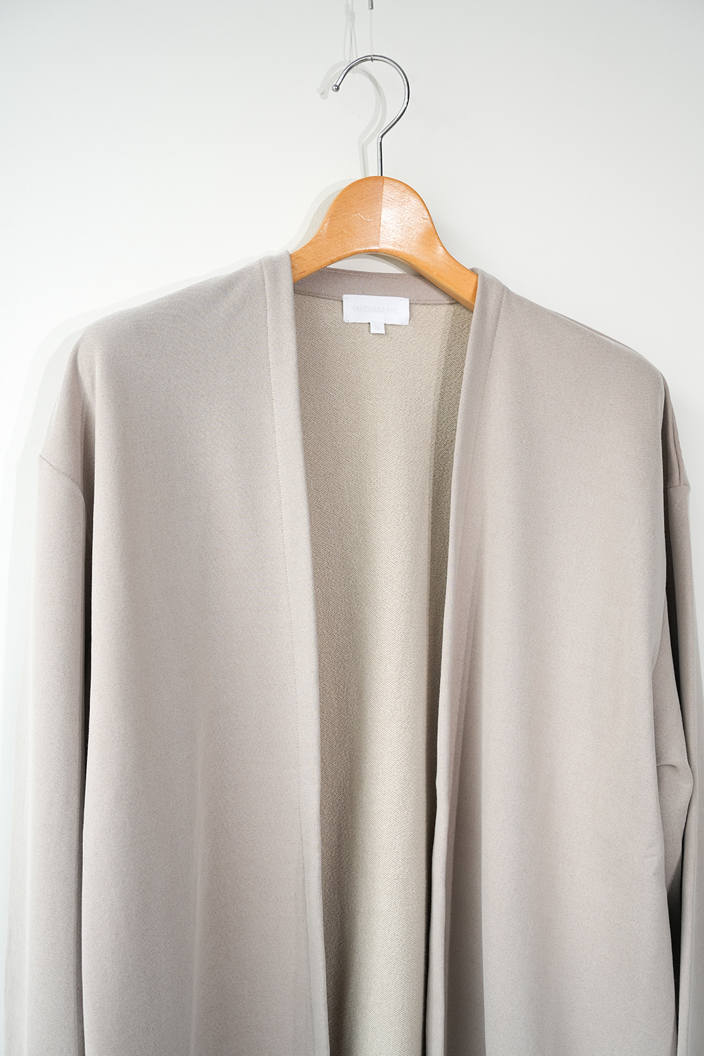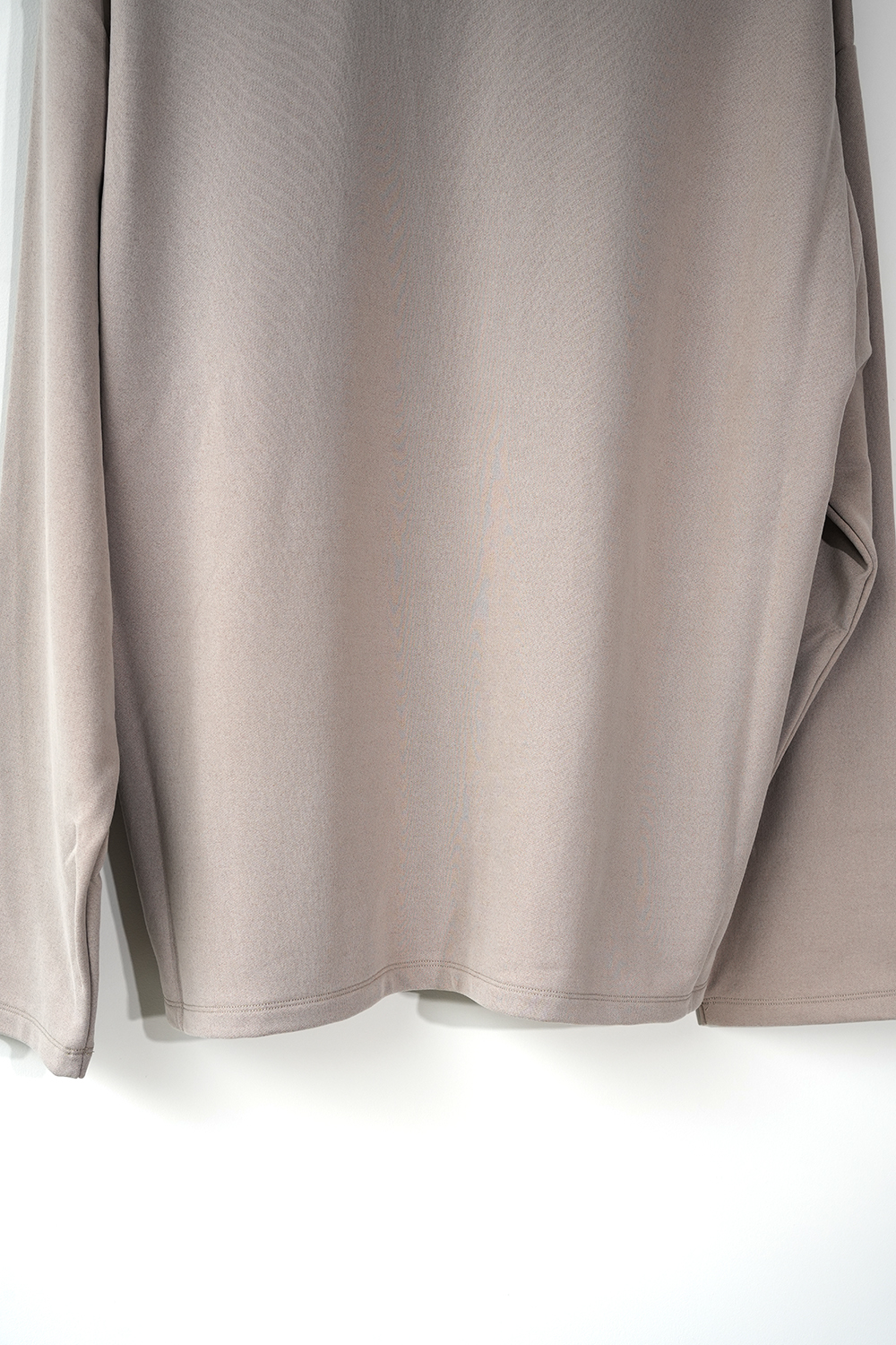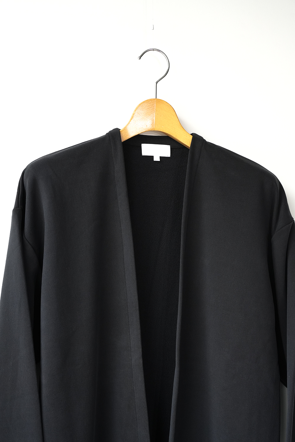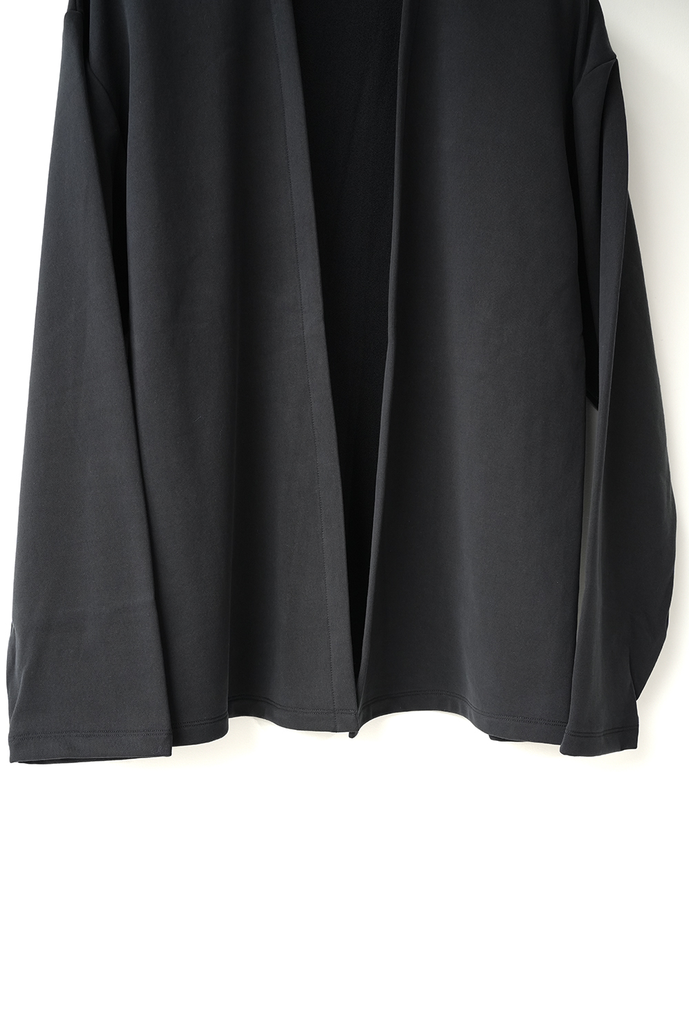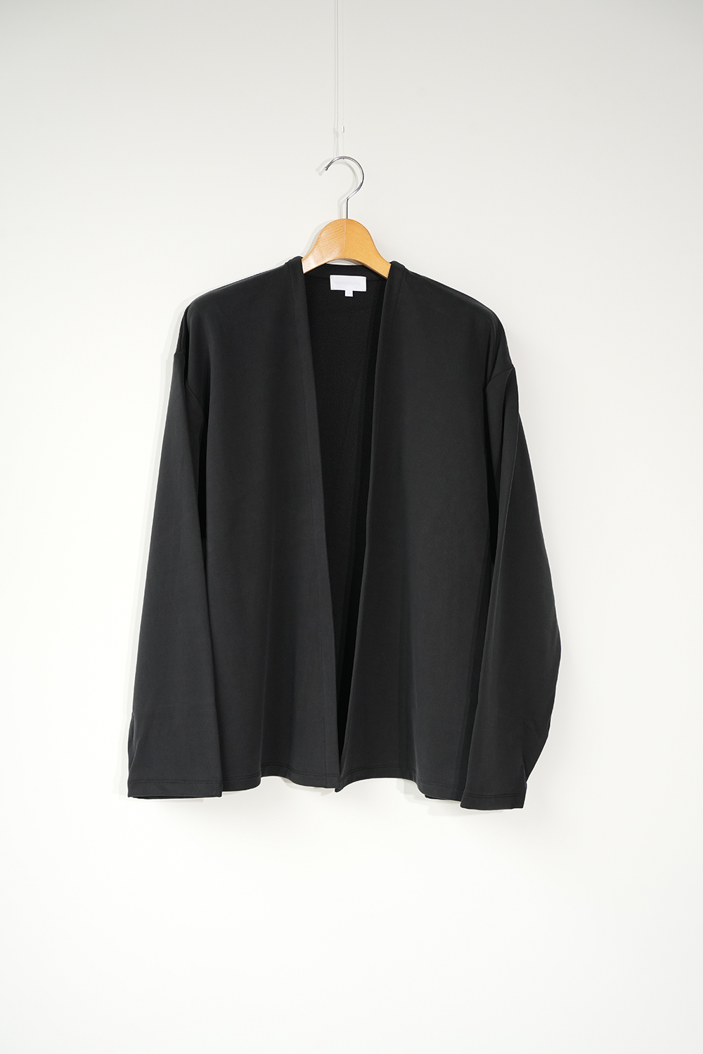 新しい価値観のある裏毛素材。定番となった独自の光沢感と風合いのキュプラ裏毛。28G高密度裏毛機で度詰めに編立てた新裏毛素材。表糸に105D高収縮キュプラ糸を使用。生地加工で、フィブリル加工(繊維の中の小さな繊維、を摩擦させ、表面を毛羽立たせる加工)することで 独特な光沢感と、ヌメリ感がございます。肌面には、スビンコットン双糸を使用してさらっとした着心地がございます。他にはないとろみが特徴です。スウェットと天竺の間の肉感にて、オールシーズン着用頂けます。新型のボタンレスカーディガン。さらっと羽織りやすいシルエットが特徴。なるべく素材の良さがでるように、仕様を工夫しております。