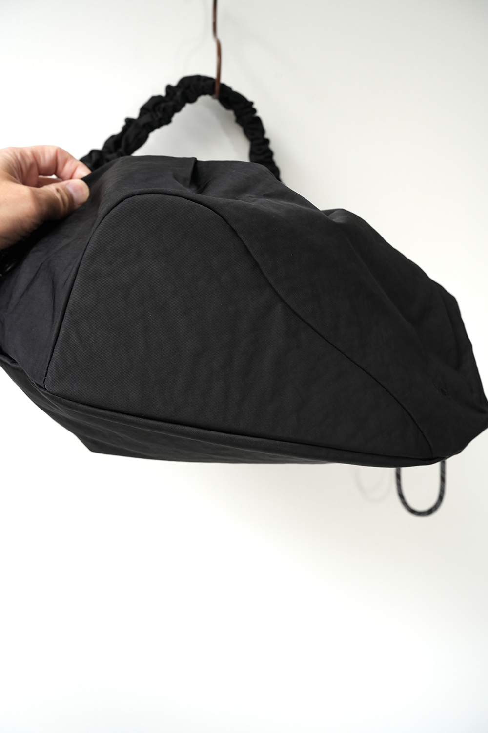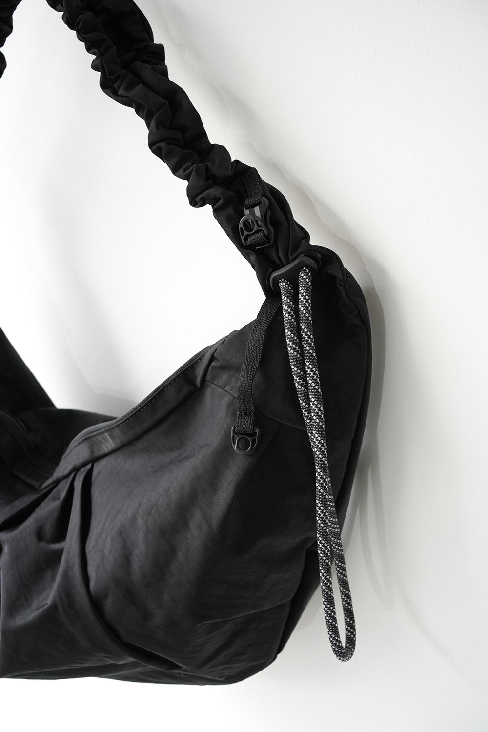アシンメトリーなパネリングと、計算された無数のタックが独特な立体感を生み出すボディバッグ。底マチ部分の一部には芯材を入れ、バッグ全体に厚みと彫刻的な構造を持たせることで、既存のボディバッグとは一線を画すデザインに仕上げています。ショルダーにはロープを採用し、自在な長さ調整が可能。コンパクトなサイズ感ながら、機能性と造形美を兼ね備えた新たなプロポーションです。本体素材には、水洗い加工を施したTEXTURED TWILL NYLONを使用。シワ感とカラーの濃淡が製品染のような深みと味わいを生み出しています。