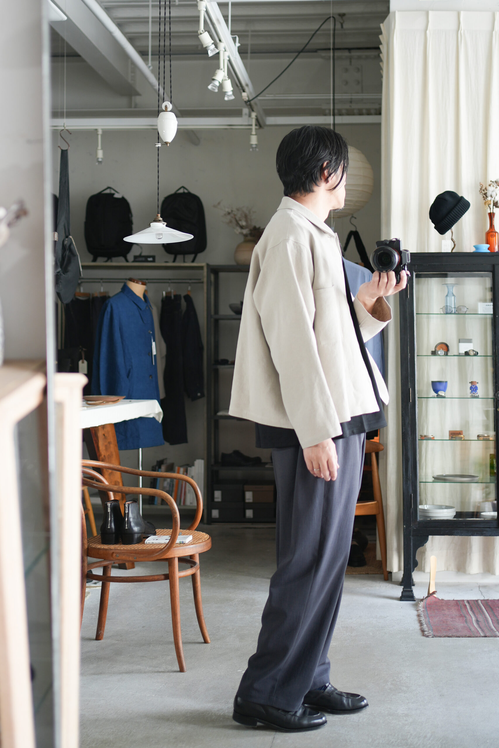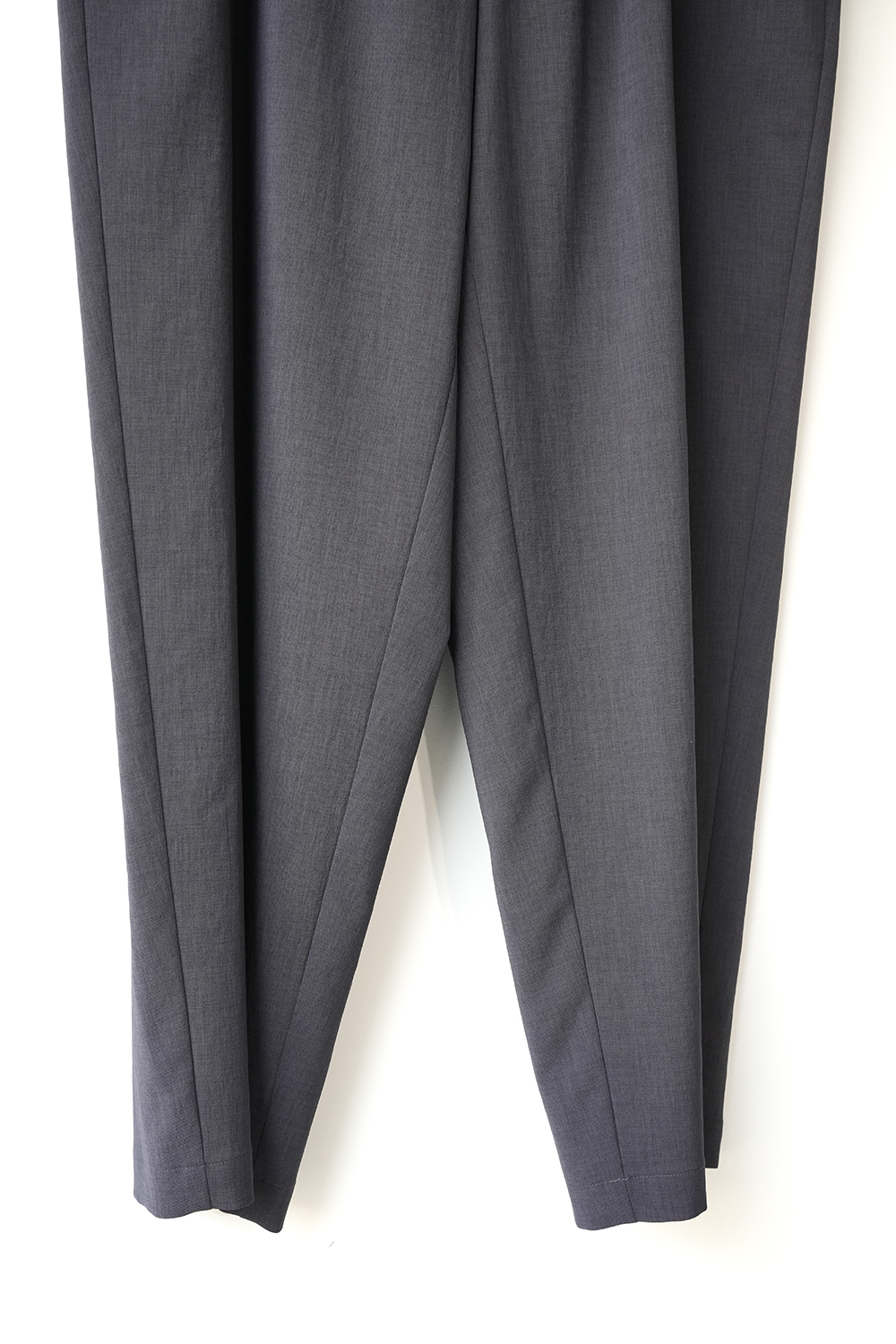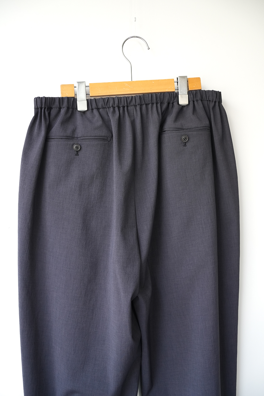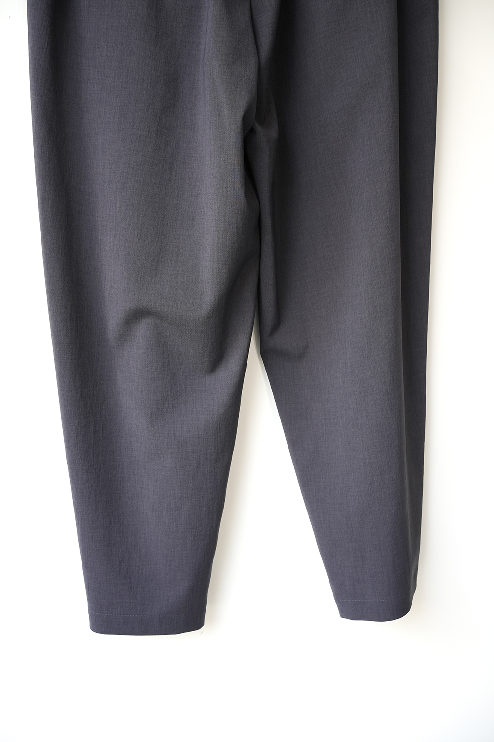 北陸地方の機屋にて製織したオリジナル素材。環境に配慮したサスティナブルなリサイクルポリエステルを使用した、ウールのスーツ生地を再現したオリジナルのギャバジン生地。ウールに洗いを掛けた時に出る、カリッとしたドライ感のある風合いと、凹凸のある自然な 小ジワをモチーフに制作しました。ポリエス テルとは思えないウールのスーツ生地の様な品格と風合い、奥行きのあるカラーリングが特徴。洗濯脱水後、部屋干しで3時間以内で乾くサスティナブルな高機能素材。優しい力で伸びる圧迫感のないリラックスストレッチ。ウール素材、綿素材と比べ色褪せしにくくシワにもなりにくい。