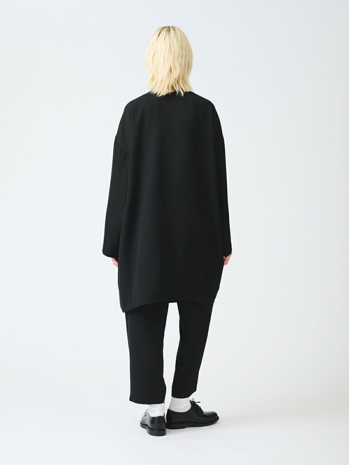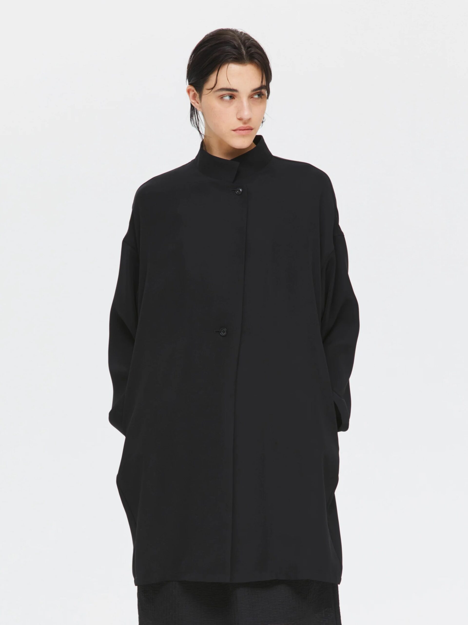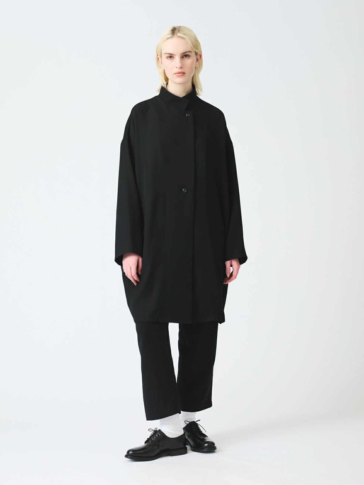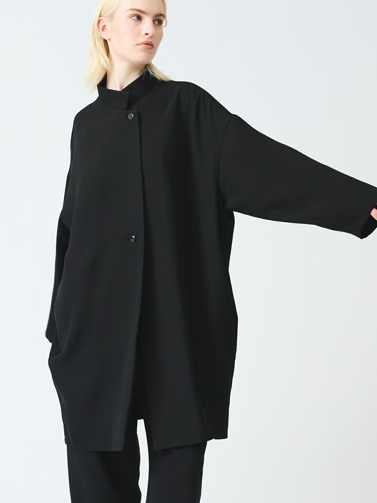 シャープな印象のスタンドカラーが際立つ、モードなワイドジャケット。フロントにはしっかりとした芯地を使用し襟が美しく立ち上がる設計。スタイリッシュな佇まいをキープしながら洗練された雰囲気を演出します。ドロップショルダーとワイドなシルエットが程よい落ち感を生み、抜け感のある着こなしに。ひざ丈ほどのミドル丈でアウターとしてはもちろんワンピースとしても活躍します。特殊な構造によるエアリーなふくらみと上品な光沢が魅力のダブルサテンを使用。しなやかな質感が肌に優しく馴染みます。シワになりにくくラフに羽織るだけで洗練された印象に。オケージョンシーンにも対応できる一着です。裏地なし。サイドポケット付き。