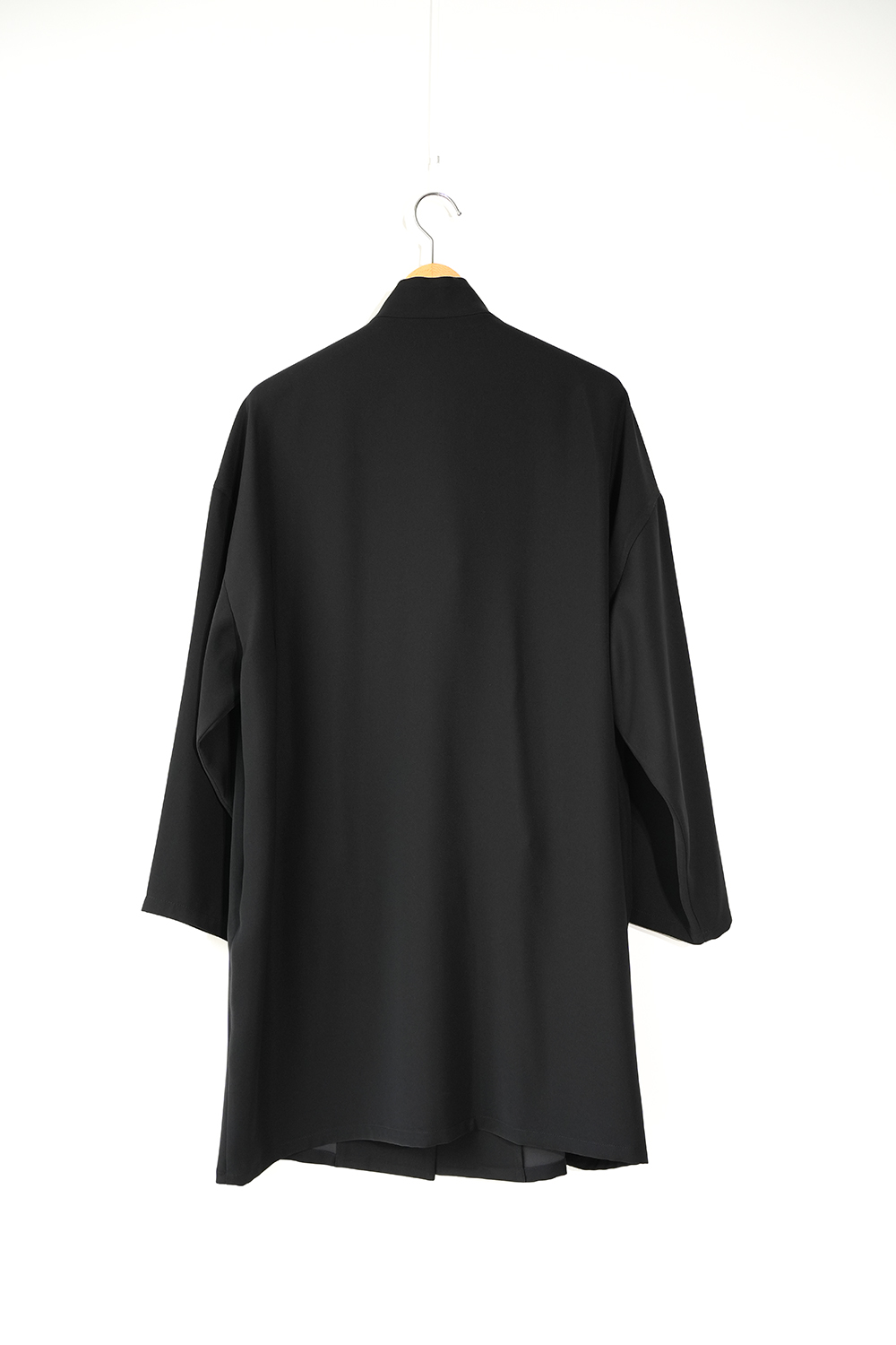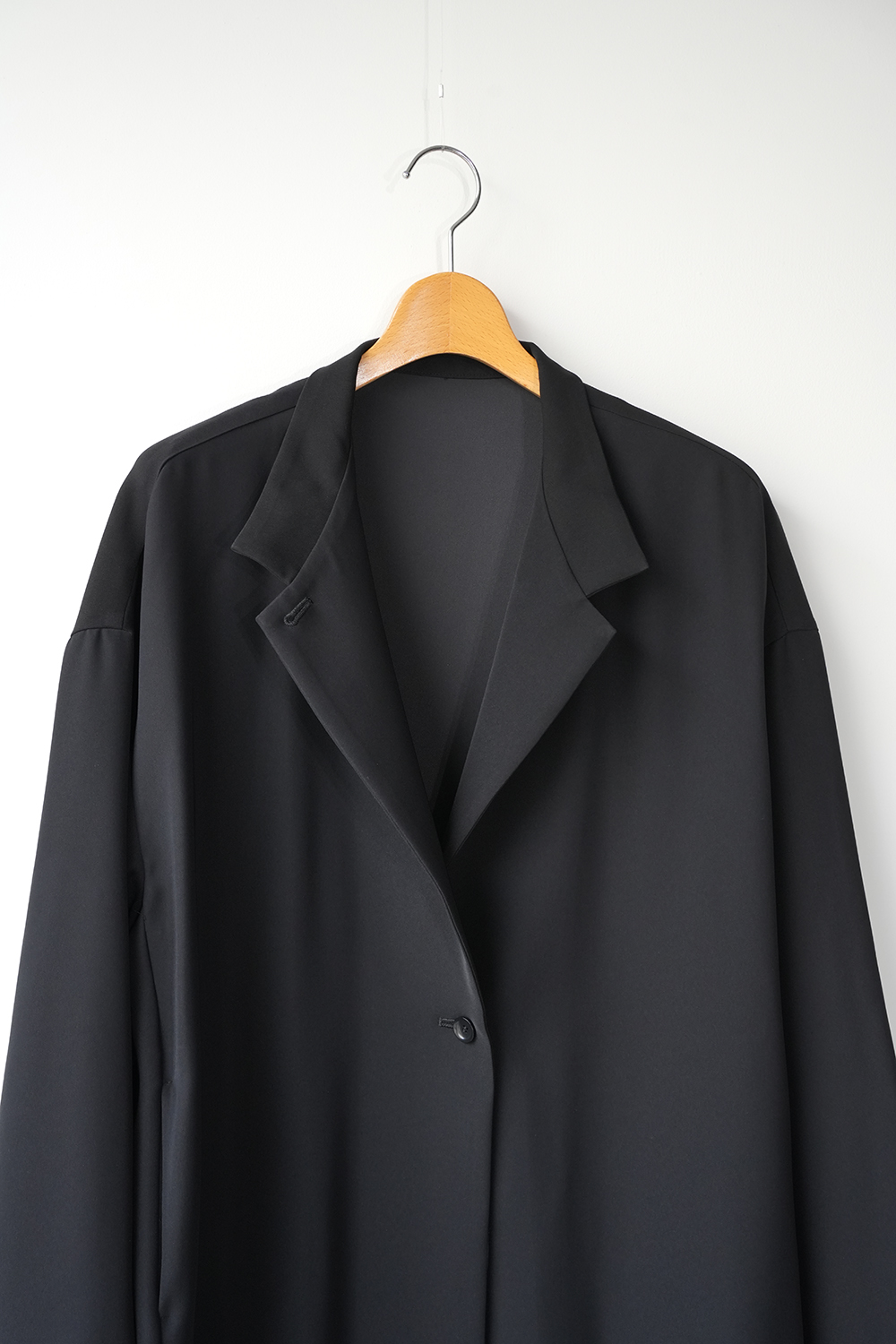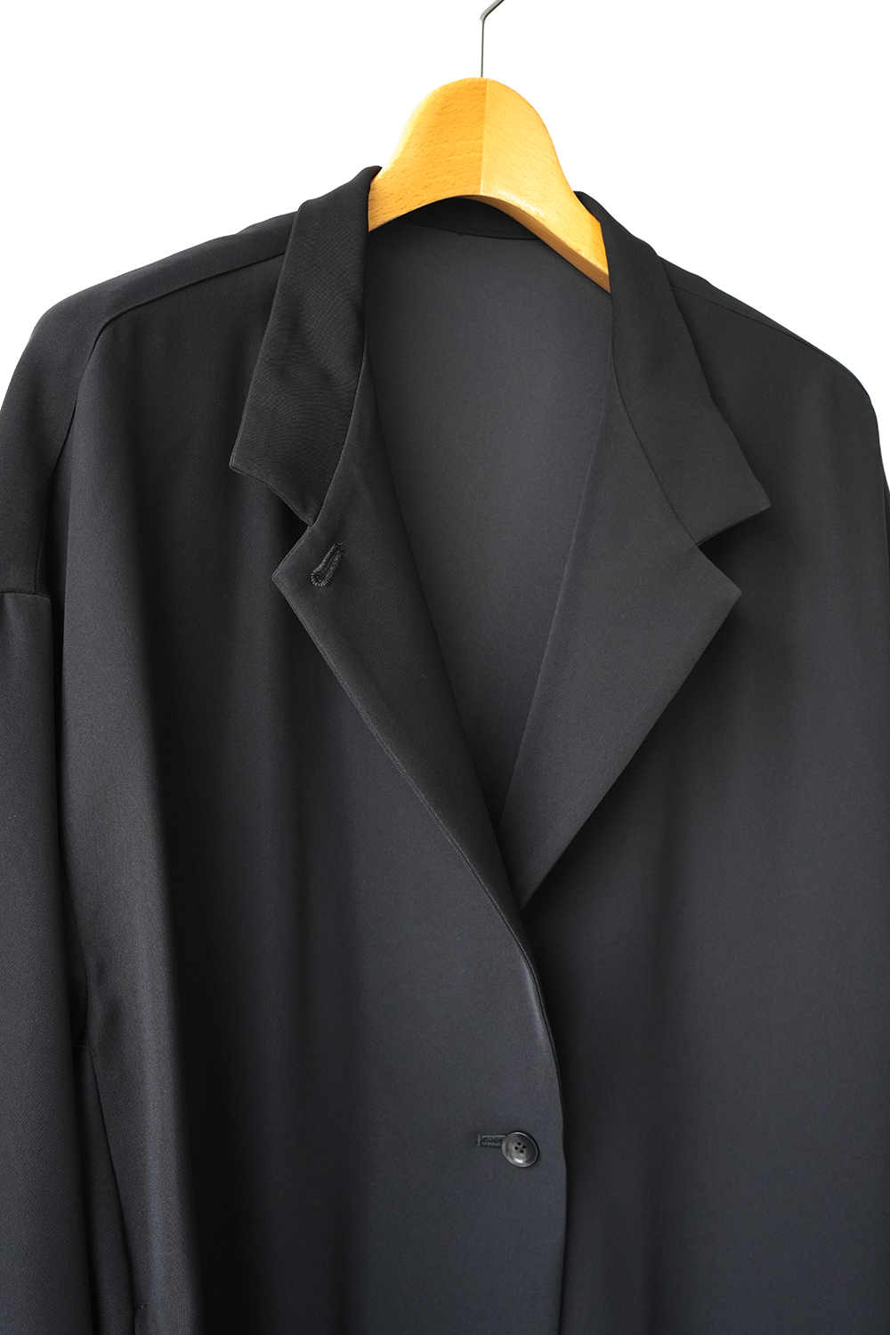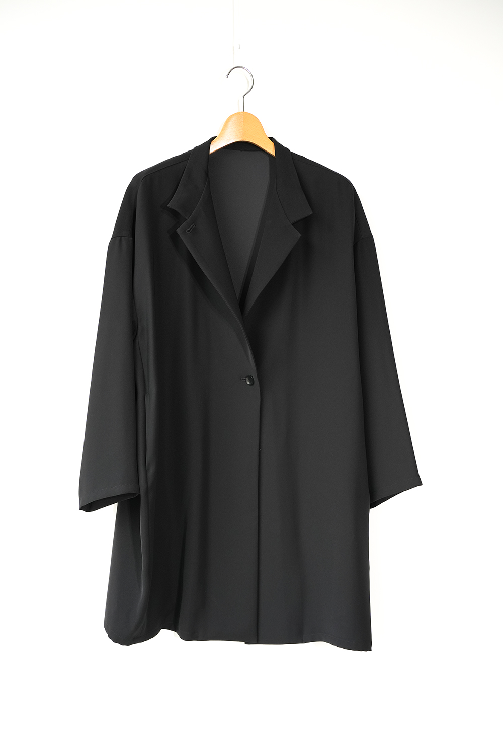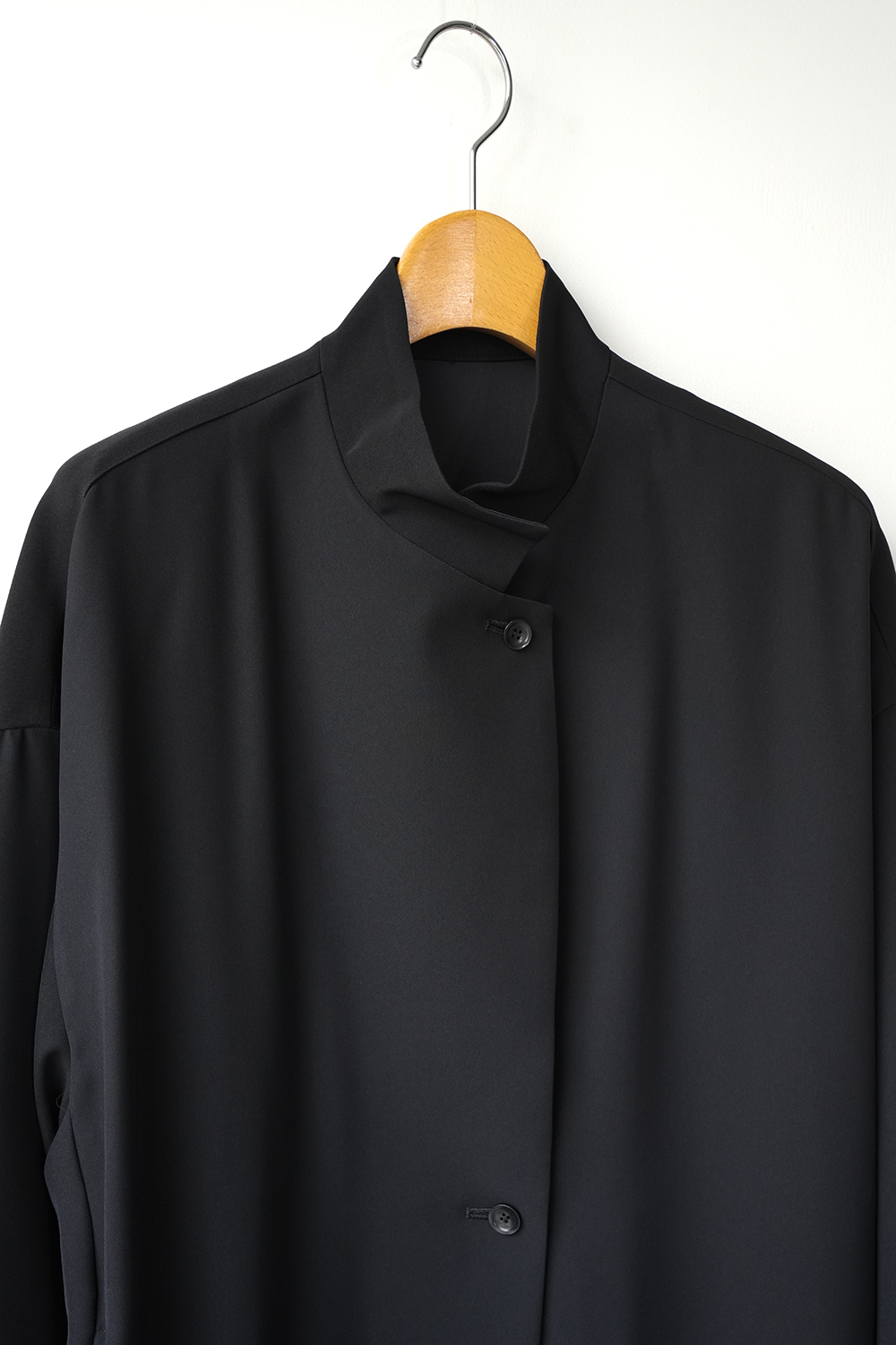 シャープな印象のスタンドカラーが際立つ、モードなワイドジャケット。フロントにはしっかりとした芯地を使用し襟が美しく立ち上がる設計。スタイリッシュな佇まいをキープしながら洗練された雰囲気を演出します。ドロップショルダーとワイドなシルエットが程よい落ち感を生み、抜け感のある着こなしに。ひざ丈ほどのミドル丈でアウターとしてはもちろんワンピースとしても活躍します。特殊な構造によるエアリーなふくらみと上品な光沢が魅力のダブルサテンを使用。しなやかな質感が肌に優しく馴染みます。シワになりにくくラフに羽織るだけで洗練された印象に。オケージョンシーンにも対応できる一着です。裏地なし。サイドポケット付き。