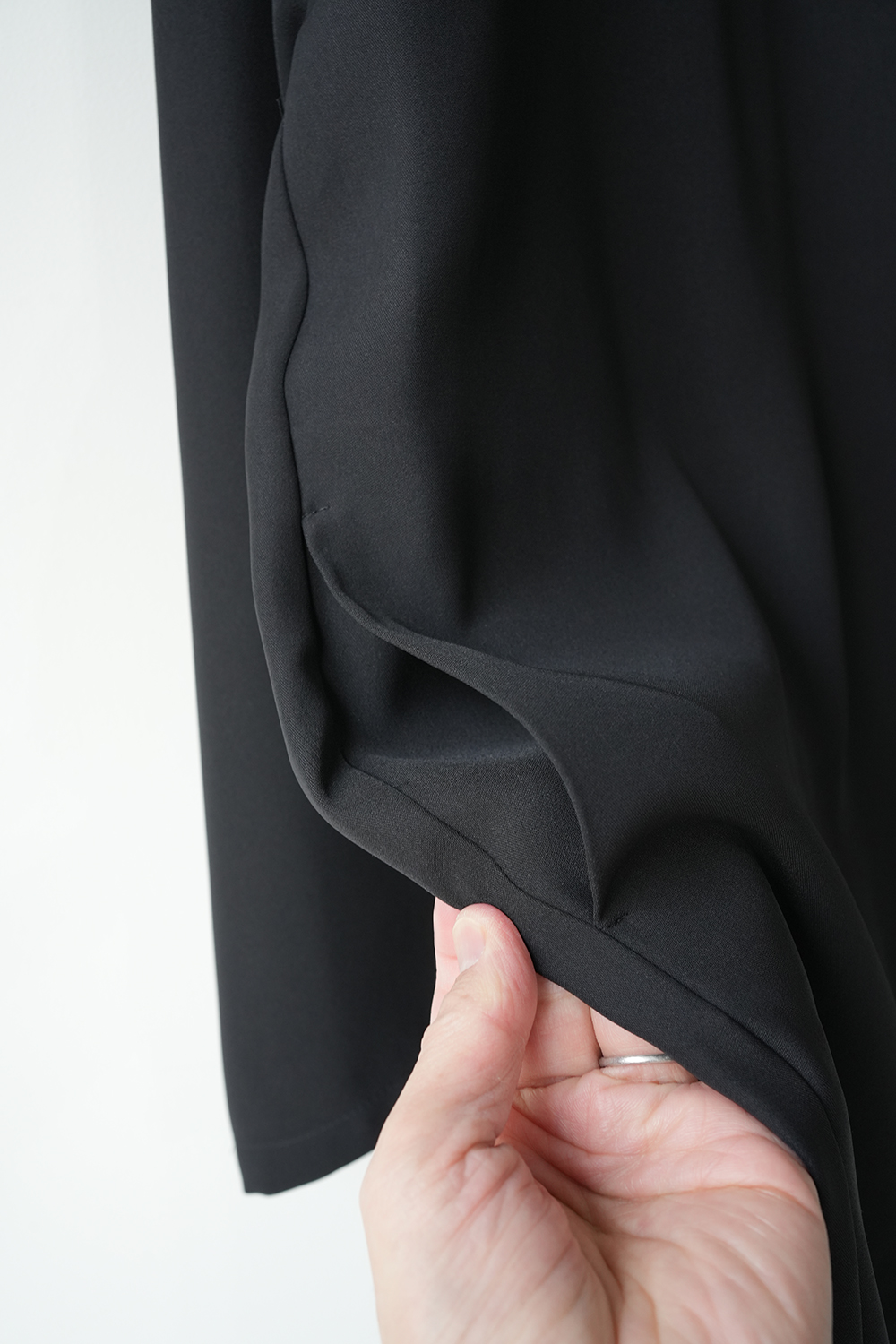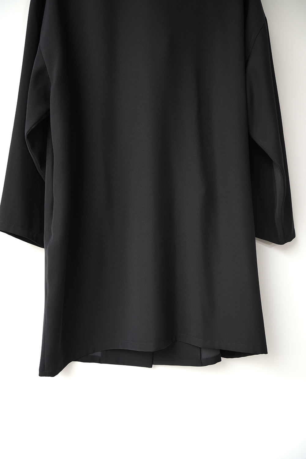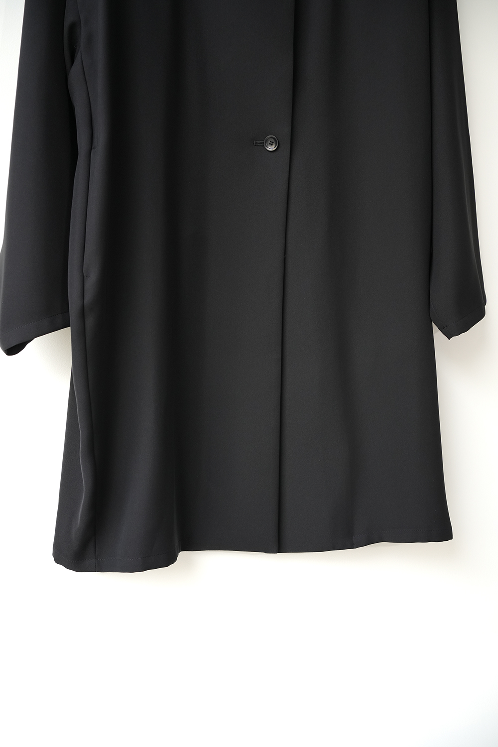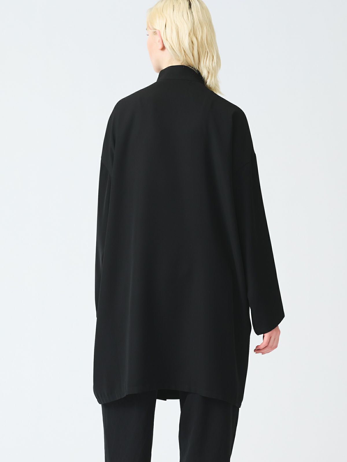シャープな印象のスタンドカラーが際立つ、モードなワイドジャケット。フロントにはしっかりとした芯地を使用し襟が美しく立ち上がる設計。スタイリッシュな佇まいをキープしながら洗練された雰囲気を演出します。ドロップショルダーとワイドなシルエットが程よい落ち感を生み、抜け感のある着こなしに。ひざ丈ほどのミドル丈でアウターとしてはもちろんワンピースとしても活躍します。特殊な構造によるエアリーなふくらみと上品な光沢が魅力のダブルサテンを使用。しなやかな質感が肌に優しく馴染みます。シワになりにくくラフに羽織るだけで洗練された印象に。オケージョンシーンにも対応できる一着です。裏地なし。サイドポケット付き。