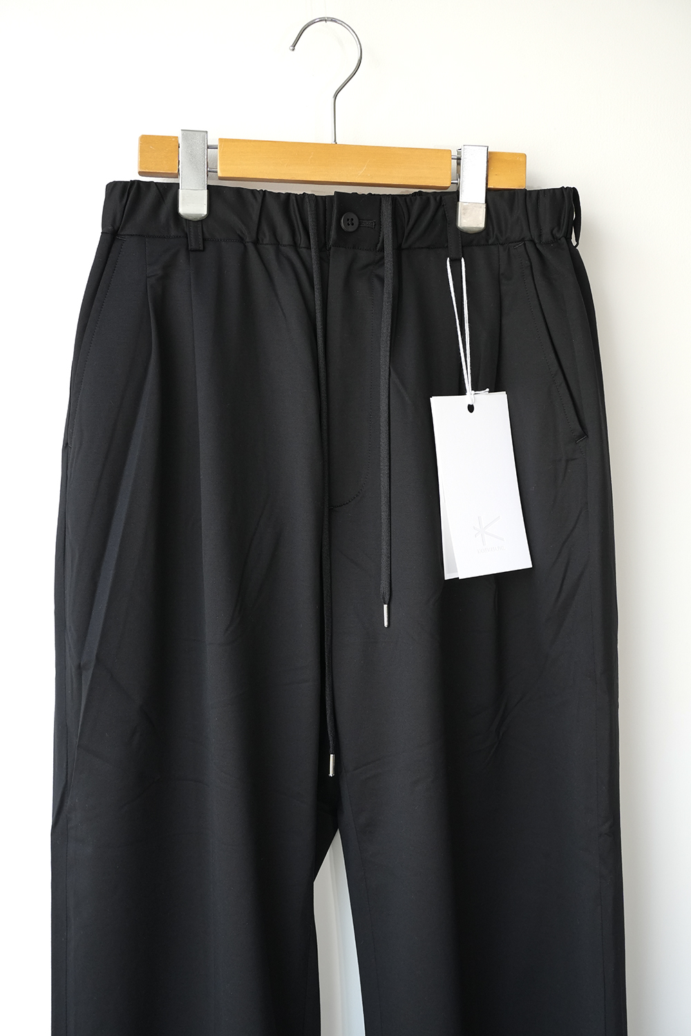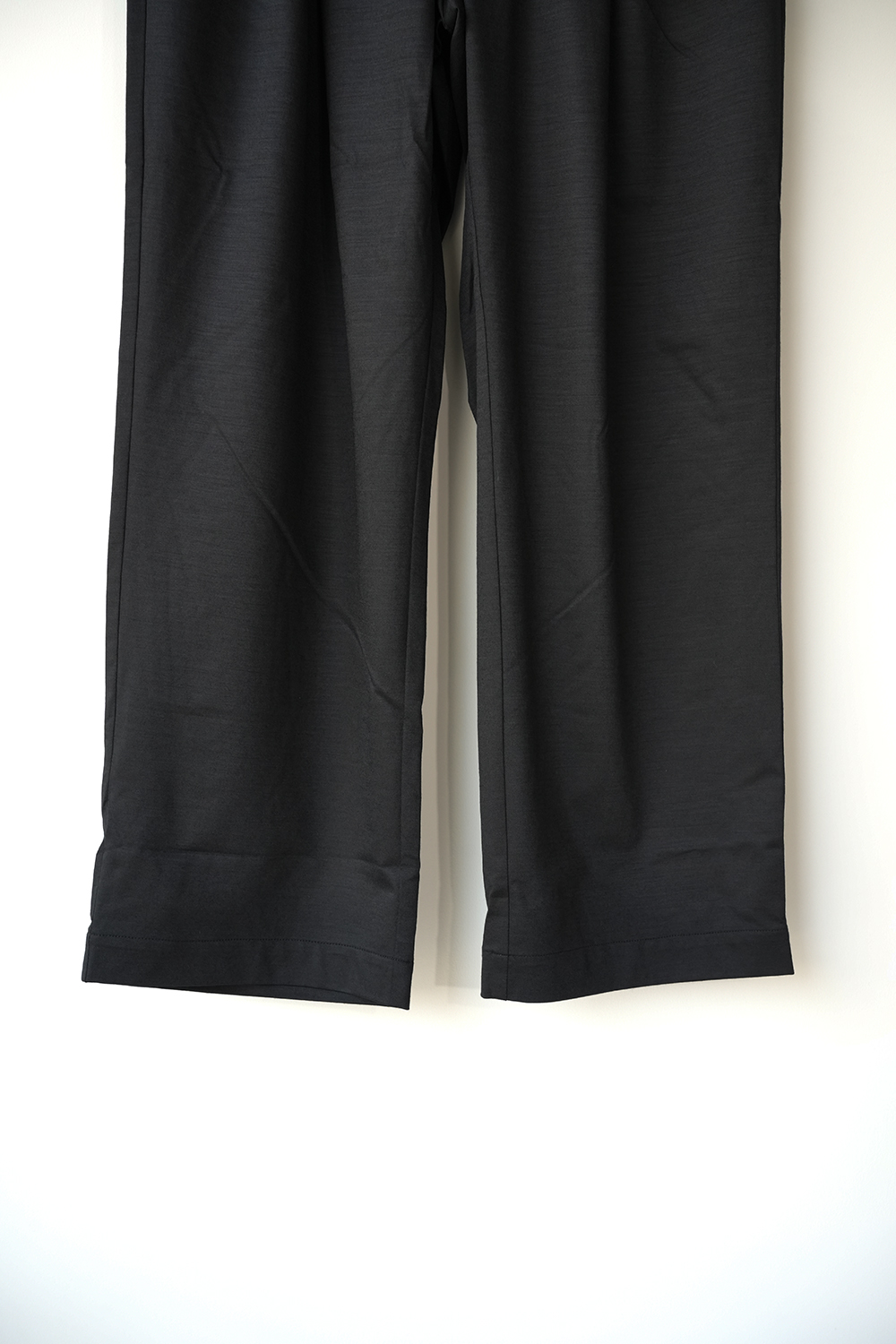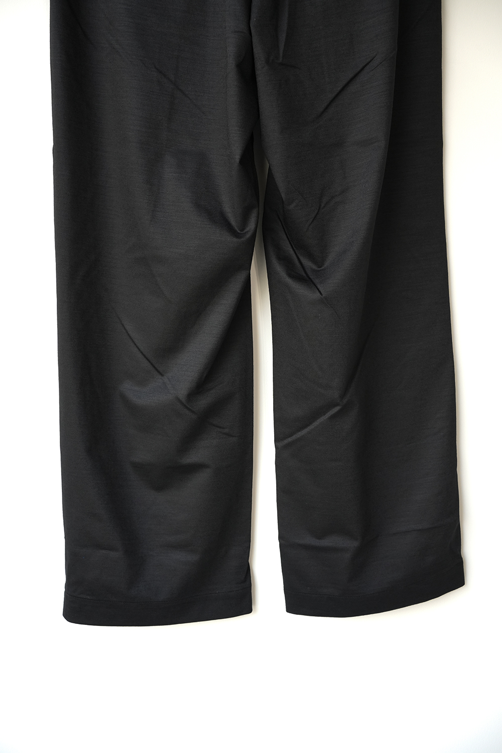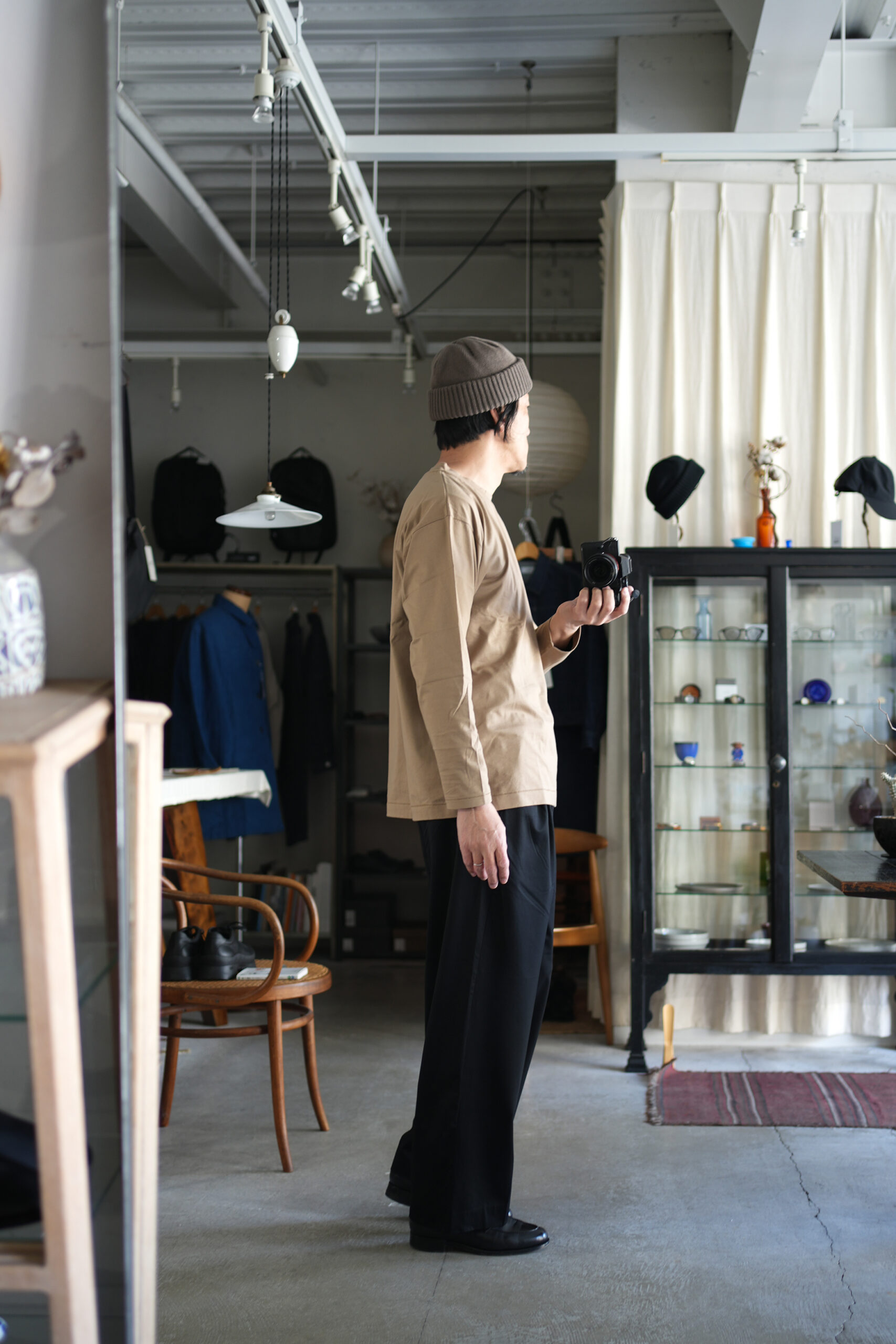 46Gという、スーパーハイゲージで、タイプライターという織物の高密度平織組織を実現。 ストレッチ性が高く一度着ると止められない着心地、そして、着用時のしわなどの形態変化も少なく、イージーケア性も高い。 ハリ感、光沢感、イージーケアを持ち併せた我々にしかできないニュースタンダードシャツ地。 ディティールは、ドレスシャツを採用し全て巻き伏せ本縫い仕様、貝蝶釦使いです。素材のハリ感、光沢感、そして塩梅の良いシルエット、生地が生み出すドレッシー感とパターンを融合させた、唯一無二のシャツ。綿糸の原料は、120/1 という細番手リサイクルスビンコットンを双糸使い。糸もガス焼きしたものを使うことで、より光沢感と洗濯後の毛羽を抑えております。50D高捲縮リサイクルナイロンを使用し、ストレッチ性を出しております。毎シーズン提案しているイージーパンツ。今シーズンは、ピンタック使用でより着用しやすい雰囲気がございます。ウエストは、ゴムで前開きと着脱しやすいディティールで、あえてタックも入れず、すっきりとした印象に仕上げております。程よりわたりから程よいテーパードのシルエットが特徴のパンツです。
