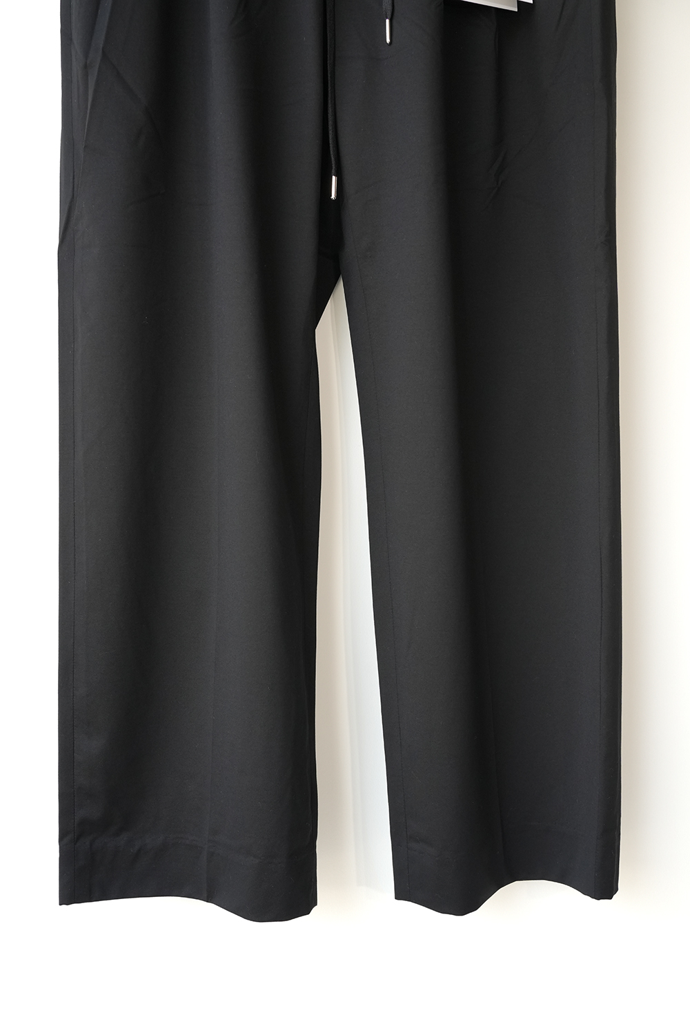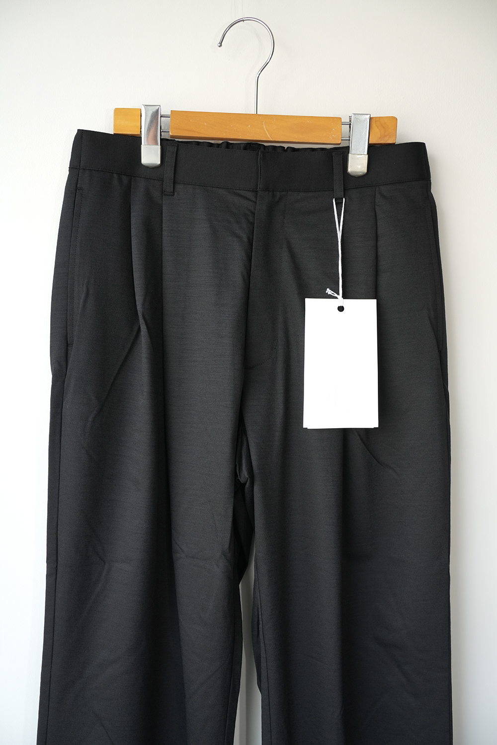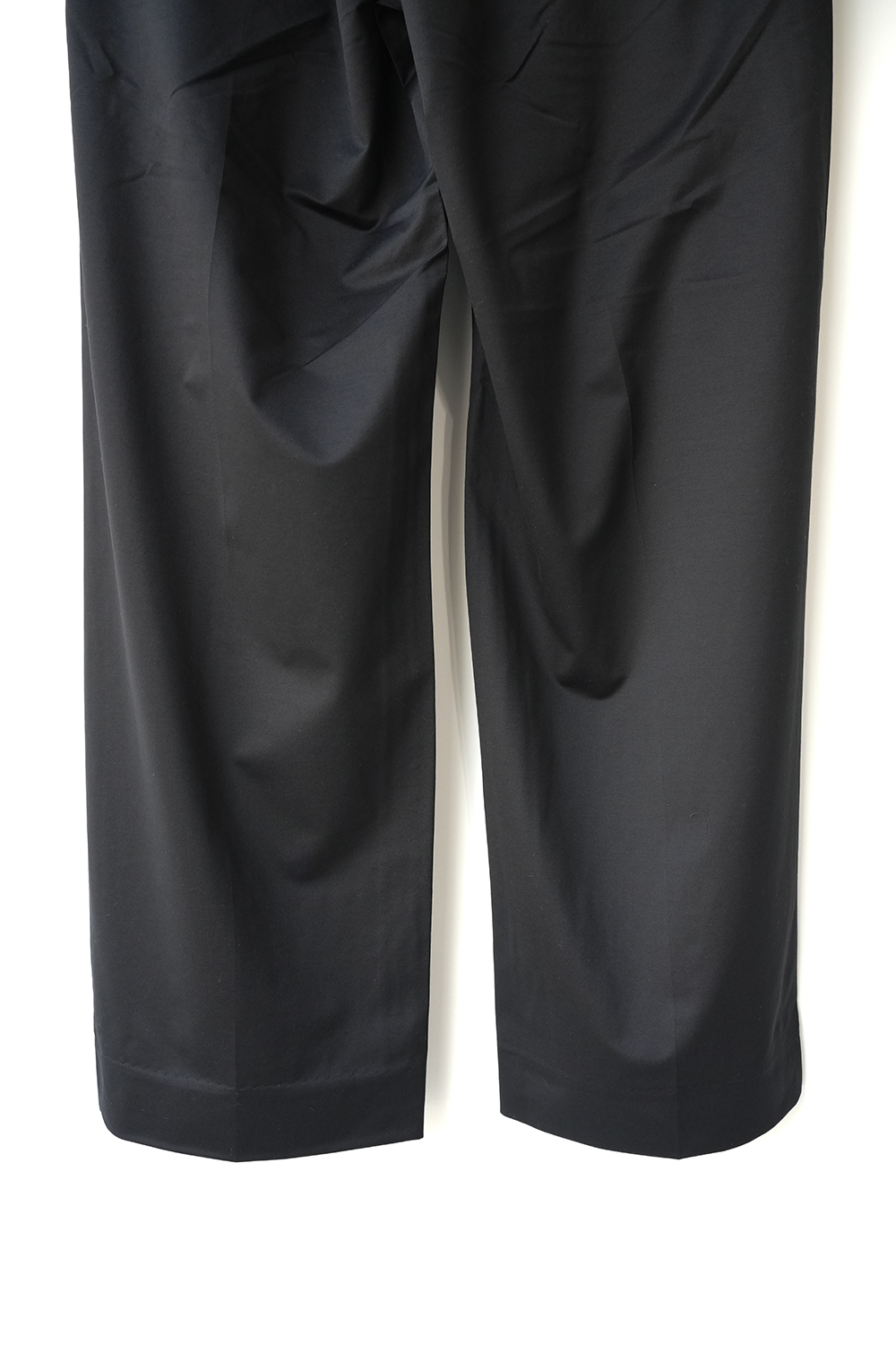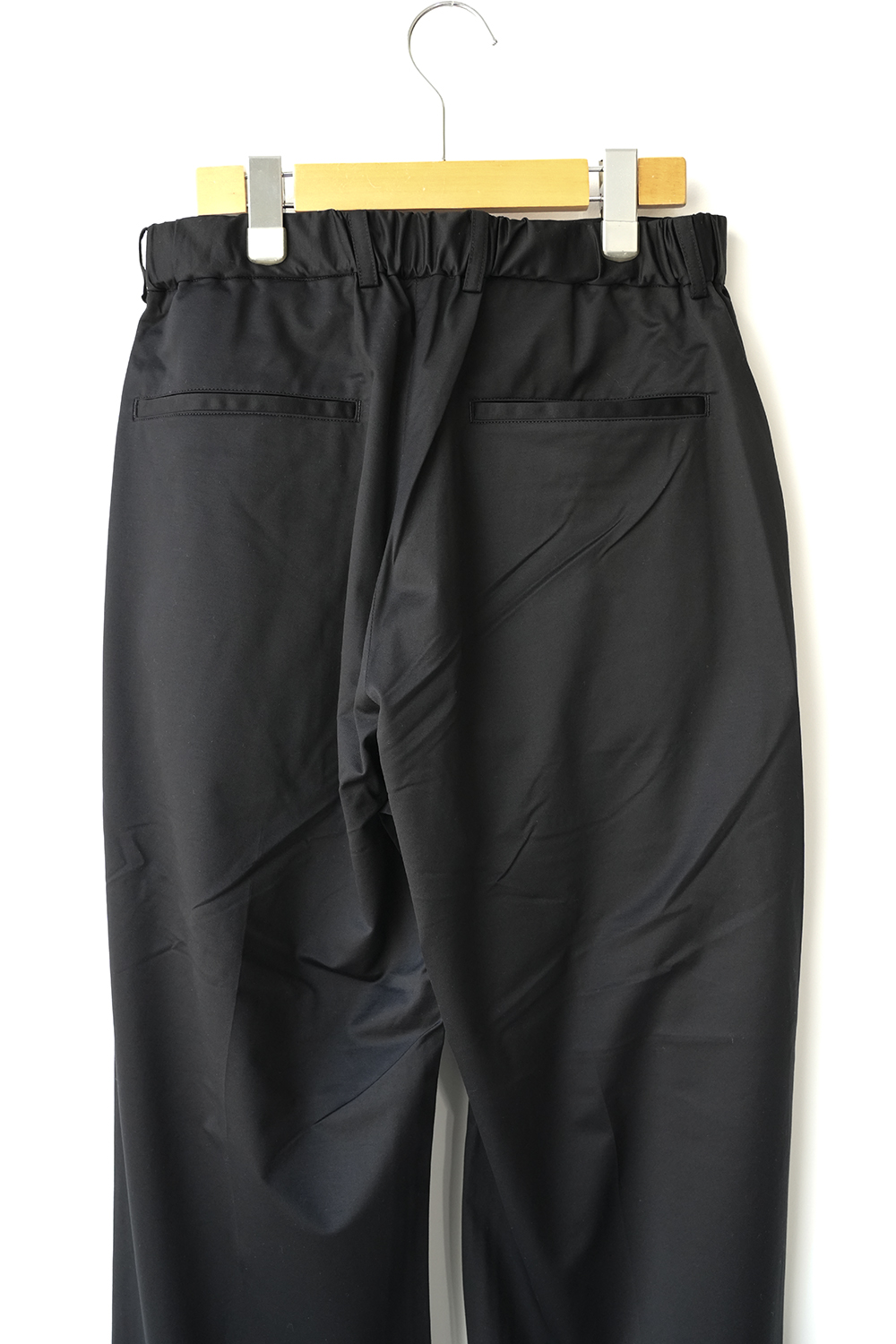 1年中着用できるウール素材。これぞカネマサなトラウザーを新素材で作成しました。36ゲージ特注丸編み機で高密度にタイプライター組織に編み立てました。この機械で編める最大限の細さの糸 1/60 super120ノンミュールジングウールと高い形態回復性・軽快なストレッチ性、圧倒的な軽さを持ち合わせるSolotex糸を交編させました。ウールの機能性(保温性、抗菌性)は維持されたまま、さらりとした肌さわりとニットのストレッチ性がある今までにないウール素材。もちろん家庭洗濯可能です。洗濯機でガシガシ洗ってください。洗いを繰り返すことでよる風合いが増していき、育てていくことができる素材。タックが深く入ったスラックス。わたりを程よくとり、軽くテーパードをかけたストレートシルエットが特徴です。フロントは、天狗仕様にて、ドレスな雰囲気にも仕上げております。どのようなシーンでも着用頂けるパンツです。※ノンミュールジングウール、ウールを生み出す羊への蛆虫の寄生を防ぐため、子羊のうちに臀部の皮膚や肉体の一部を切り落として育成する方法がミュールジングといいます。これに対してノンミュールジングは羊に痛みが伴うミュールジングを行わず、羊本来の自然のままのやさしい飼育方法で得られるウール。