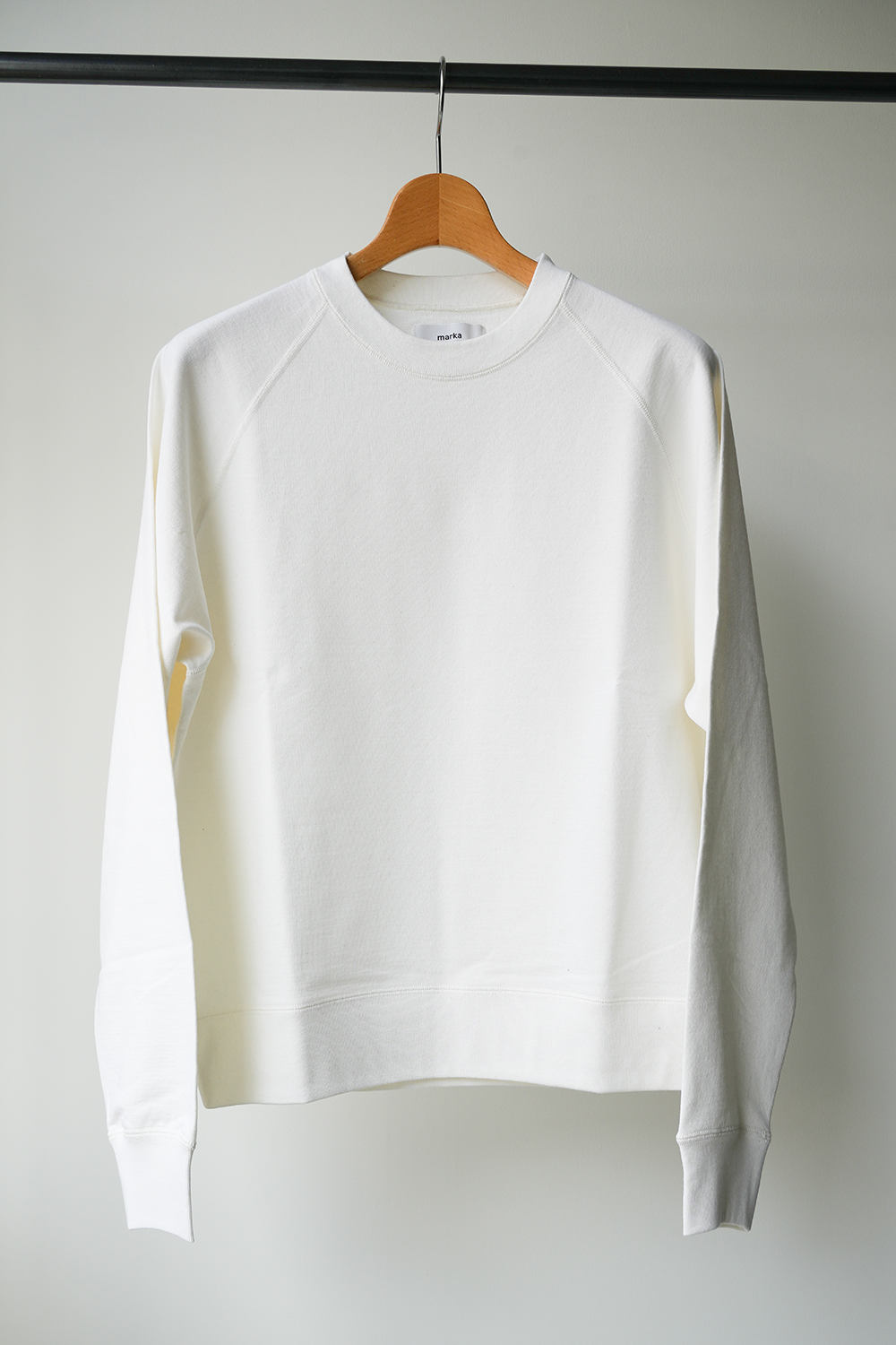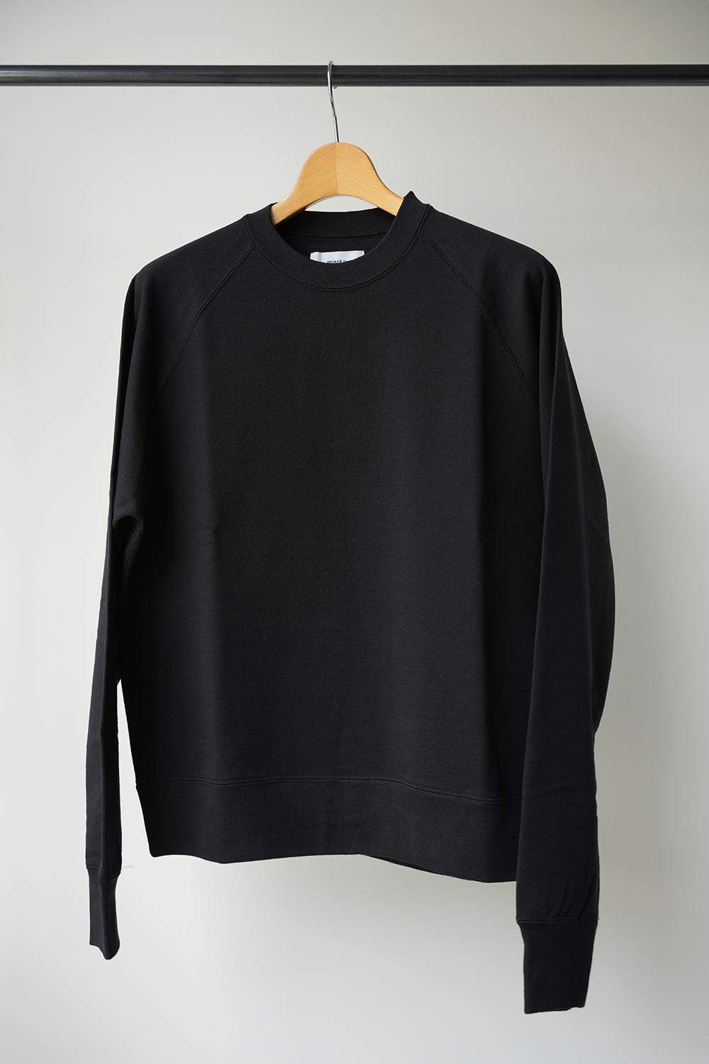 天竺などのベースとなる編み地の裏面に別の太い糸(挿入糸)をはわせたニット生地。裏毛(スウェット)に似ていますが接結糸がないため厚みが抑えられしっかりとしたハリ・コシと、型崩れしにくく伸びにくい特徴を持つインレイ生地のラグランスリーブロンT。ニットの柔らかさと織物の品良さを併せ持った上品な生地のロンTです。