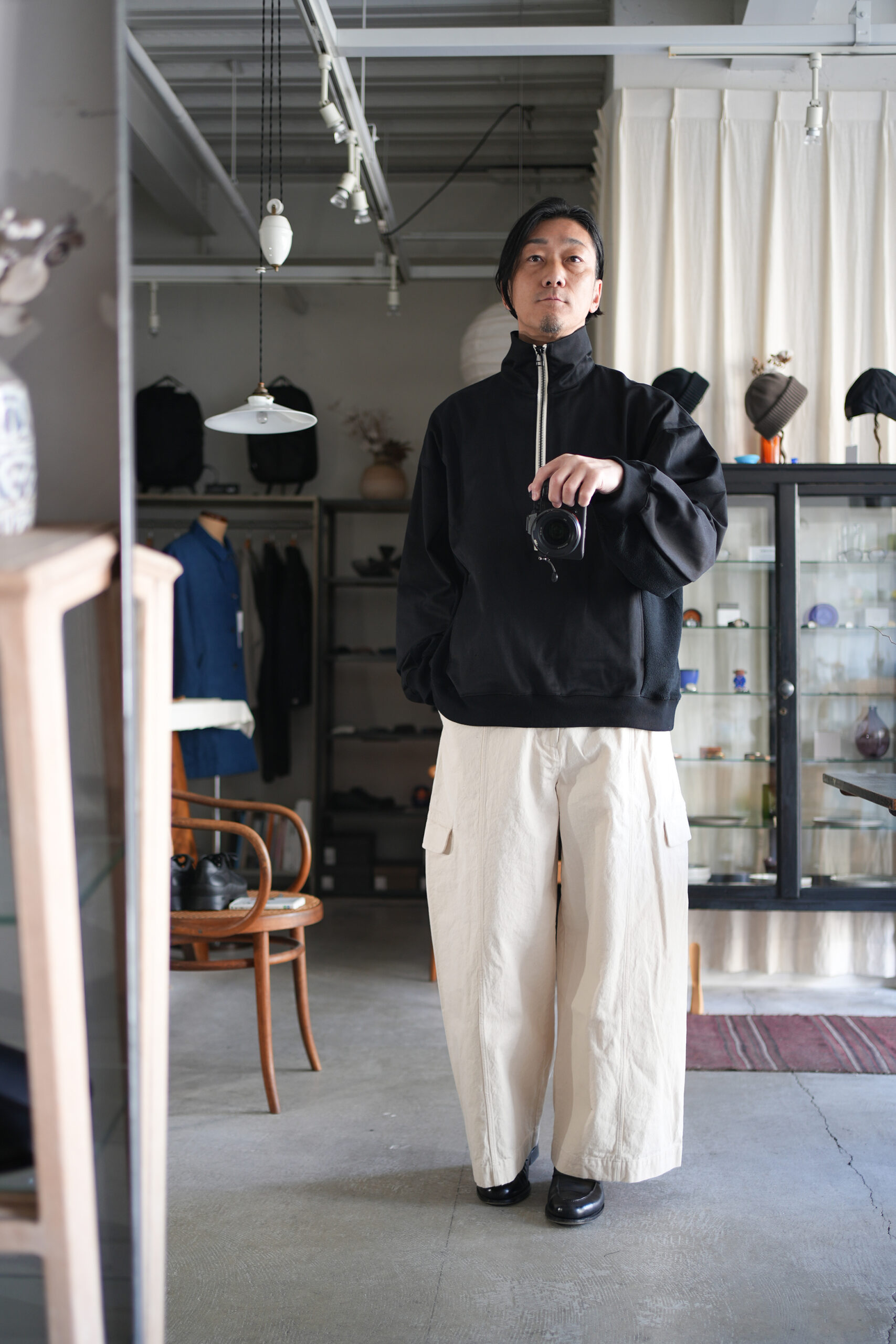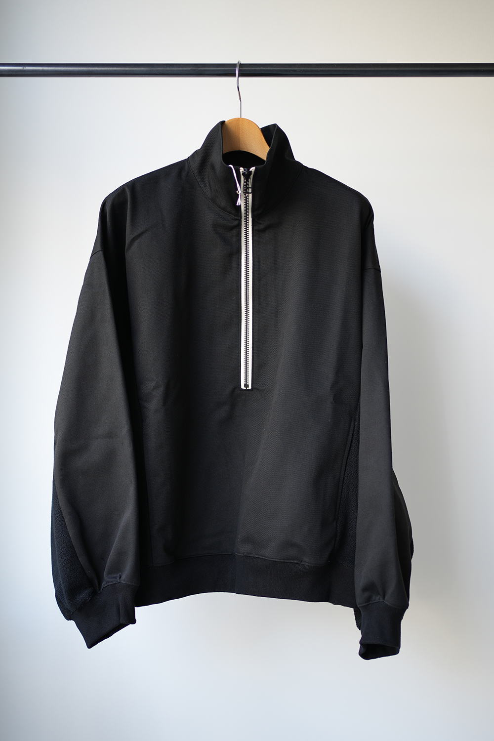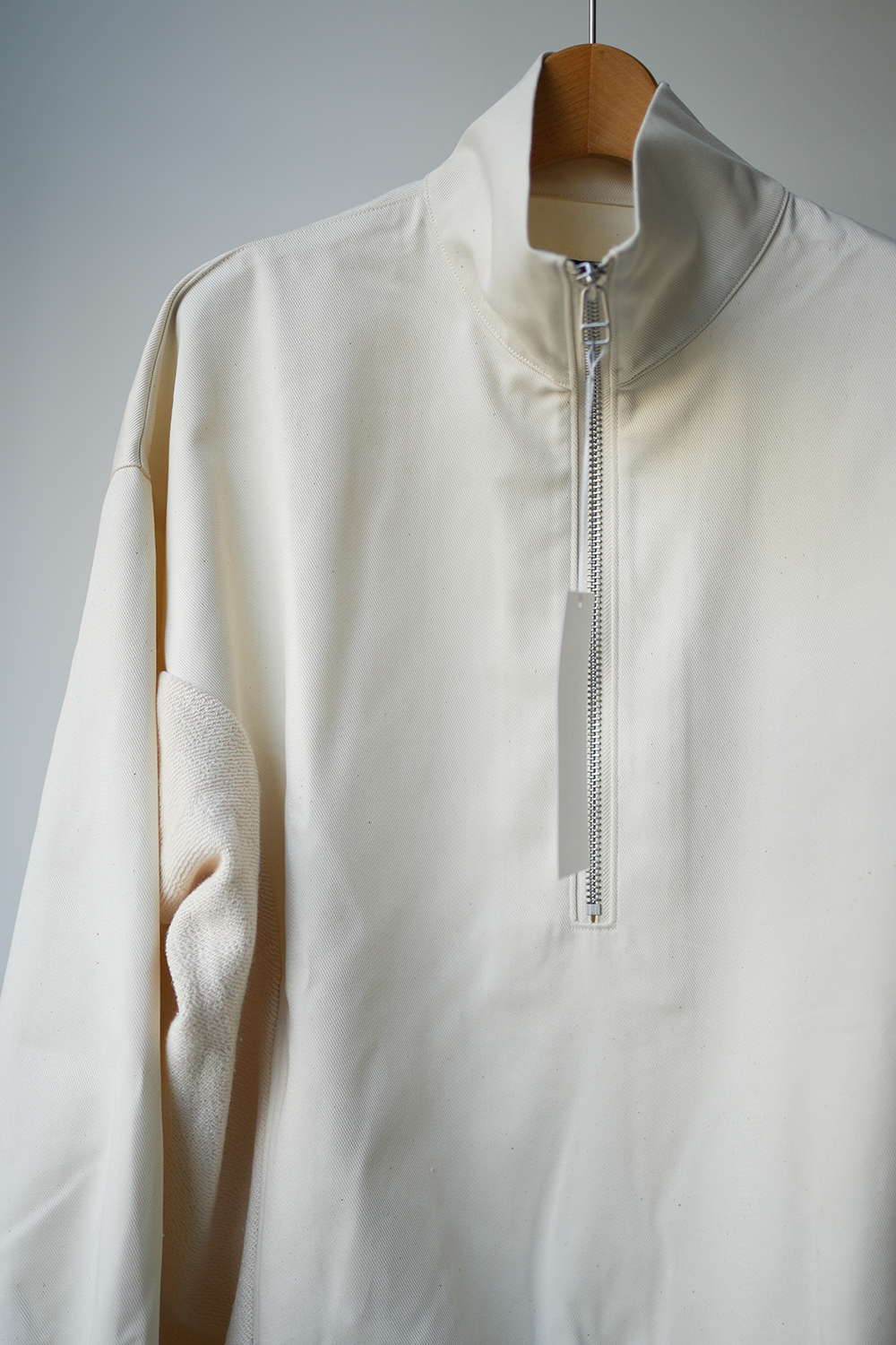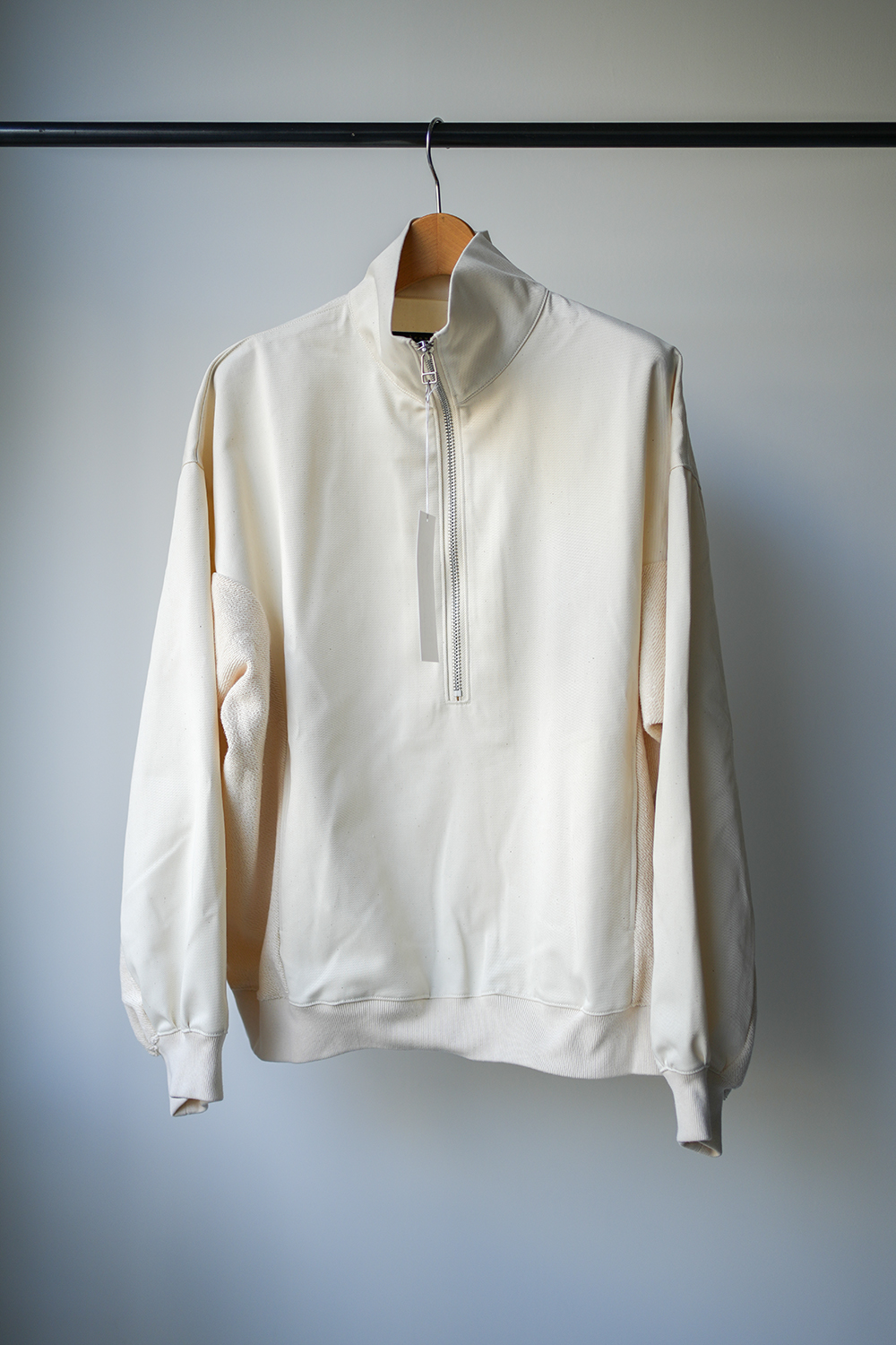 オーガニックコットンとリサイクルナイロンの混紡糸で仕立て、スウェット生地で切り替えたハーフジッププルオーバー。コットンポリエステル素材の為肉厚生地ながら柔らかな着心地。