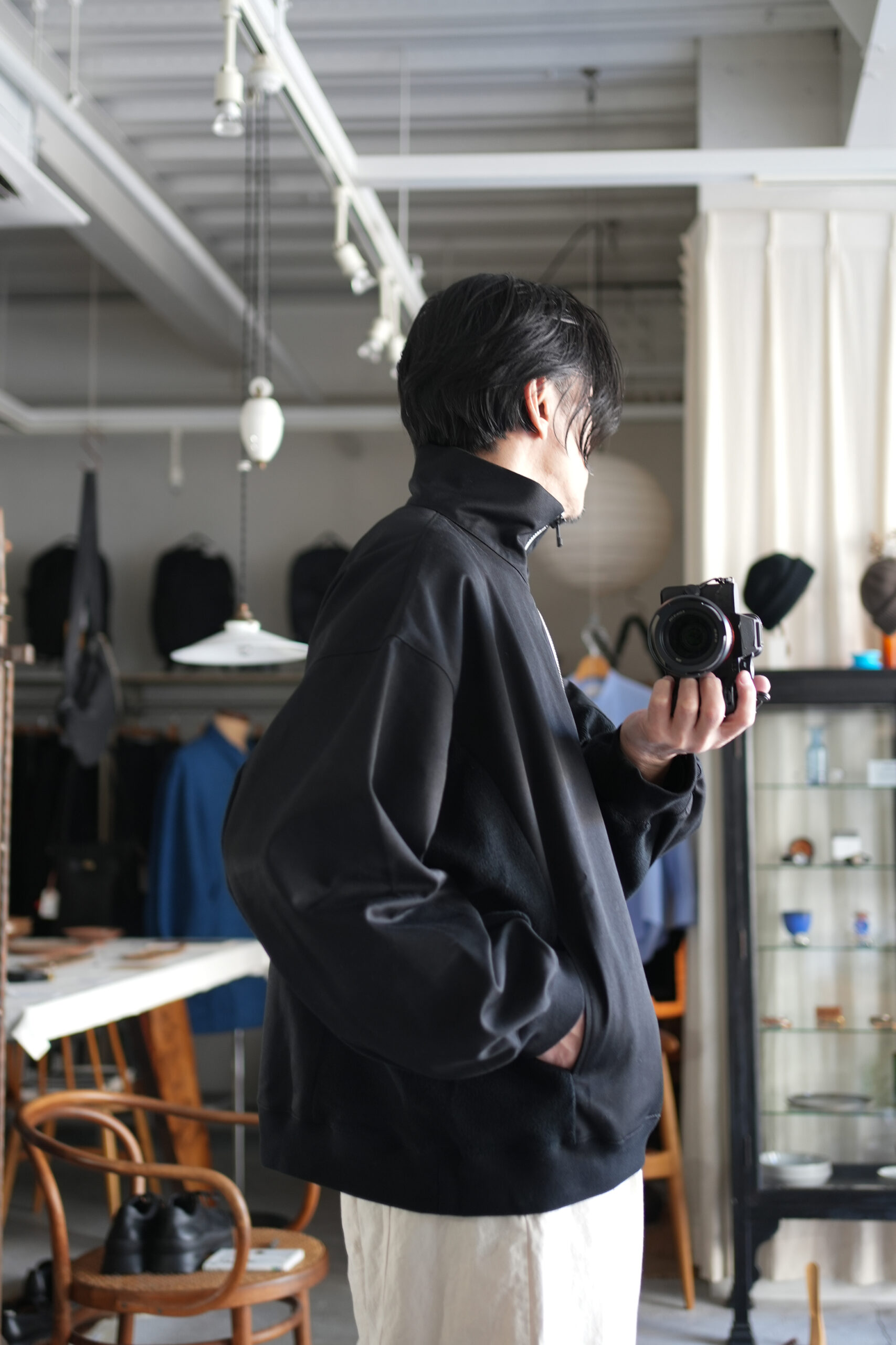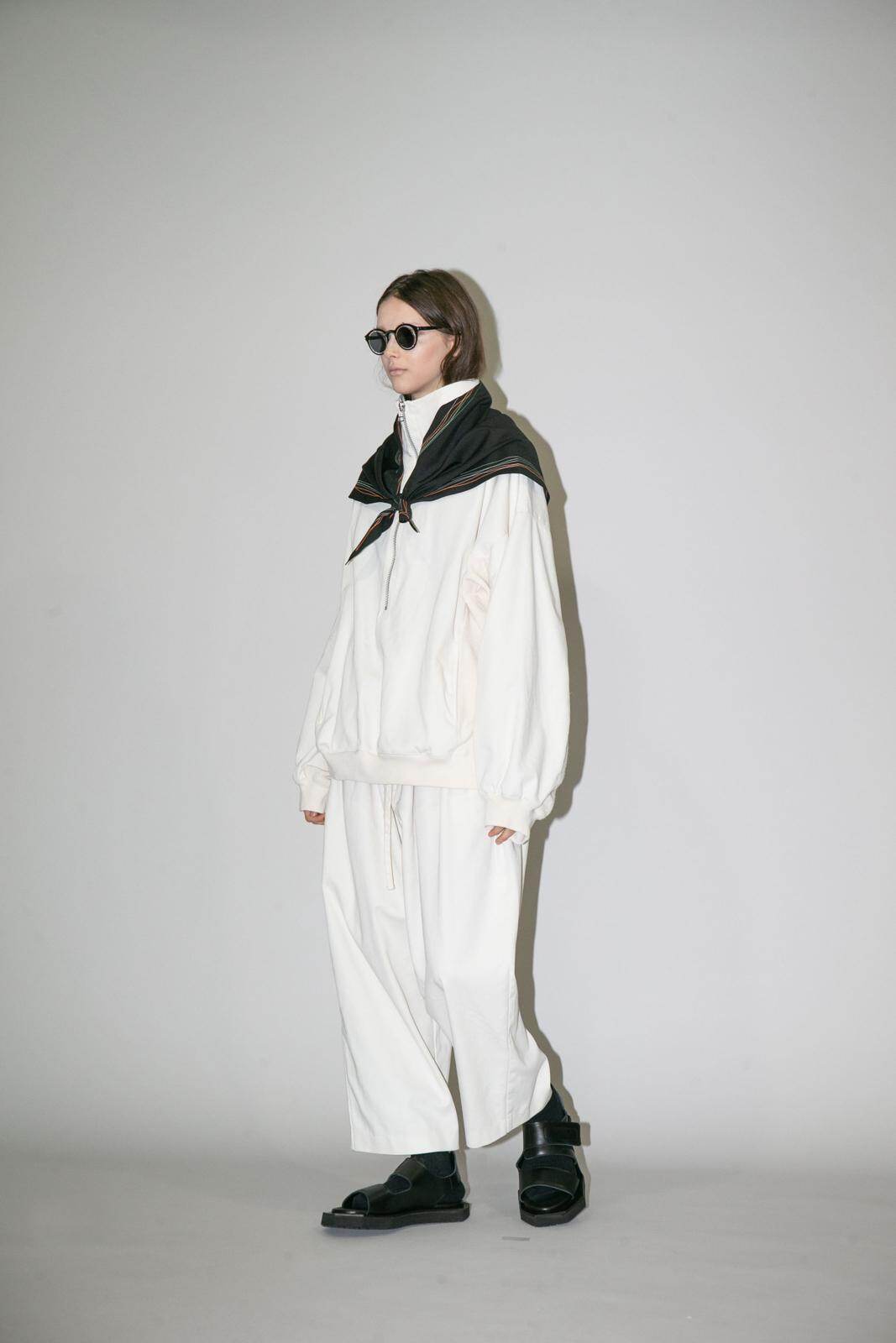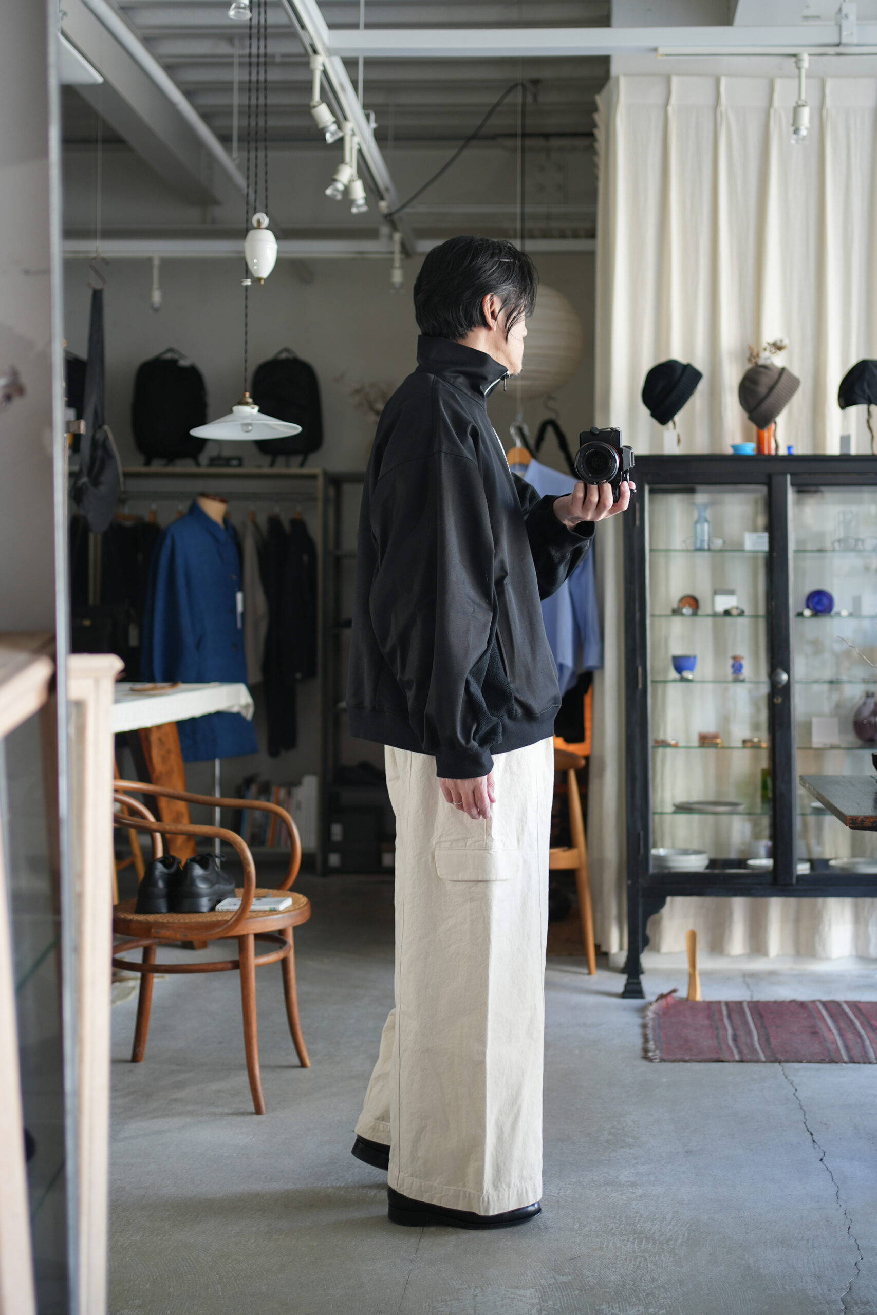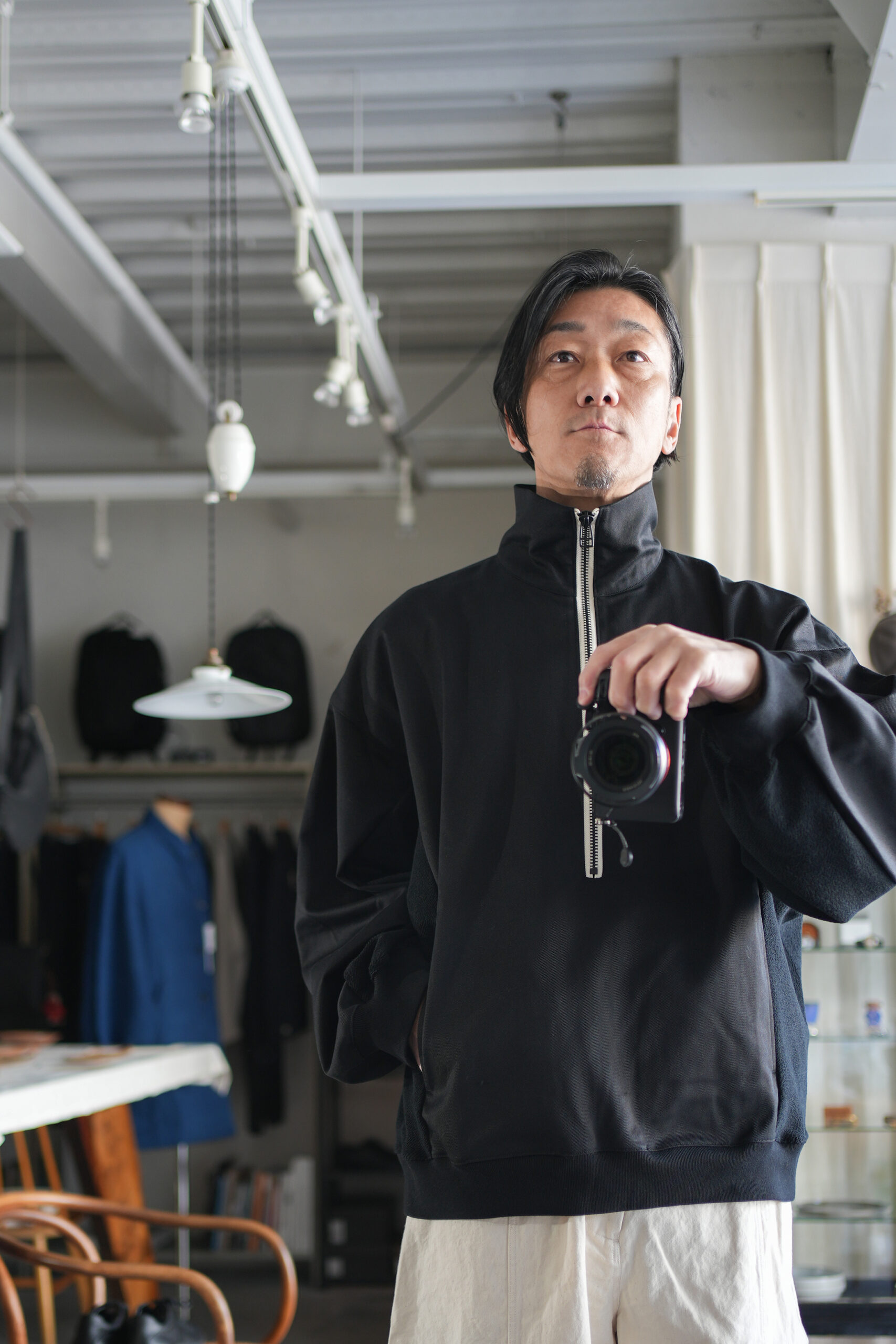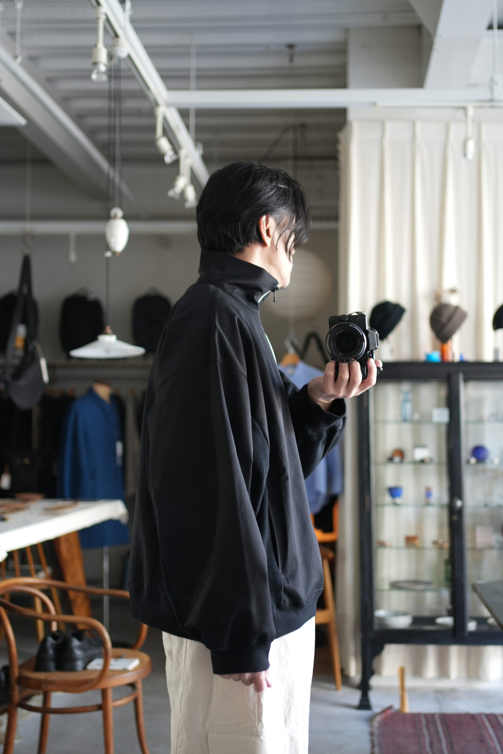 オーガニックコットンとリサイクルナイロンの混紡糸で仕立て、スウェット生地で切り替えたハーフジッププルオーバー。コットンポリエステル素材の為肉厚生地ながら柔らかな着心地。