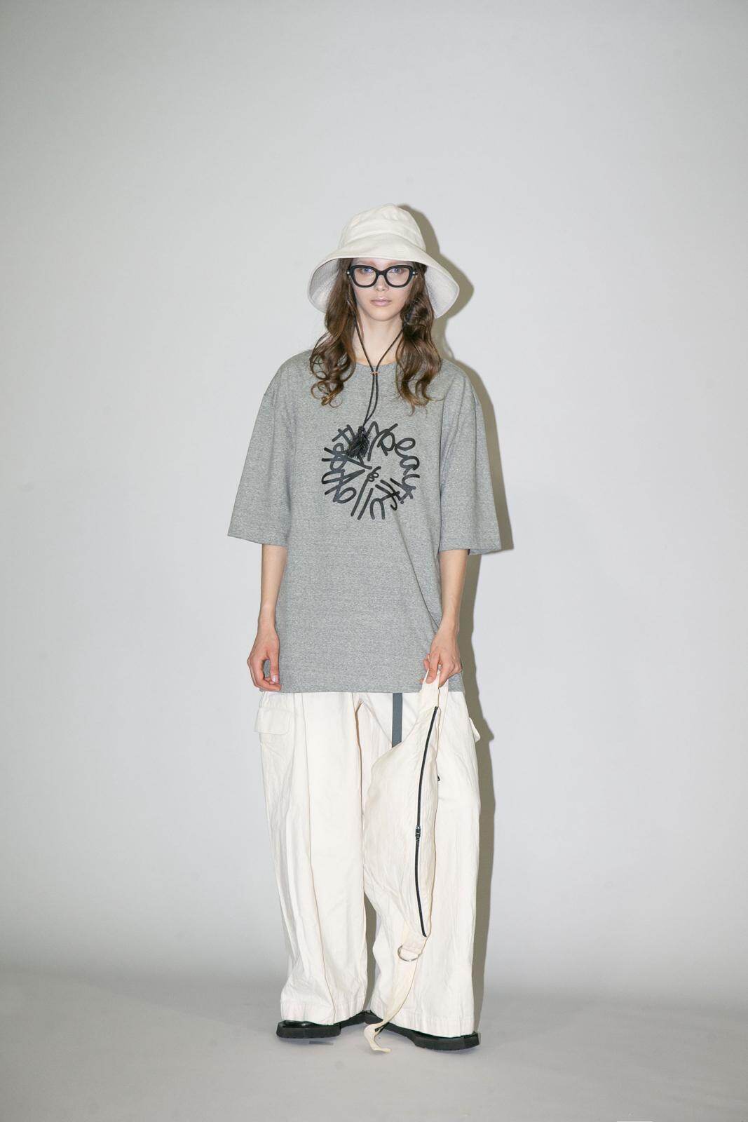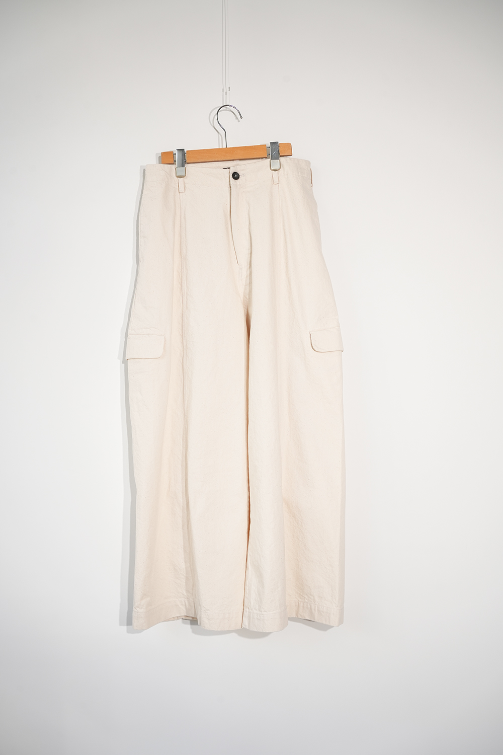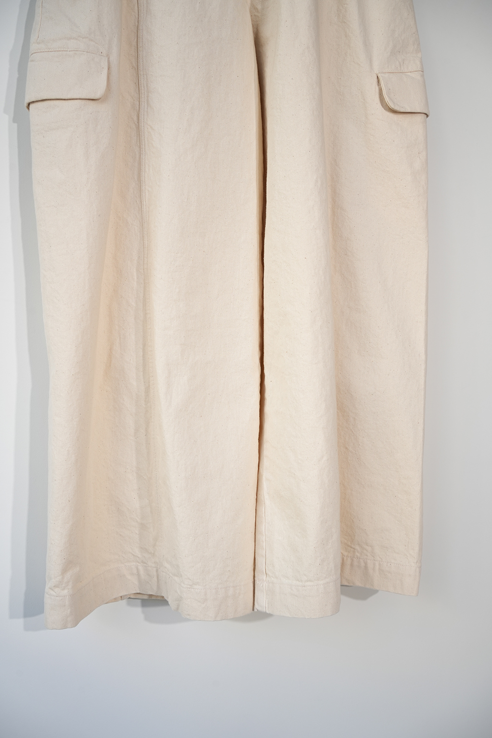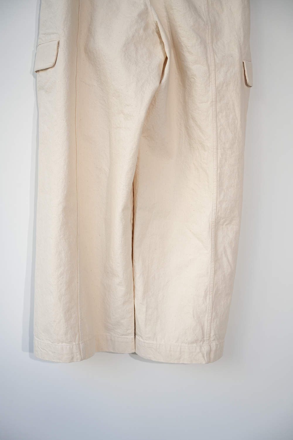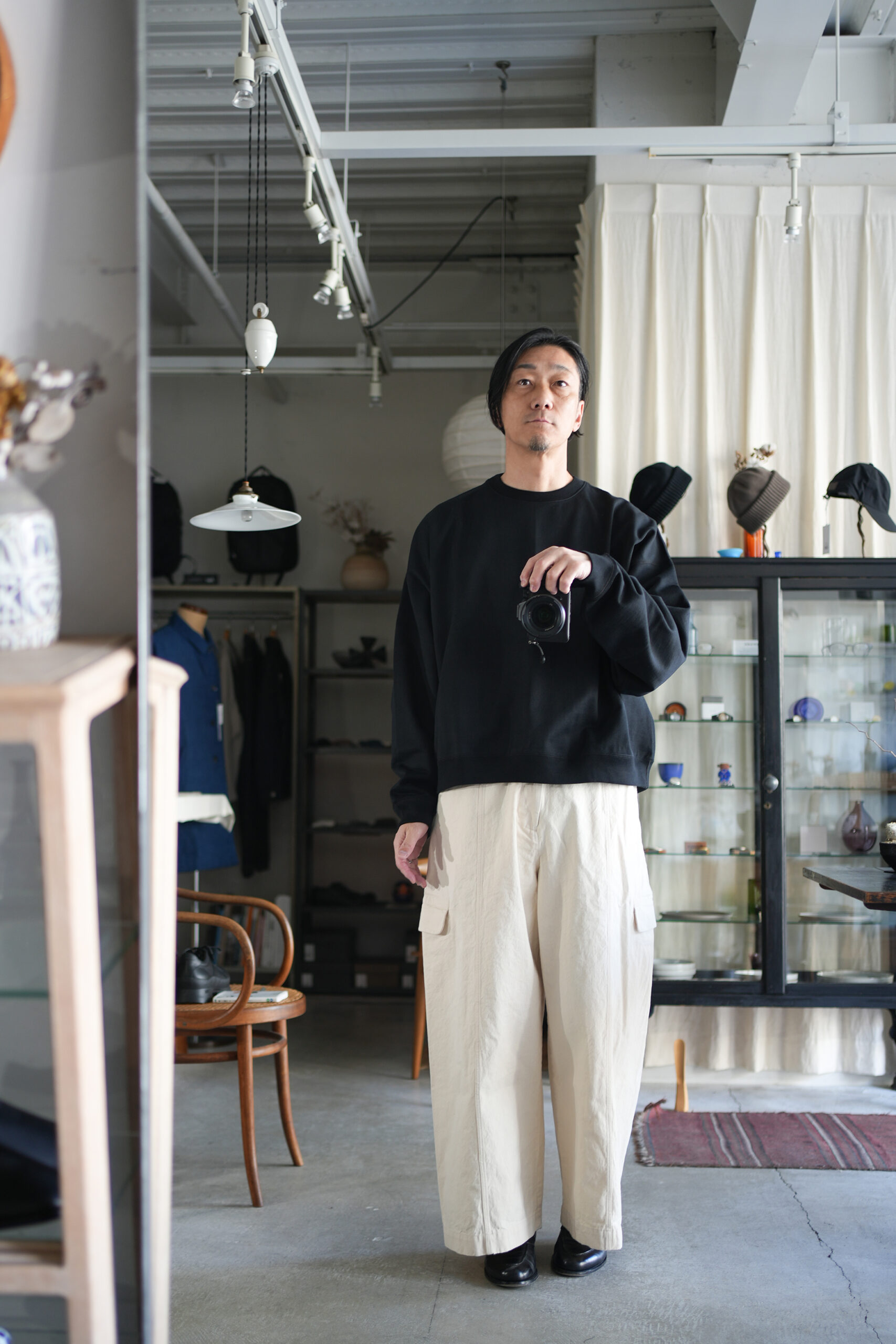 10ozのデ二ム生地を使用したジャケット感覚のシャツとカーゴワイドデニムパンツ。顔料プリントを施し縫製後に洗いをかけることによる独特の風合い。