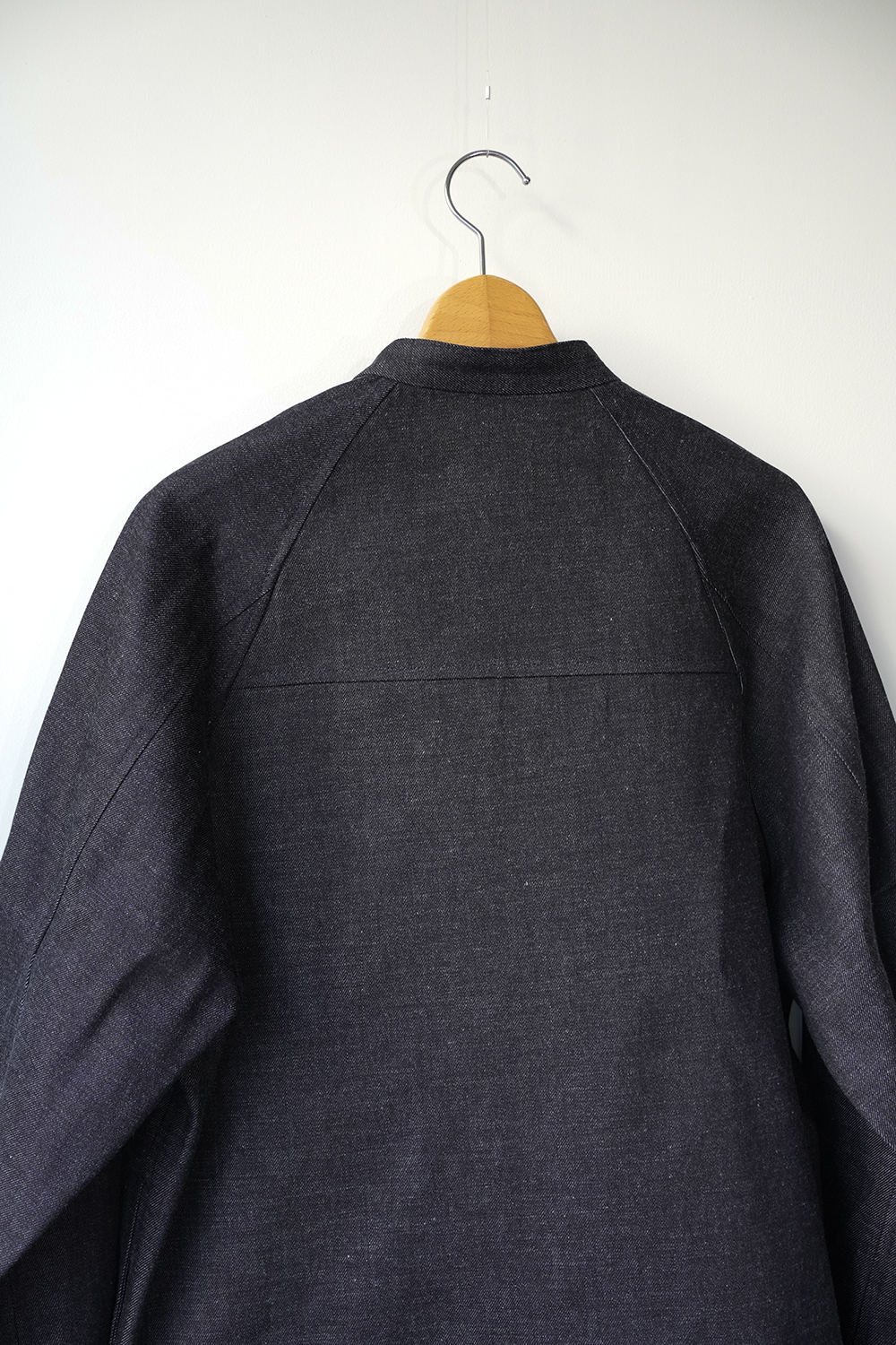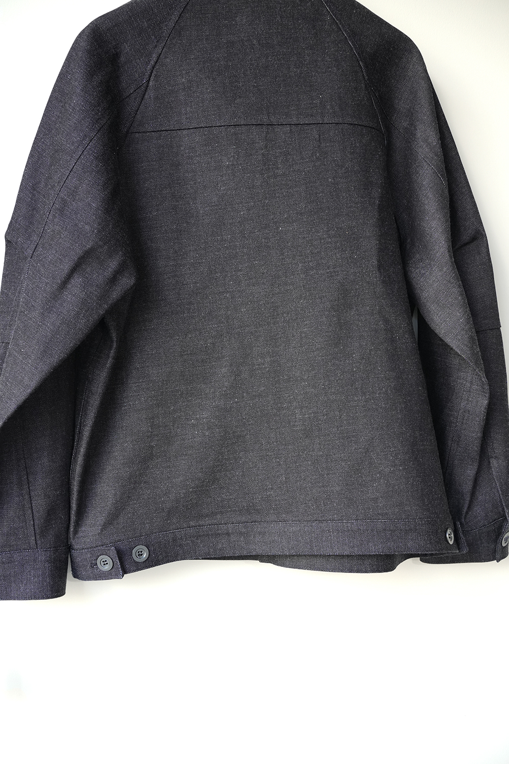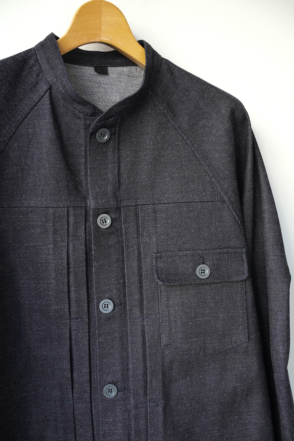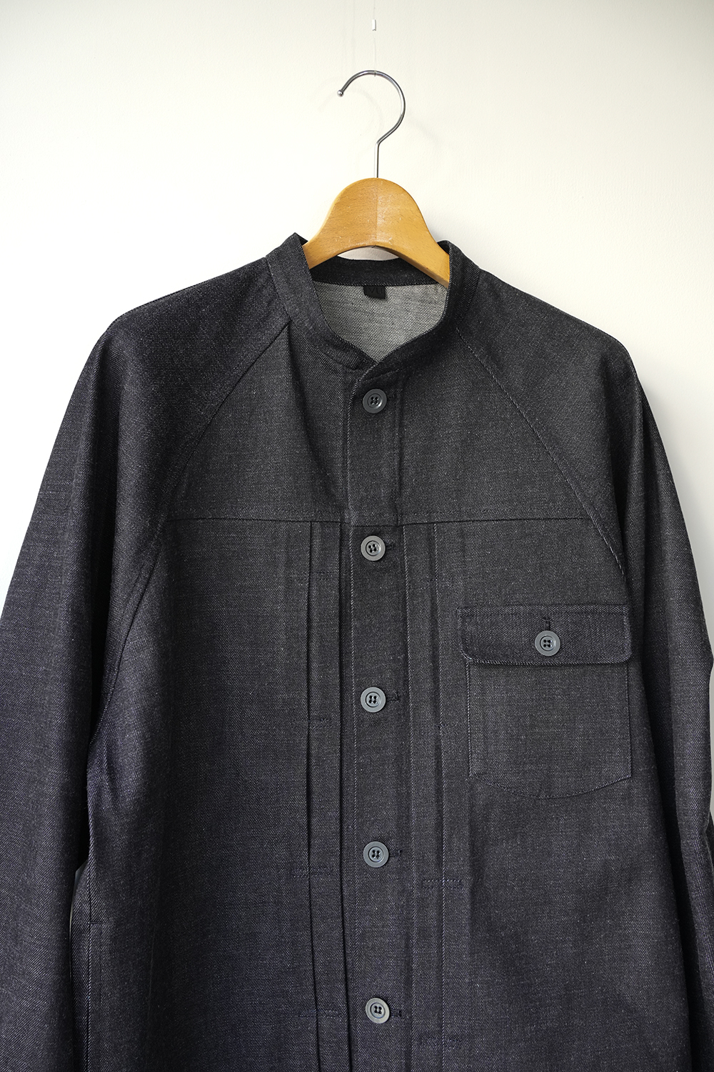 細めのスタンドカラーと前身頃プリーツ、広めの袖で快適に着られるデニムワークジャケット。旧式シャトル織機によるゆっくりとした織られた岡山の老舗メーカーセルビッチデニムを使用したワークジャケット。ゆったりとしたシルエットと実用的なディテールを備え、着用を重ねることで表情の変化も楽しめるジャケットです。