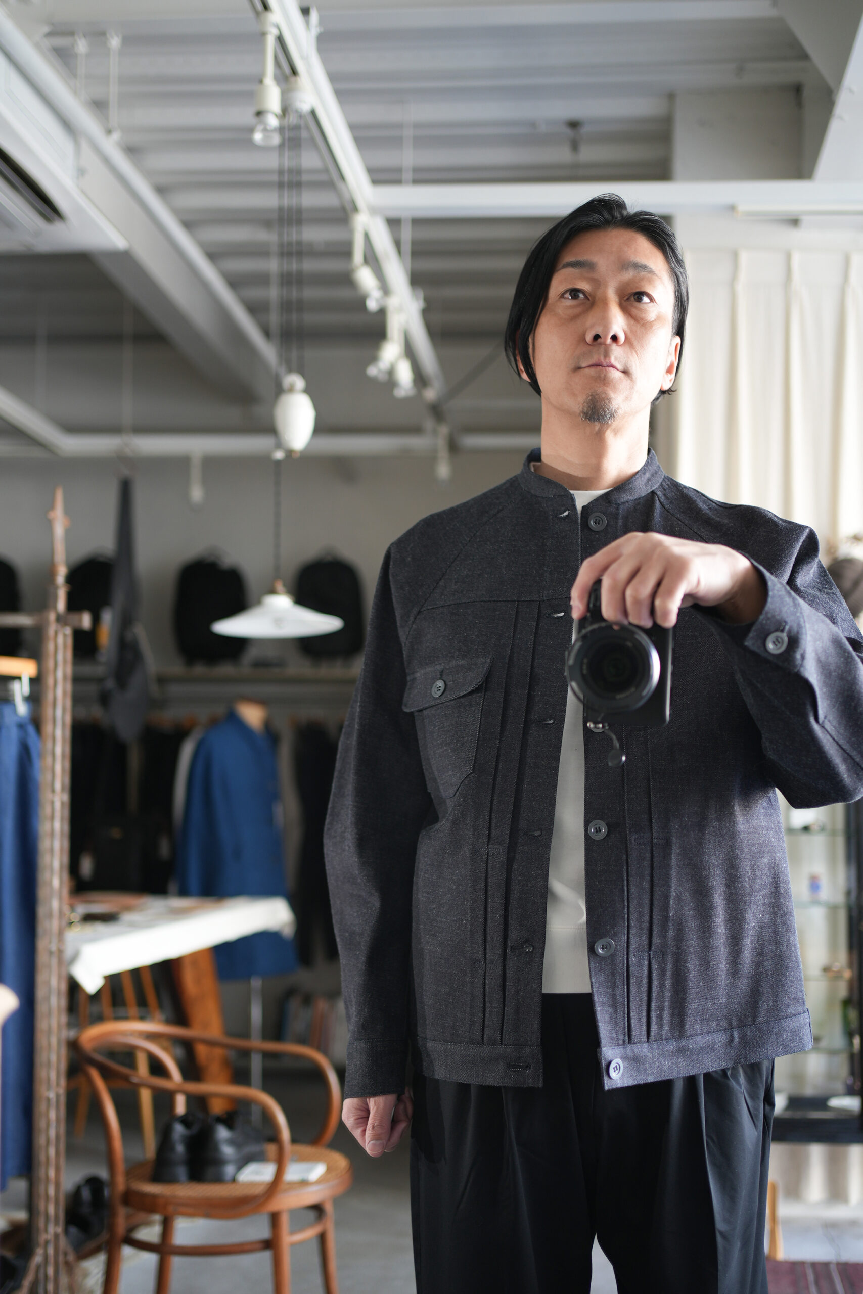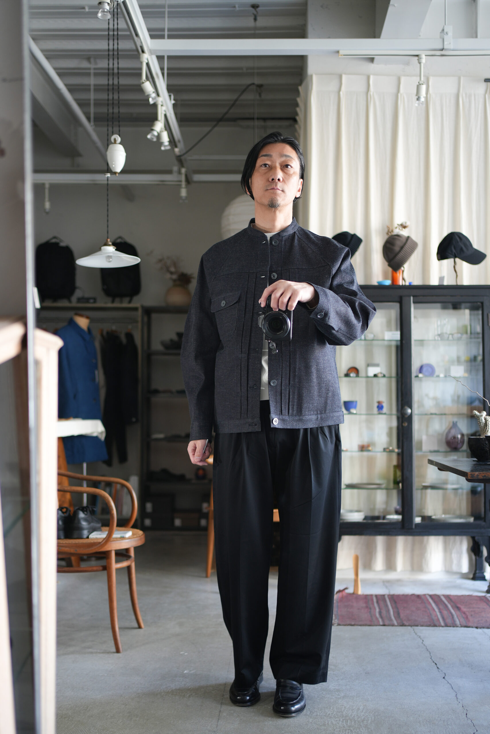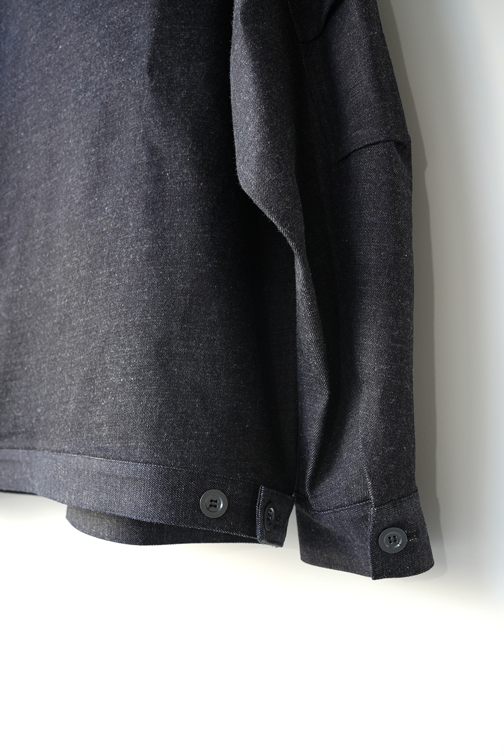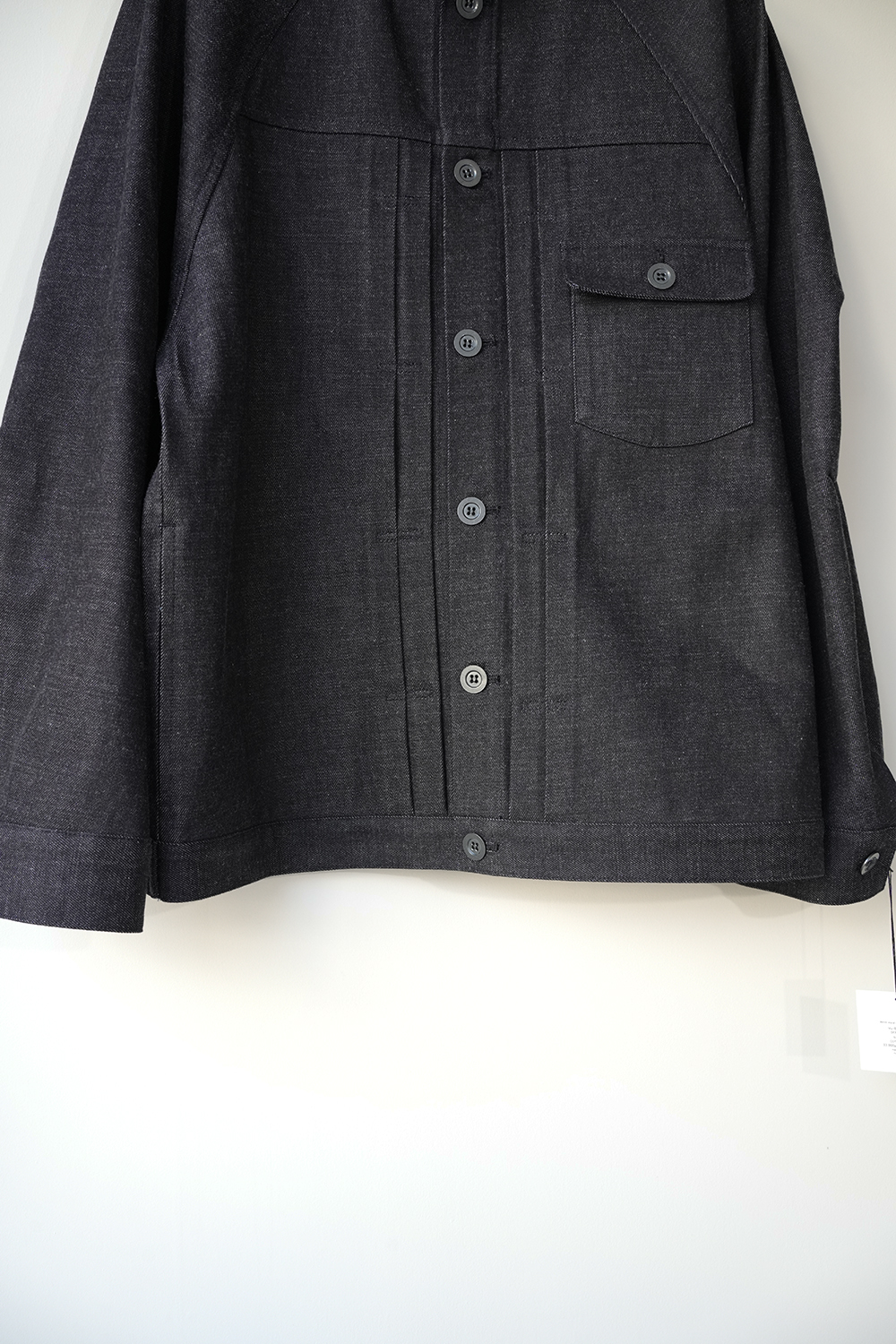 細めのスタンドカラーと前身頃プリーツ、広めの袖で快適に着られるデニムワークジャケット。旧式シャトル織機によるゆっくりとした織られた岡山の老舗メーカーセルビッチデニムを使用したワークジャケット。ゆったりとしたシルエットと実用的なディテールを備え、着用を重ねることで表情の変化も楽しめるジャケットです。