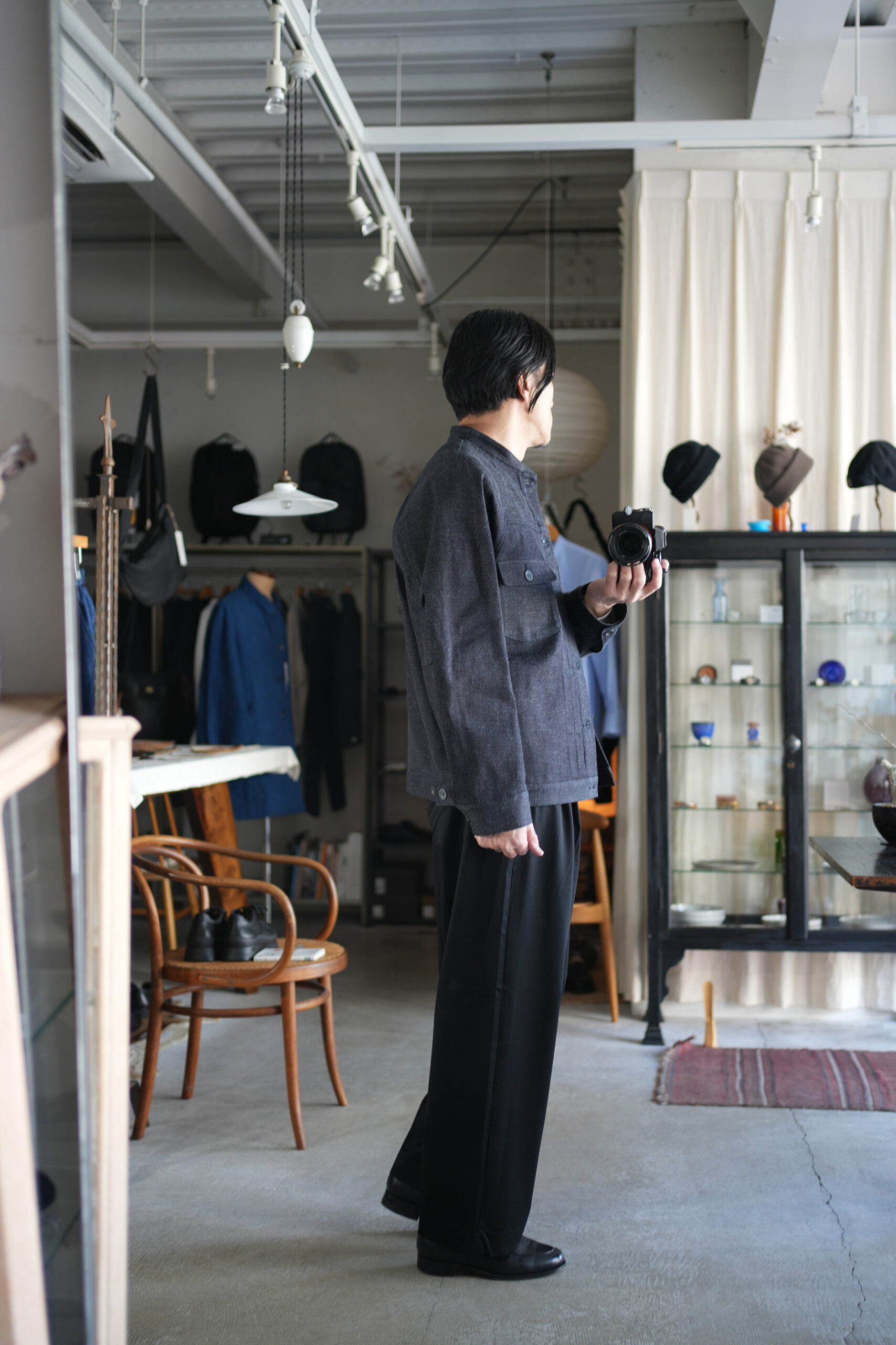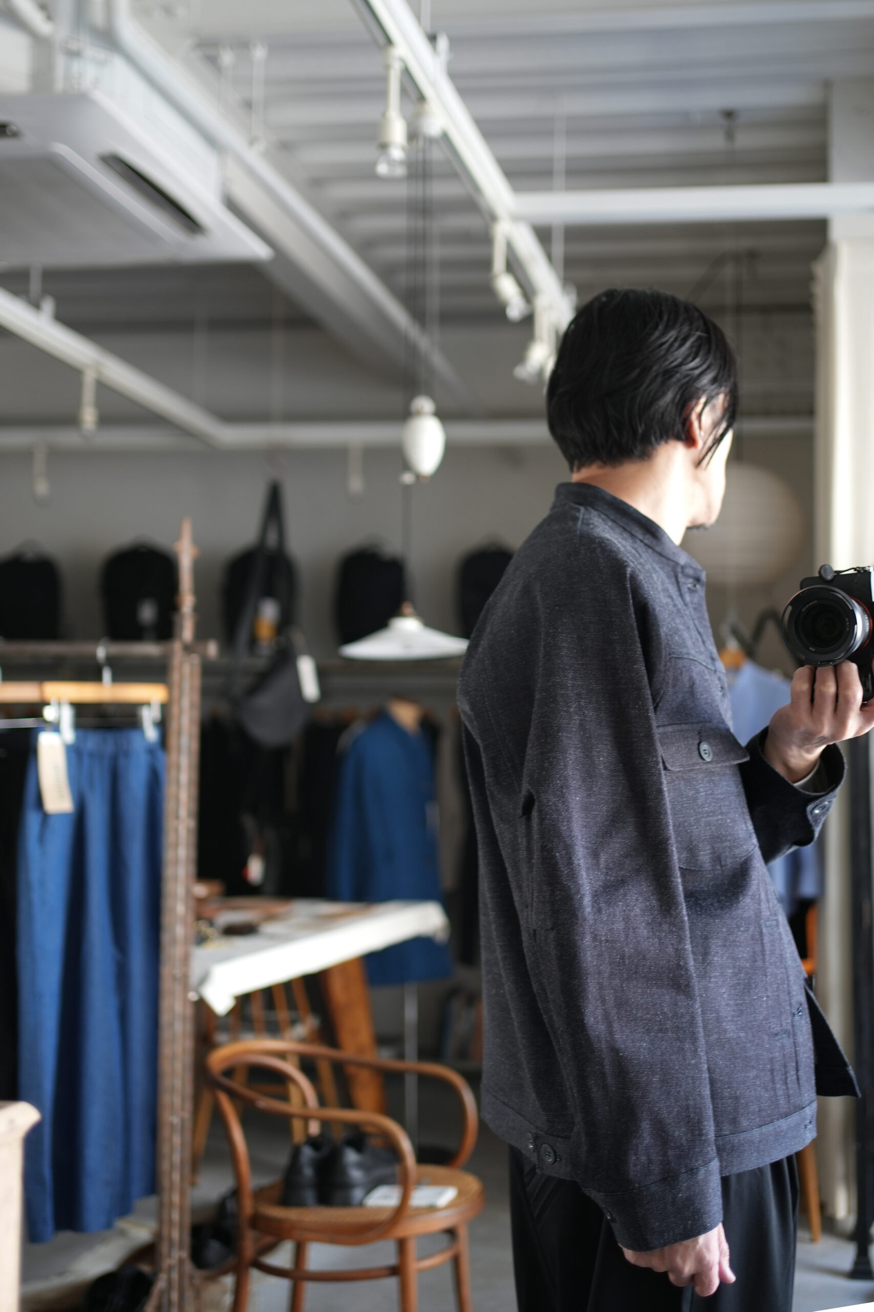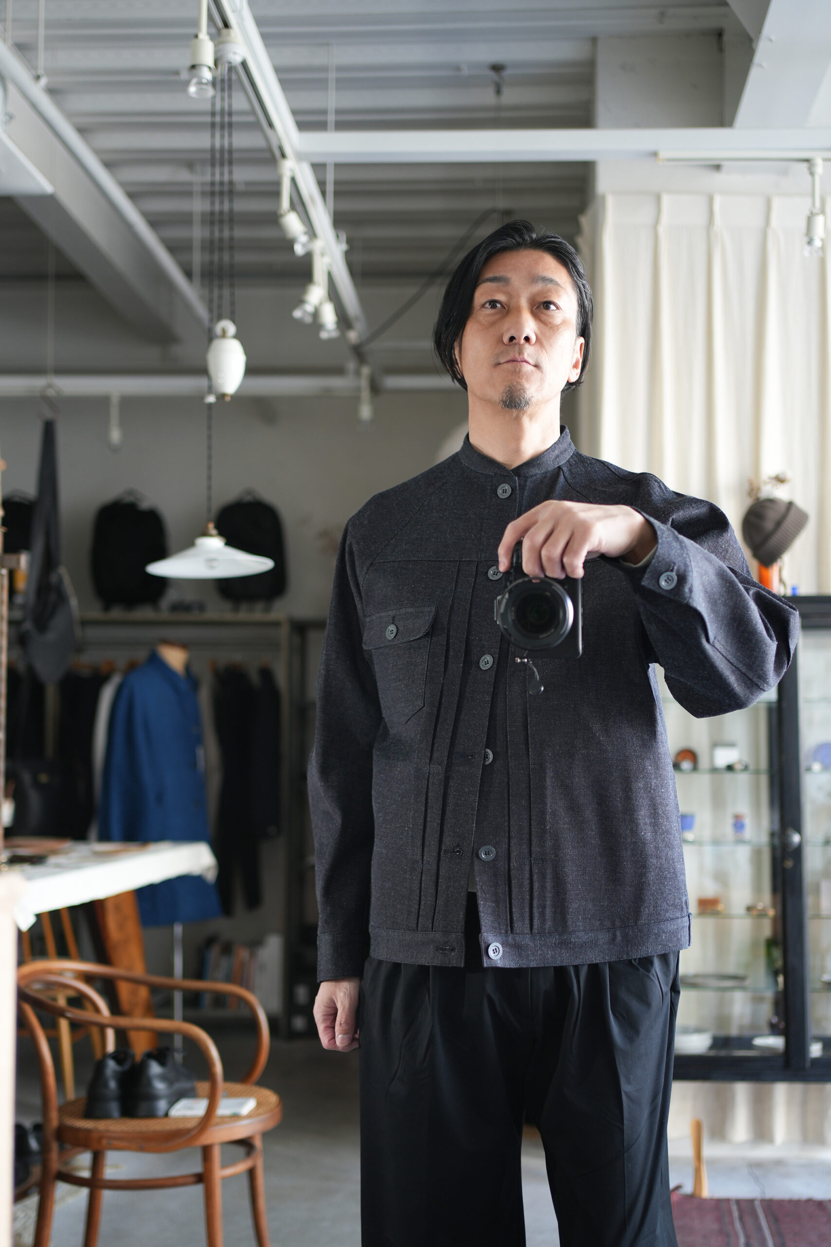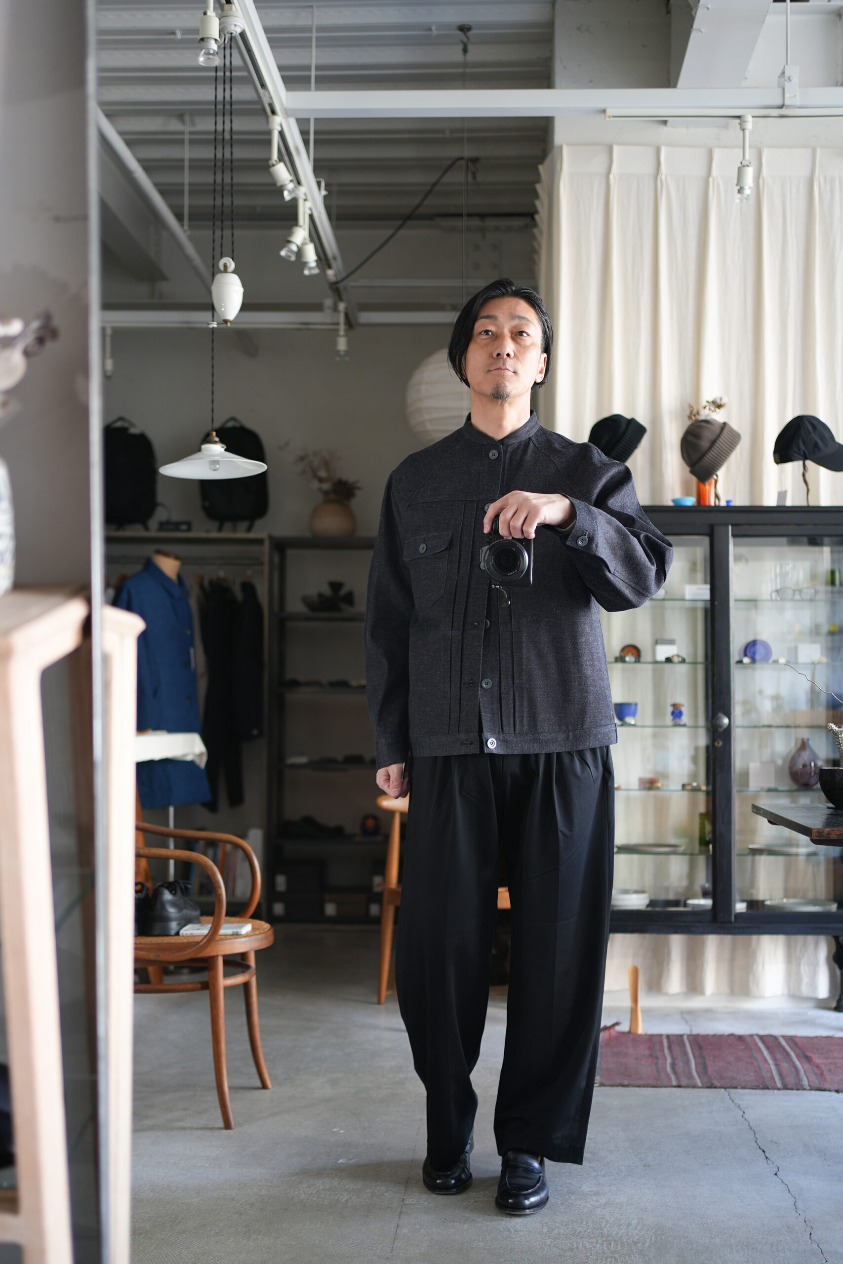 細めのスタンドカラーと前身頃プリーツ、広めの袖で快適に着られるデニムワークジャケット。旧式シャトル織機によるゆっくりとした織られた岡山の老舗メーカーセルビッチデニムを使用したワークジャケット。ゆったりとしたシルエットと実用的なディテールを備え、着用を重ねることで表情の変化も楽しめるジャケットです。