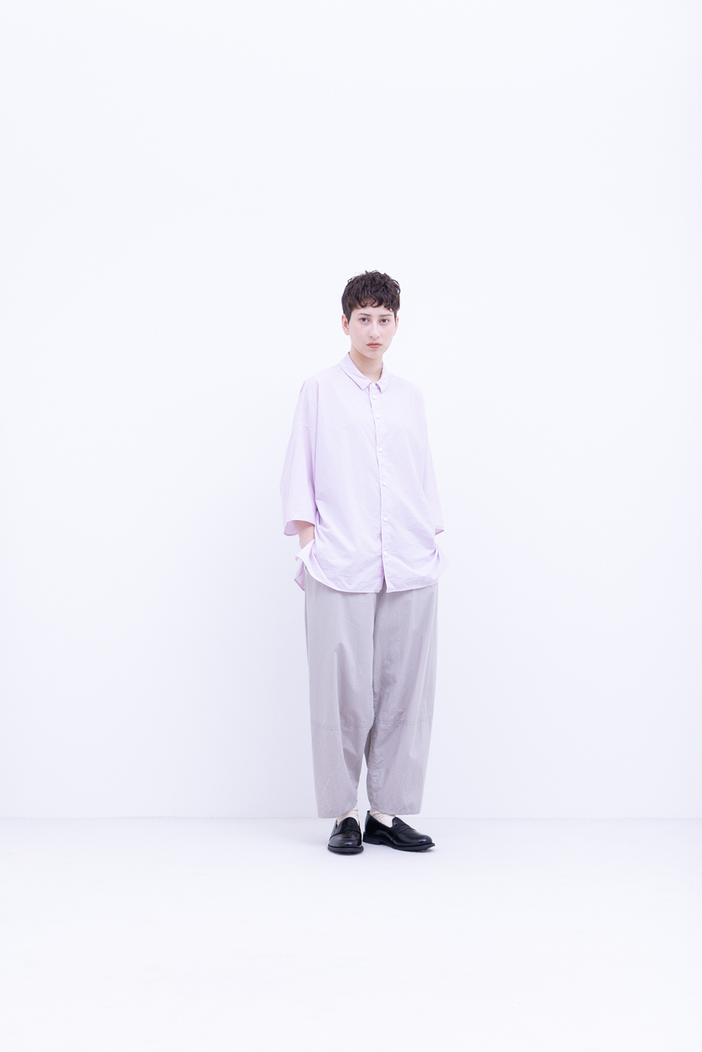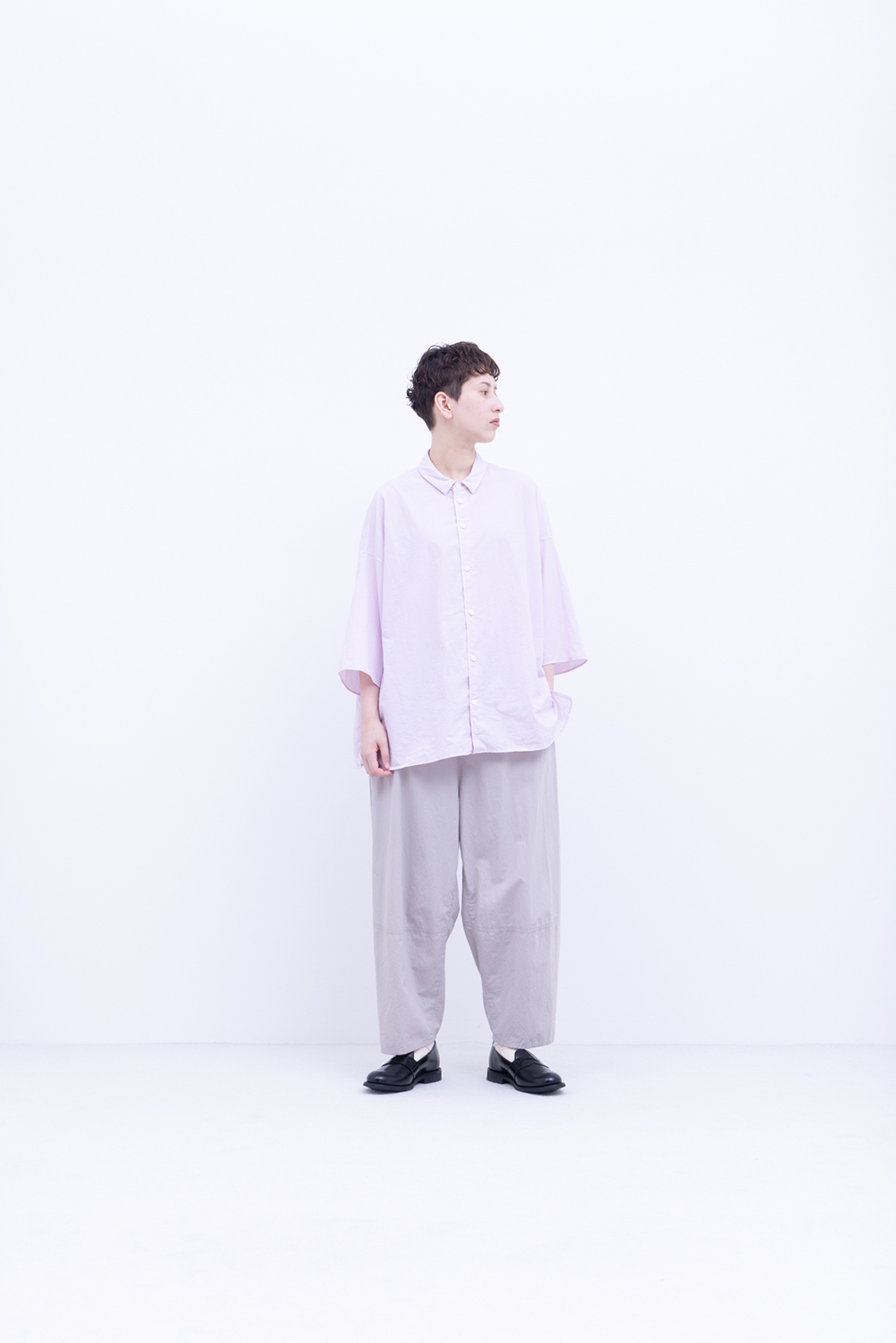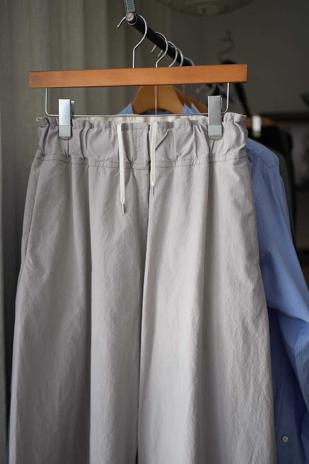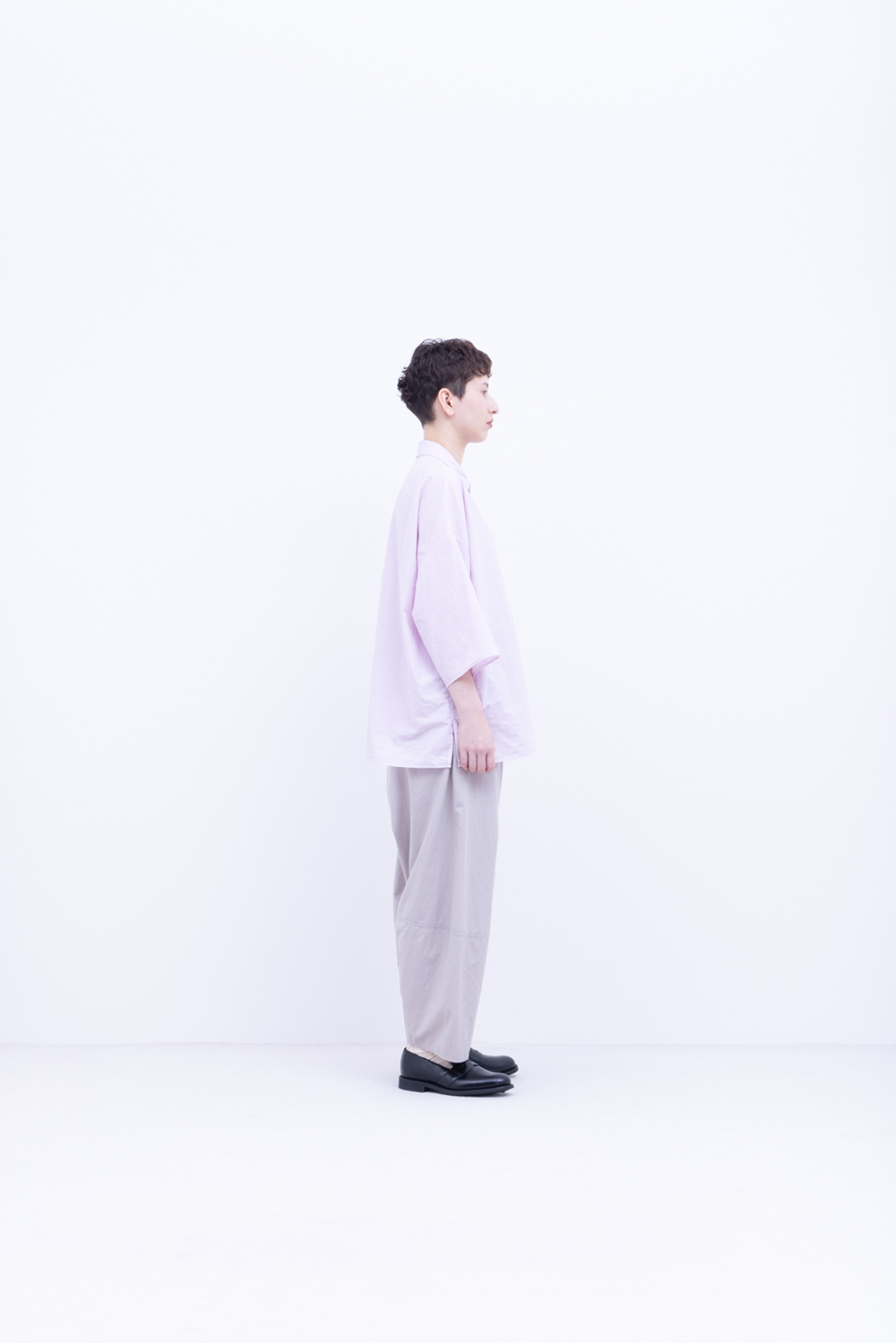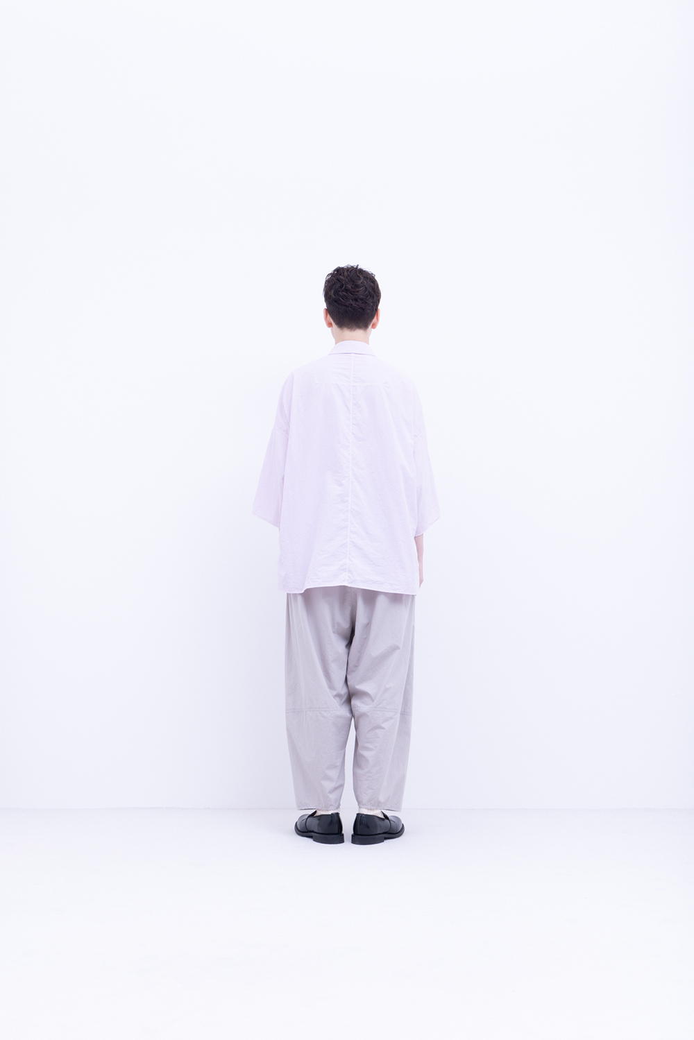 ”ホウジュン洗い”と呼ばれる特殊な洗いをかけたコットン素材高密度タイプライター生地。洗いによって糸に膨らみが出て目が詰まり、柔らかくなりながらもハリのある、シワになりにくいとても不思議な生地感です。タンブラー乾燥済み。膝下にテーパードを入れ、脇はぎのないこと生まれる独特なワイドシルエットパンツ。