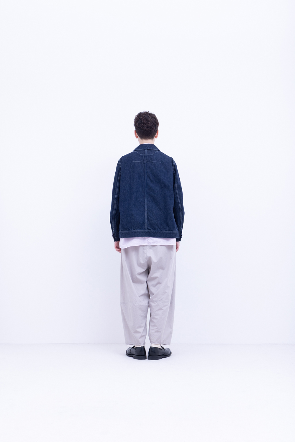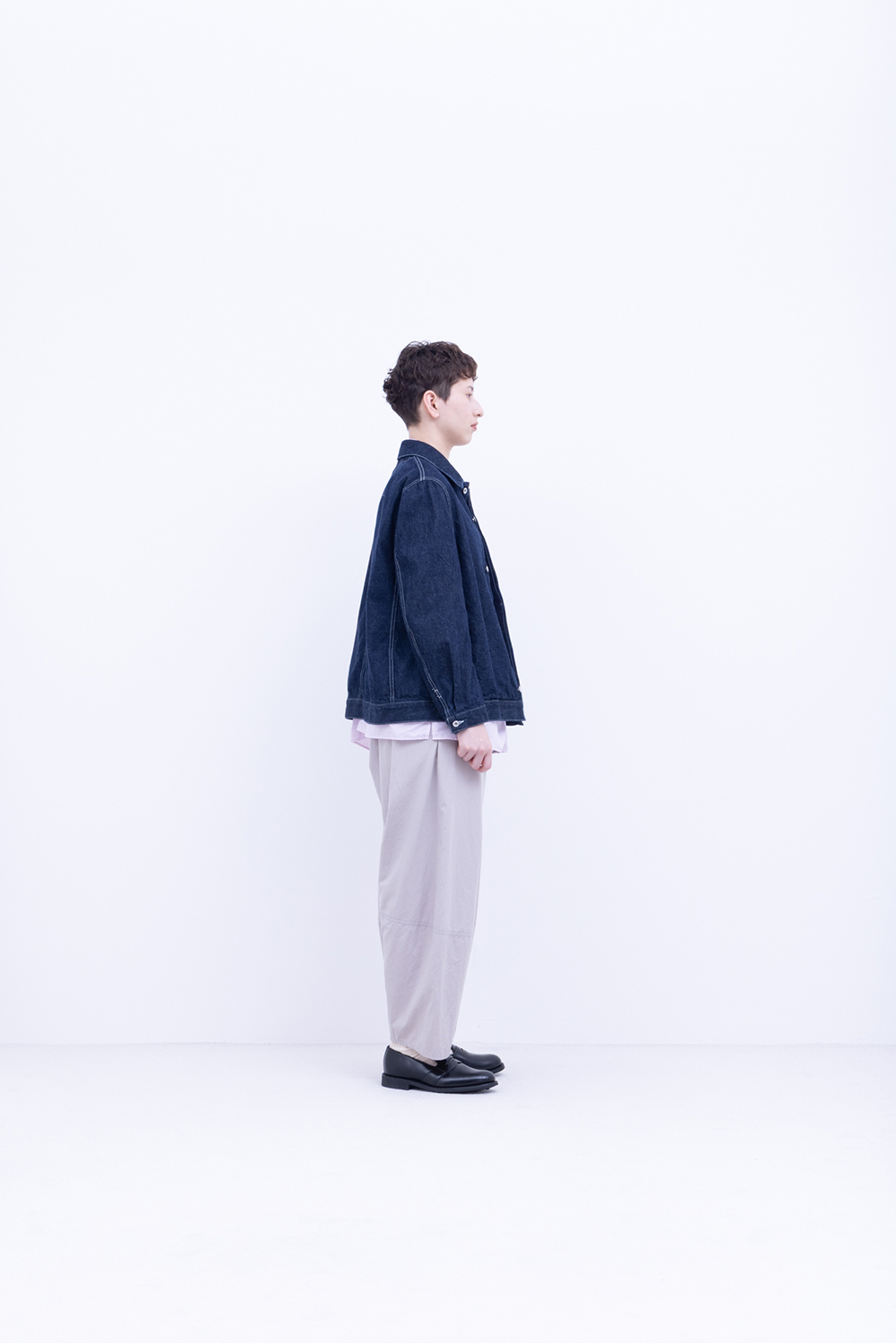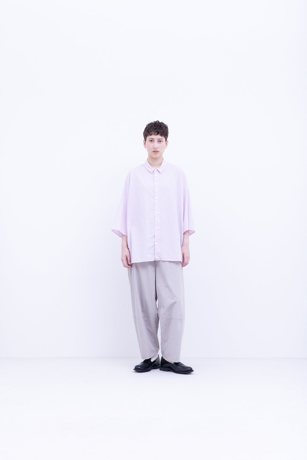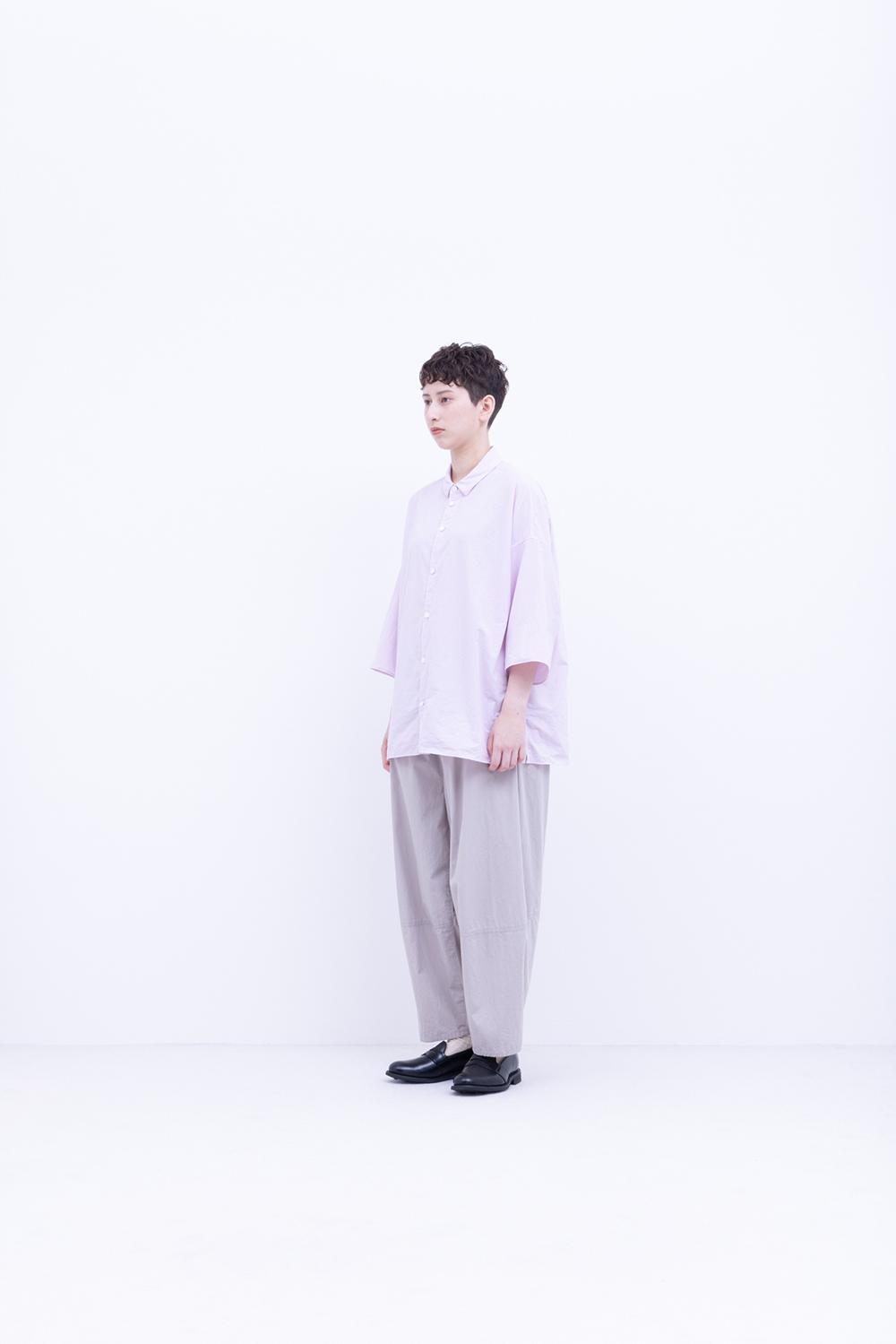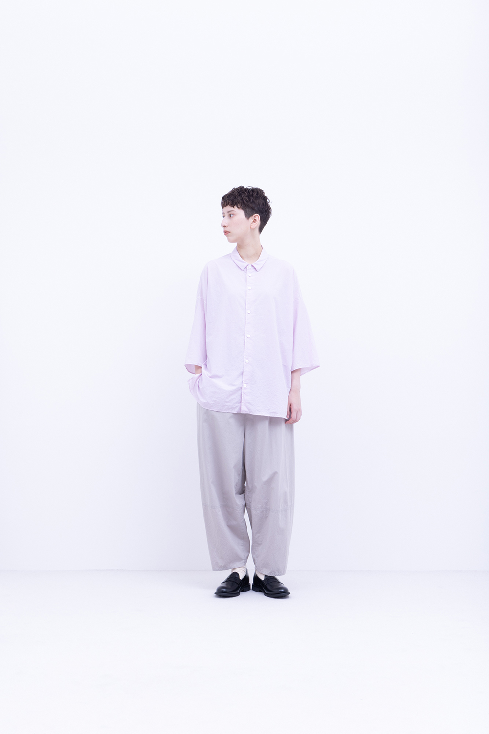 ”ホウジュン洗い”と呼ばれる特殊な洗いをかけたコットン素材高密度タイプライター生地。洗いによって糸に膨らみが出て目が詰まり、柔らかくなりながらもハリのある、シワになりにくいとても不思議な生地感です。タンブラー乾燥済み。膝下にテーパードを入れ、脇はぎのないこと生まれる独特なワイドシルエットパンツ。