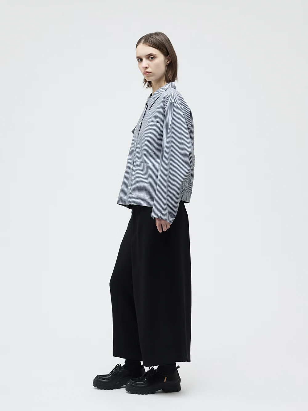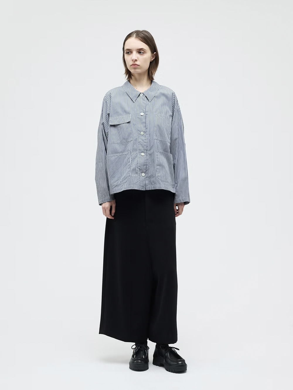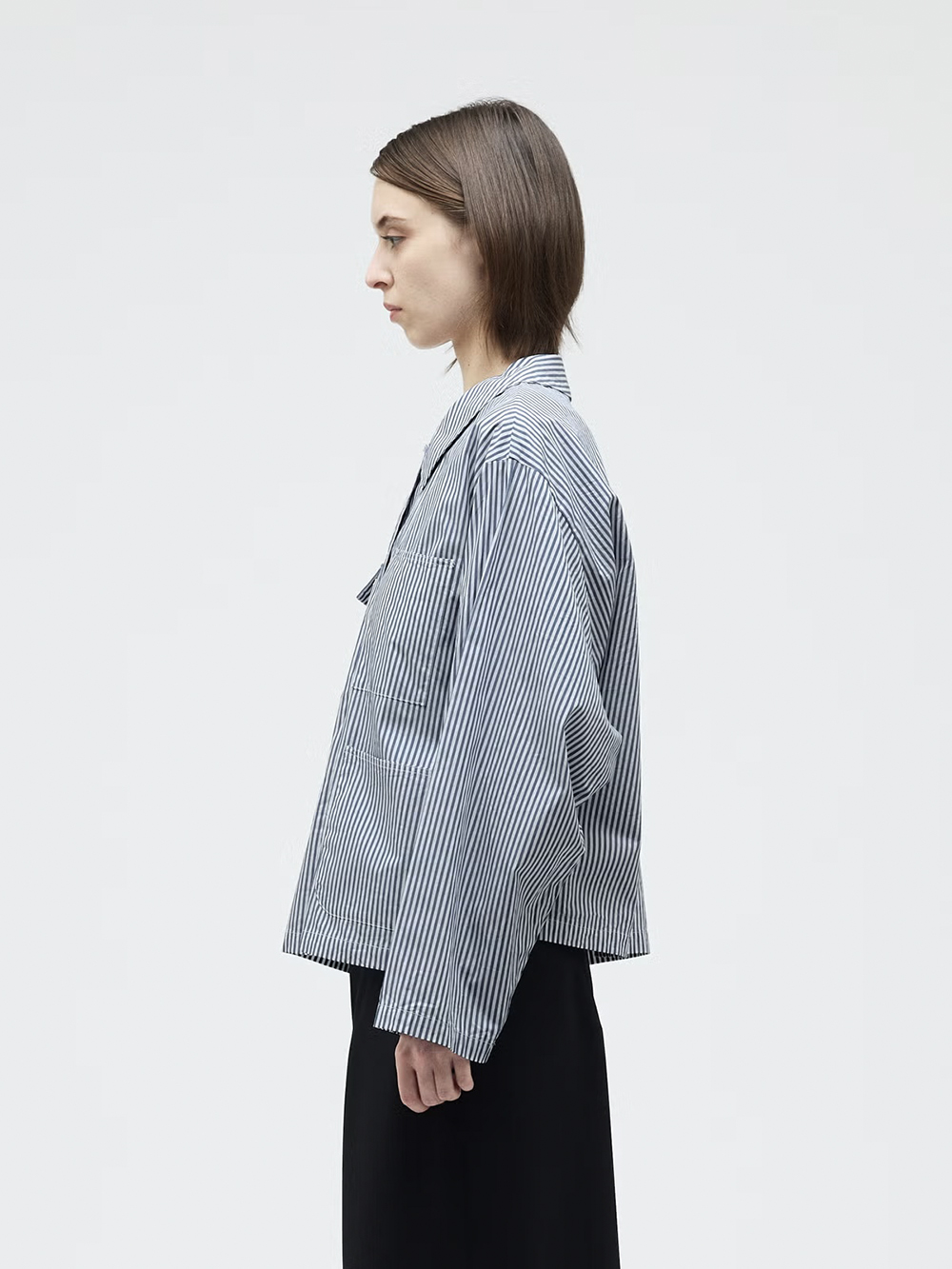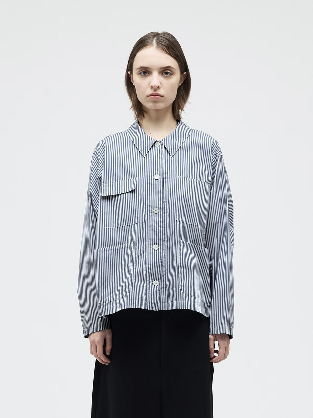 ストライプカバーオール、30番のステッチ糸を使用。フロントポケットが4つ付いたシャツジャケットを表現。コンパクトなジャケット仕様で羽織って着こなしてもよく、インナーを見せたり、フロントボタンをきっちり留め爽やかなカジュアルコーデを演出しても素敵です。コーディネートも幅広く楽しんでいただける1枚です。