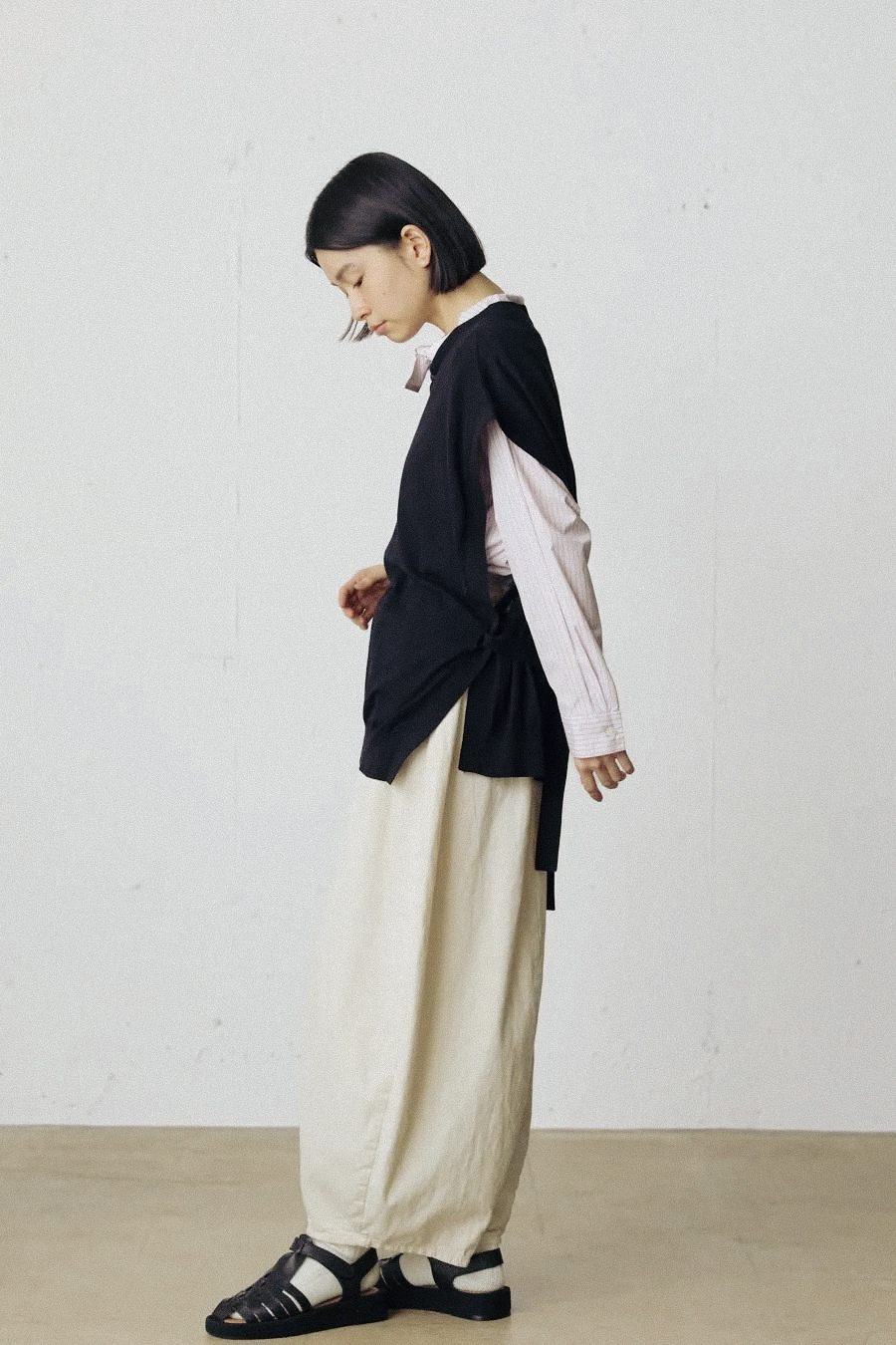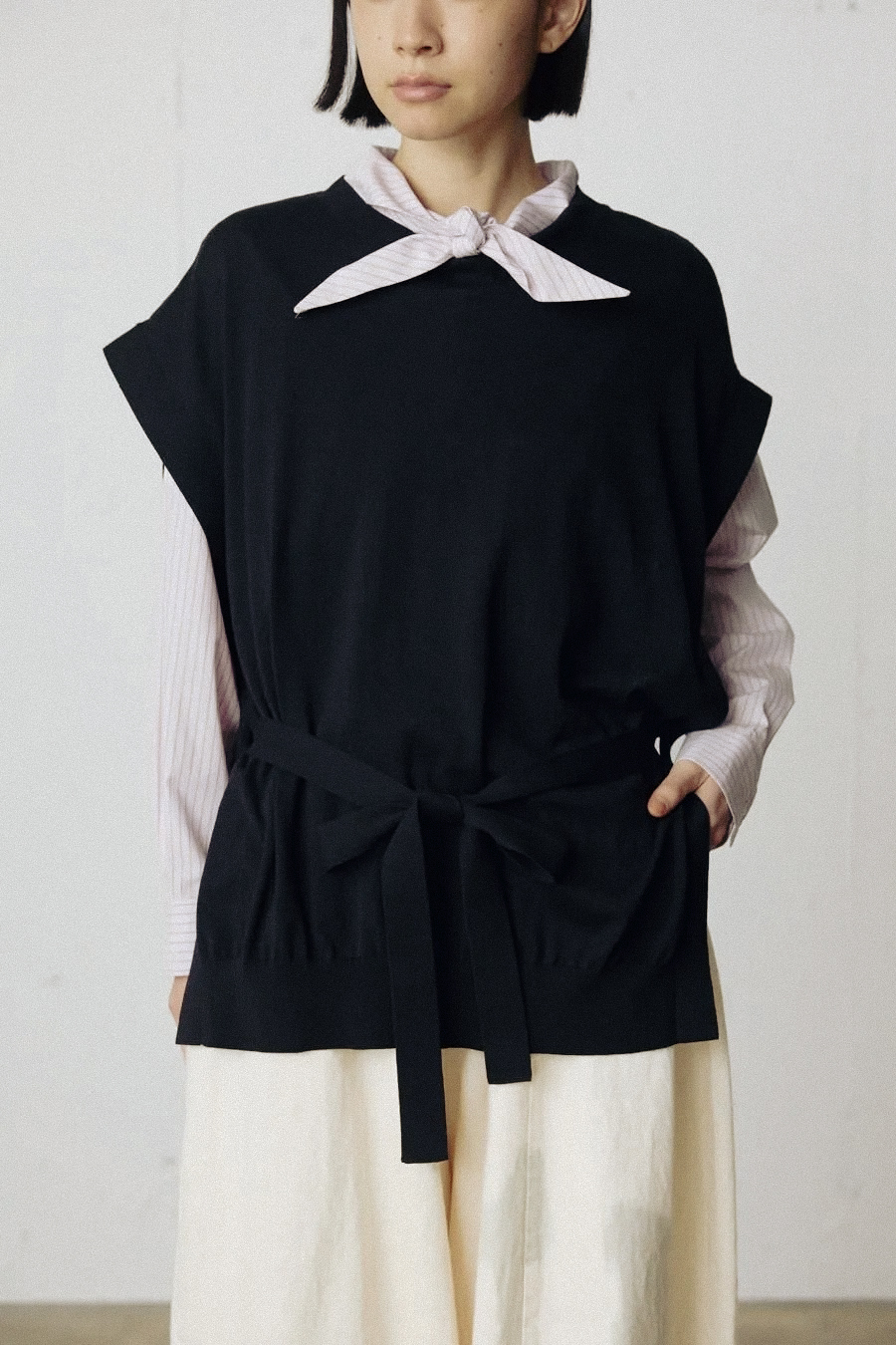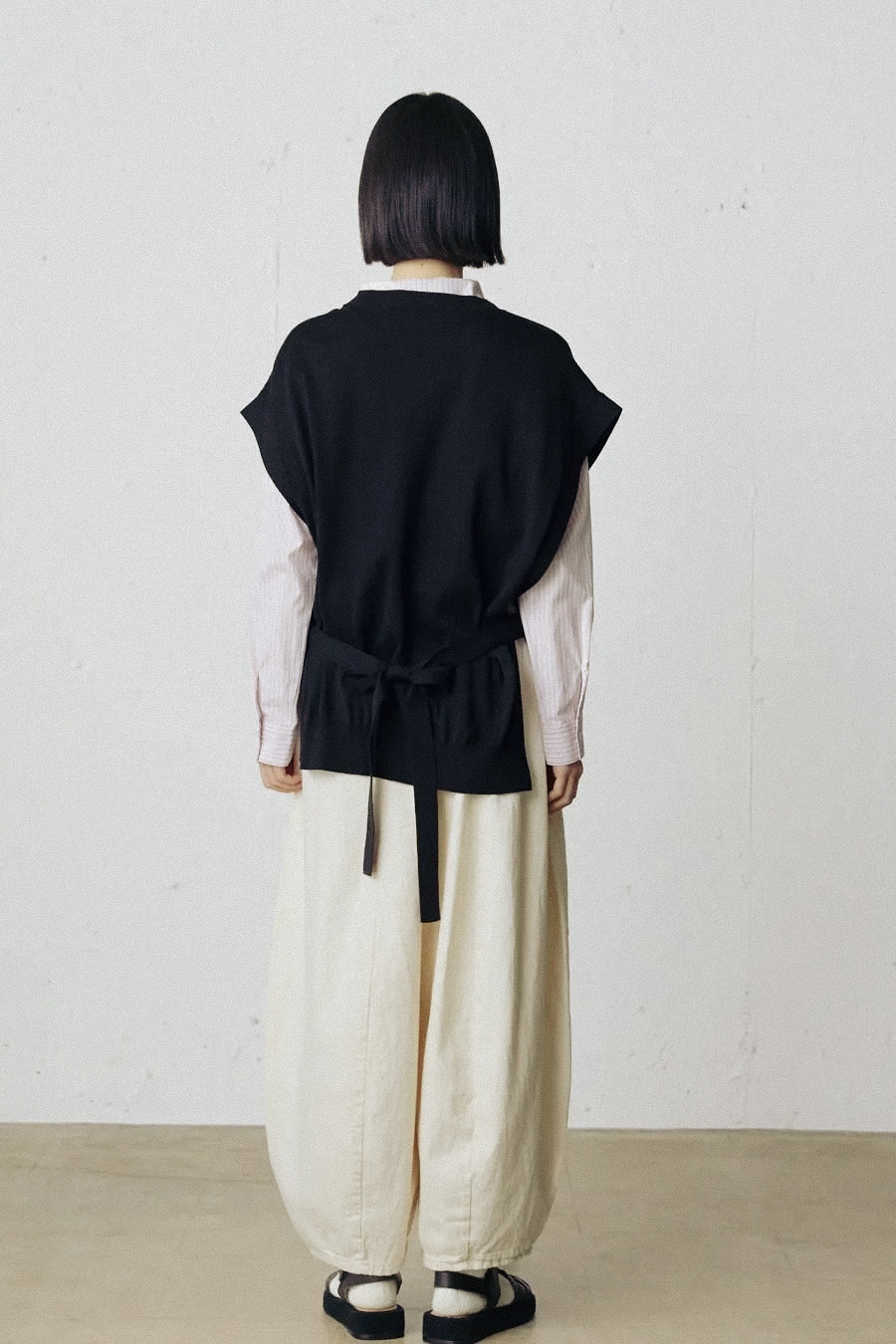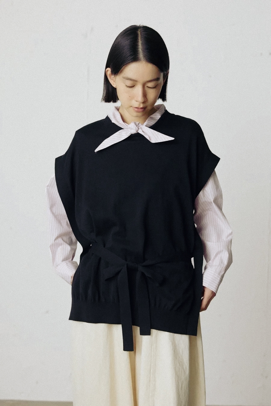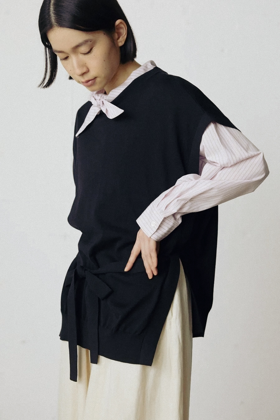 ハイゲージで丁寧に編み立てたニットベスト、目面が美しく毛羽立ちにくいクリーンで上品な素材感が特徴です。サイドに紐をデザイン、紐を結んでウエストマークした着こなしはもちろん、フロント・バック・片側に寄せてサイドで結ぶなど、結び方次第でさまざまな表情を楽しめます。アームホール部分にはサイドスリットを施し、リボンでフィット感を調節可能。インナーに合わせてアームの幅感を自由に変えられるため、Tシャツからシャツ、ボリュームのあるトップスまで、幅広いレイヤードスタイルに対応します。あえてリボンを結ばず垂らしたままのスタイリングもおすすめ。