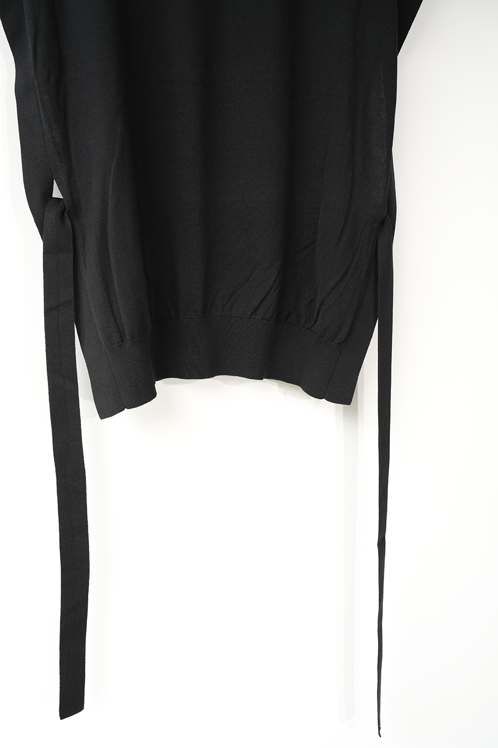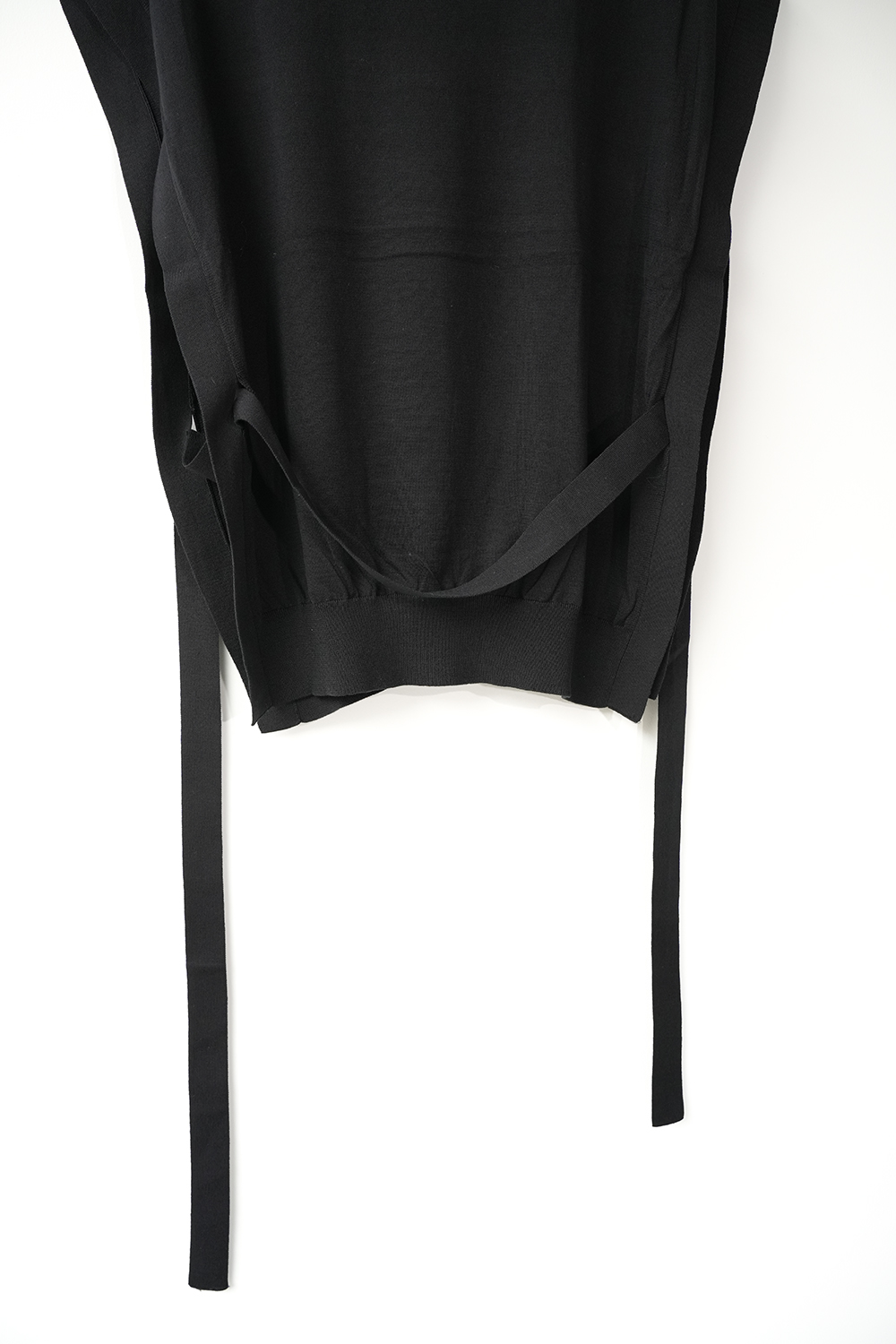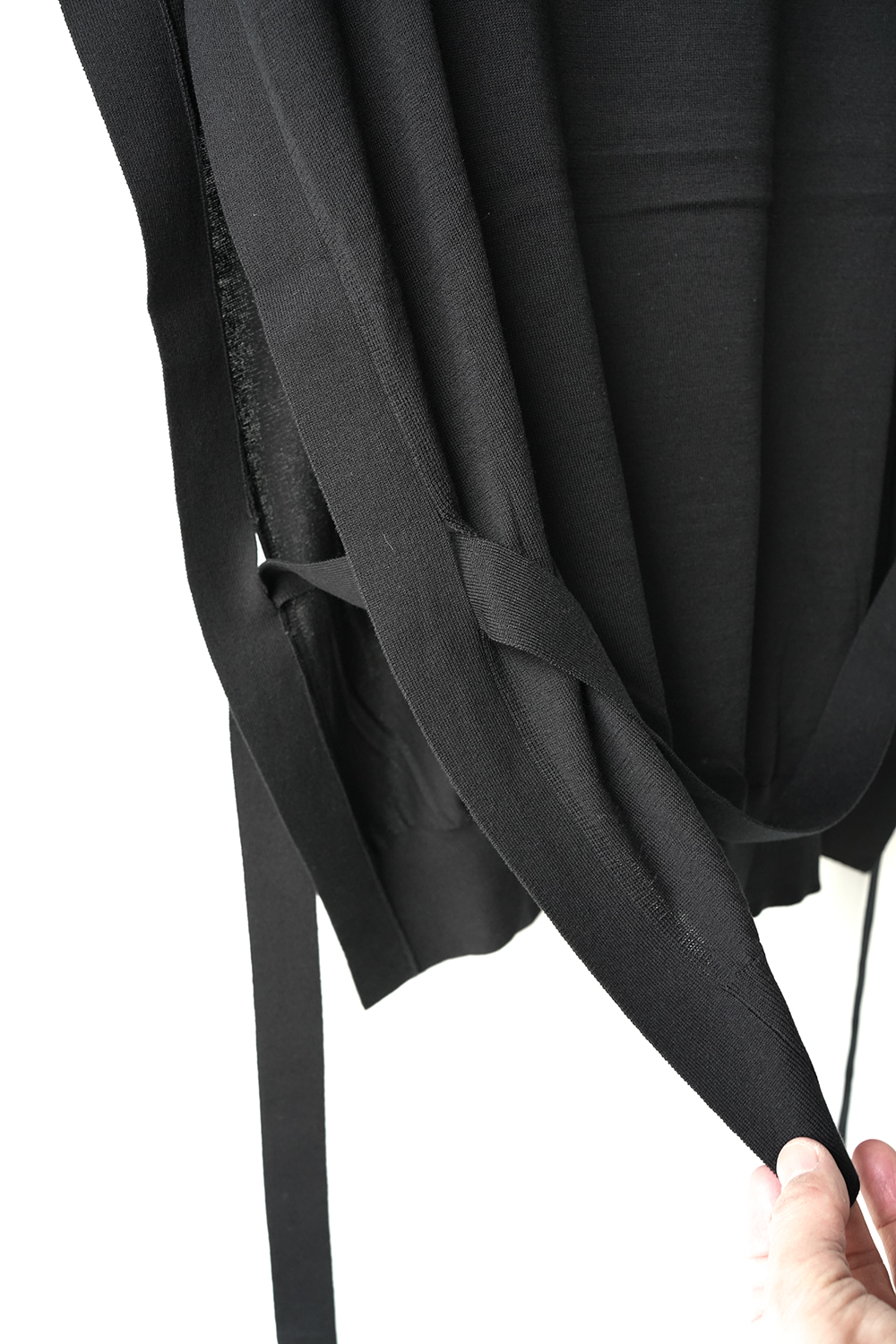 ハイゲージで編立たニットシリーズ、サイドに紐が付いたベスト。目面がキレイで毛羽も出にくい素材感、紐でウエストマークする着方できます。