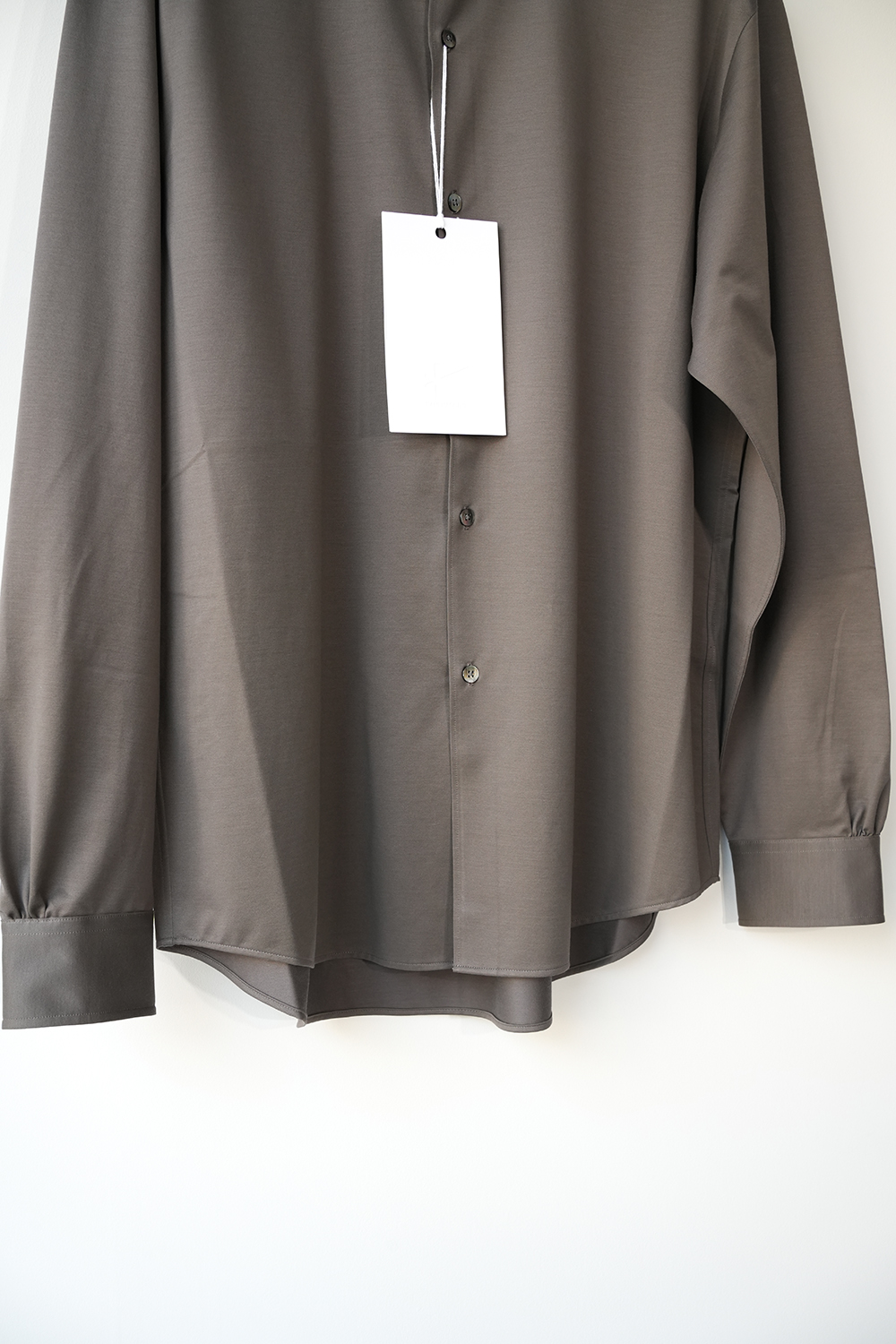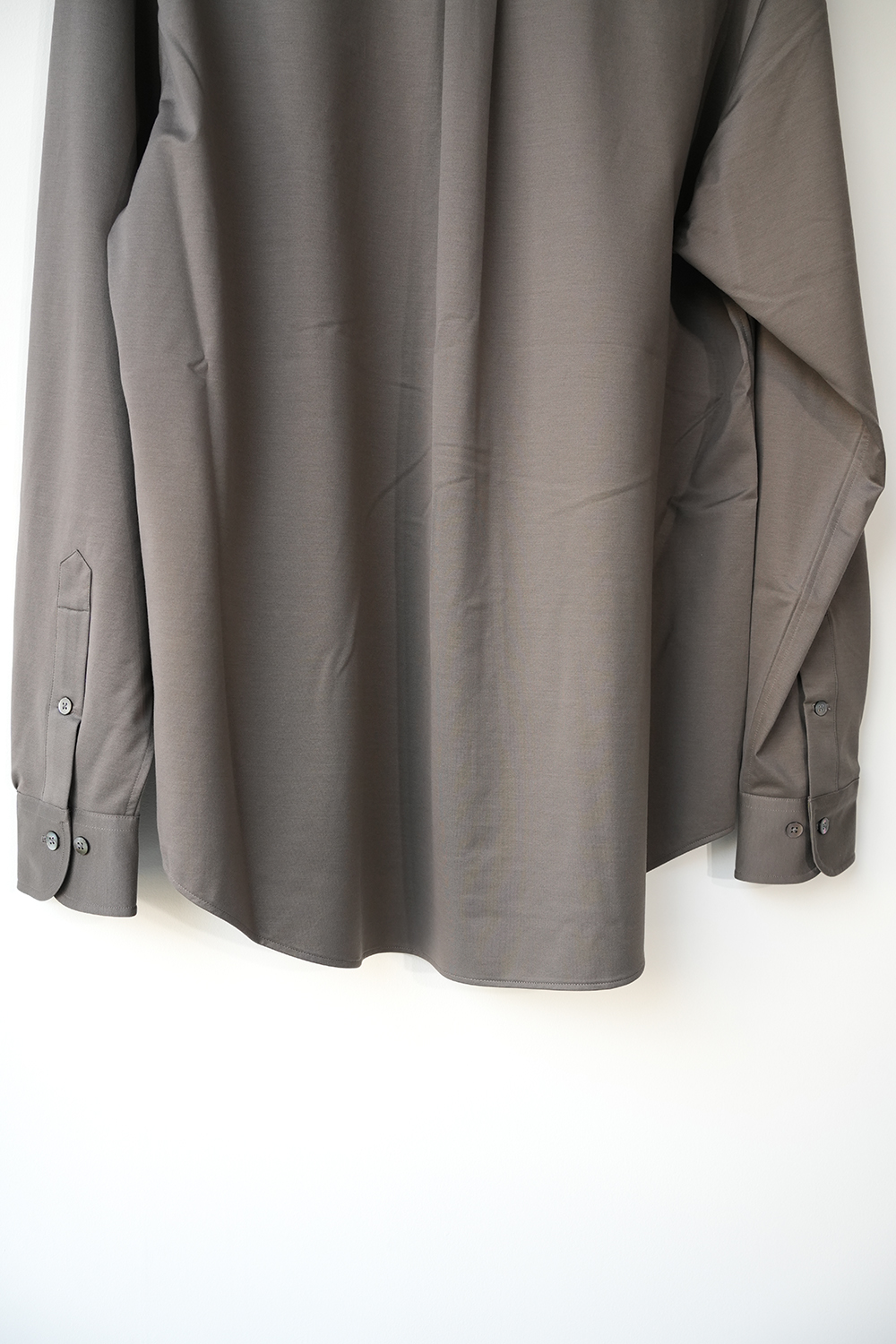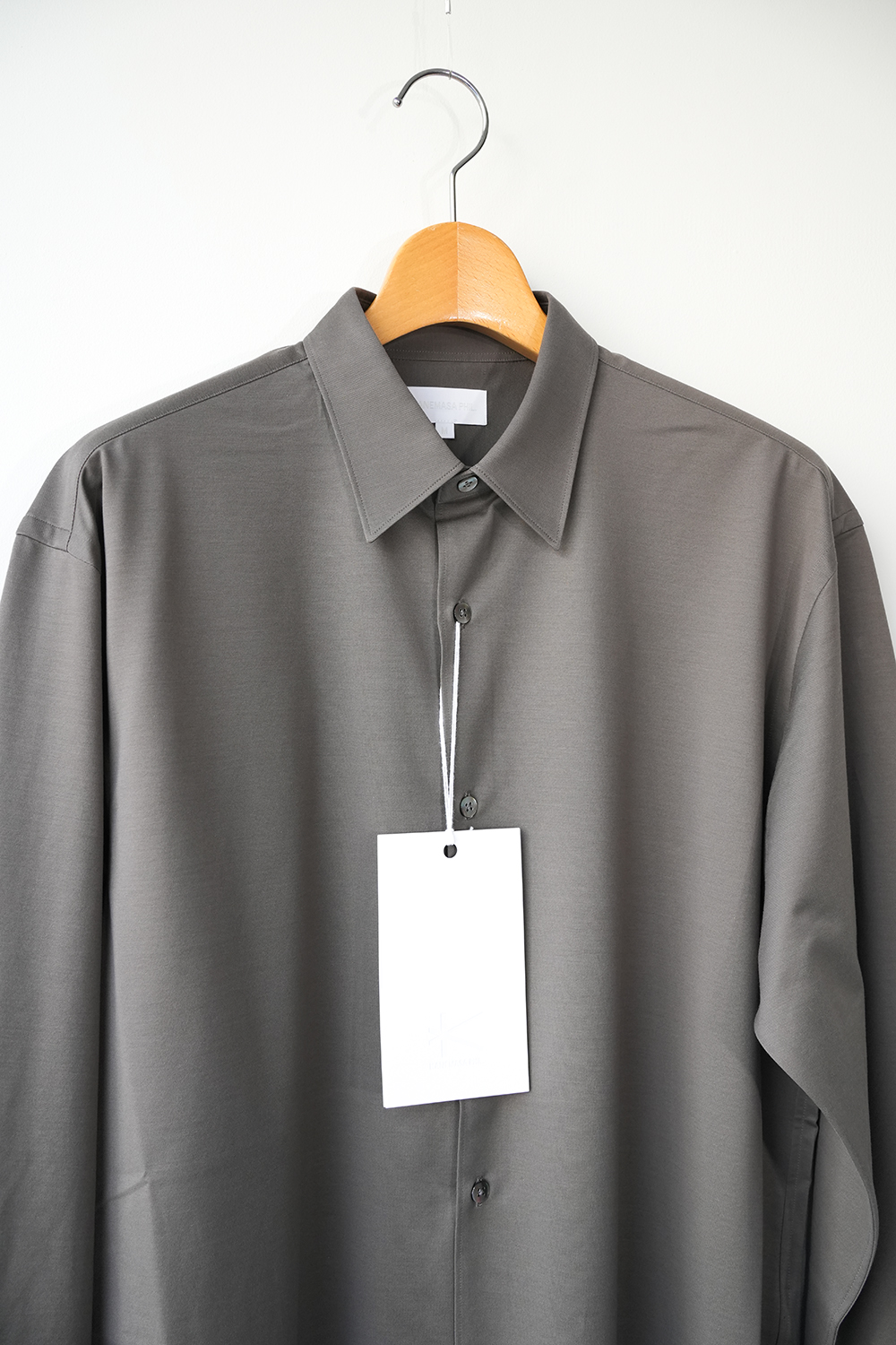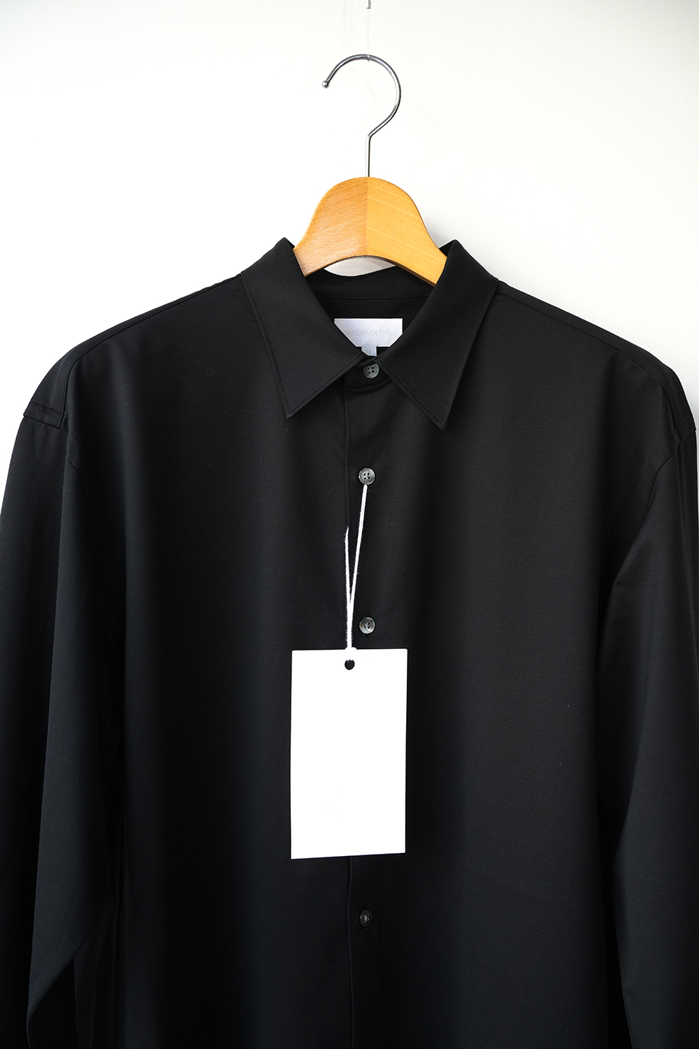 これぞ KANEMASA PHIL. 定番だからこその説得力。みんな知って欲しいど真ん中定番アイテム。“modest” 程よい肩幅から裾に向かってストンと落ちるシルエットは名前通り控え目なシルエットです。46G という、スーパーハイゲージで、タイプライターという織物の高密度平織組織を実現。 ストレッチ性が高く一度着ると止められない着心地、そして、着用時のしわなどの形態変化も少なく、イージーケア性も高い。 ハリ感、光沢感、イージーケアを持ち併せた我々にしかできないニュースタンダードシャツ地。ディティールは、ドレスシャツを採用し全て巻き伏せ本縫い仕様、貝蝶釦使いで。素材のハリ感、光沢感、そして塩梅の良いシルエット、生地が生み出すドレッシー感とパターンを融合させた、唯一無二のシャツ。袖のギャザーなどよりドレスなディティールに仕上げております。綿糸の原料は、120/1 という細番手リサイクルスビンコットンを双糸使い。糸もガス焼きしたものを使うことで、より光沢感と洗濯後の毛羽を抑えております。50D 高捲縮リサイクルナイロンを使用し、ストレッチ性を出しております。今シーズンから釦裏側にブランドロゴを入れております。KANEMASA PHIL.のスタンダードシャツ。※巻き伏せ本縫い-肌あたりが良くする為、生地の端が見えないように、一度ミシンをかけた後かぶせるように、もう一度ミシンをかける縫製方法。
