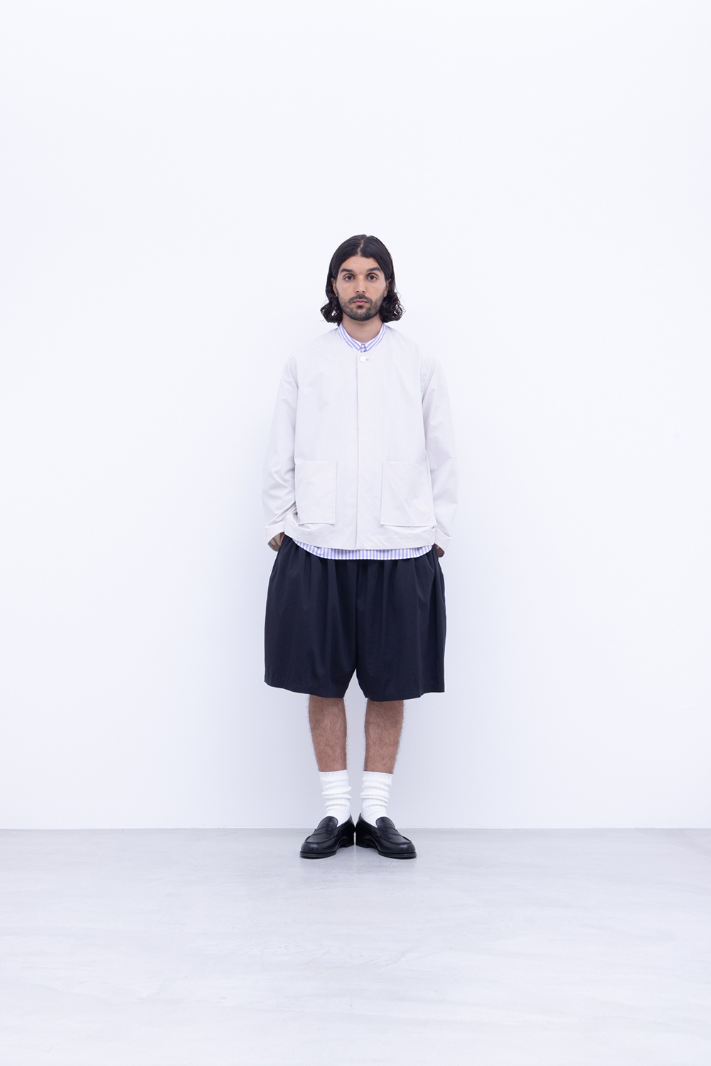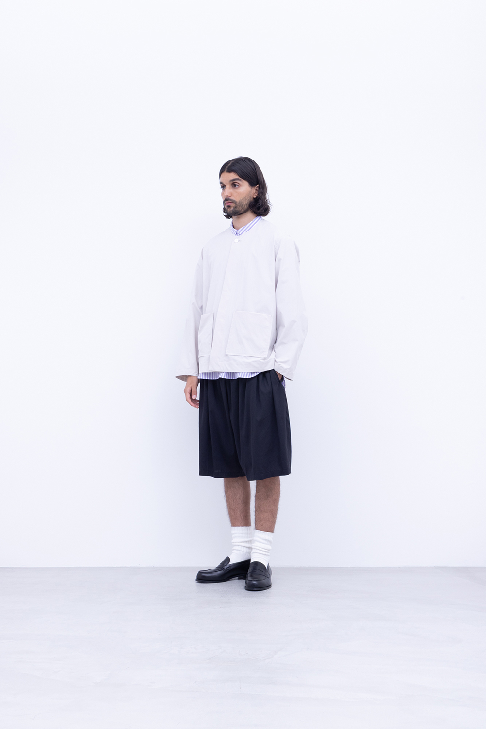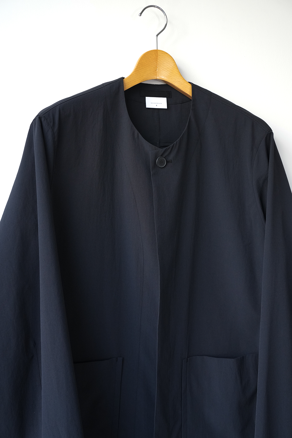 光沢のないストレッチ性のあるポリエステル糸を使用したタイプライター生地、透けにくく速乾性のある生地です。1つボタンのカーディガンシャツ。