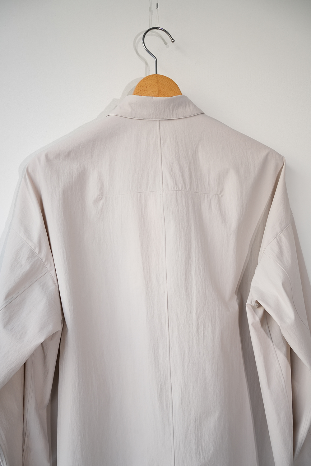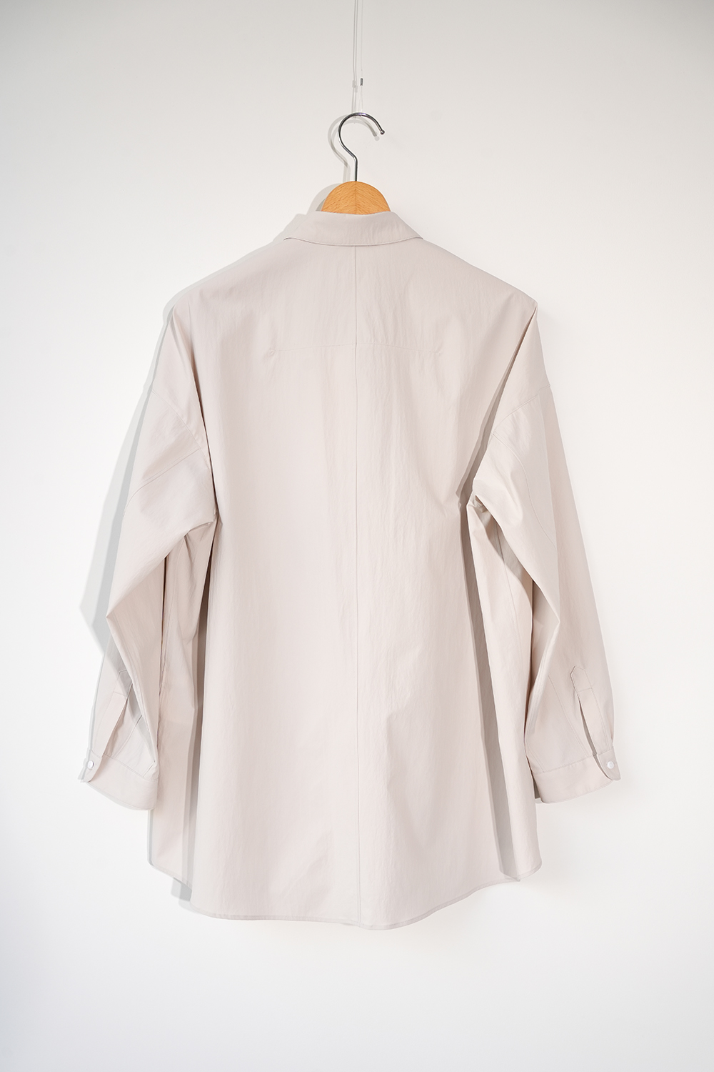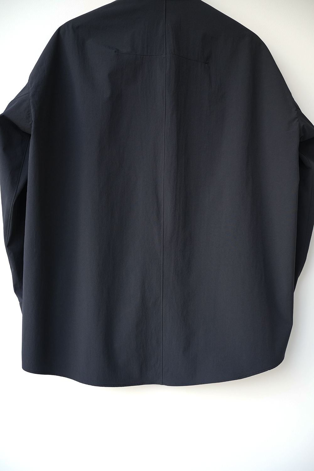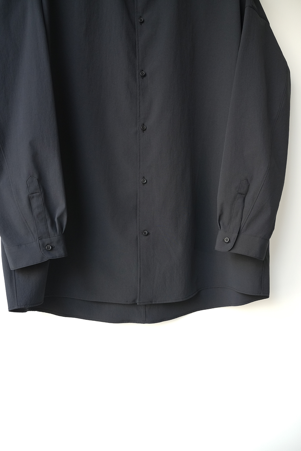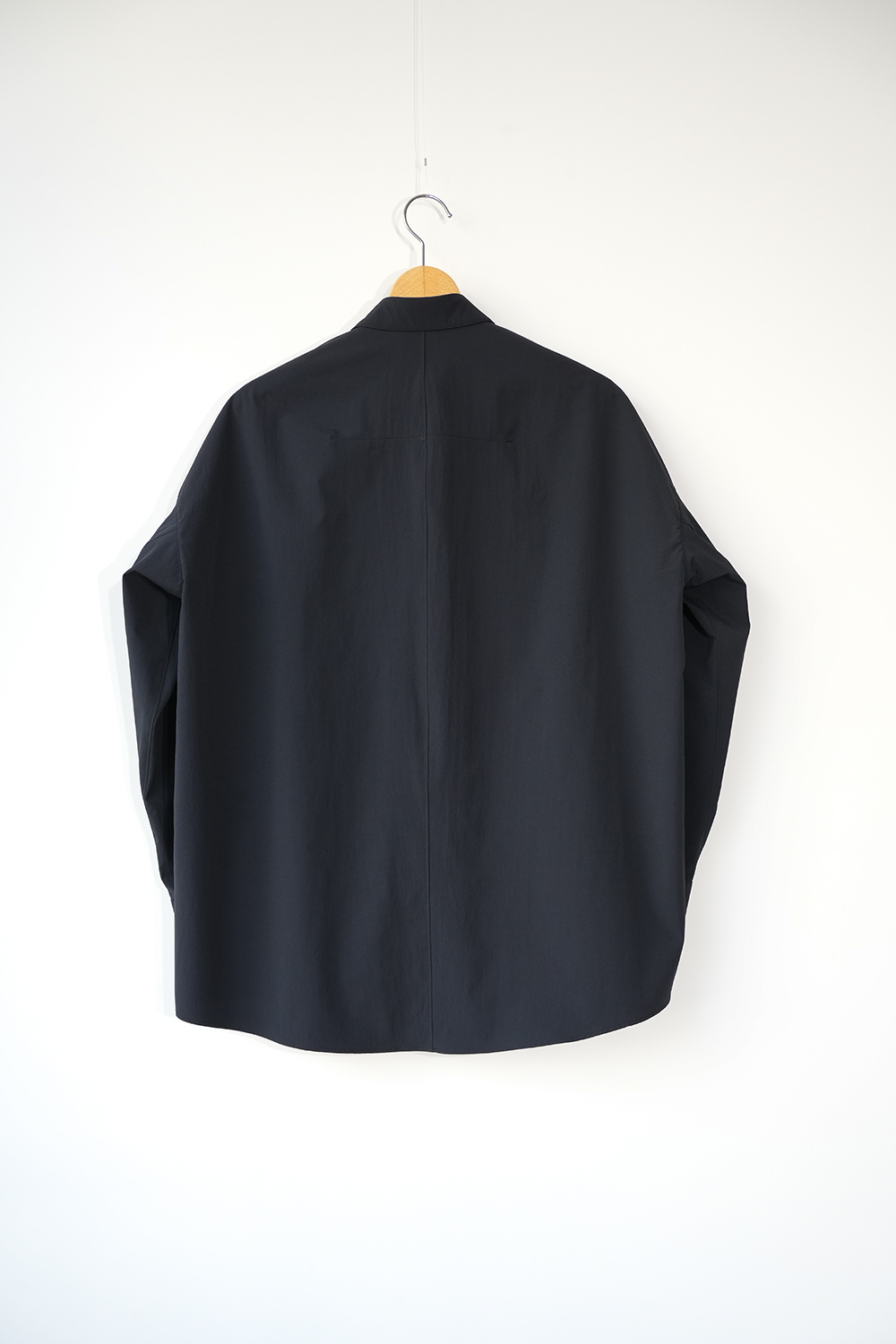 光沢のないストレッチ性のあるポリエステル糸を使用したタイプライター生地、透けにくく速乾性のある生地です。ドロップショルダー、身幅広め、小さめの襟、小さなボタン。