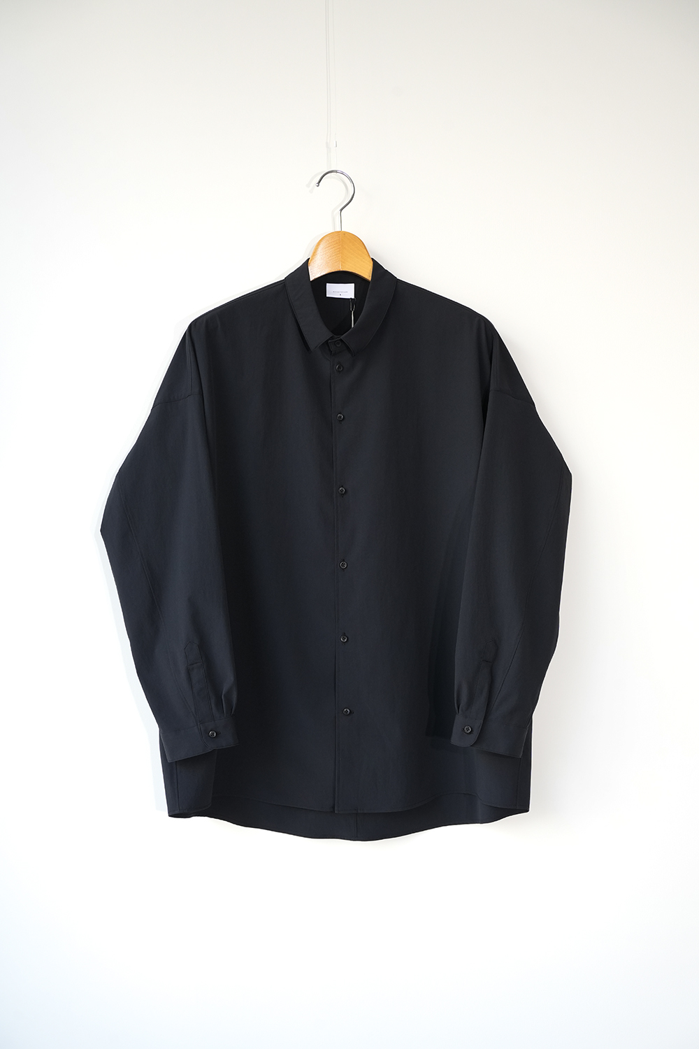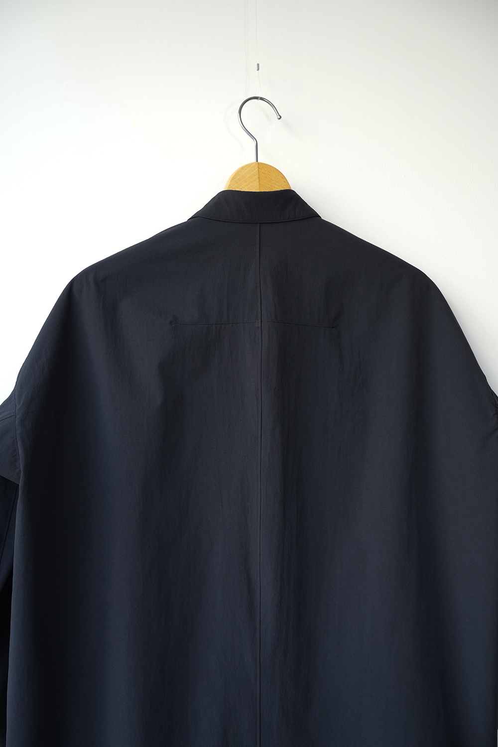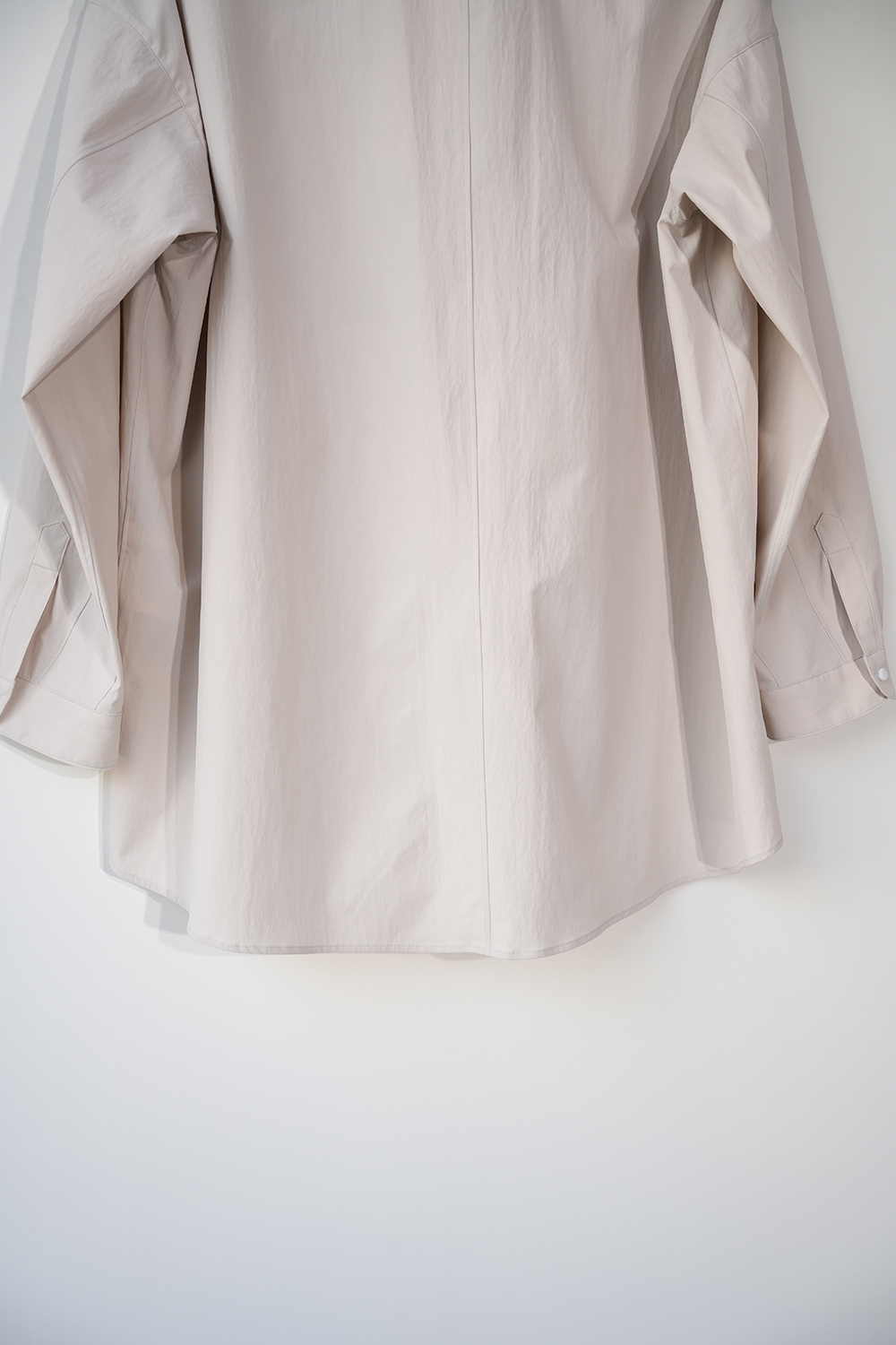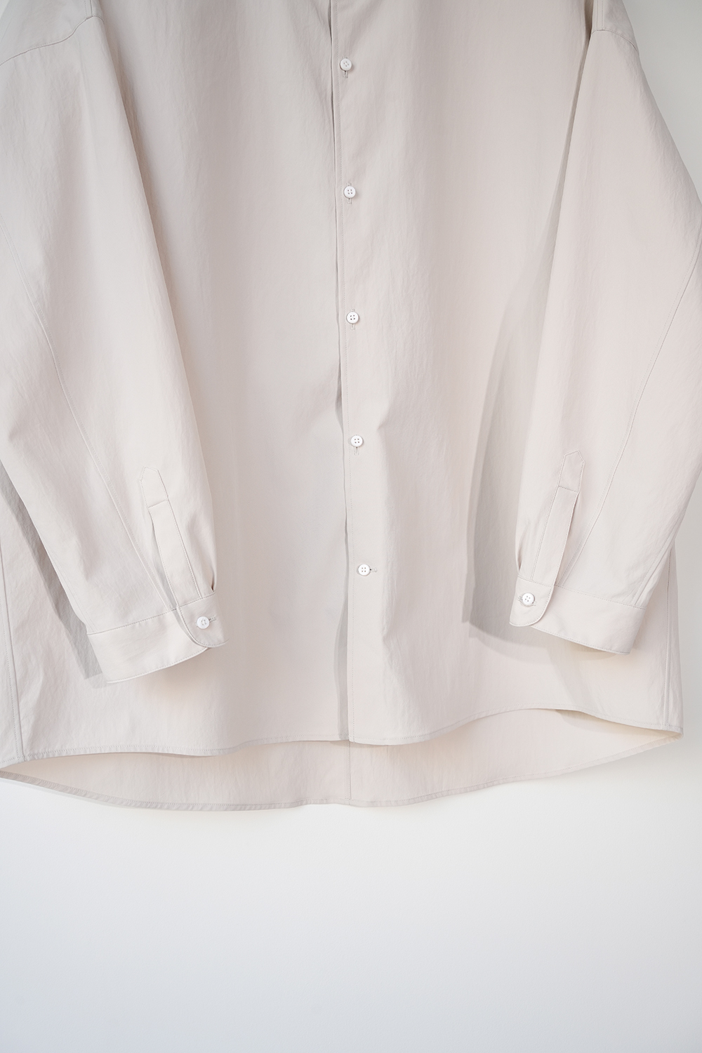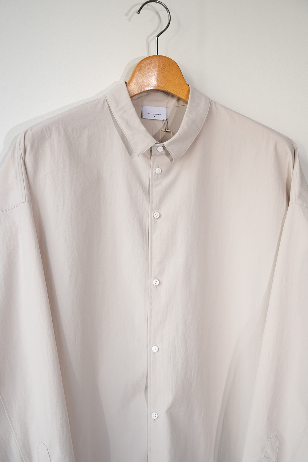 光沢のないストレッチ性のあるポリエステル糸を使用したタイプライター生地、透けにくく速乾性のある生地です。ドロップショルダー、身幅広め、小さめの襟、小さなボタン。