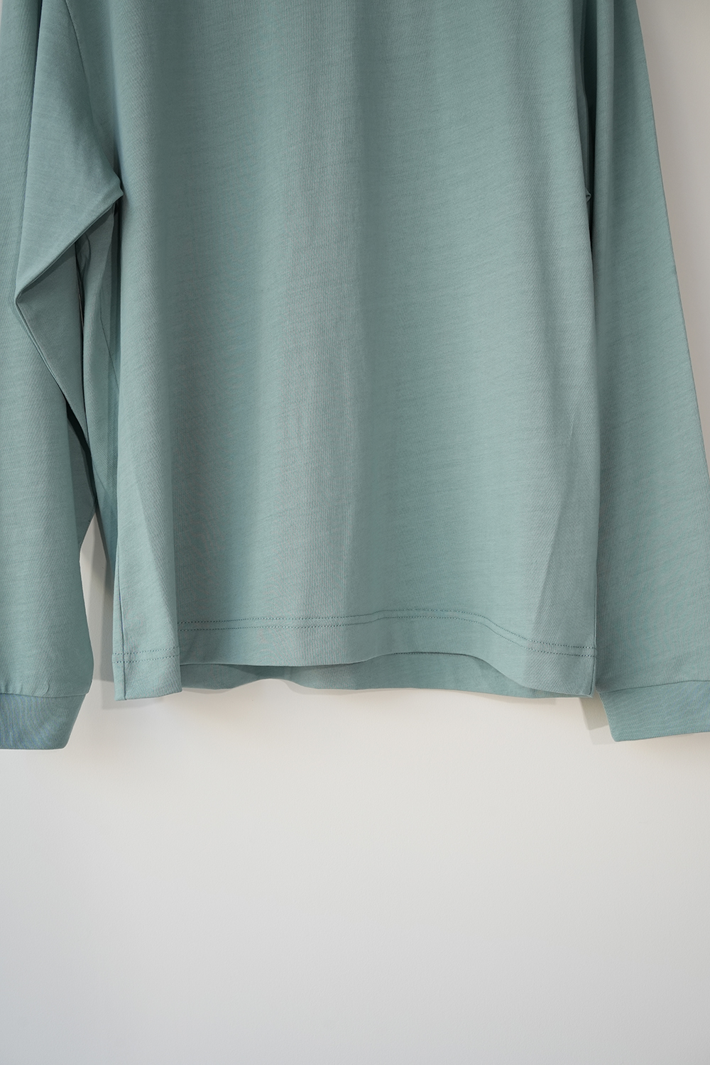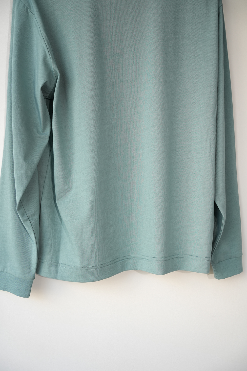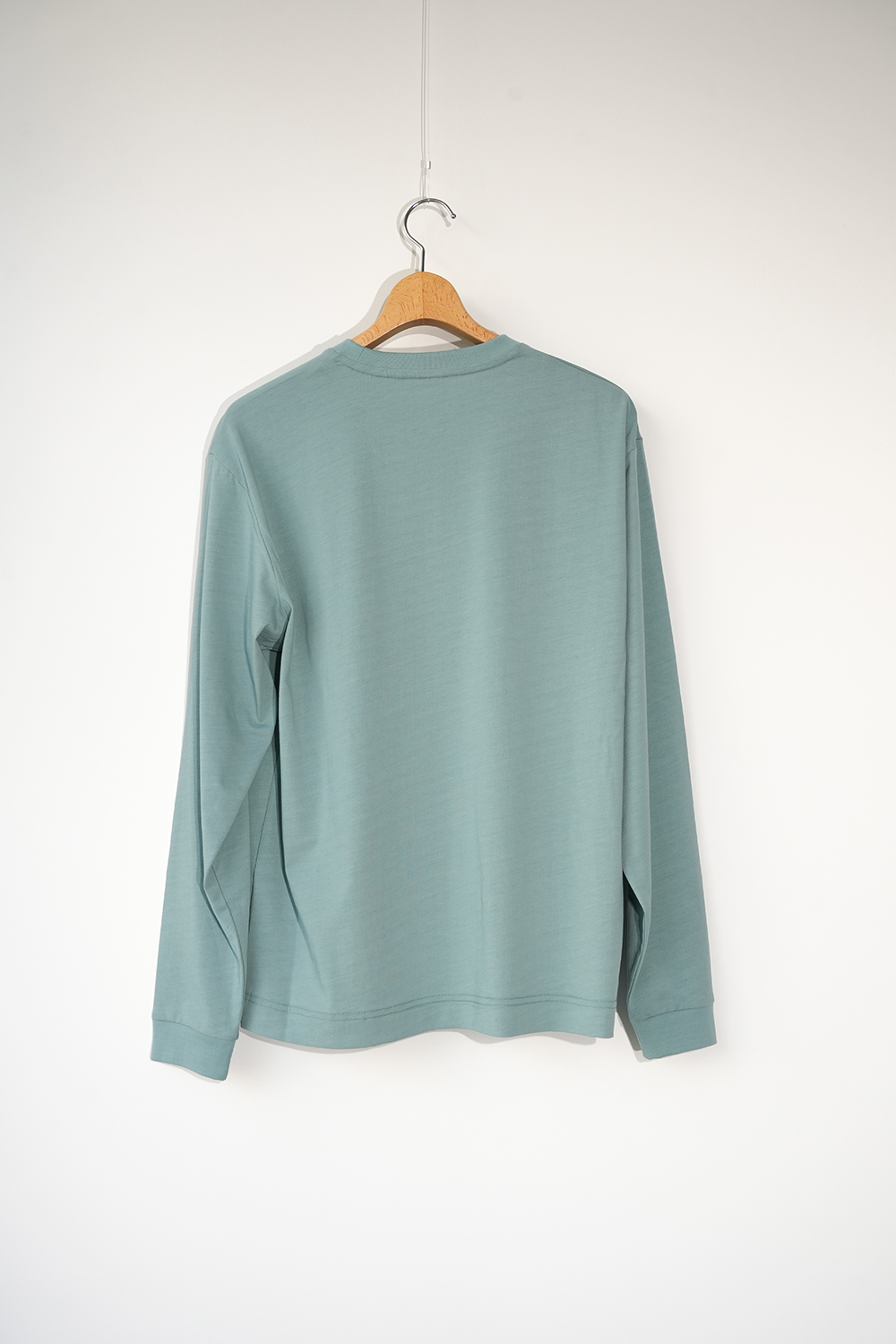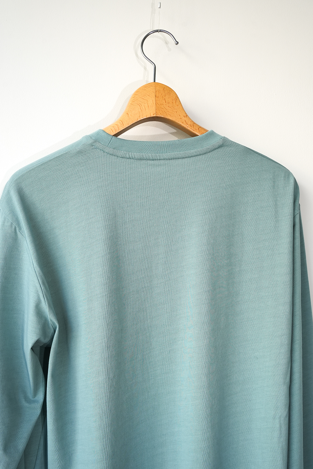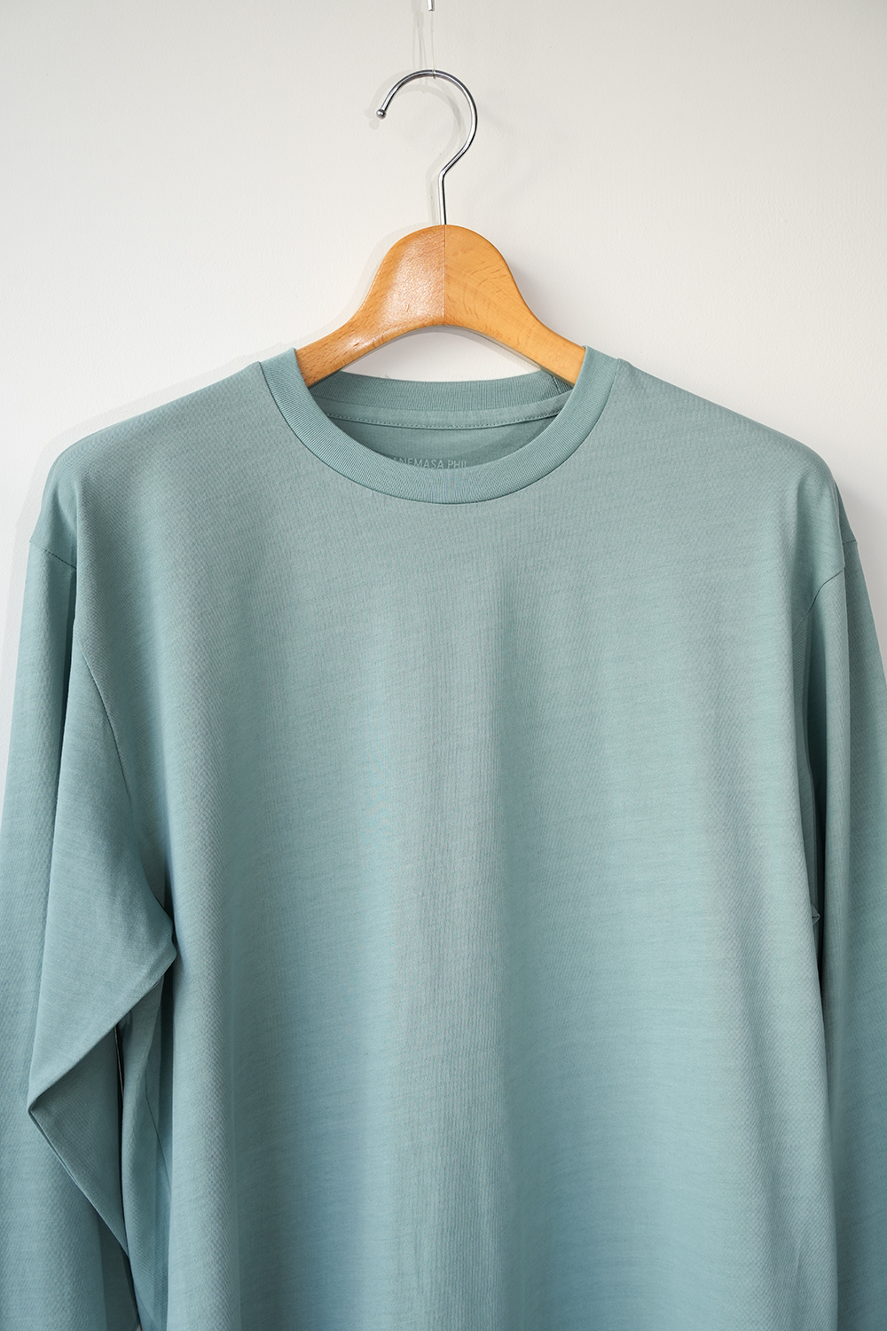 強撚T。触るだけで普通とちがう雰囲気をもつ1着。裏定番のこの素材、コットンなのでめちゃめちゃ高そうに見えます。KANEMASA PHIL.独自の36G というハイゲージ編み機で、限界まで詰めた度詰め天竺組織を使用。60/1オリジナルリサイクルスビンを引き揃え、度詰めで編むことで、表面の面が良く独特な雰囲気のある素材感です。また、糸でも強撚加工を加え、ドライなタッチと、高品質糸のヌメリ感が合わさった今までにない素材となります。 また、糸加工でも、生地加工でも、特殊加工を施すことで、毛羽を飛ばし、他に無い唯一無二なTシャツ素材に仕上げております。程よいルーズシルエットのカットソー。丸みがあるシルエットで、インナーでもアウターでも使用できる肉感が特徴。※オーガニックコットンを使用している為、コンタミネーションが発生することがありますが、生地特有の為ご了承下さい。※生地に特殊加工を施している為、アタリなどが生じる可能性がございますが生地特有の為、ご了承下さい。
