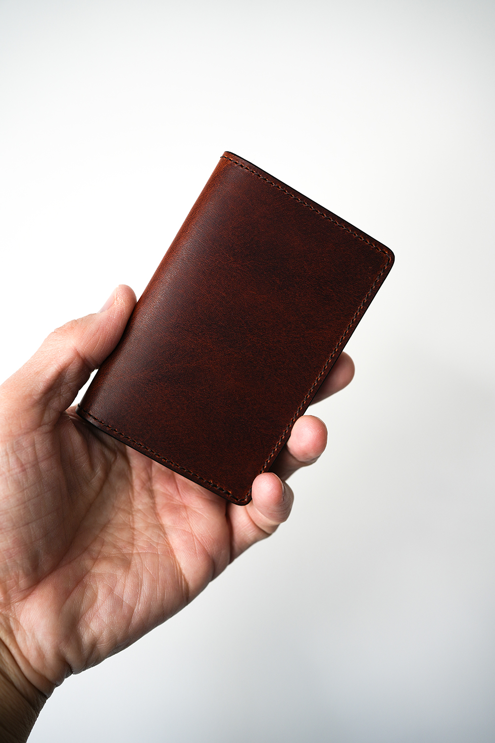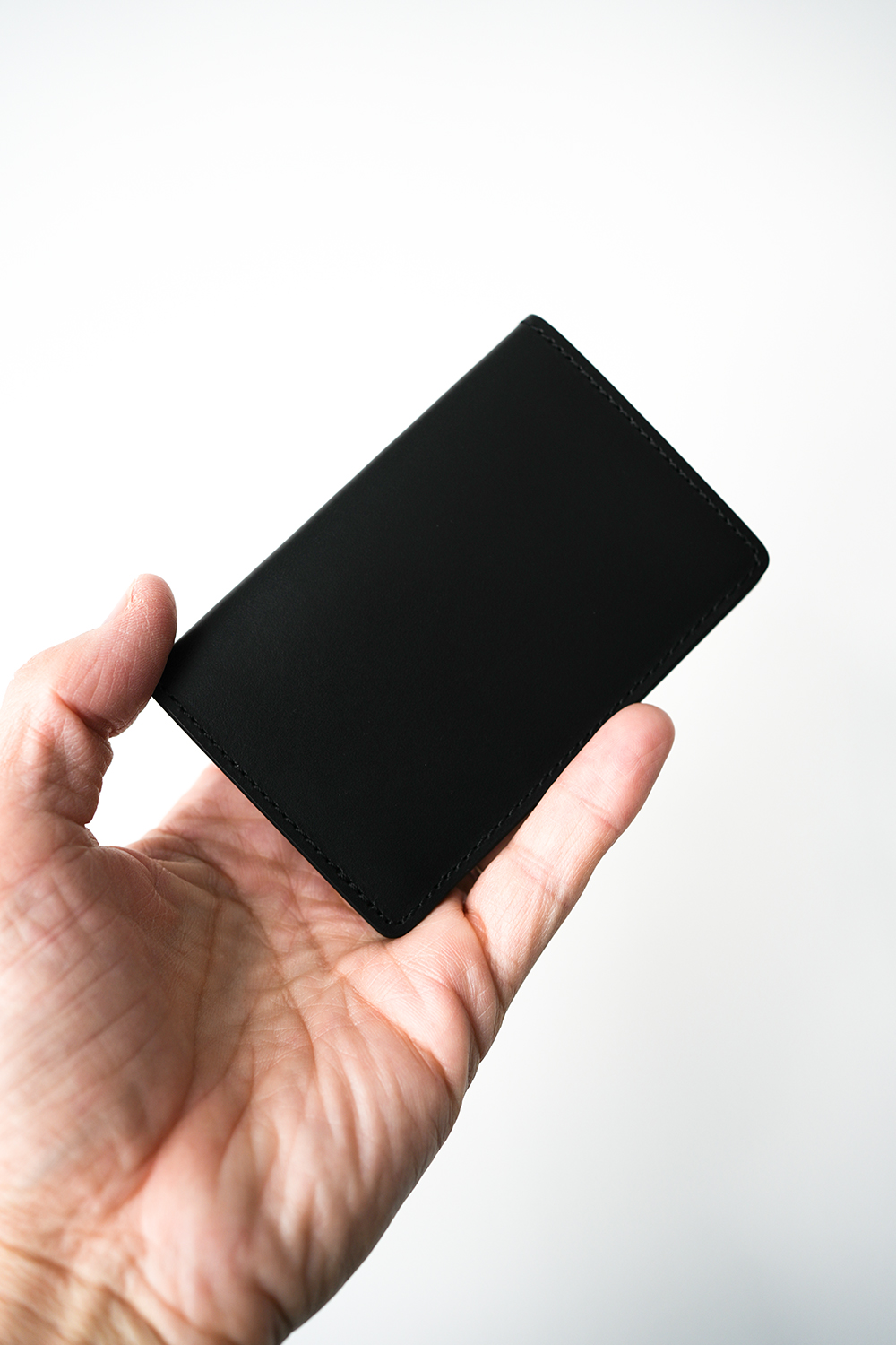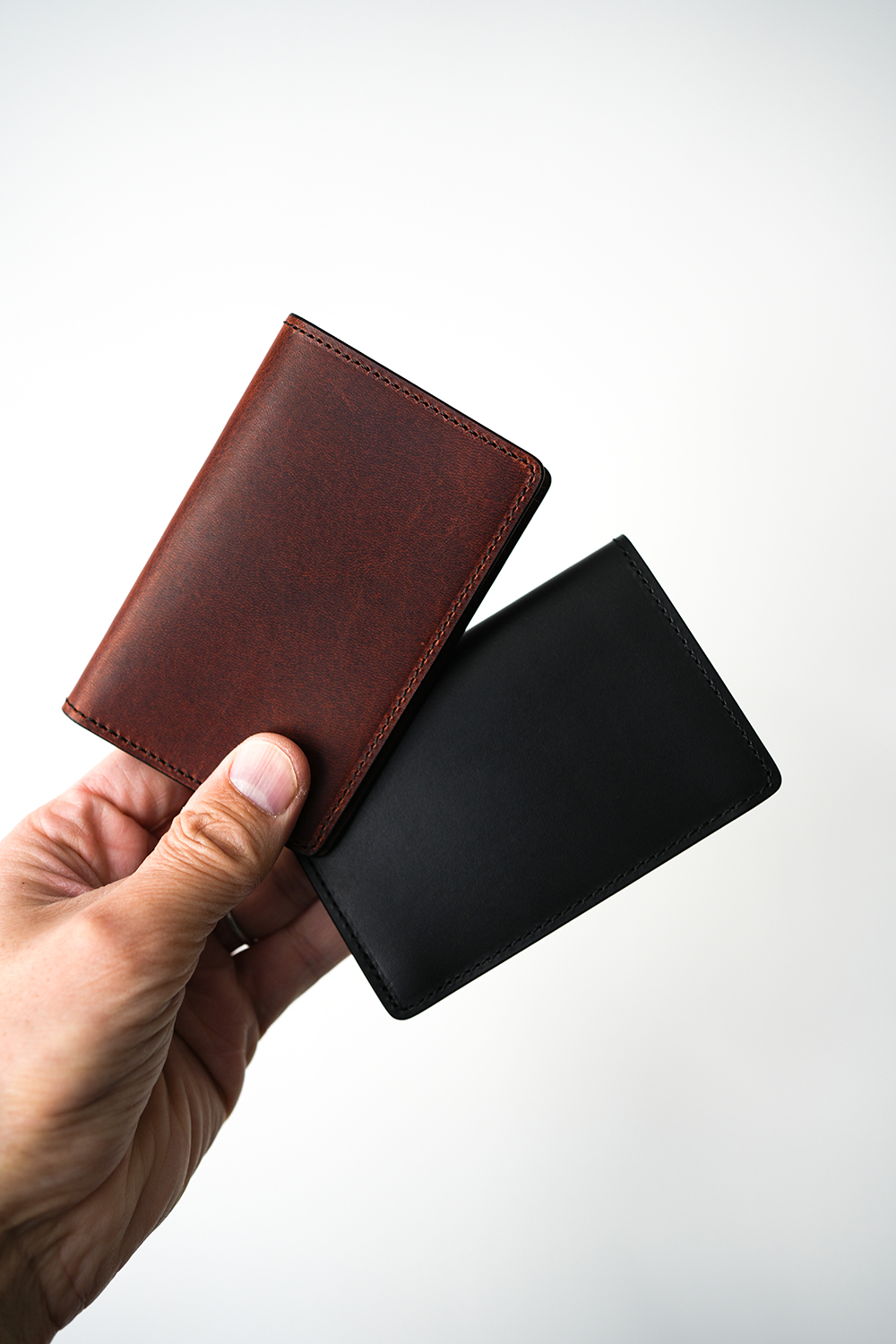 上質な牛側を用いたシンプルデザインの名刺入れ、様々な職種に似合うカードケース。HERBIE(ハービー)レザーは、1911年創業の歴史あるタンナー山陽社製のフルベジタブルタンニンレザー。同社は日露戦争後に、軍需向けの革靴やベルト等を生産していた、品質にはお墨付きのタンナーです。北米産のミモザから抽出されたタンニンを使い、じっくりと時間をかけてピット層にて鞣されたレザーで、ハリがあり軽量ながら耐久性を兼ね備えています。仕上げには蝋引きも施しており、マットでムラのある表情が自然な無骨さを出しています。使い続けるうちに艶が出てきて顕著な経年変化が味わえます。カードポケット1ケ、フリーポケット1ケ。