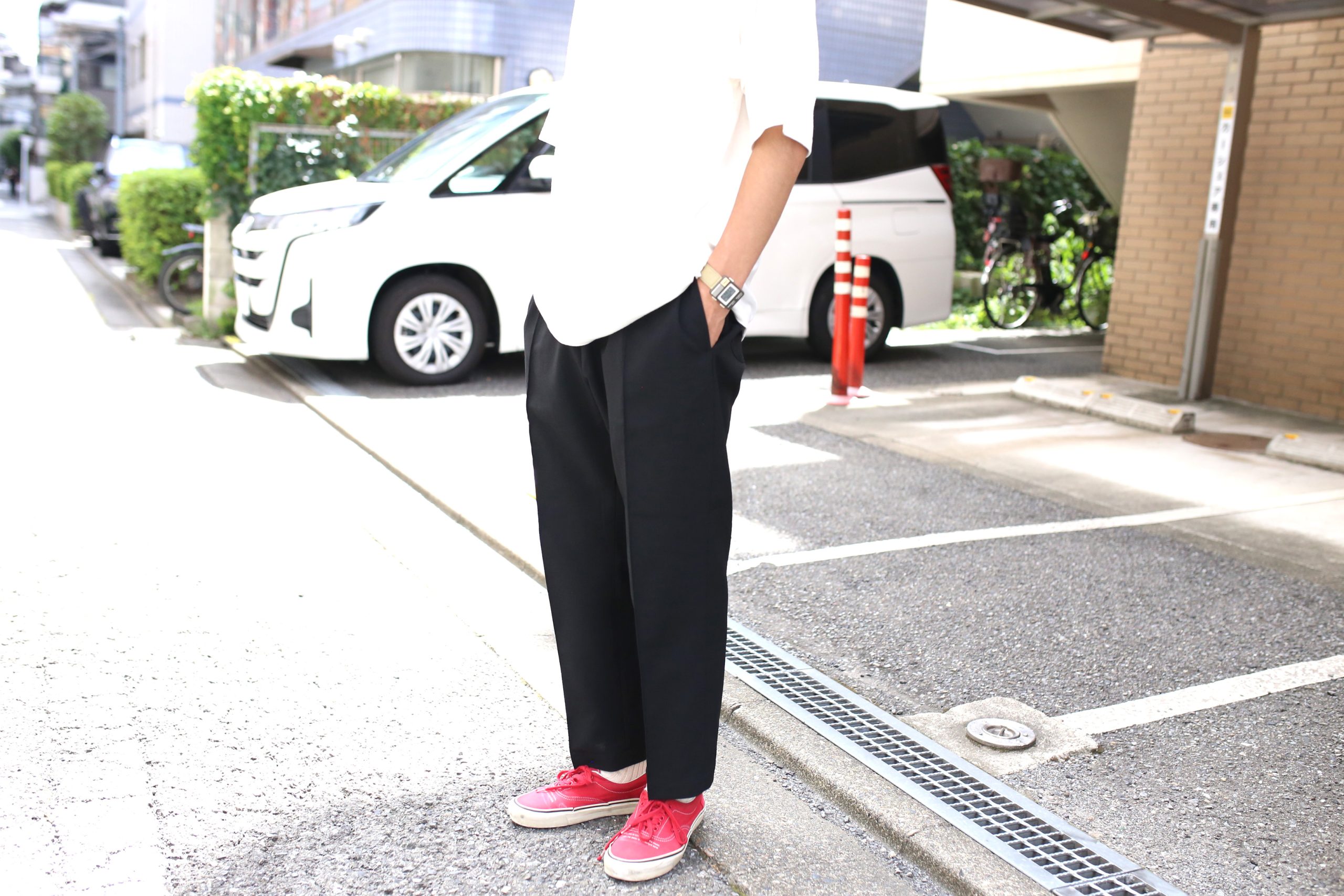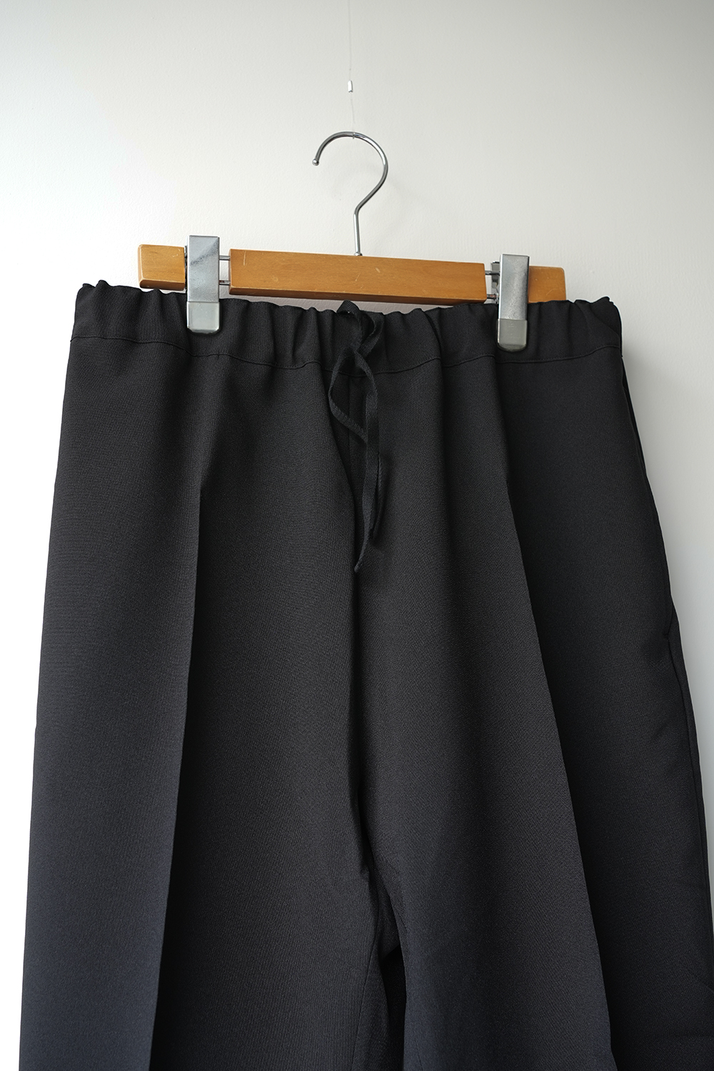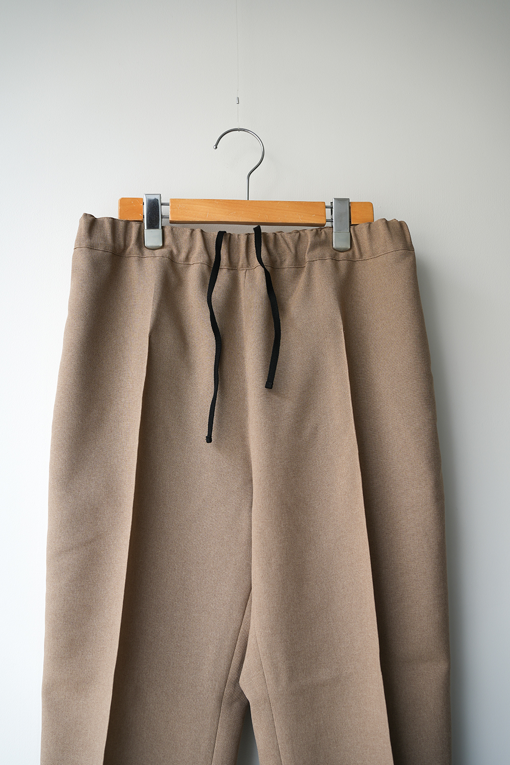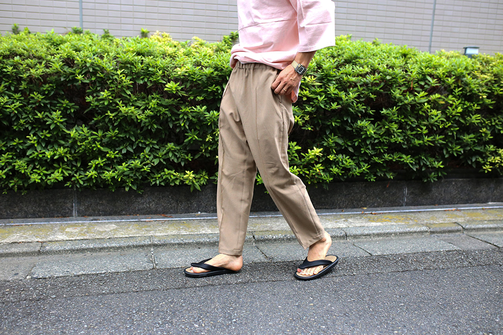 ポリエステル生地、ウェストイージー仕様のスラックスデザイン。前後のセンタープリーツ、ややゆとりのあるストレート。春夏秋に活躍する3シーズンパンツ。