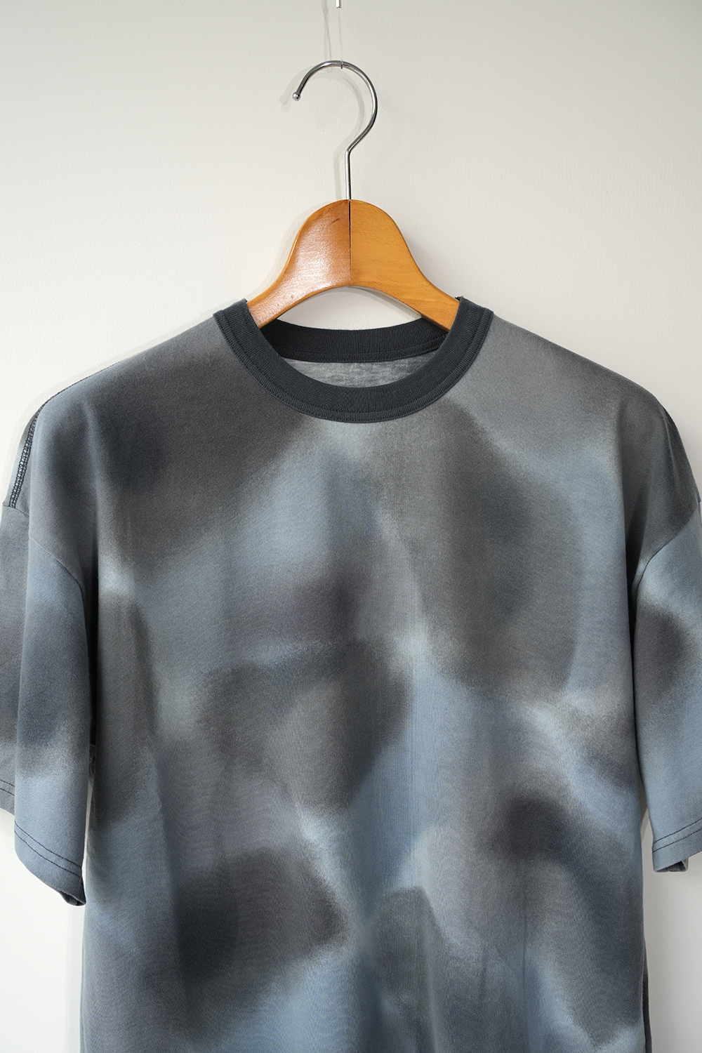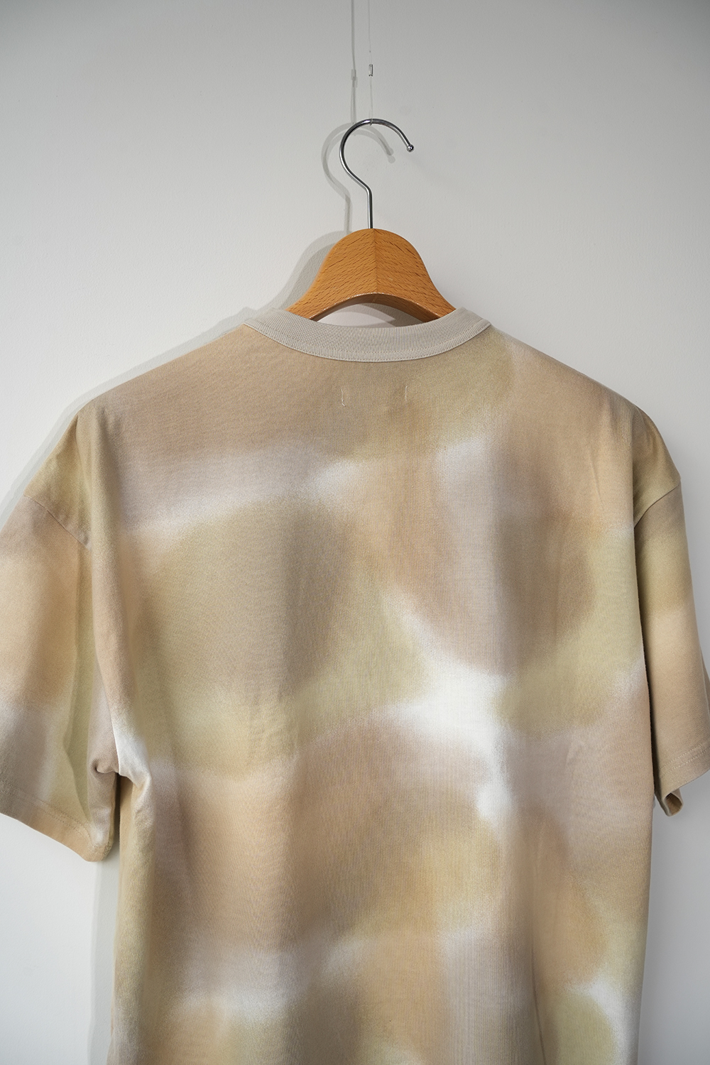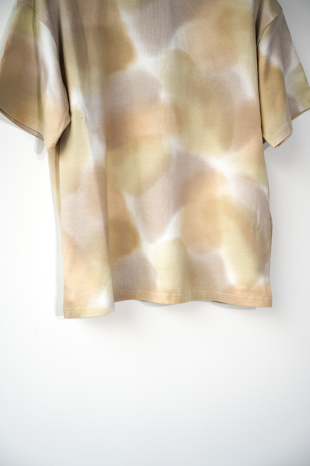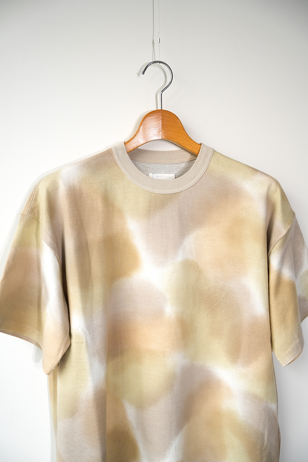 OVER PRINTING JERSEY。6色のシルク版を放射状に配置し、何層にも重なっているかのような奥行きのある表情を生み出した、特徴的なプリント。このプリントは、職人の手作業によって一層一層丁寧に重ねられ、仕上げられています。使用している生地は、和歌山県で編み立てた膨らみのあるコットンジャージー。米綿をブレンドした40番双糸を用い、柔らかくしなやかな風合いに仕上げています。さらに、生地の状態で洗い加工を施すことで、空気を含んだようなエアリーなふくらみと、清涼感のある心地よい肌触りが生まれています。