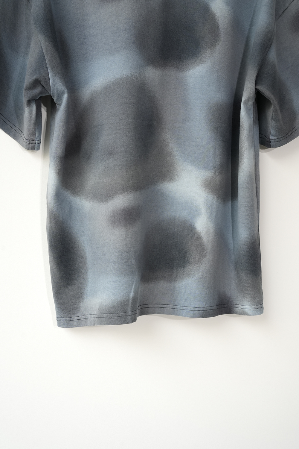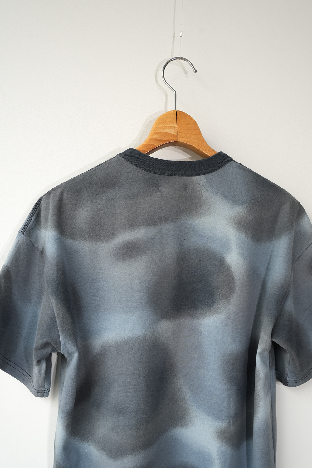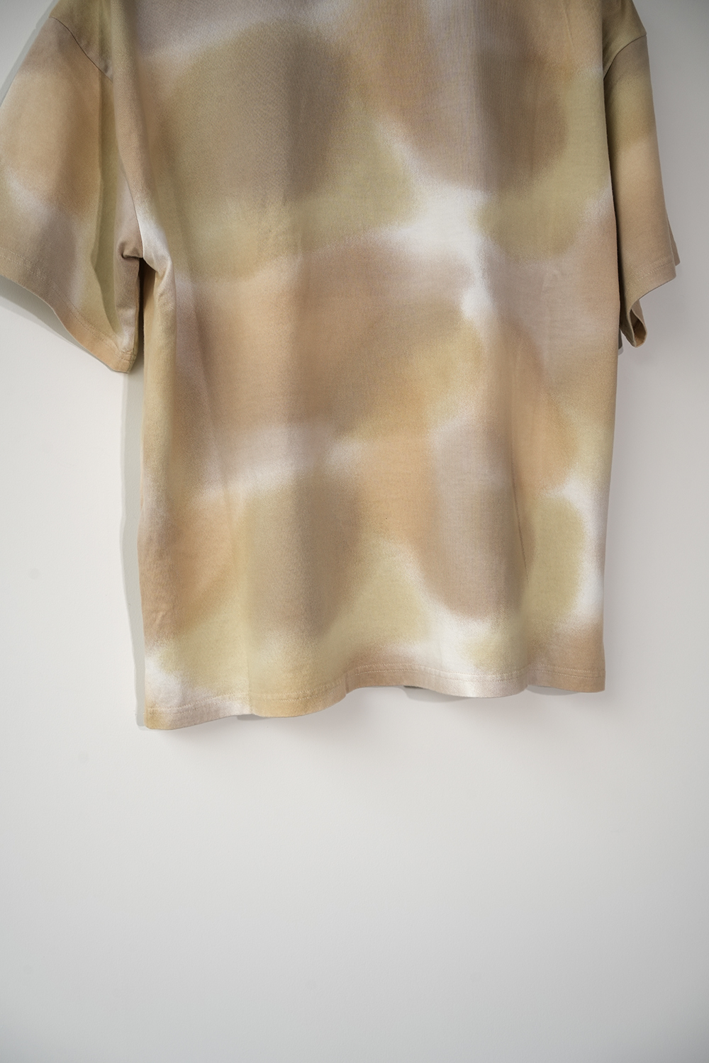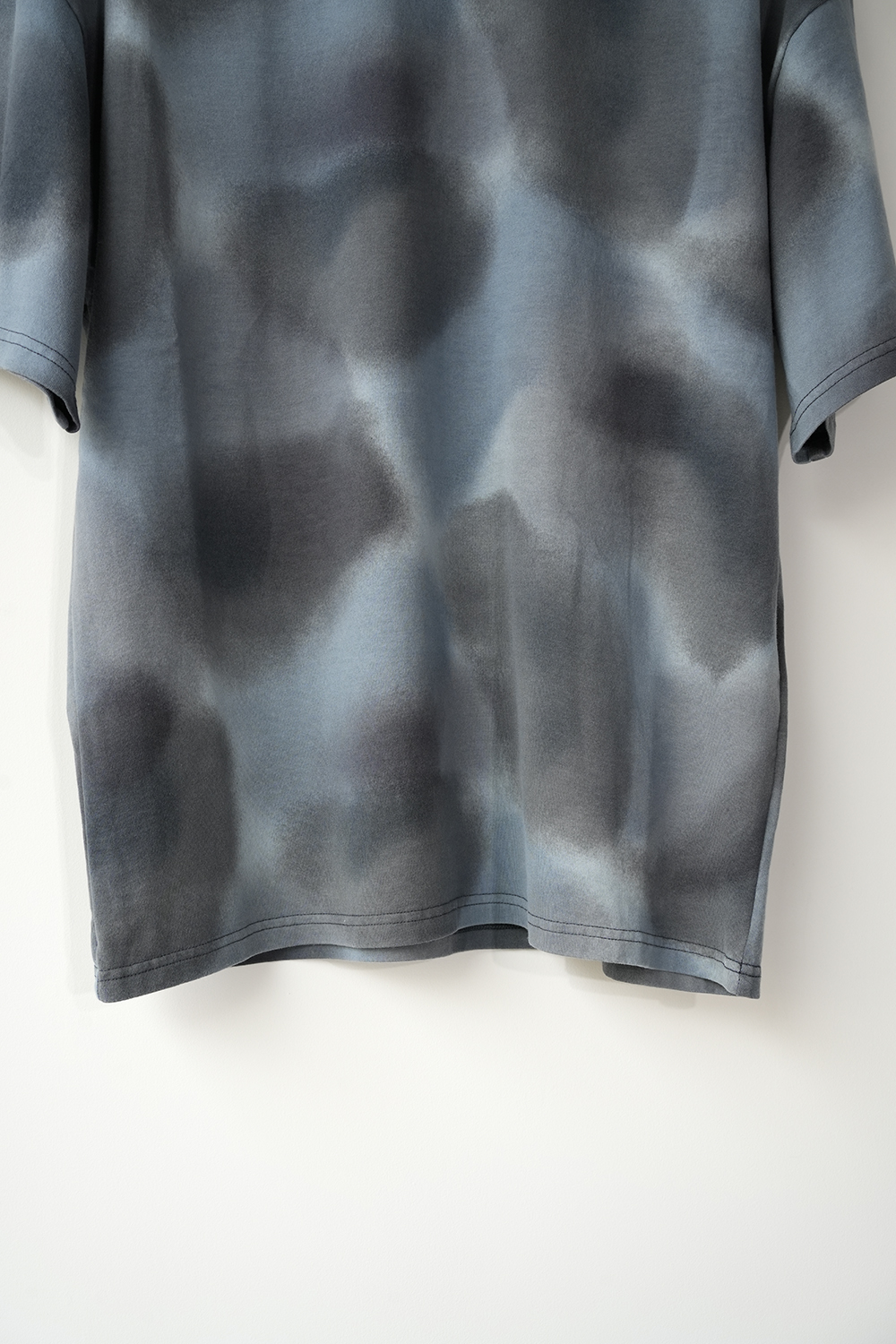 OVER PRINTING JERSEY。6色のシルク版を放射状に配置し、何層にも重なっているかのような奥行きのある表情を生み出した、特徴的なプリント。このプリントは、職人の手作業によって一層一層丁寧に重ねられ、仕上げられています。使用している生地は、和歌山県で編み立てた膨らみのあるコットンジャージー。米綿をブレンドした40番双糸を用い、柔らかくしなやかな風合いに仕上げています。さらに、生地の状態で洗い加工を施すことで、空気を含んだようなエアリーなふくらみと、清涼感のある心地よい肌触りが生まれています。