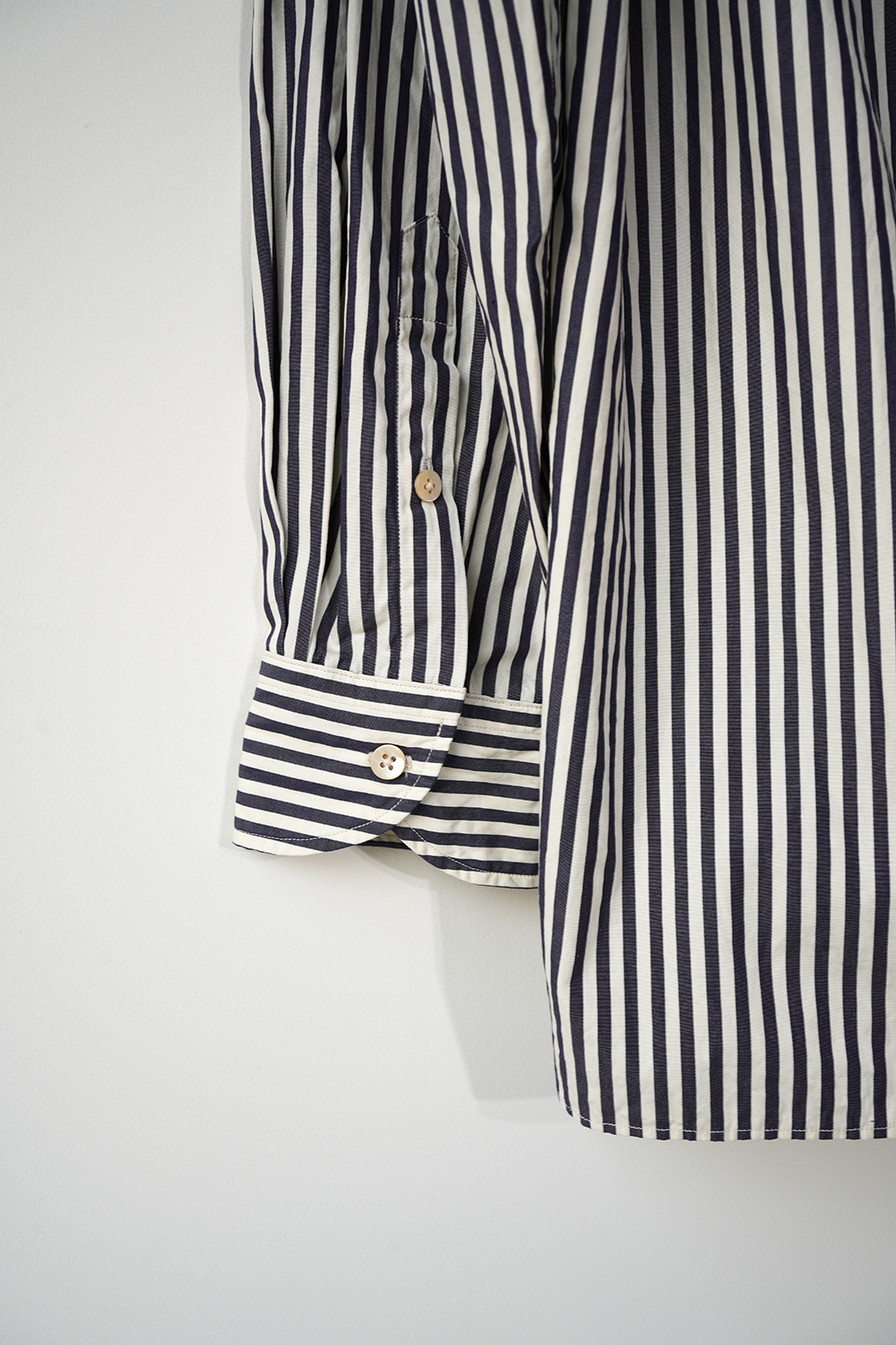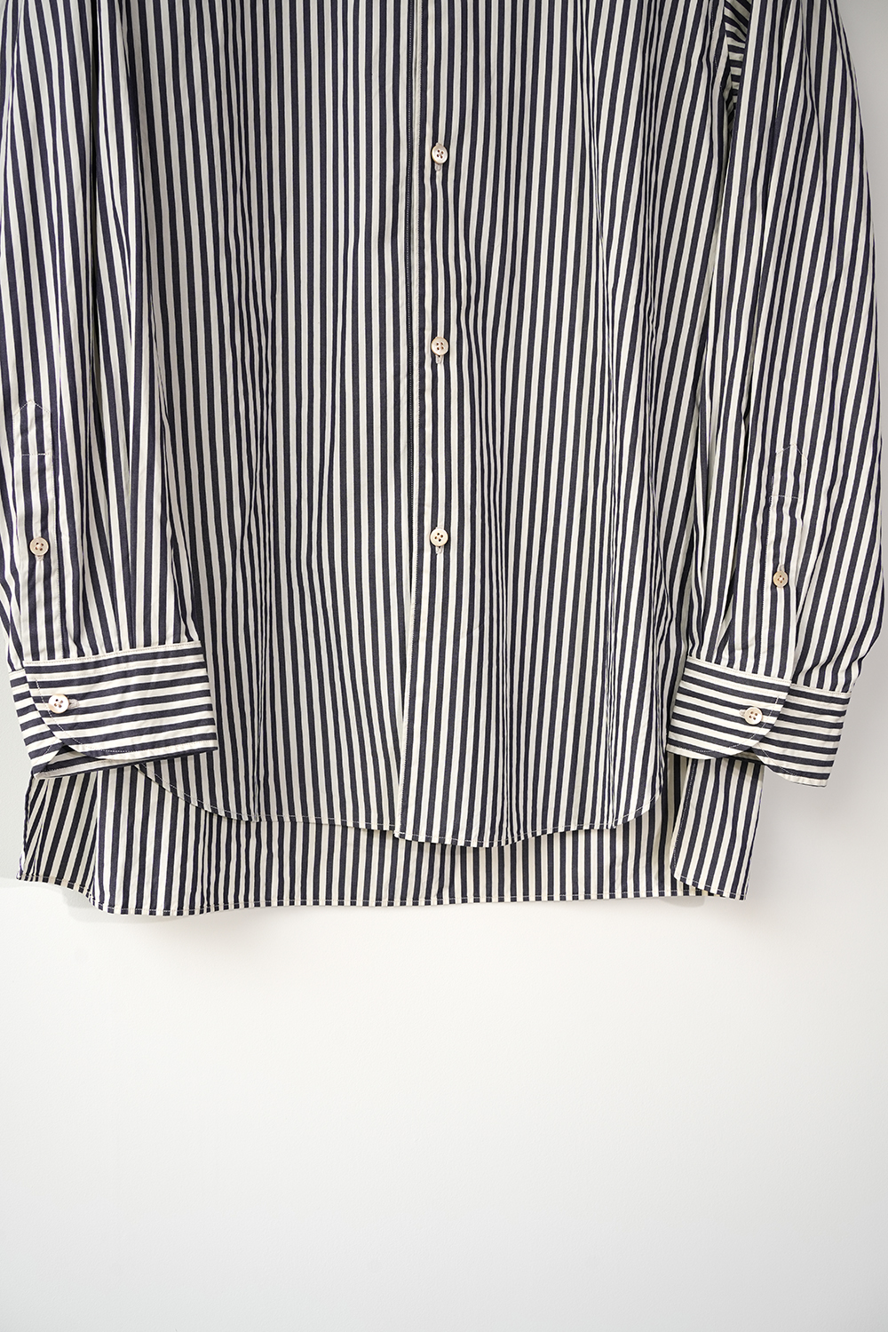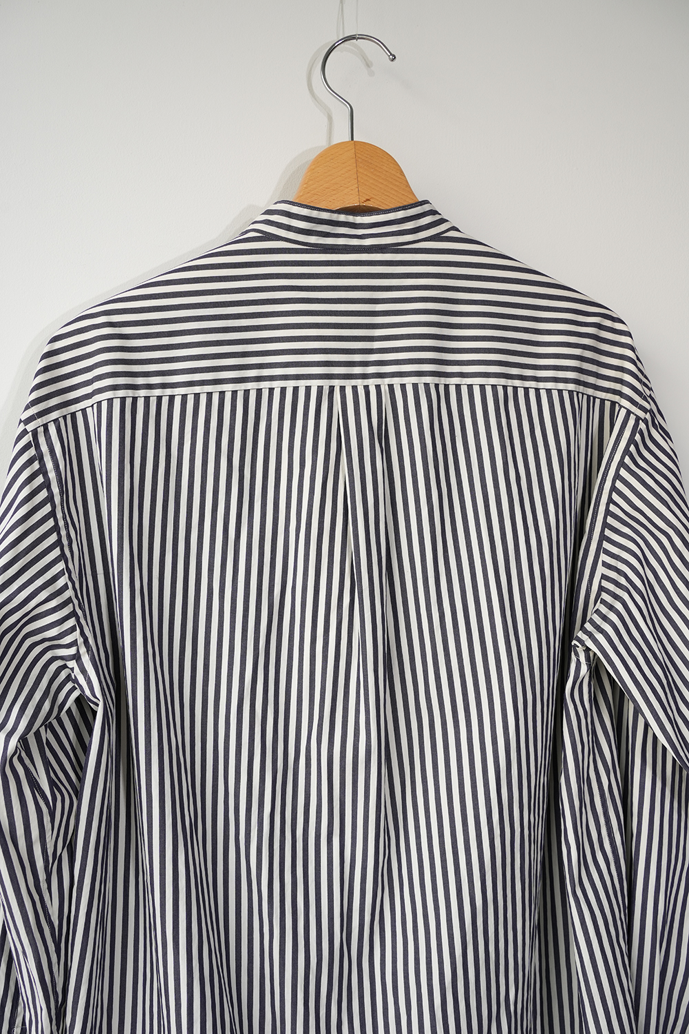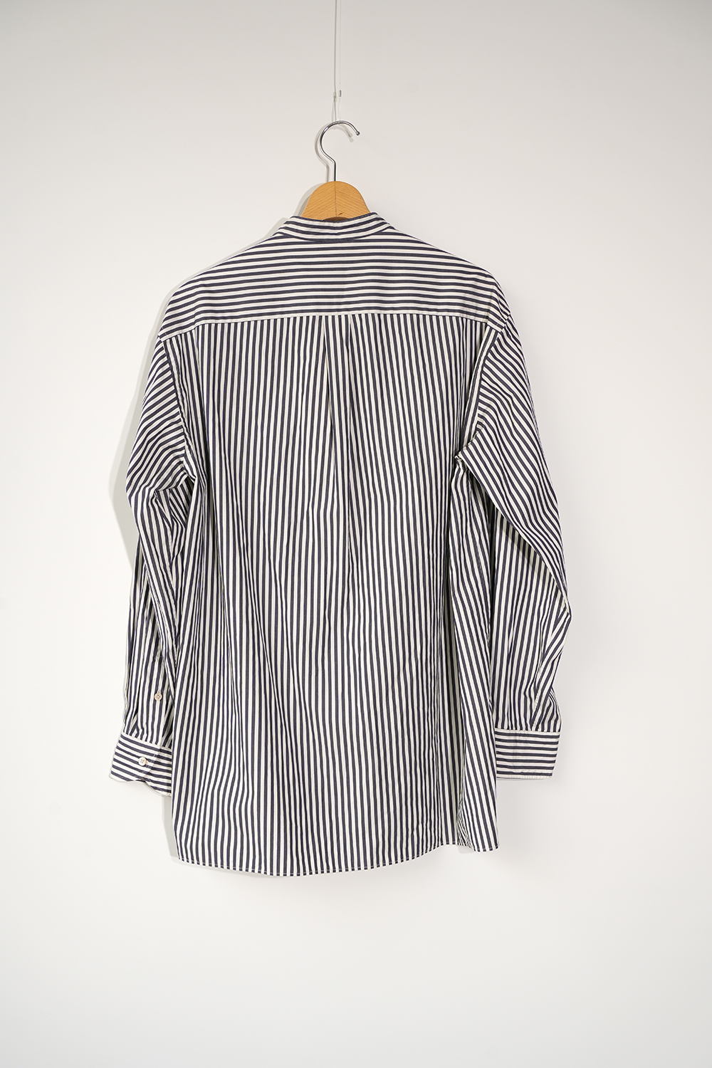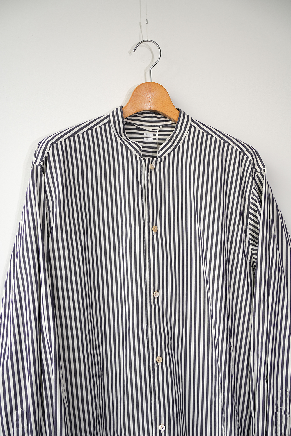 やや着丈の長いスタンドカラーシャツ。