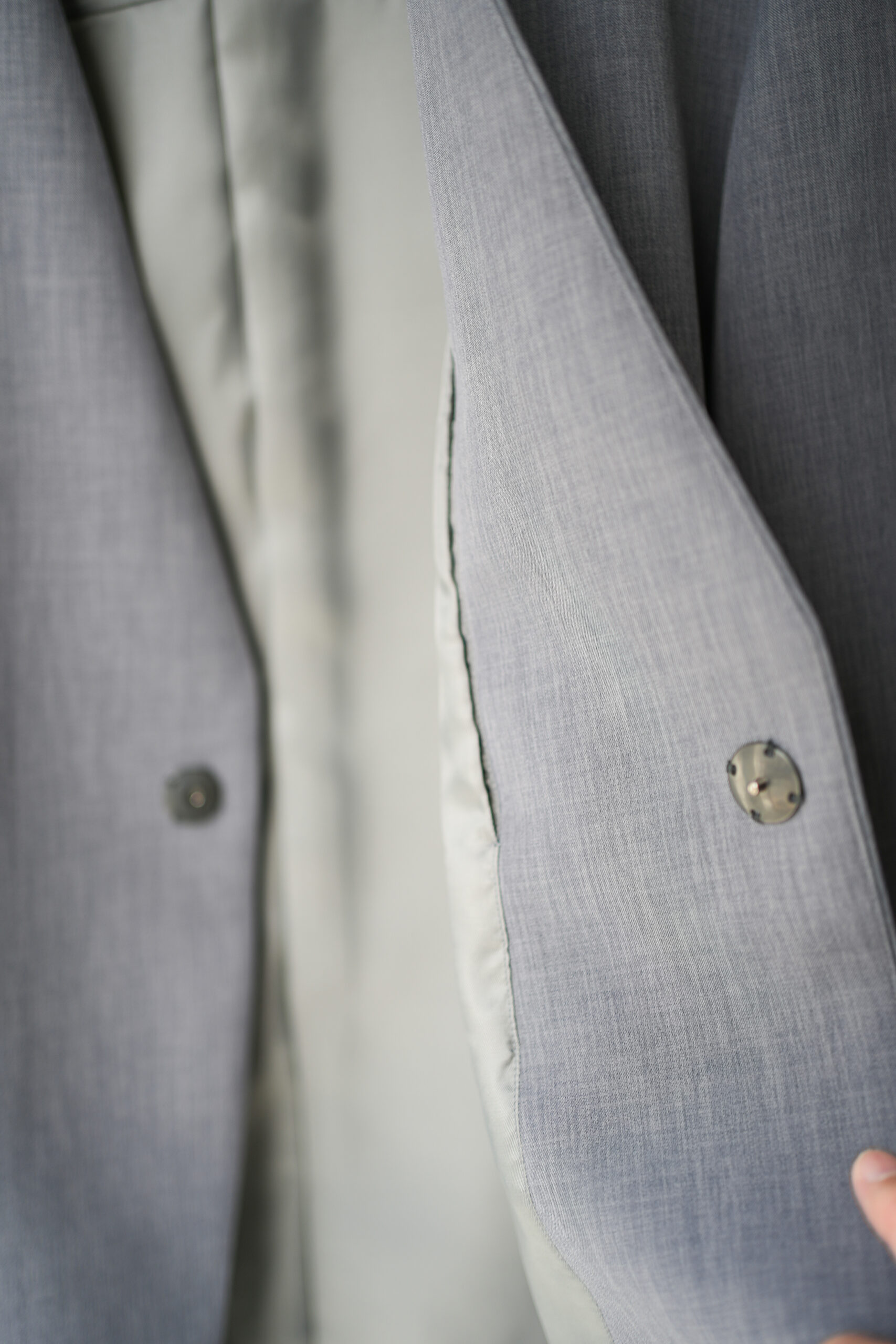 ムラ感のあるドライタッチのポリエステル糸の二重織生地。とてもしっかりした厚みとハリがあり皺になりにくく、ピリングも出にくい扱いやすい素材。ノーカラージャケット、肩ジャスト、脇にシームポケット、総裏仕立て。