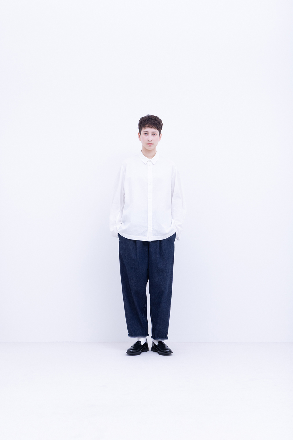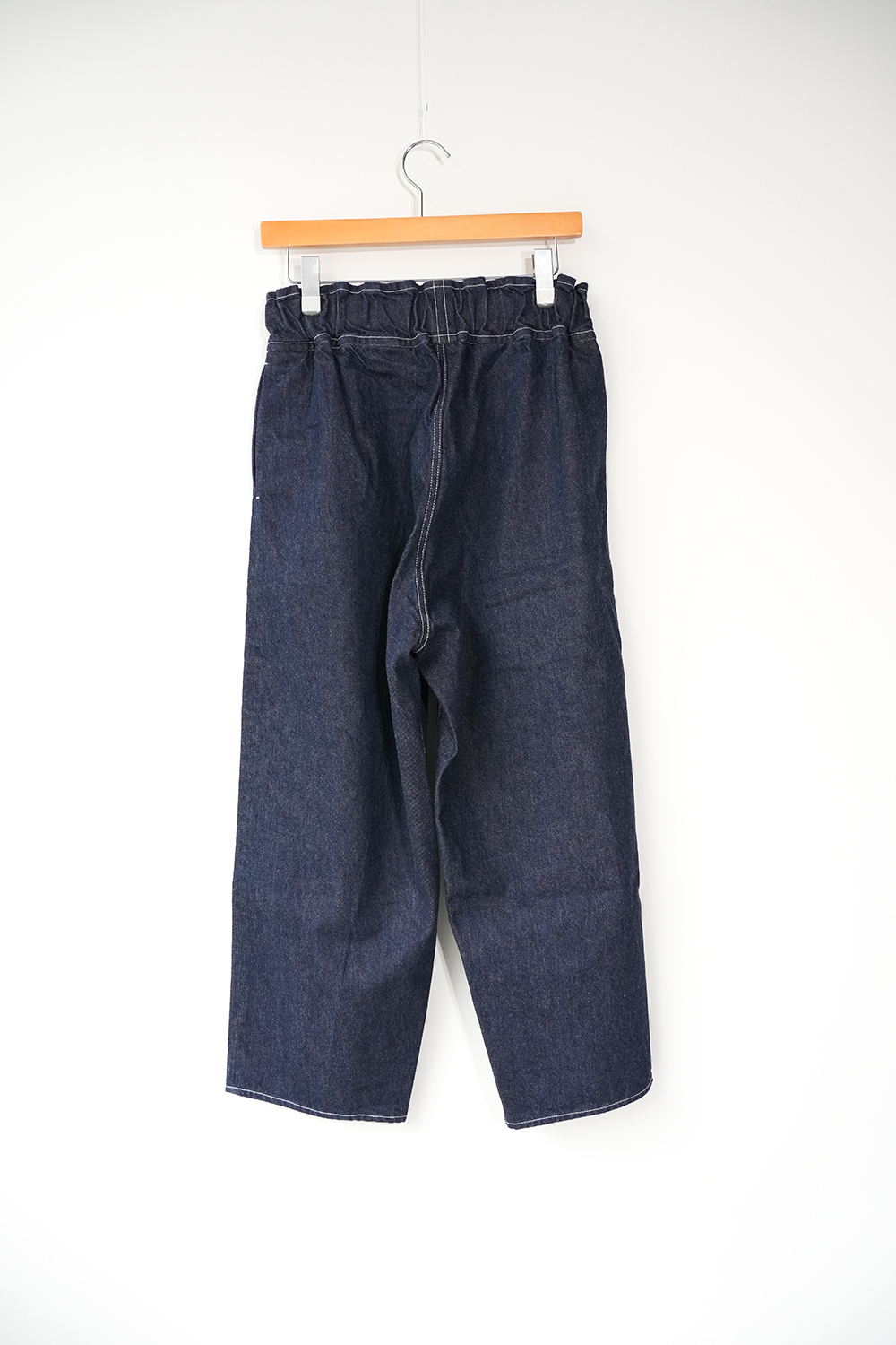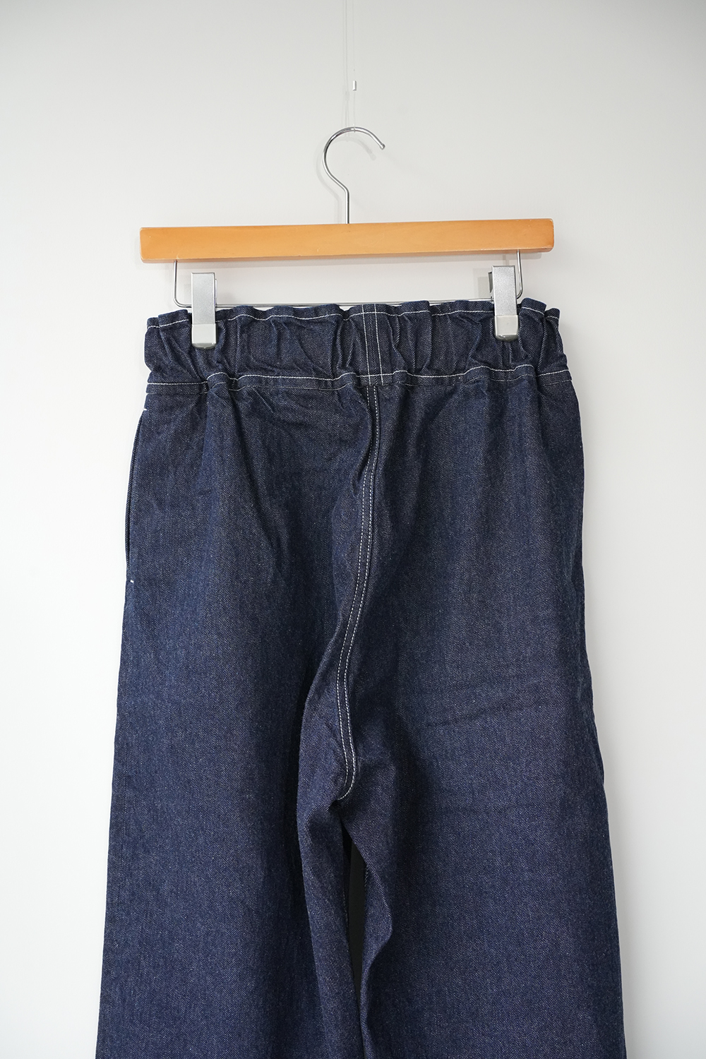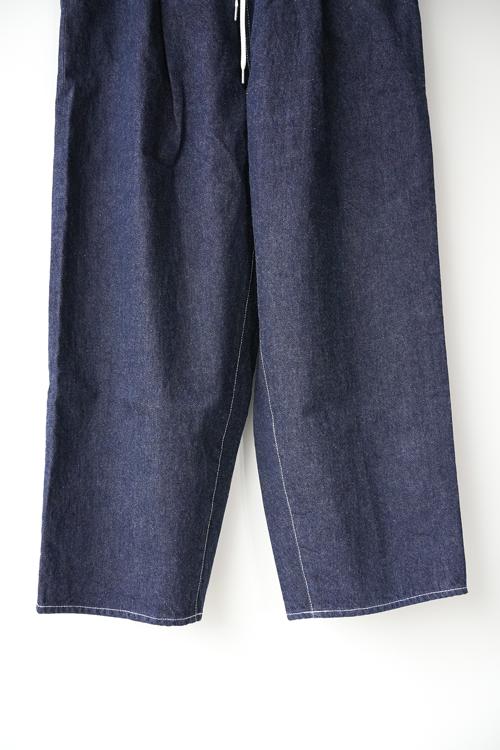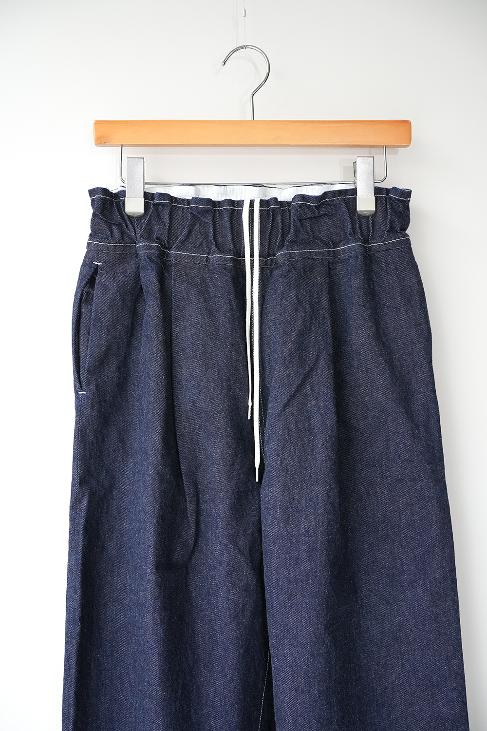シャトル織機で織ったセルビッチインディゴデニム、なんて事のない気軽に穿けるデニム生地を目指して作った生地なので”コモン=一般的な”と名付けられた。織りによる自然な伸縮性と柔らかな仕上げで穿き心地良し、ワイドテーパードシルエット、9.5分丈、ウェストゴムと紐仕様。