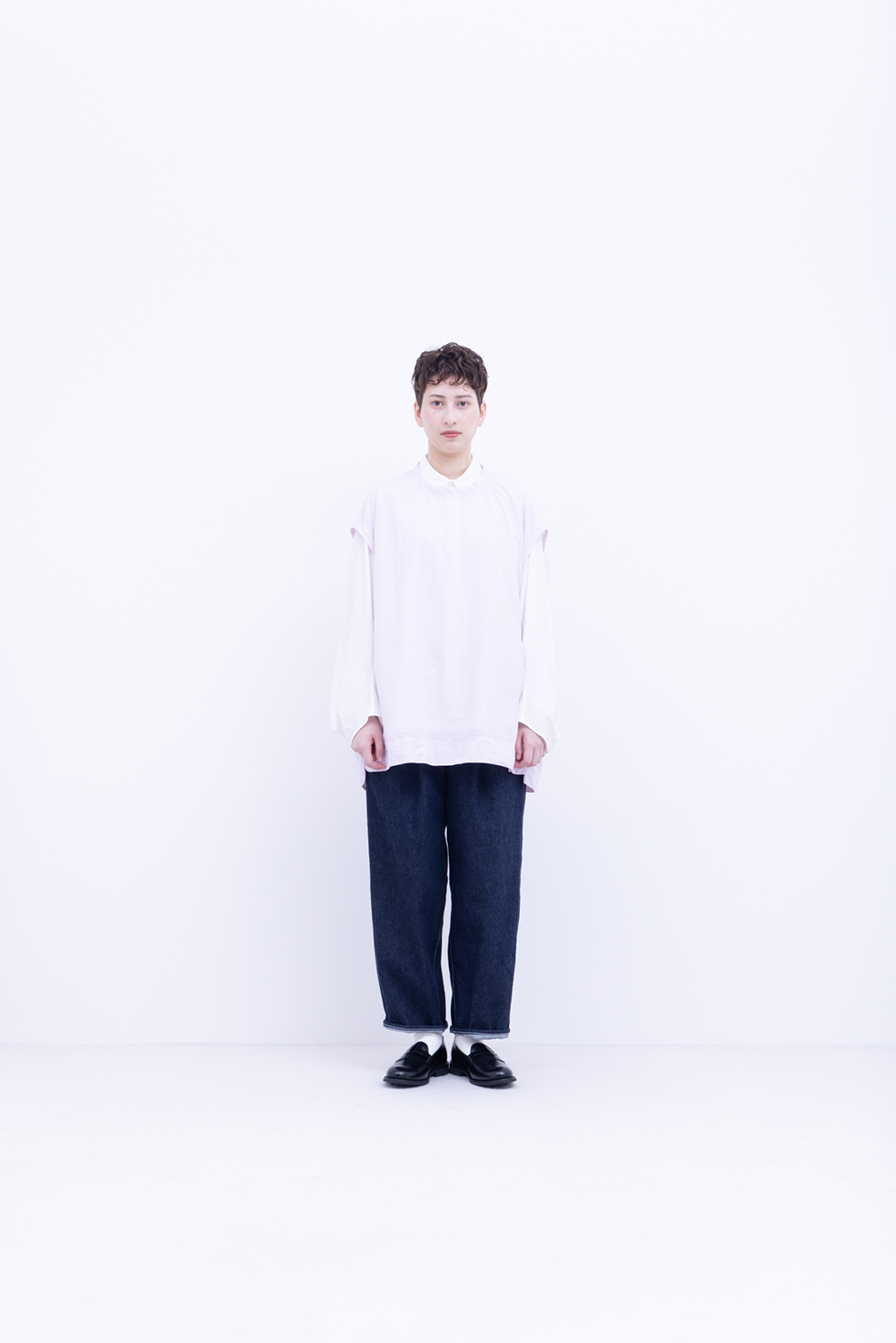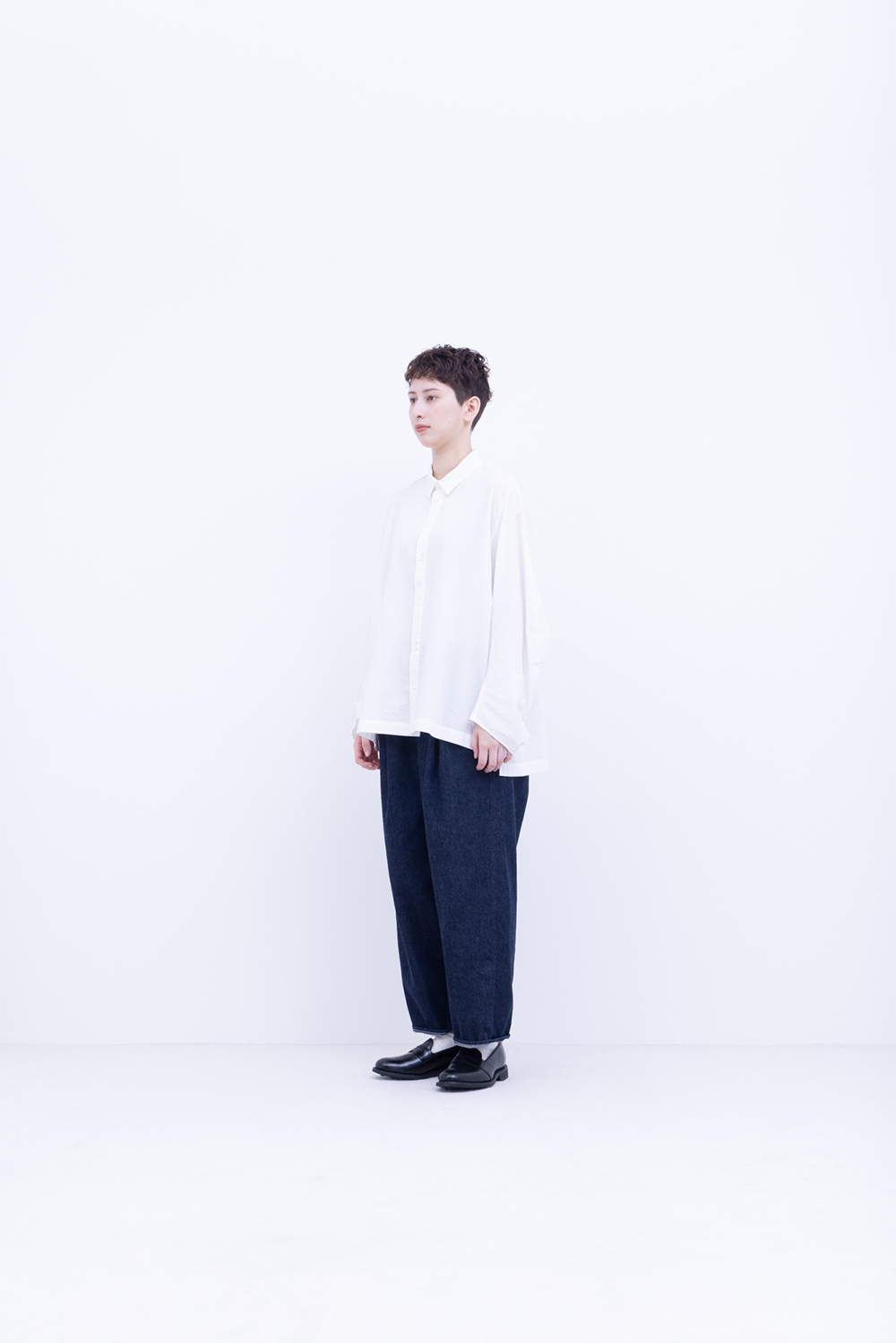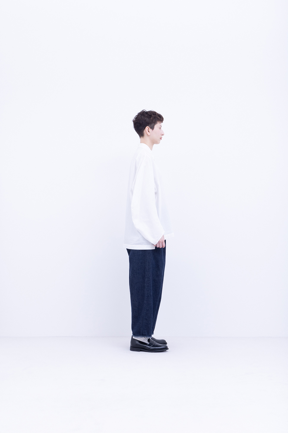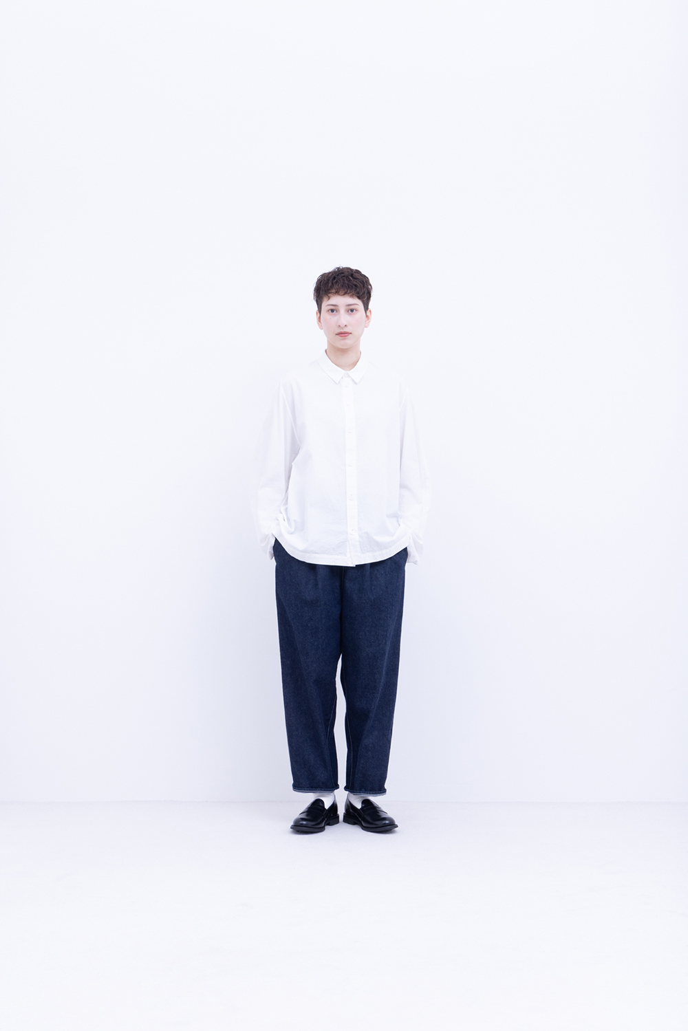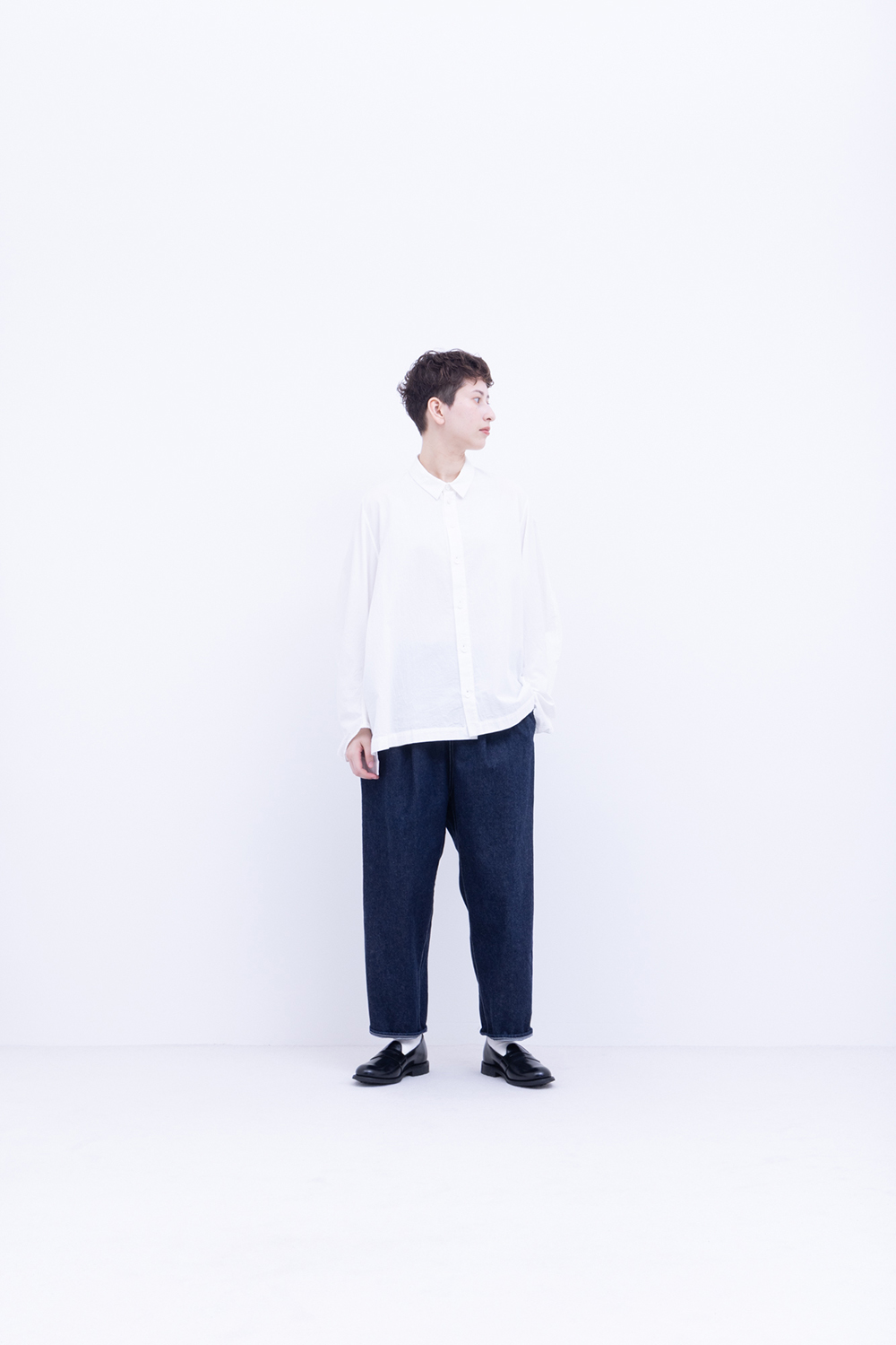 シャトル織機で織ったセルビッチインディゴデニム、なんて事のない気軽に穿けるデニム生地を目指して作った生地なので”コモン=一般的な”と名付けられた。織りによる自然な伸縮性と柔らかな仕上げで穿き心地良し、ワイドテーパードシルエット、9.5分丈、ウェストゴムと紐仕様。
