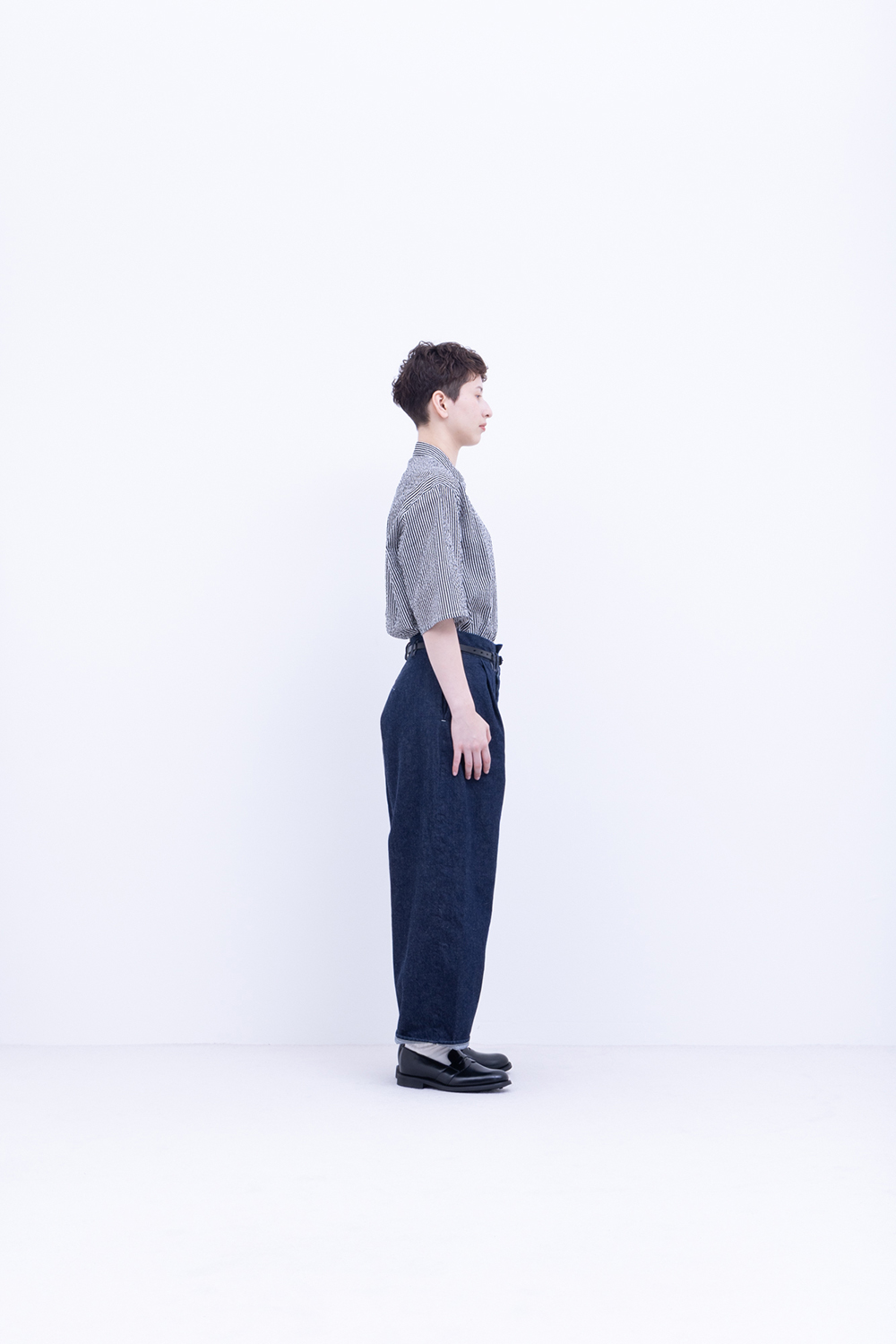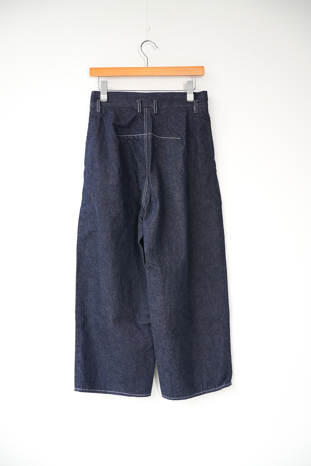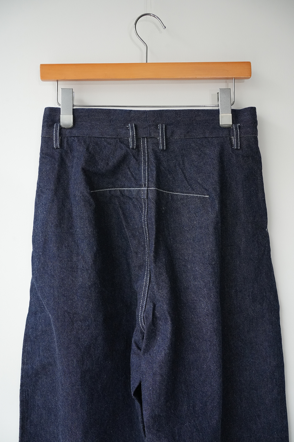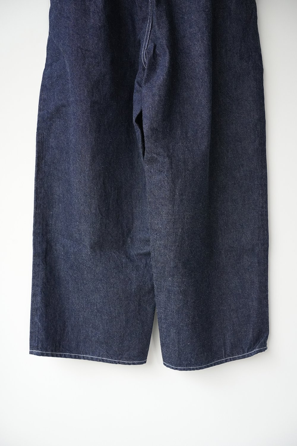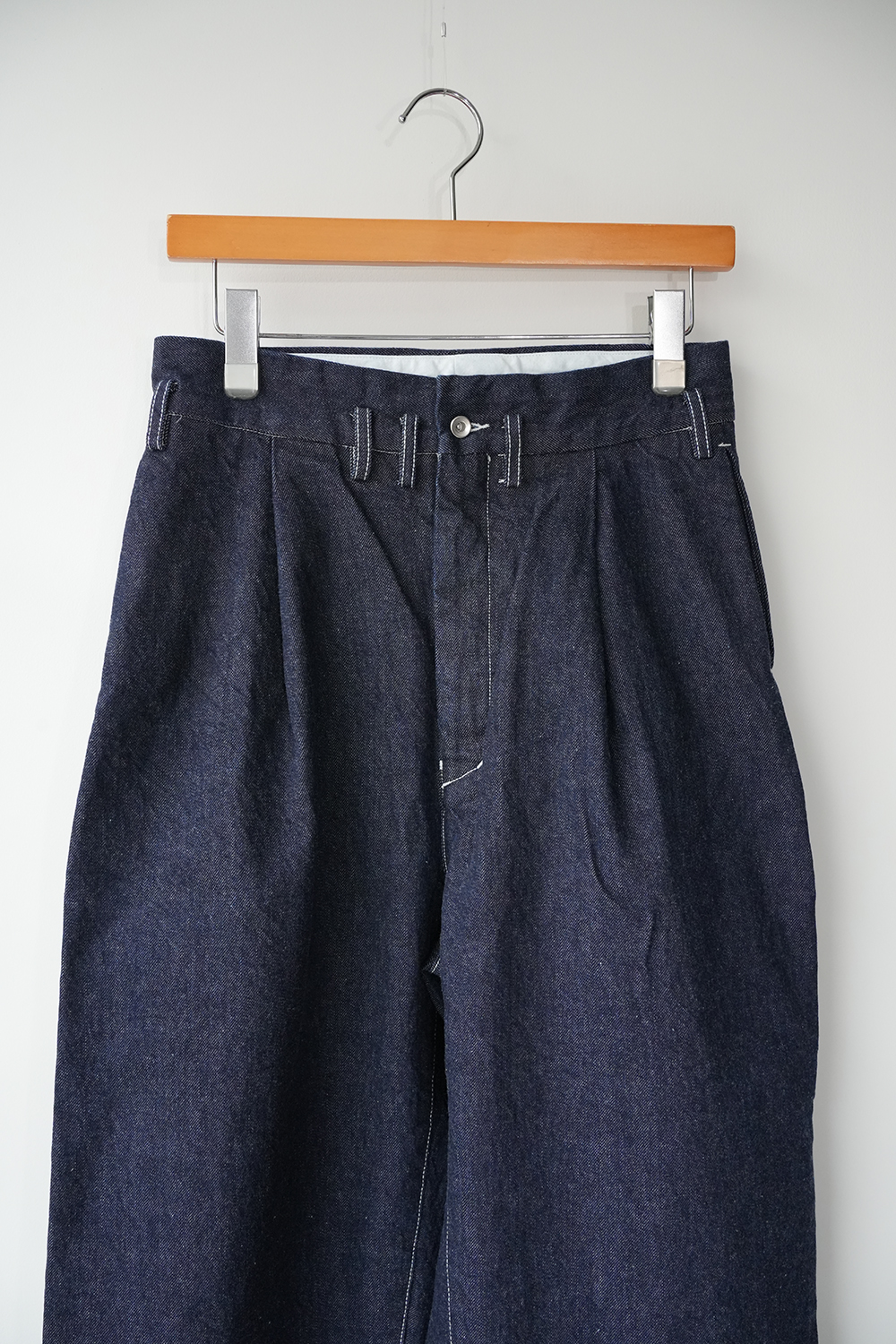 シャトル織機で織ったセルビッチインディゴデニム、なんて事のない気軽に穿けるデニム生地を目指して作った生地なので”コモン=一般的な”と名付けられた。織りによる自然な伸縮性と柔らかな仕上げで穿き心地良し、ワイドストレートシルエット、1タック、フルレングス。