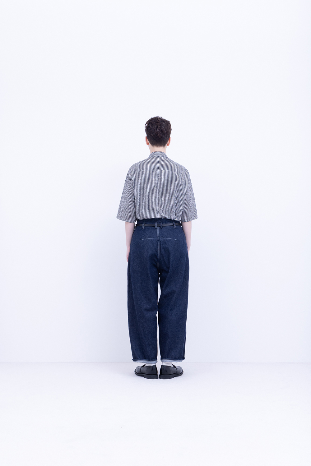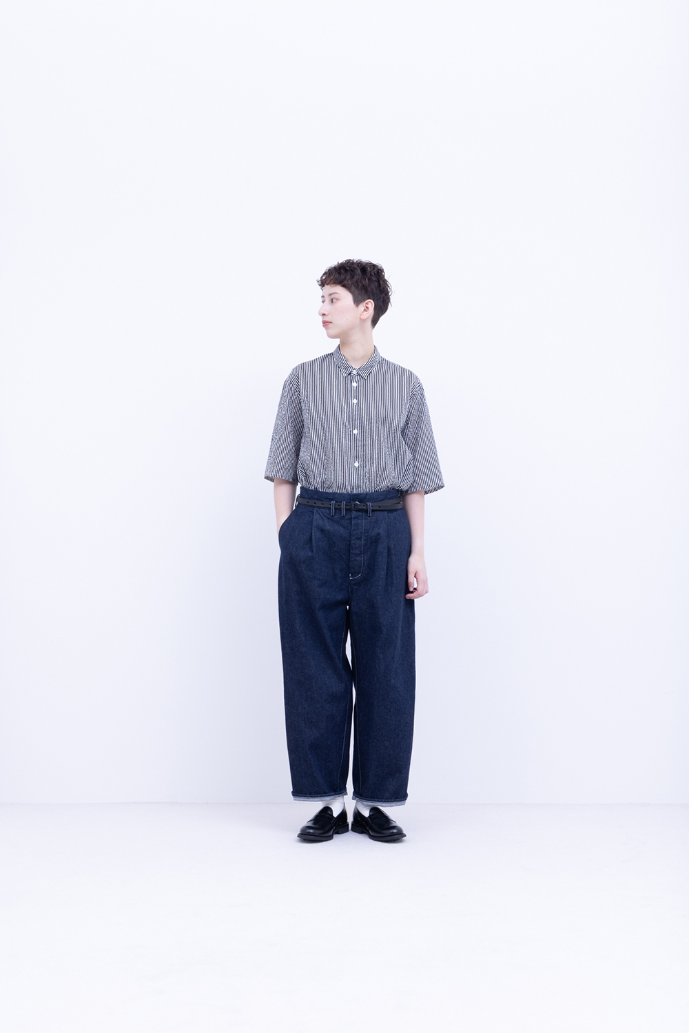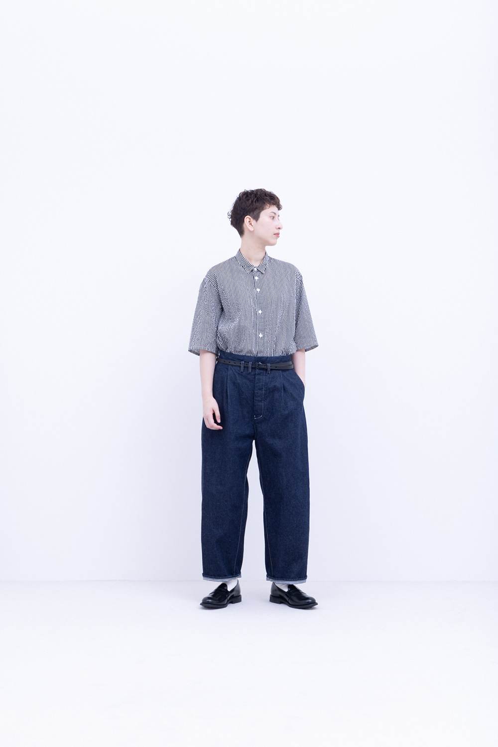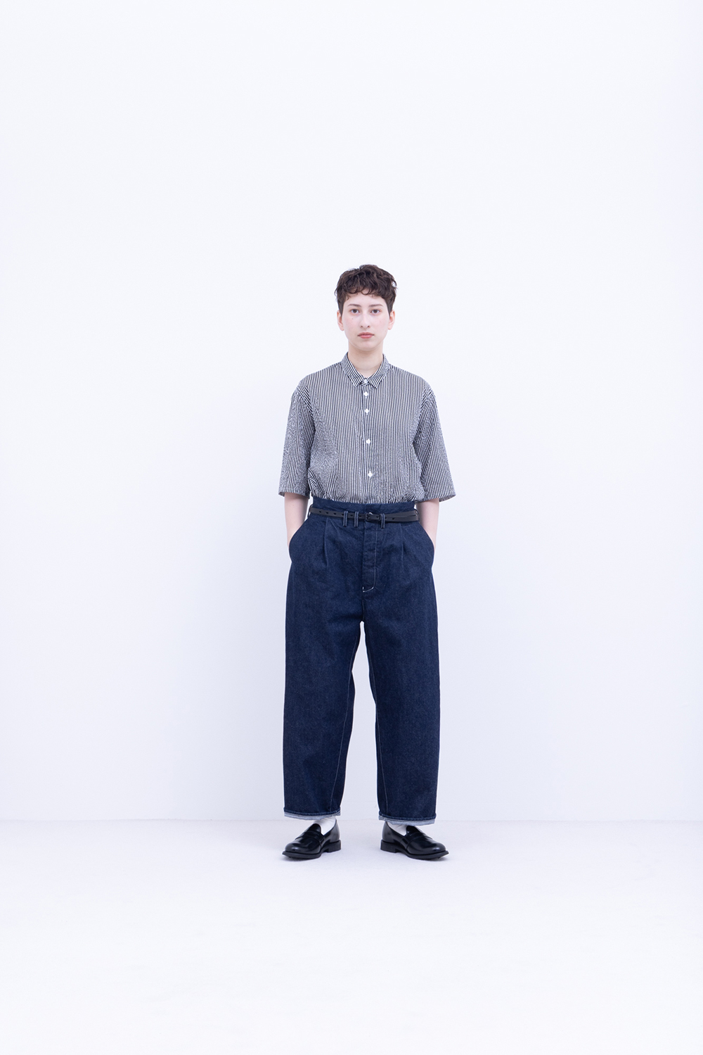 シャトル織機で織ったセルビッチインディゴデニム、なんて事のない気軽に穿けるデニム生地を目指して作った生地なので”コモン=一般的な”と名付けられた。織りによる自然な伸縮性と柔らかな仕上げで穿き心地良し、ワイドストレートシルエット、1タック、フルレングス。