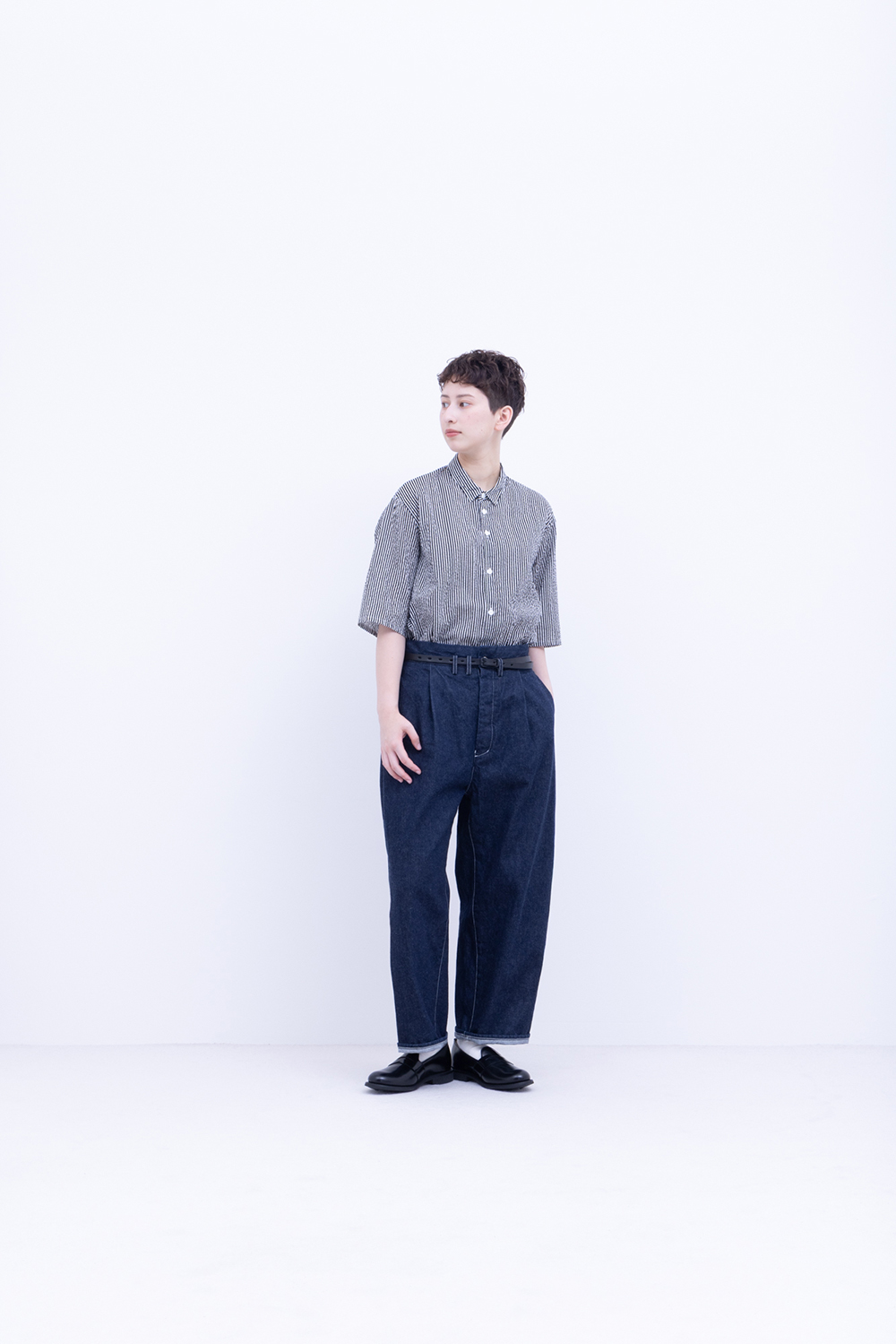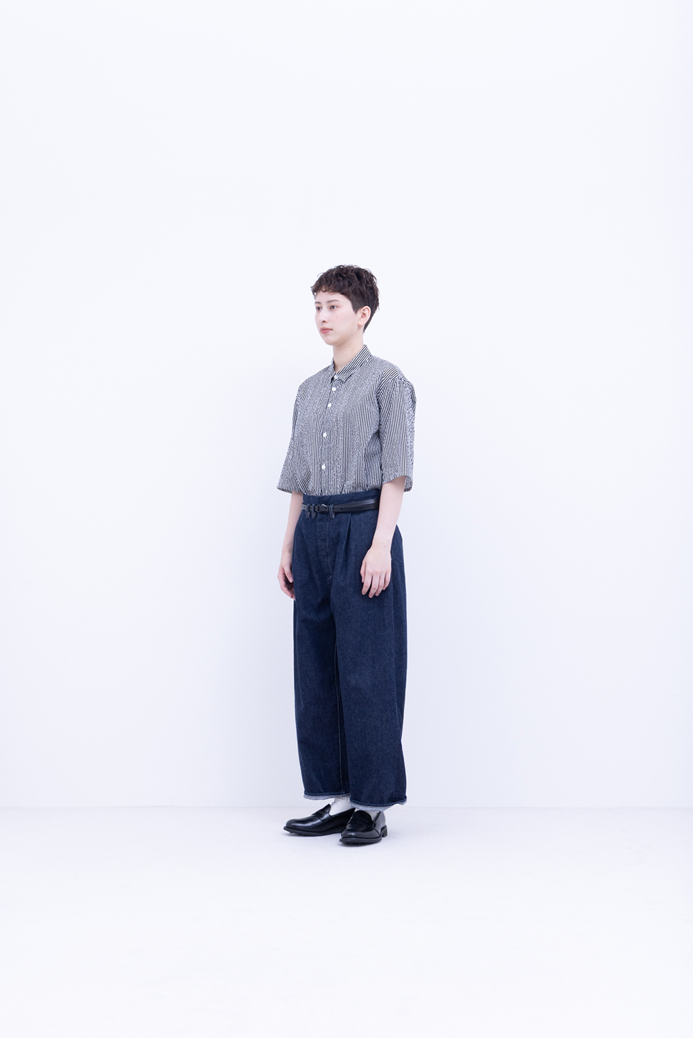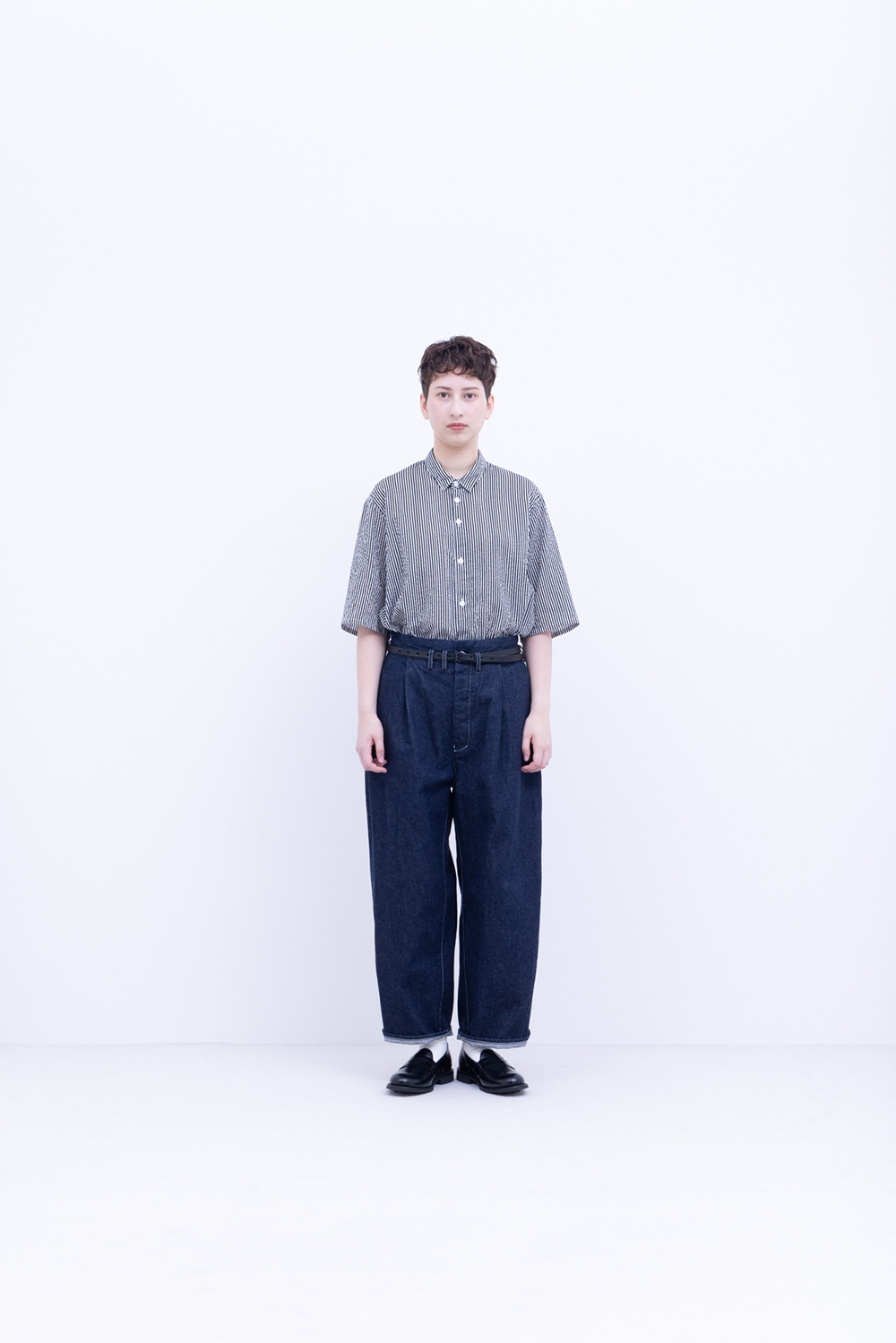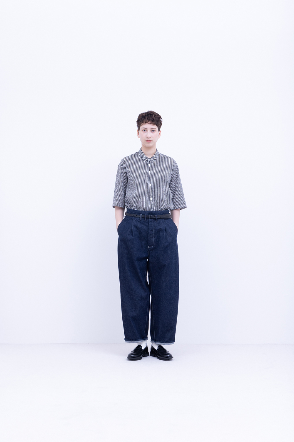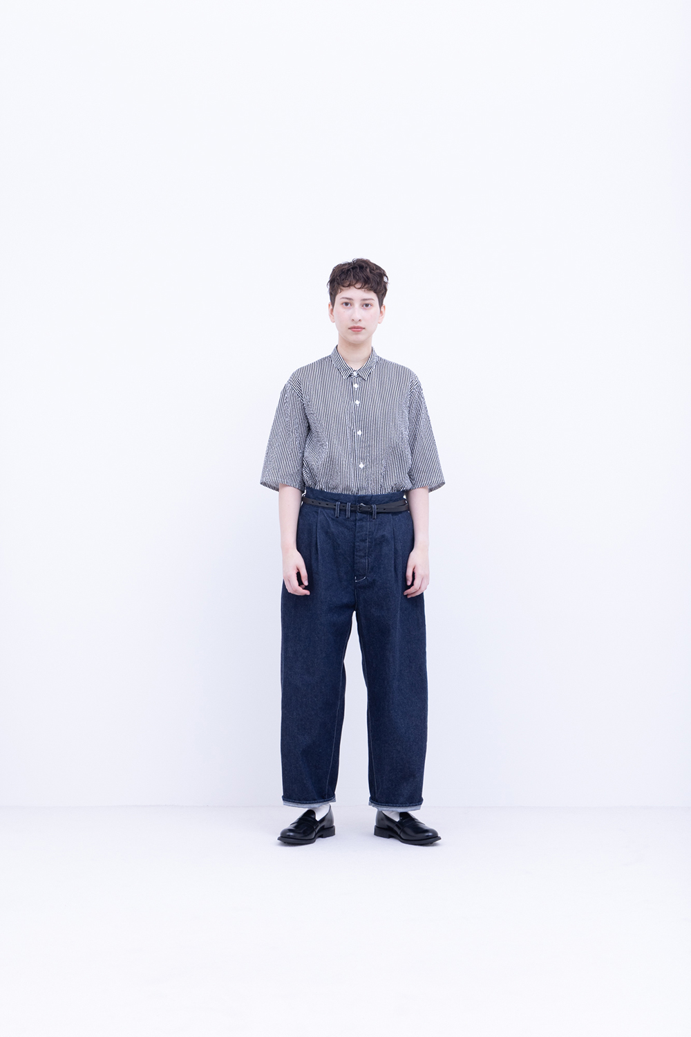 シャトル織機で織ったセルビッチインディゴデニム、なんて事のない気軽に穿けるデニム生地を目指して作った生地なので”コモン=一般的な”と名付けられた。織りによる自然な伸縮性と柔らかな仕上げで穿き心地良し、ワイドストレートシルエット、1タック、フルレングス。