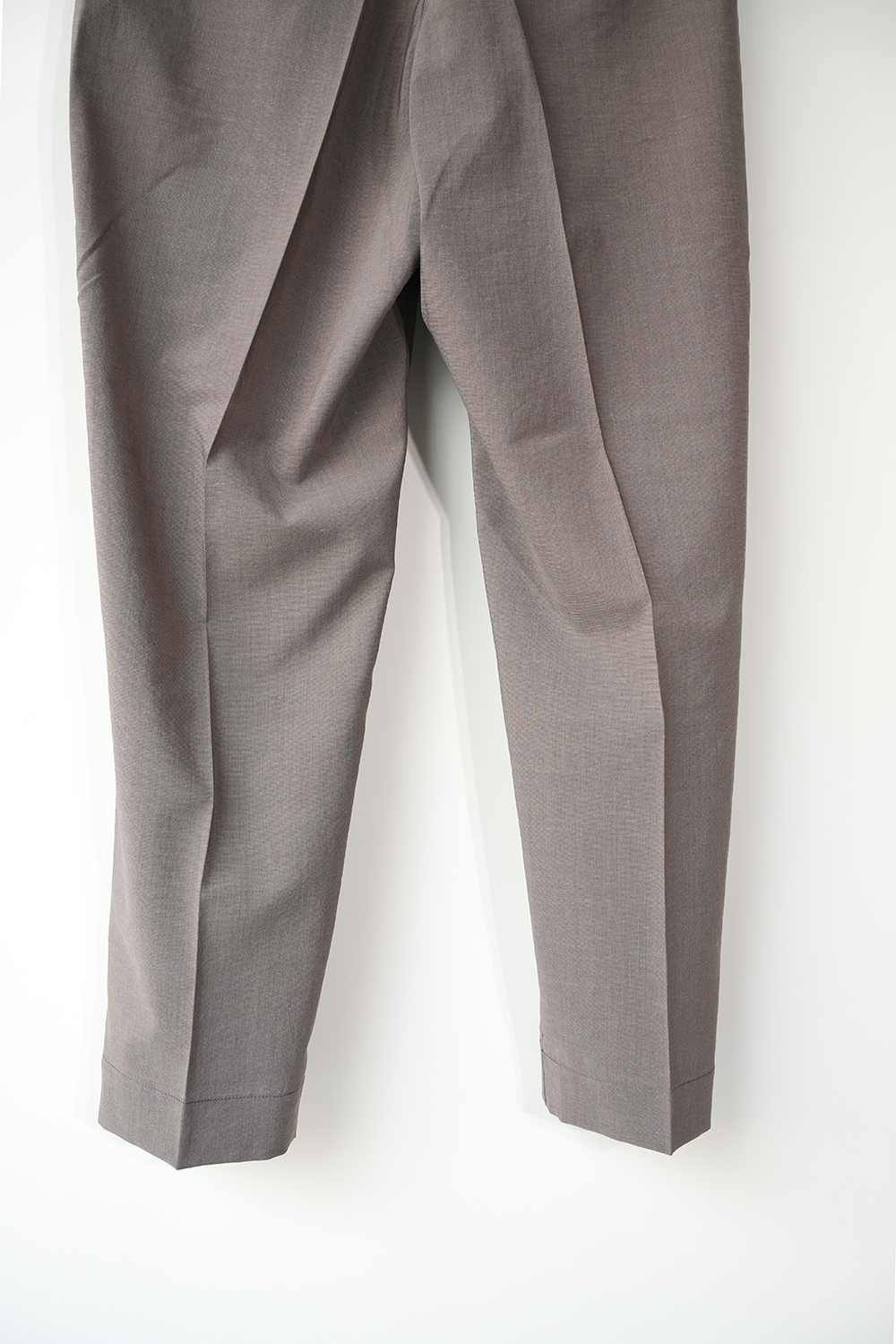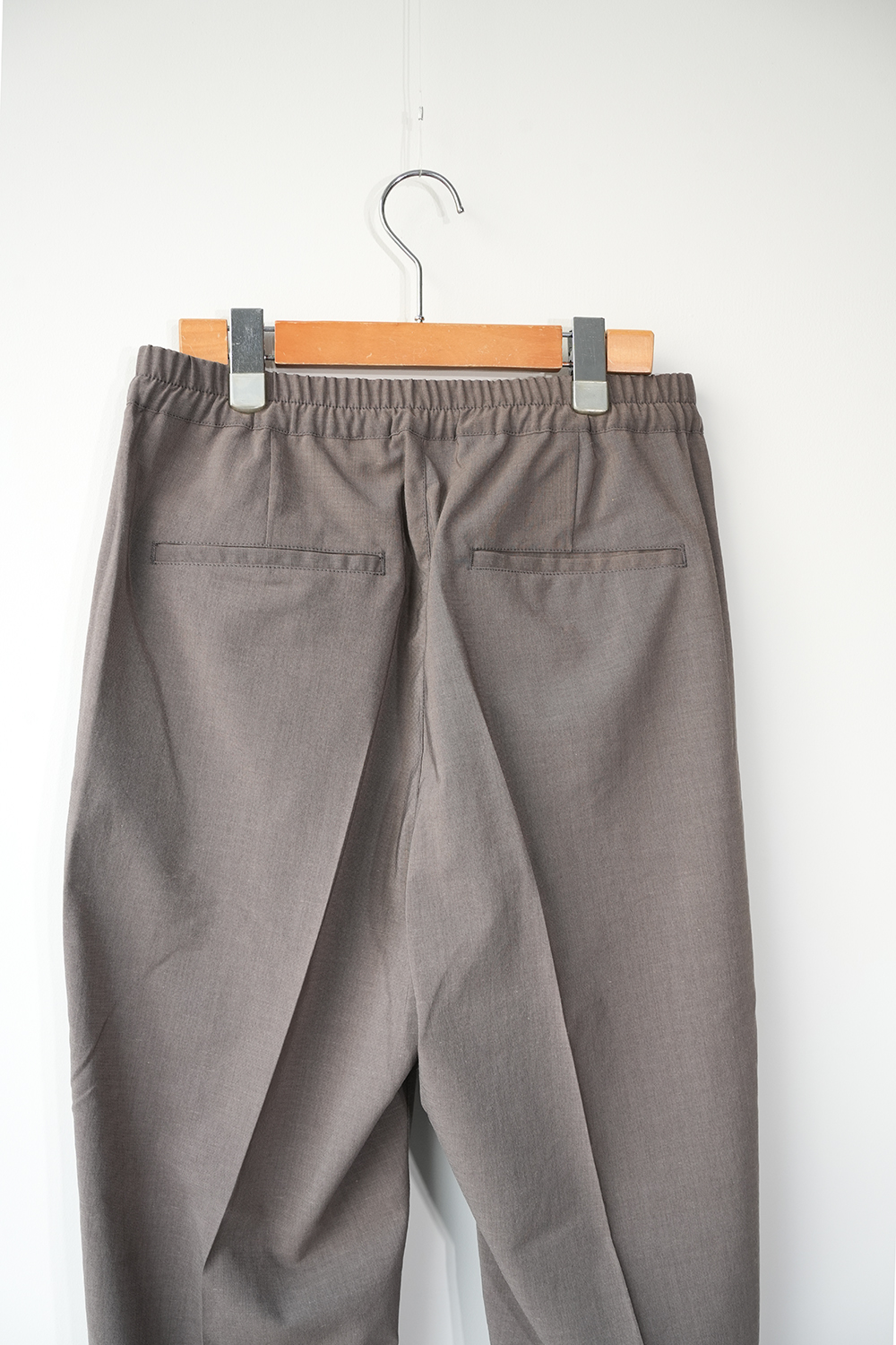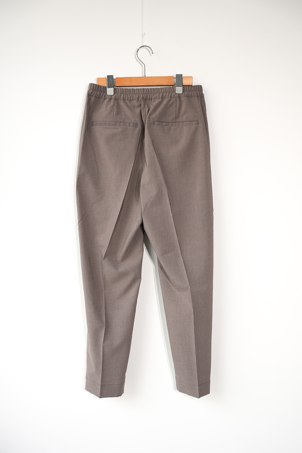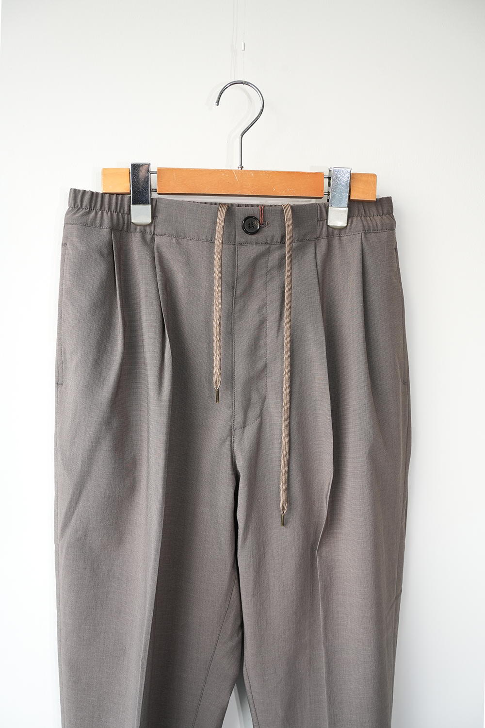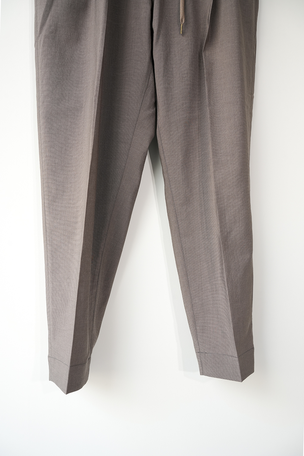 機能素材で仕立てたリラックステーパードトラウザー。ポリエステルに麻をブレンドしたタフタ素材を使用し、清涼感あるタッチと上品な麻の表情を備えながら、吸水速乾性とストレッチ性による快適な穿き心地を実現。ウエストはゴムシャーリングとドローコード仕様でリラックス感を持たせつつ、シームポケットや2タックによって腰回りに程よいゆとりを確保しました。ヒップから腿にかけては余裕を持たせながら、裾に向かって自然に細くなるテーパードシルエット。マッドな色合いと軽快な素材感が相まって、ラフでありながら大人の品を漂わせる一本に仕上がっています。