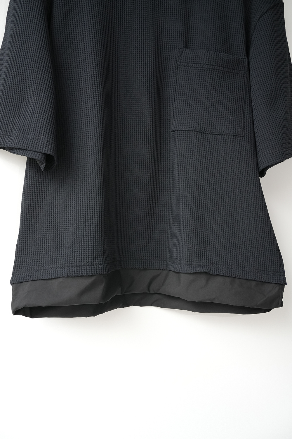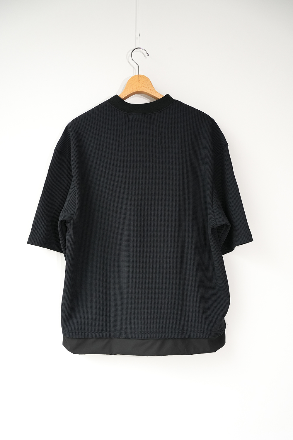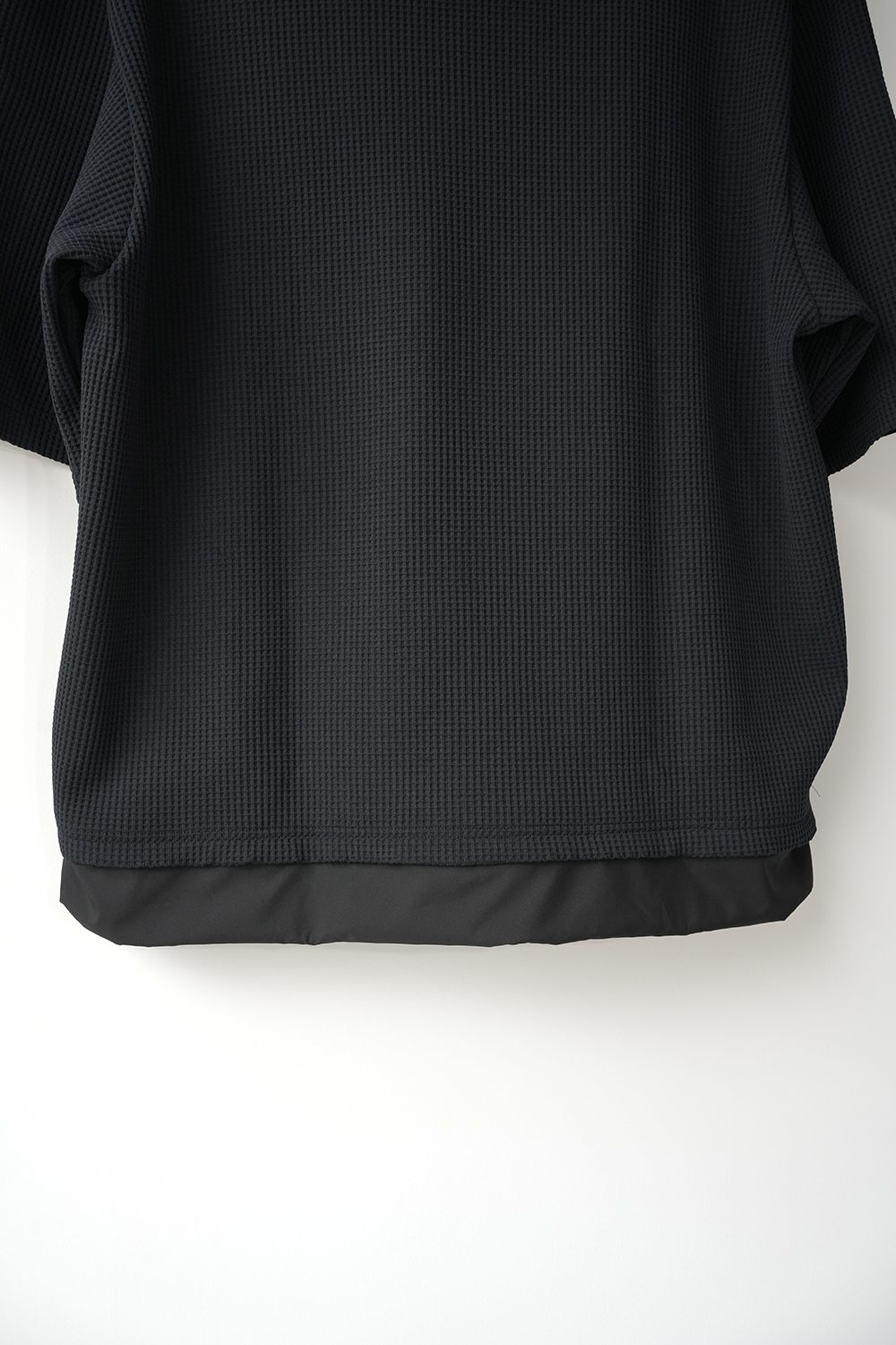 Solotexワッフルを使用したTシャツ。表側にはテイジンの開発したSolotexを使用した変形ワッフル素材を採用。コイル形状でストレッチ性、キックバック性に優れ、吸水速乾性も併せ持つ。裾には透湿撥水性の高いポリエステルタフタを使用。ノンラミネート加工により汗、水分を内部から外へ素早く放出し、ムレを抑え快適に保つ。裾にはドローコード付き。